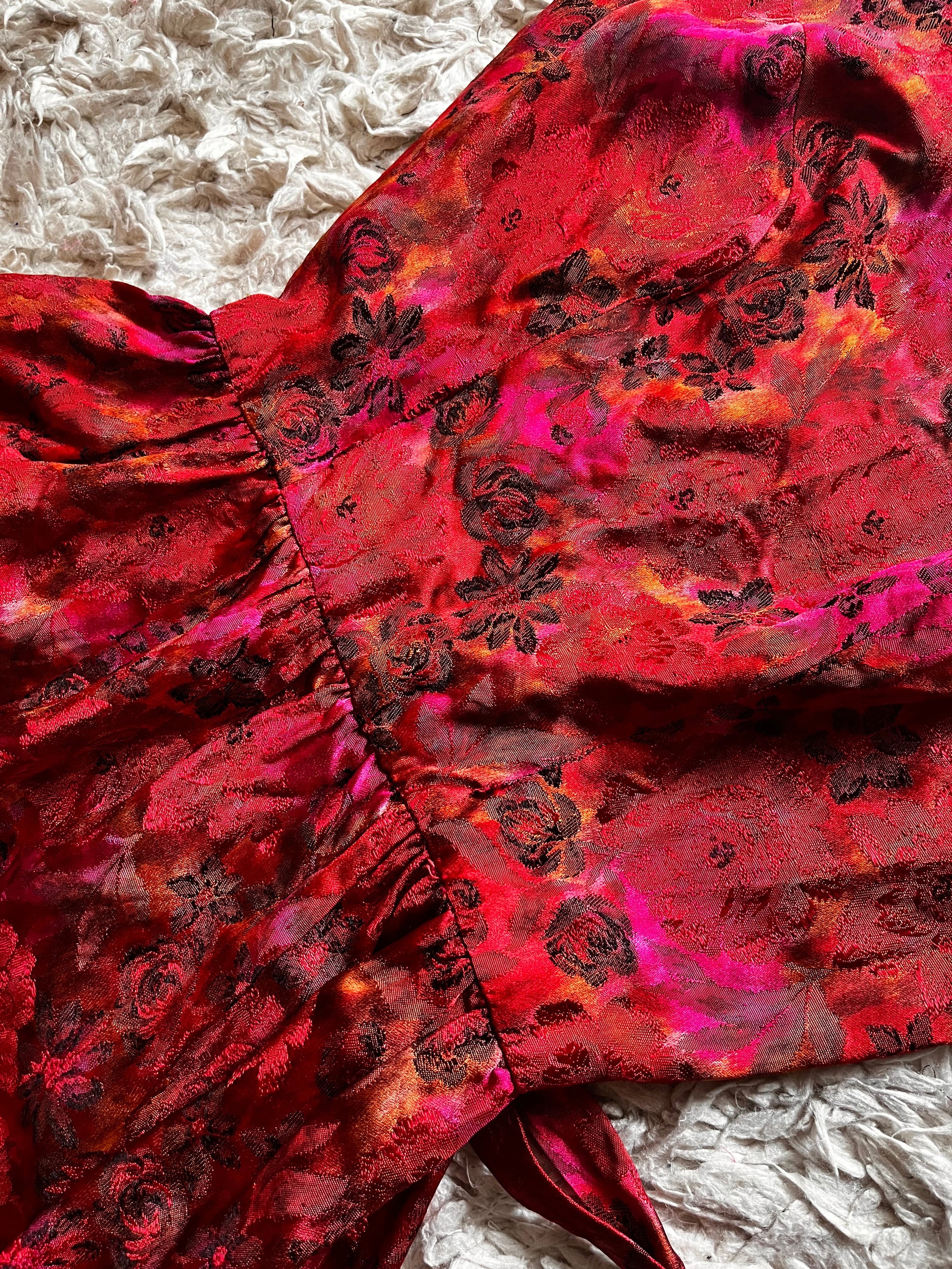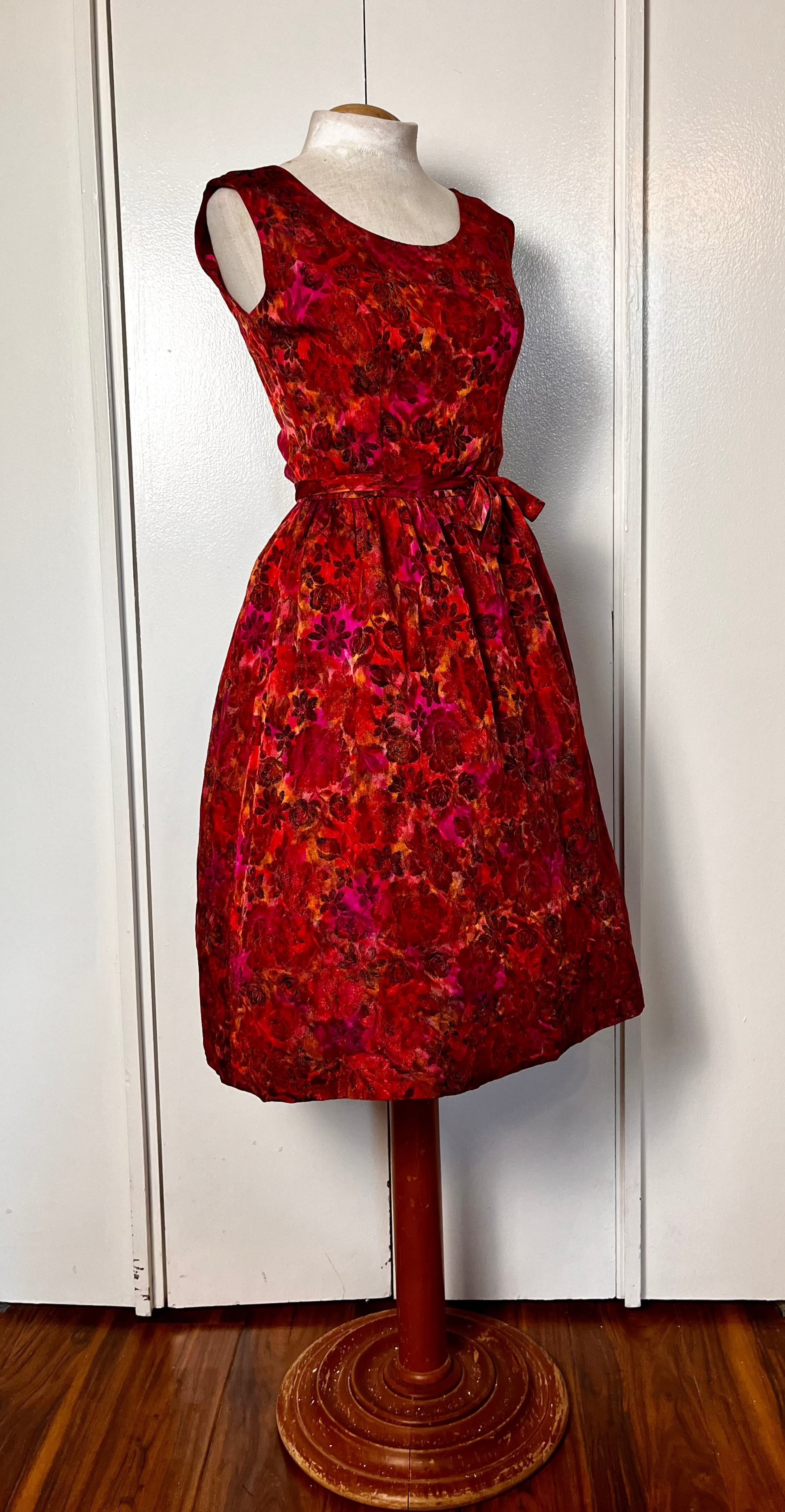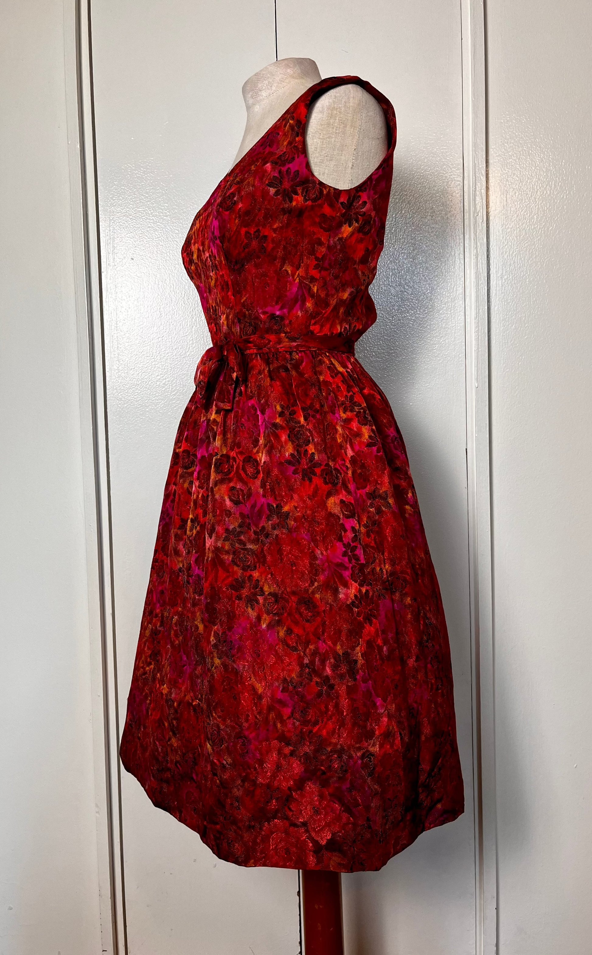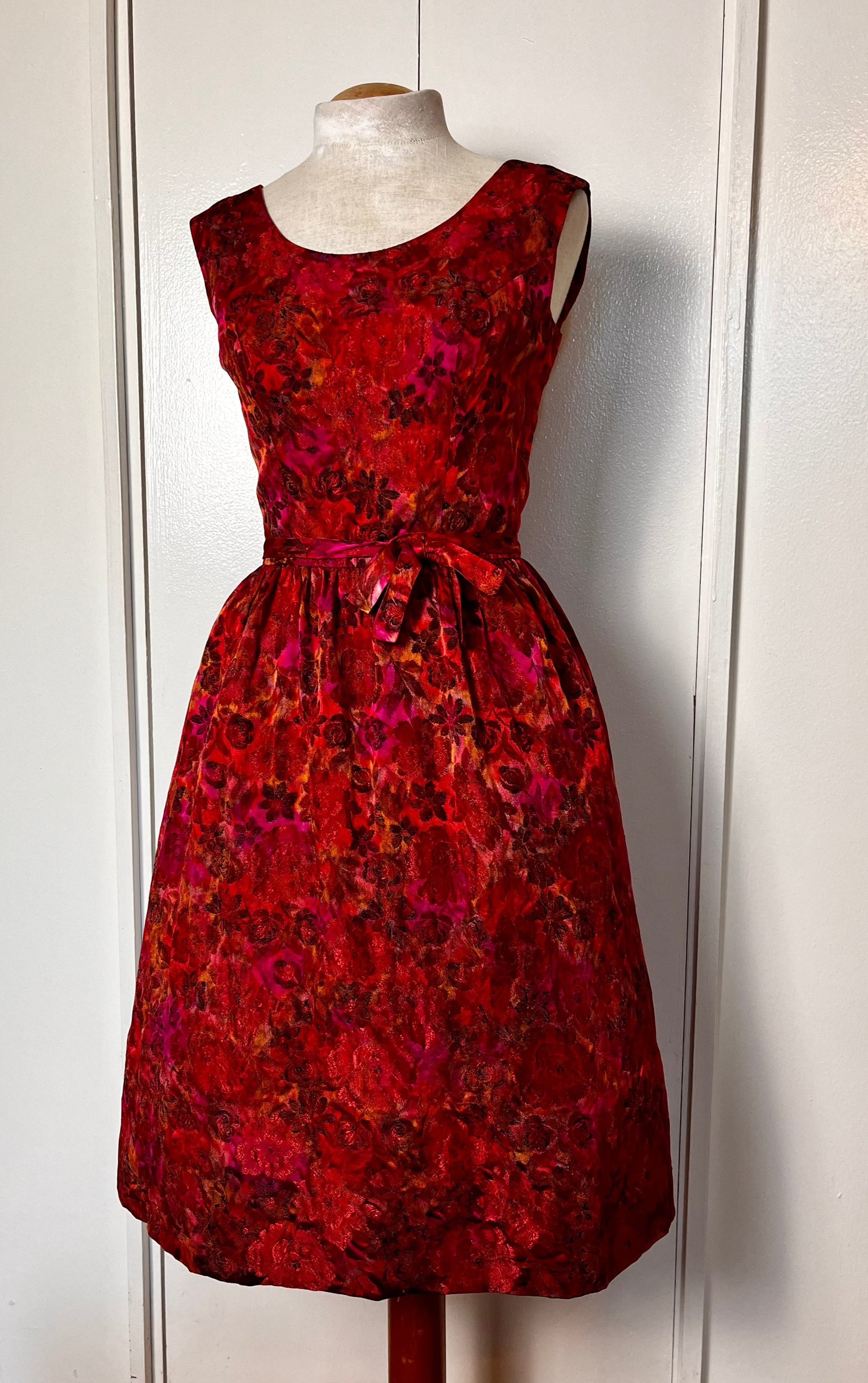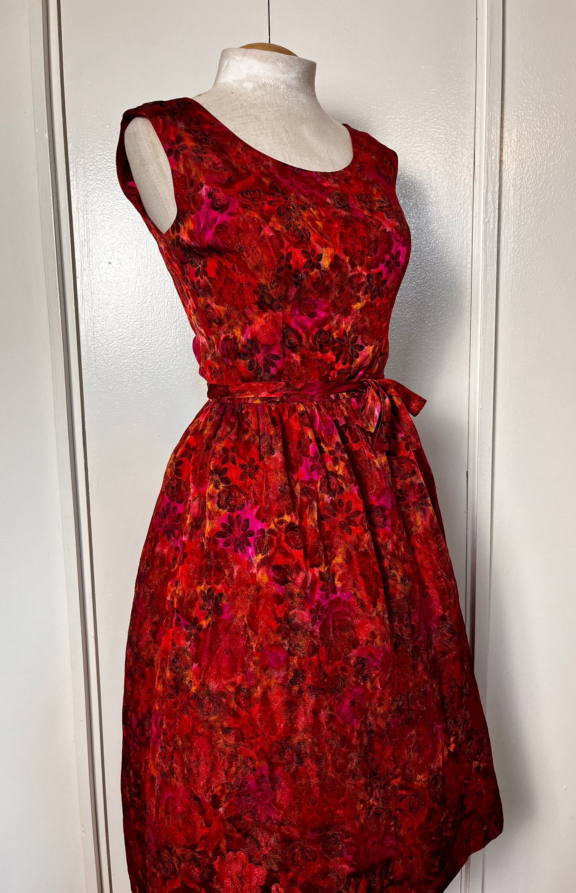 Vintage 1950's Rare Designer "Gustave Tassell" Two-Piece Set Matching Dress & Jacket in Pink, Red, & Orange Silk-Brocade Floral