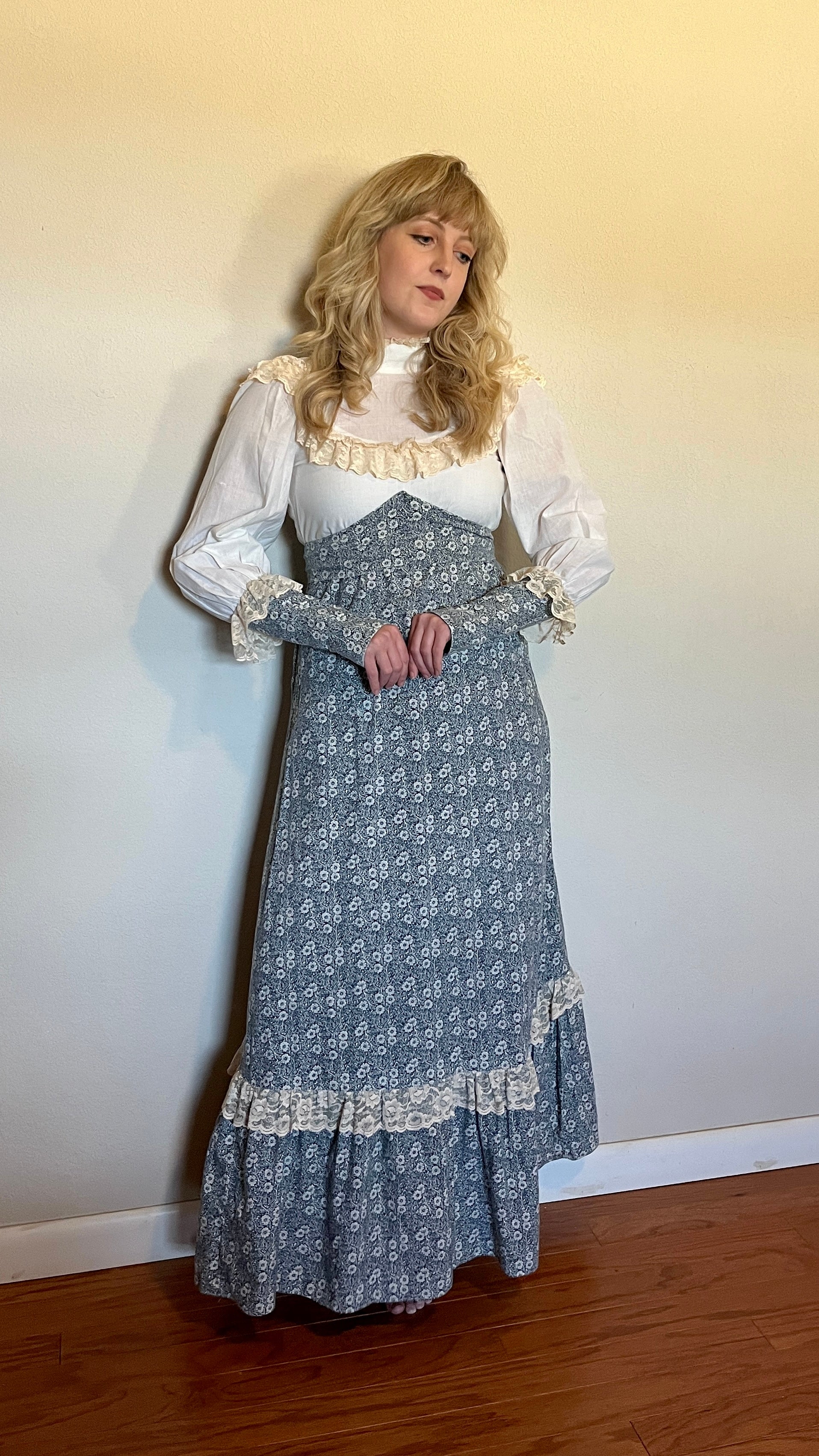 Vintage 1960’s "Gunne Sax by Jessica McClintock" White & Blue Floral Maxi Dress