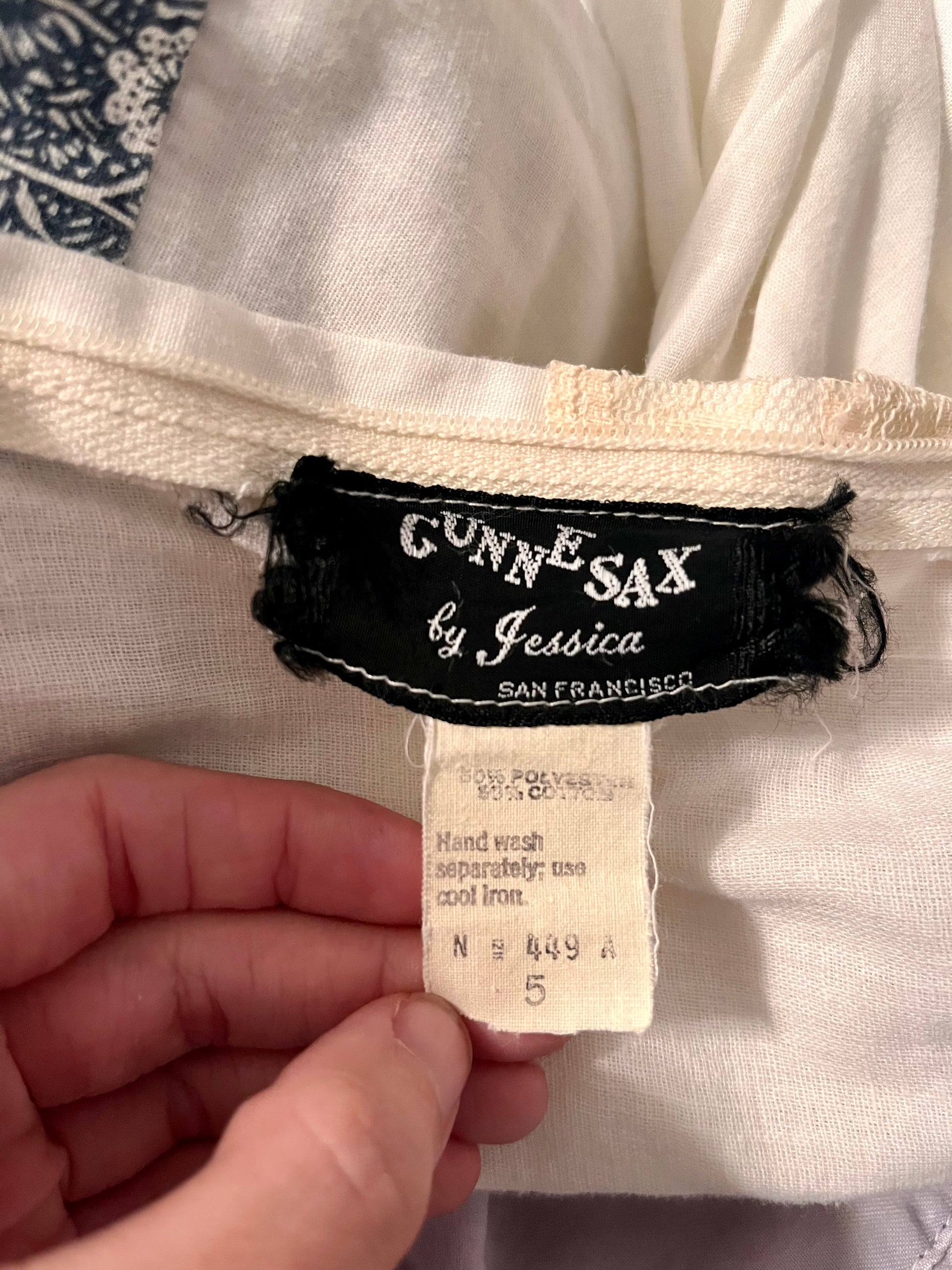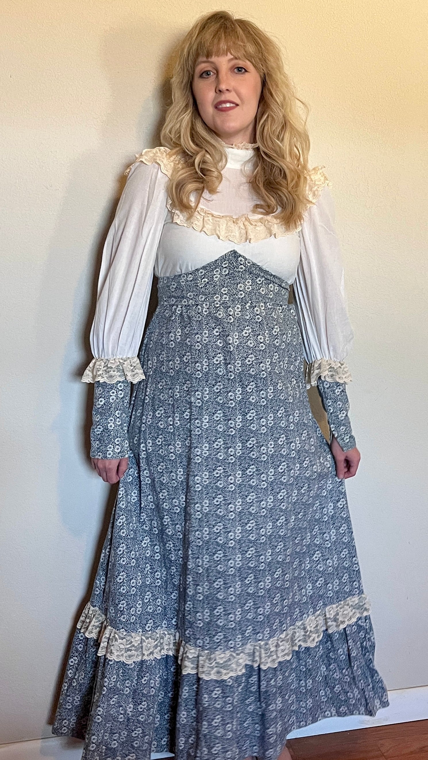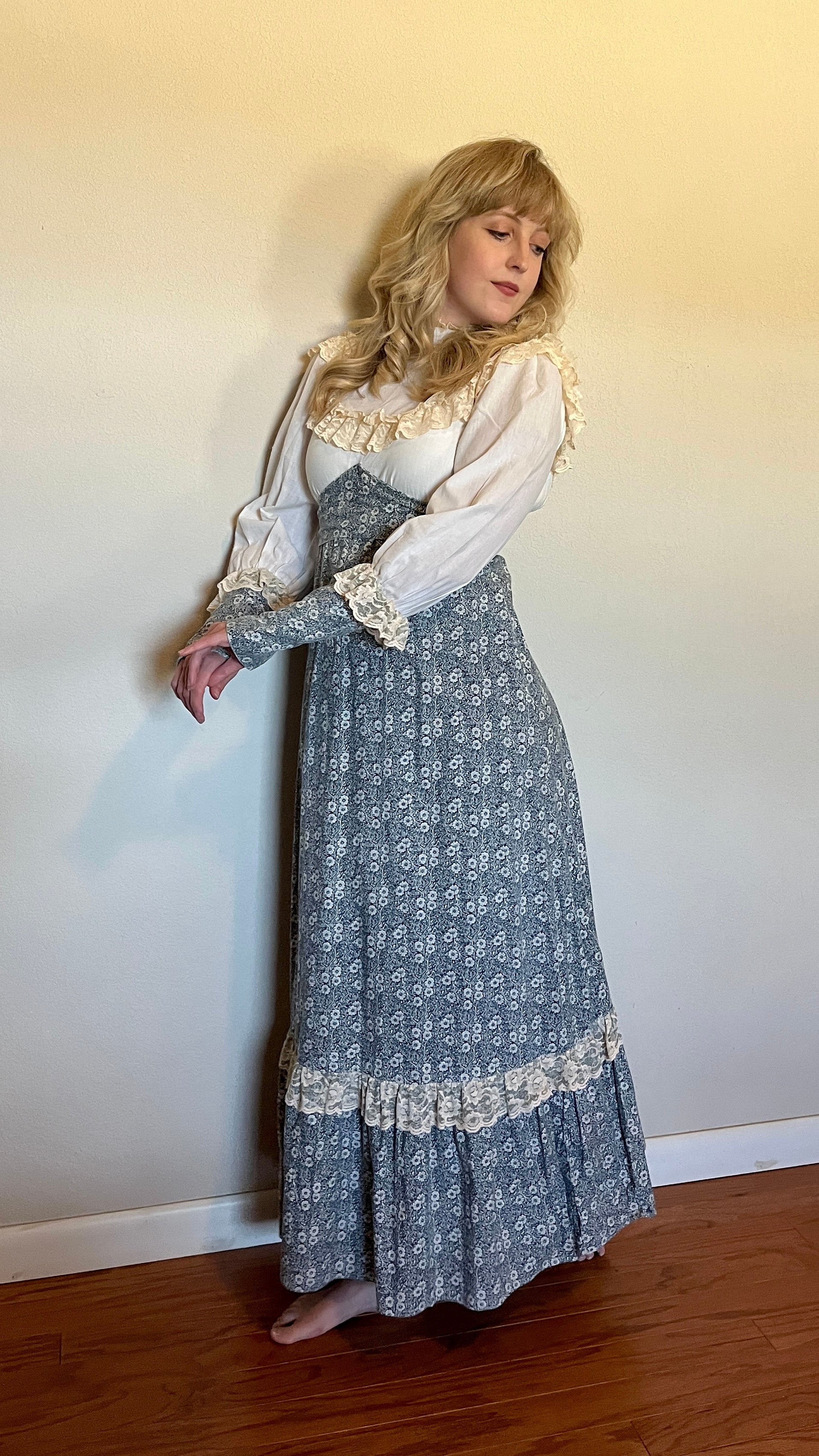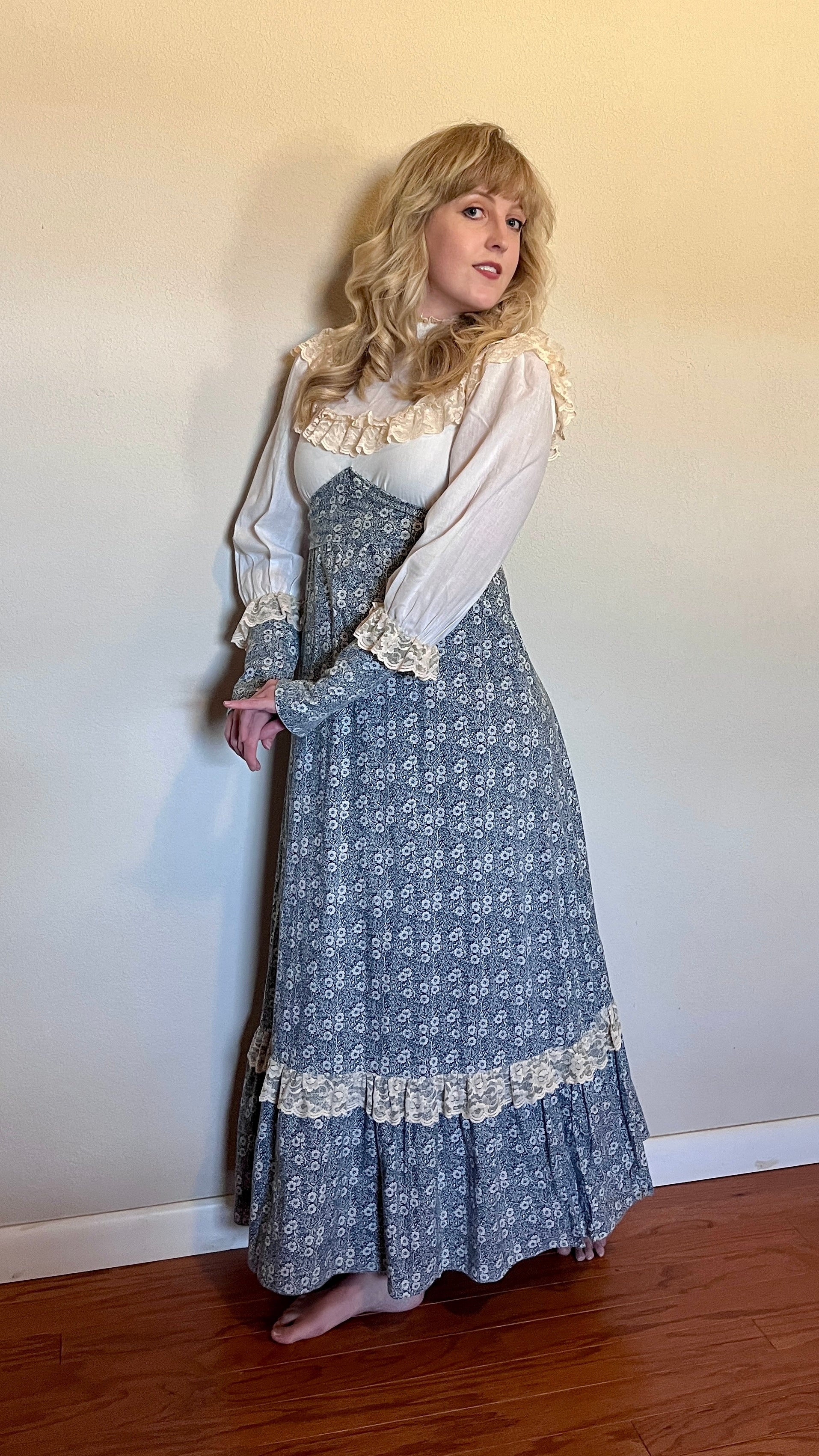Vintage 1960’s Gunne Sax by Jessica McClintock White & Blue High Neck Long Sleeve Maxi Dress w/ Rare Laura Ashley-Shared Print