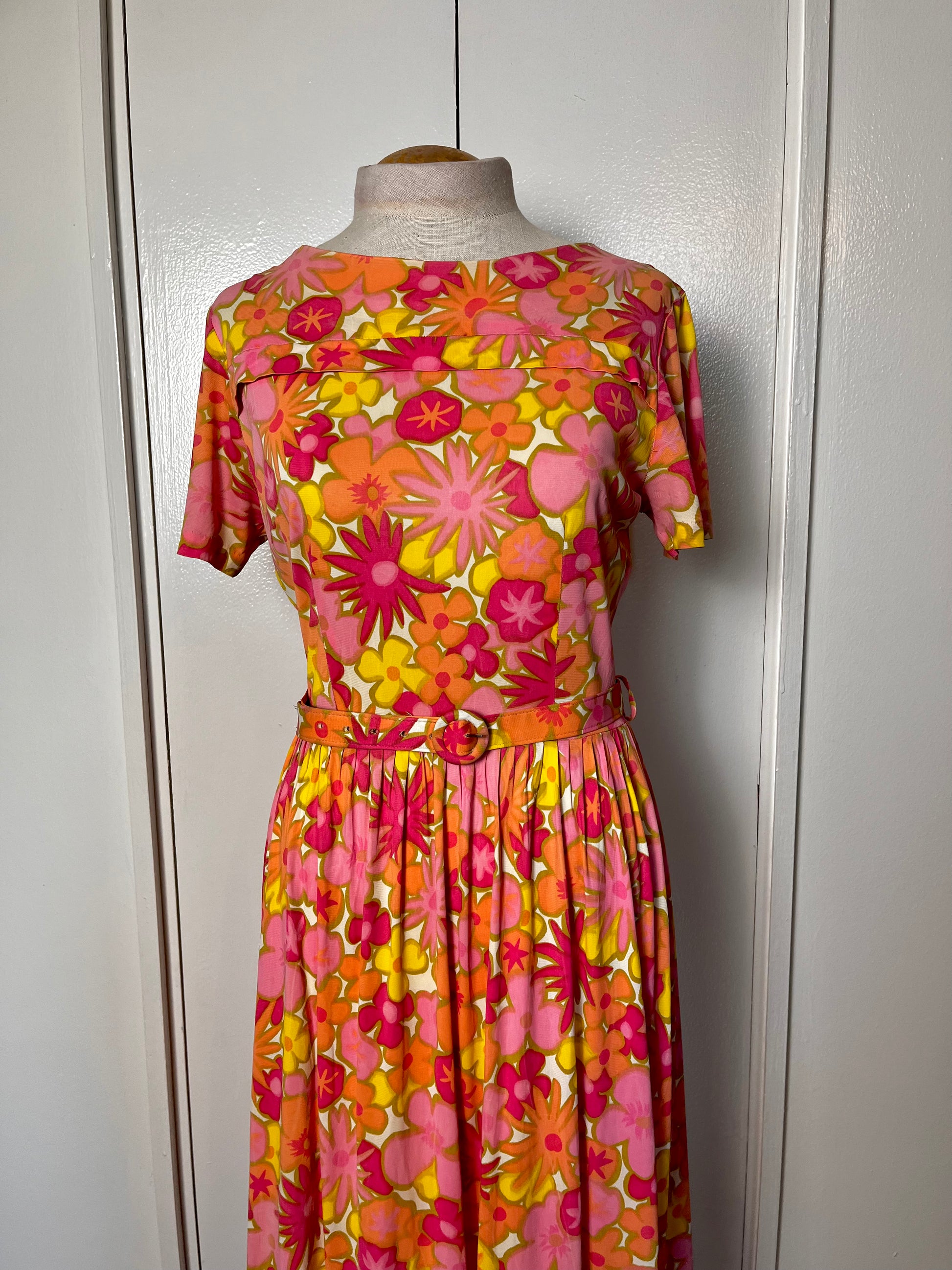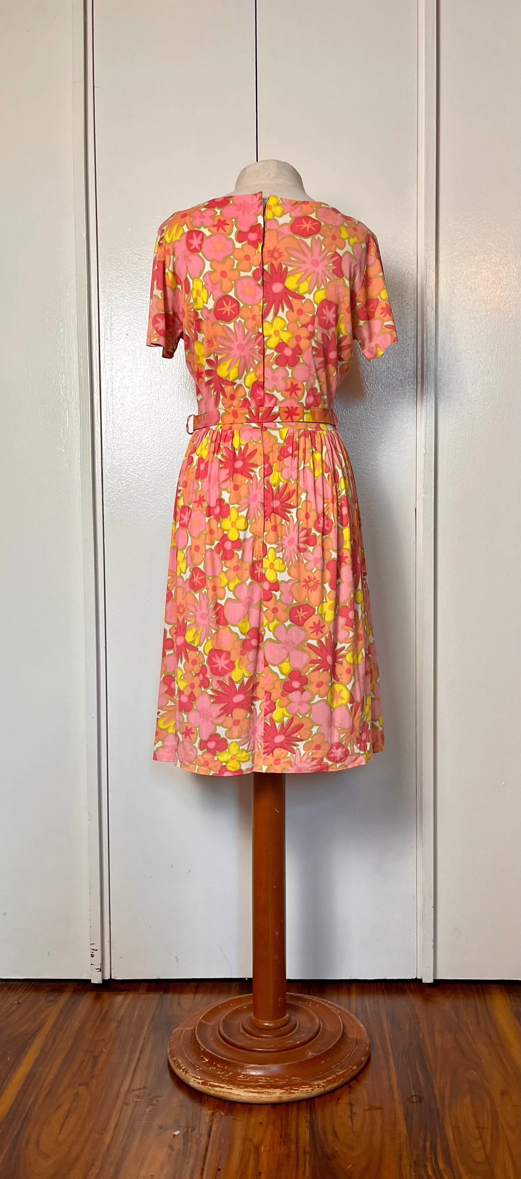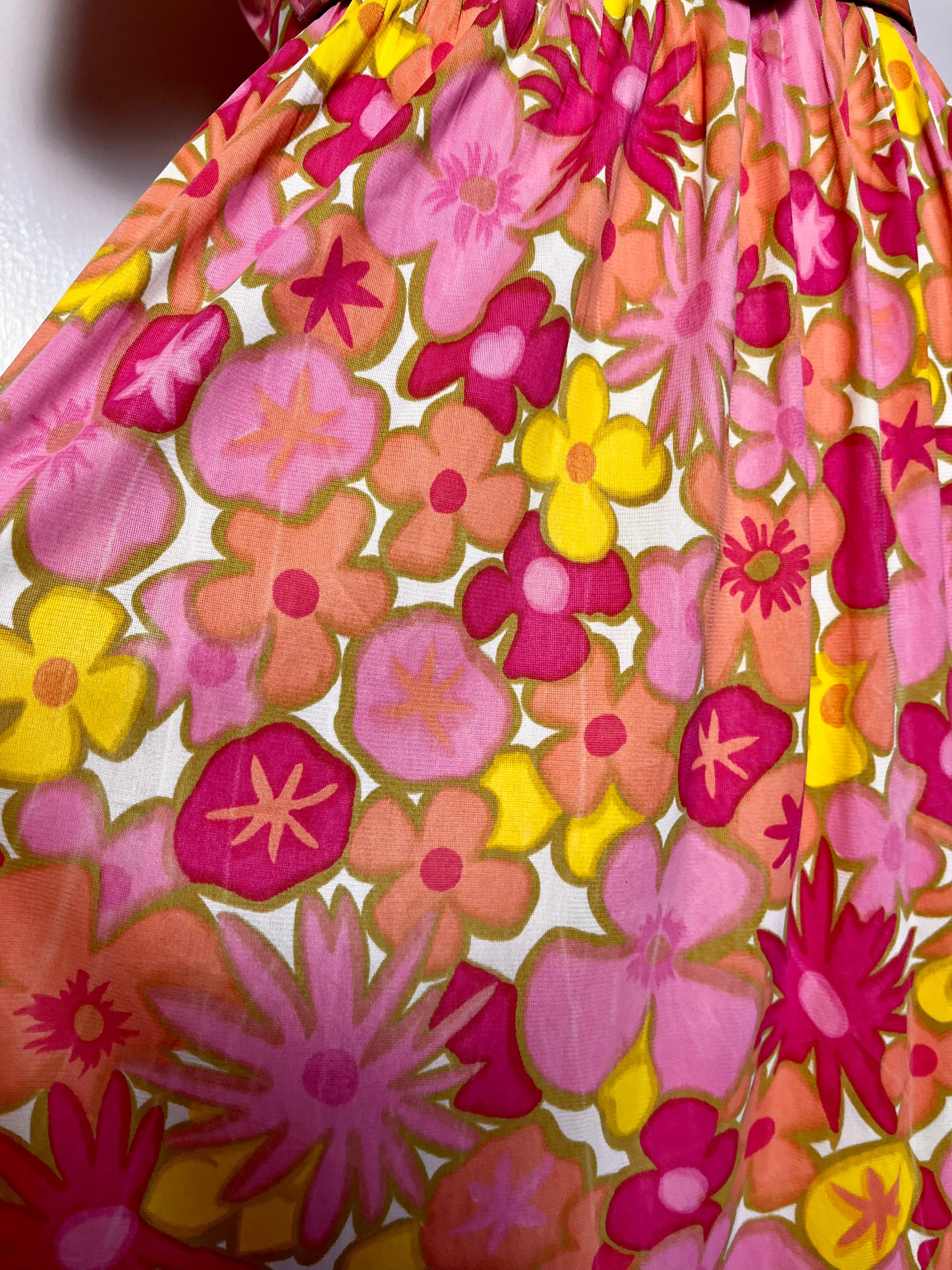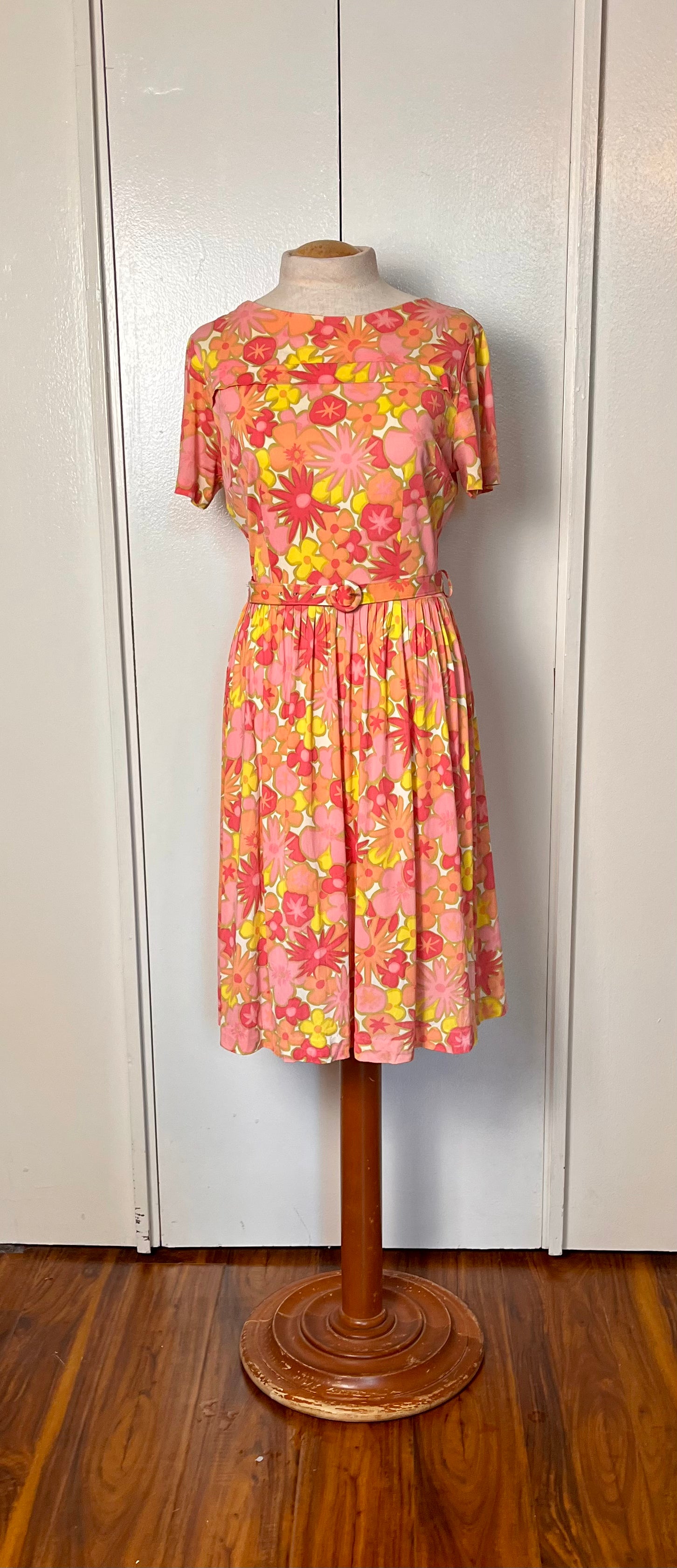 Vintage 1960's Flower Power Belted Fit n Flare Pink Orange & Yellow Nylon Midi Dress
