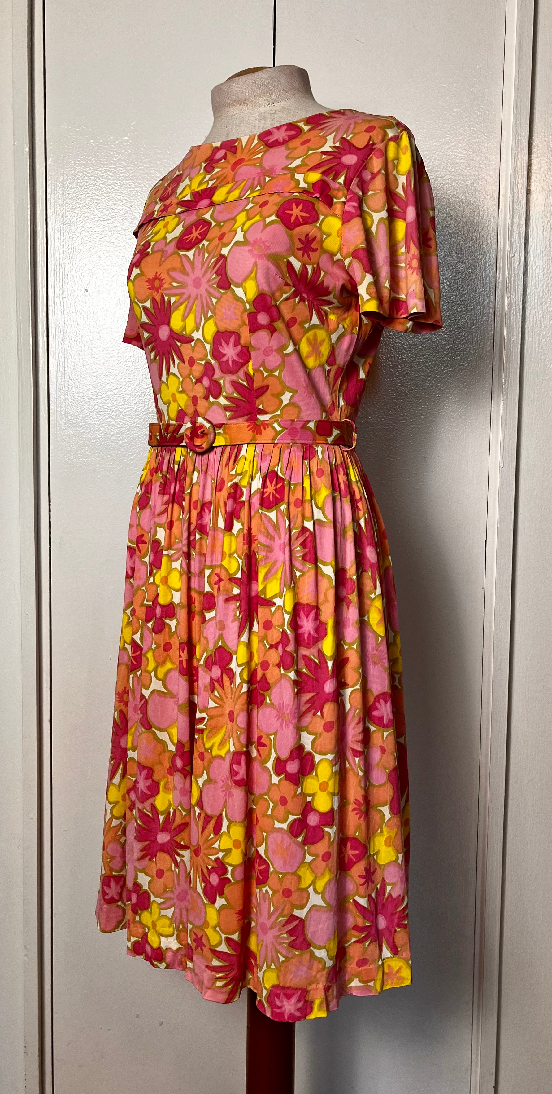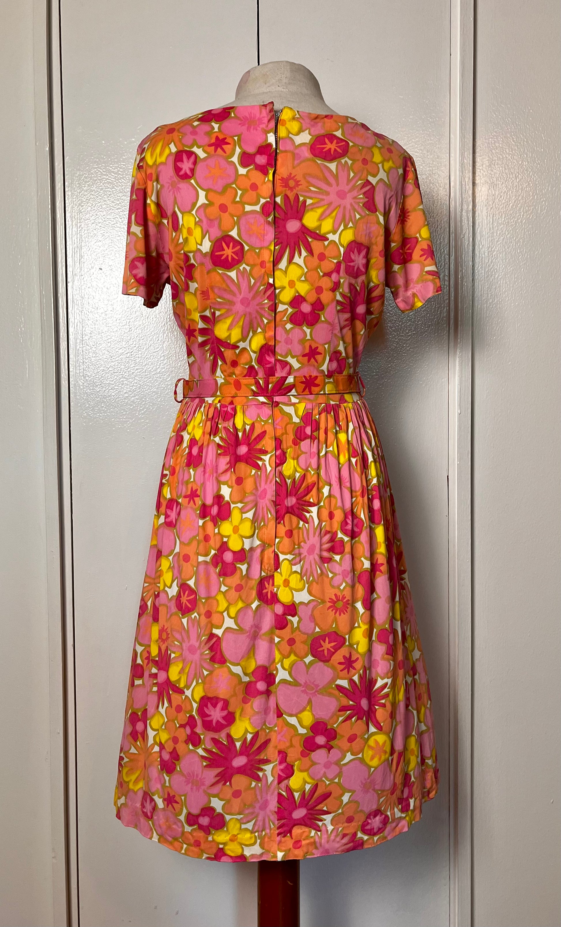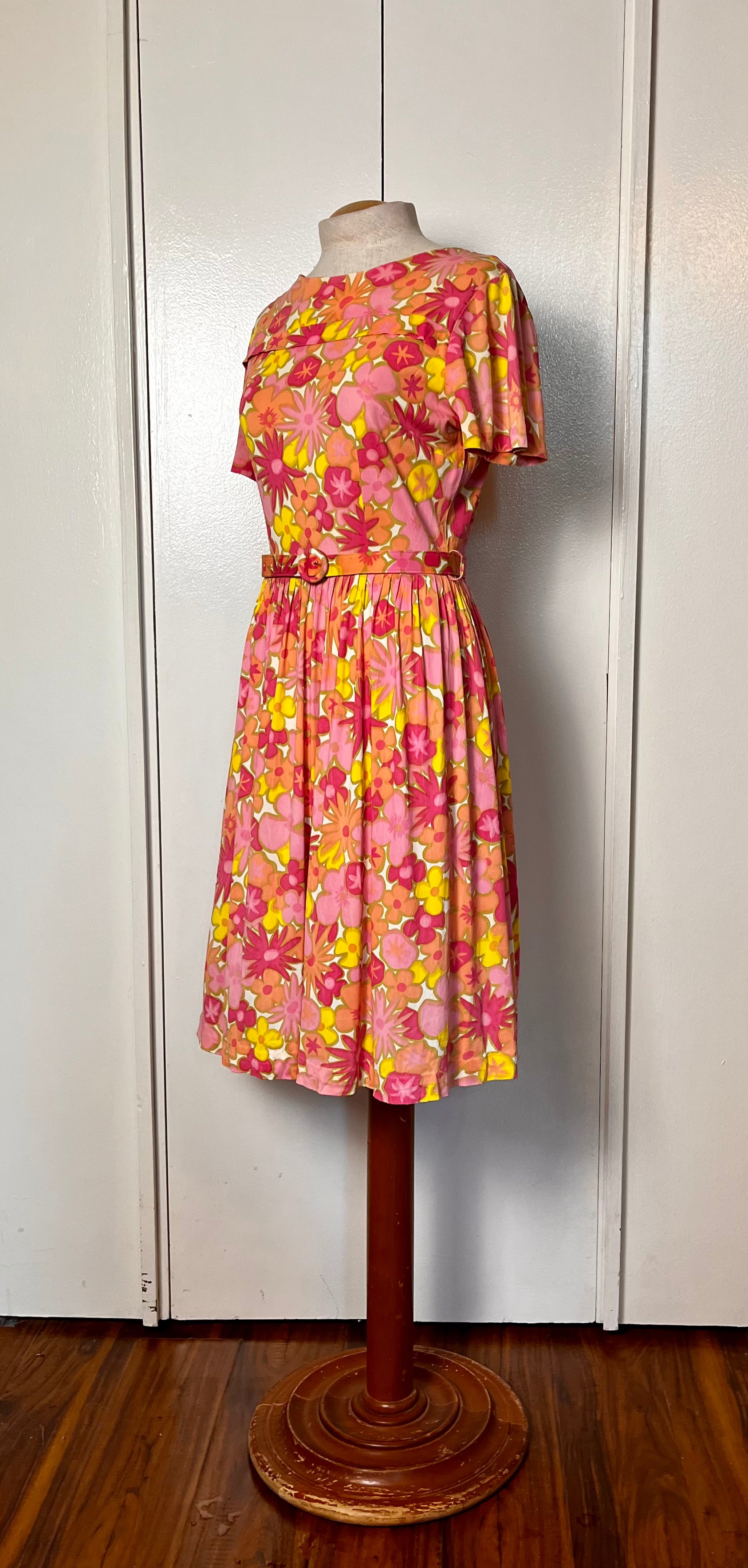 Vintage 1960's Flower Power Belted Fit n Flare Pink Orange & Yellow Nylon Midi Dress