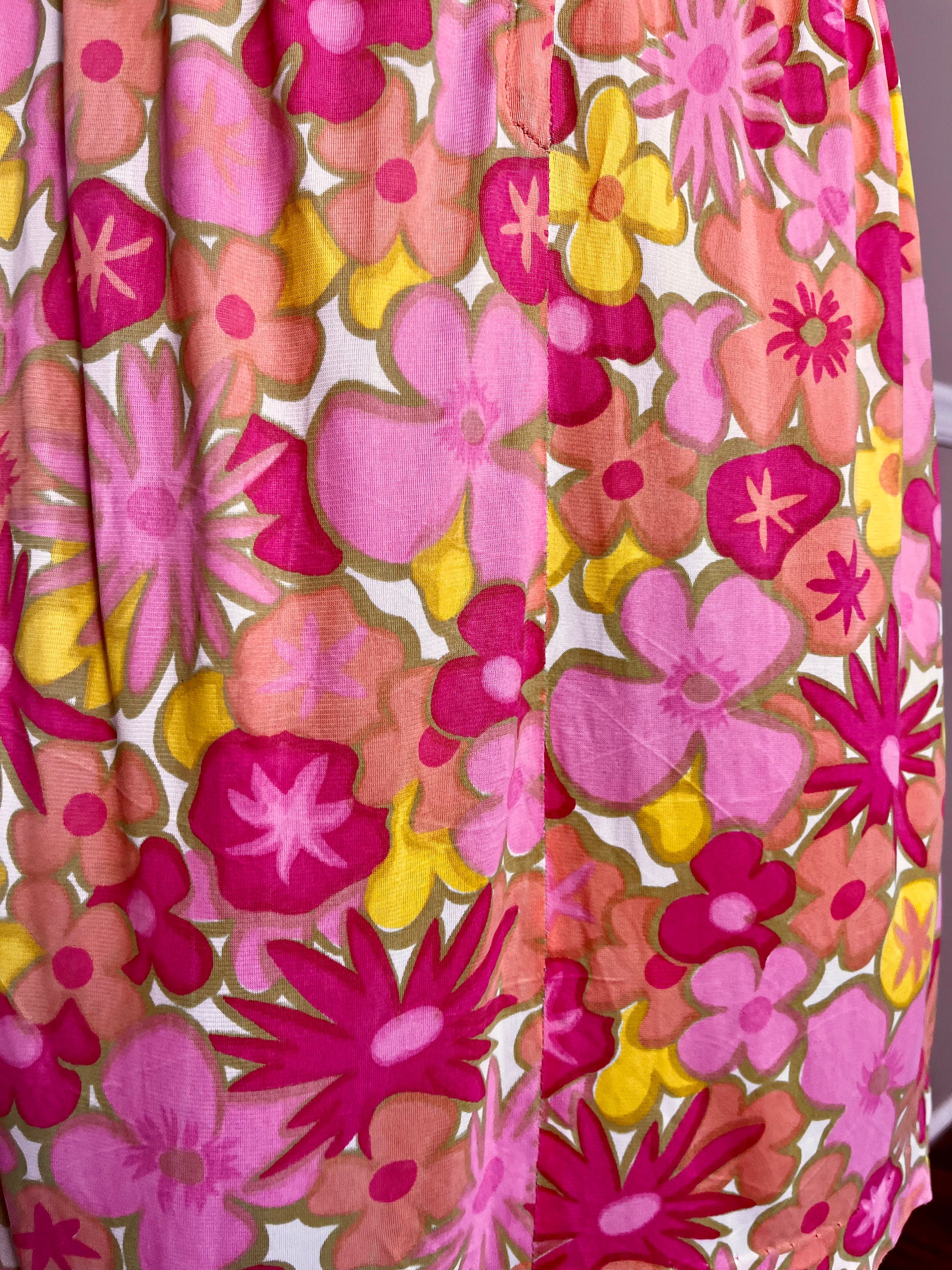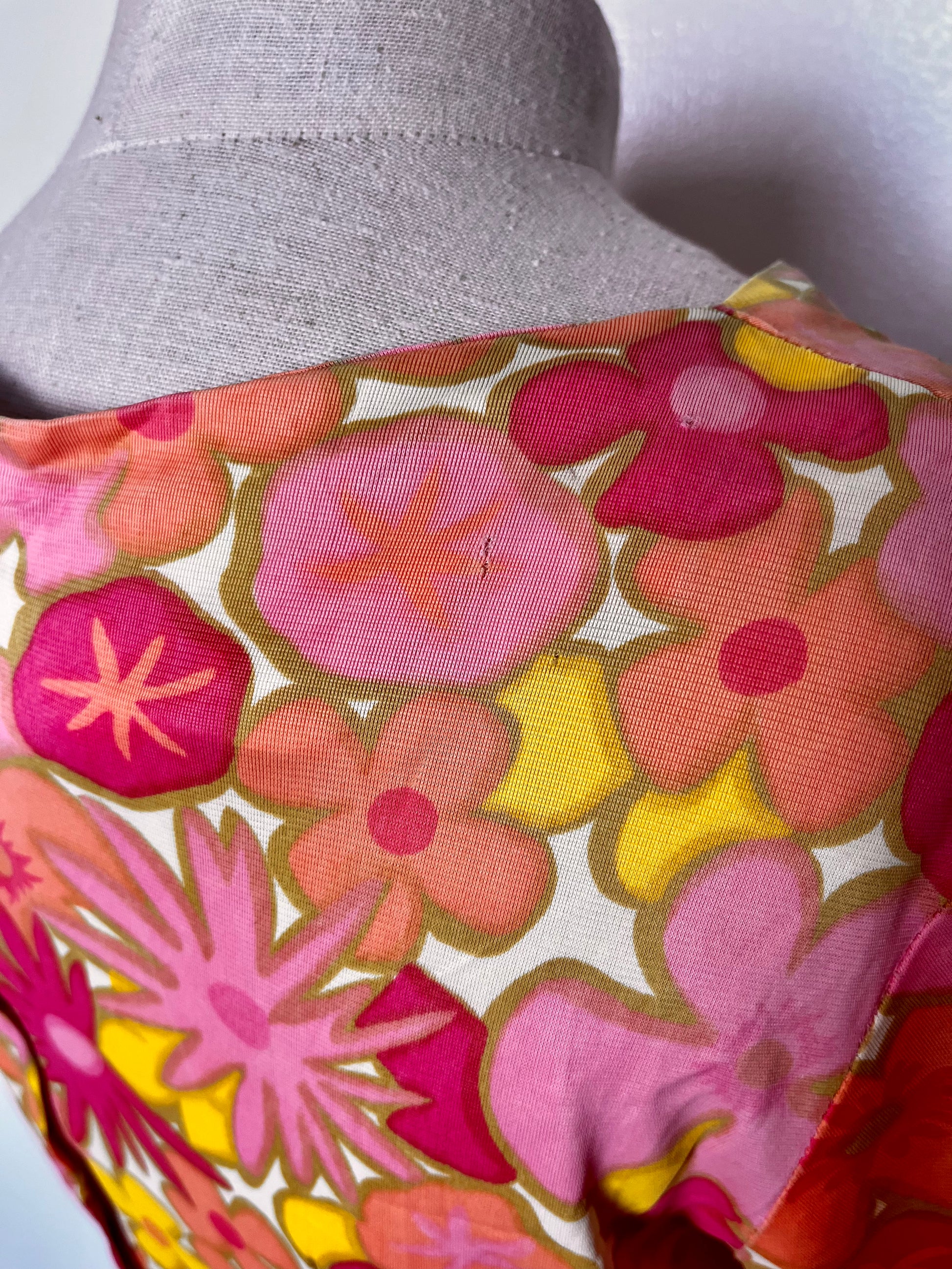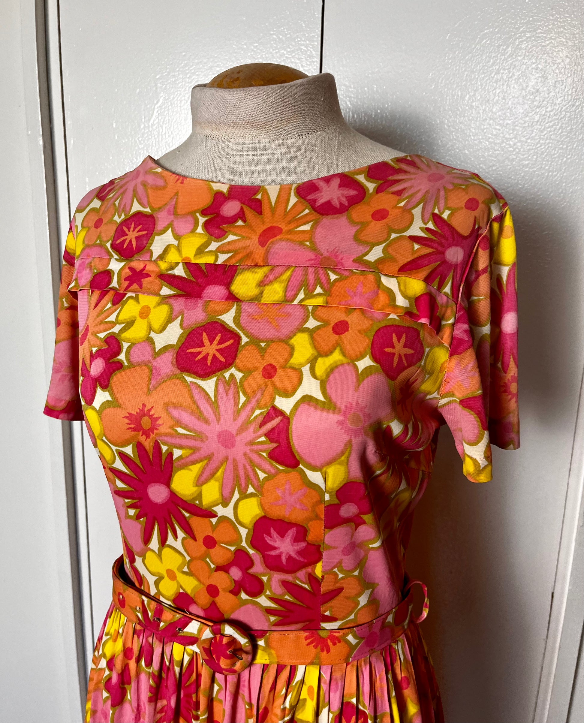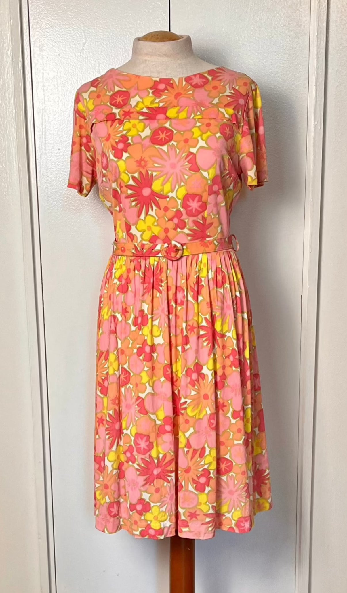 Vintage 1960's Flower Power Belted Fit n Flare Pink Orange & Yellow Nylon Midi Dress