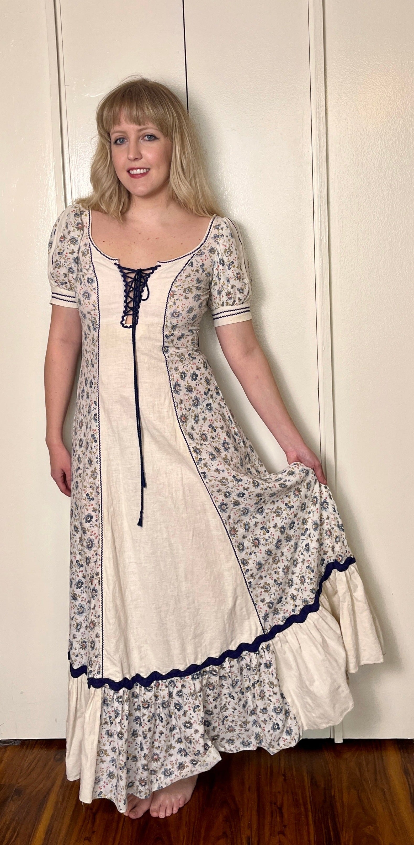 Vintage 1960's "Gunne Sax by Jessica McClintock" Butterfly-Print & Blue Ric-Rac Corset-Front Short Sleeve Maxi Dress