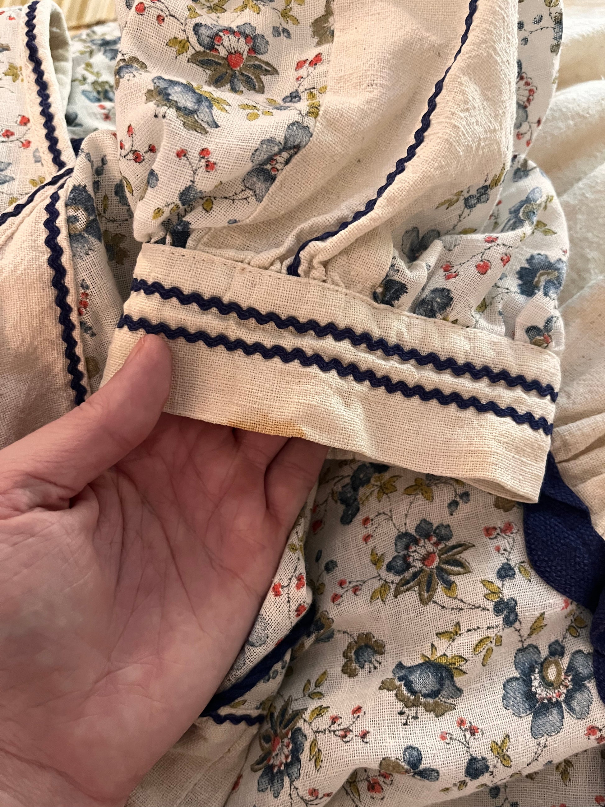 Good condition. The brand tag and size tag have been removed. This dress was purchased by the original owner who wore it as her wedding dress in 1974. She replaced the back zipper with a metal talon zipper; this is where the original tags would have been located and were removed during that process. There is one mark on the front of the skirt and also a spot on the cuff of one sleeve; please see last two photos to review.