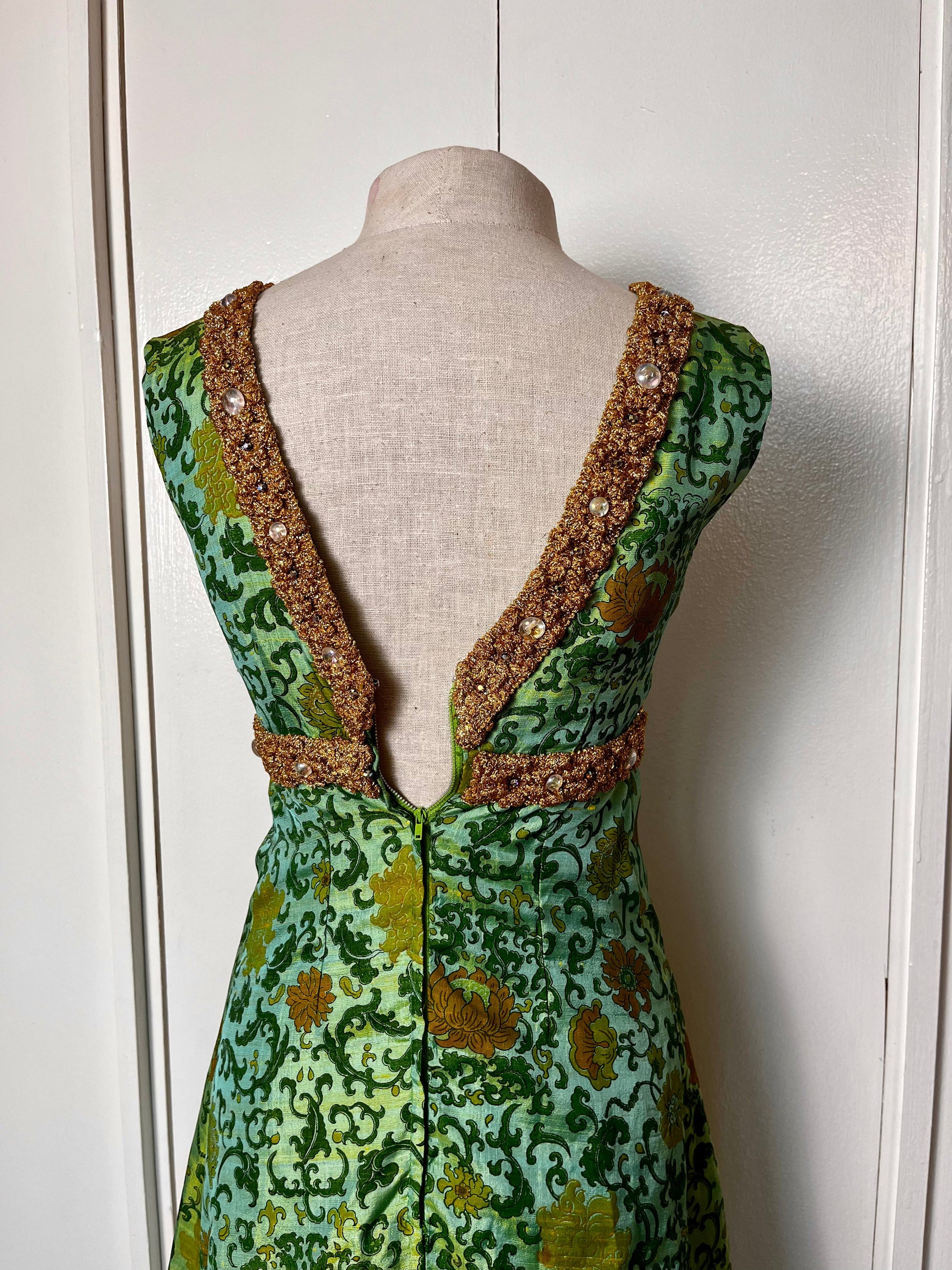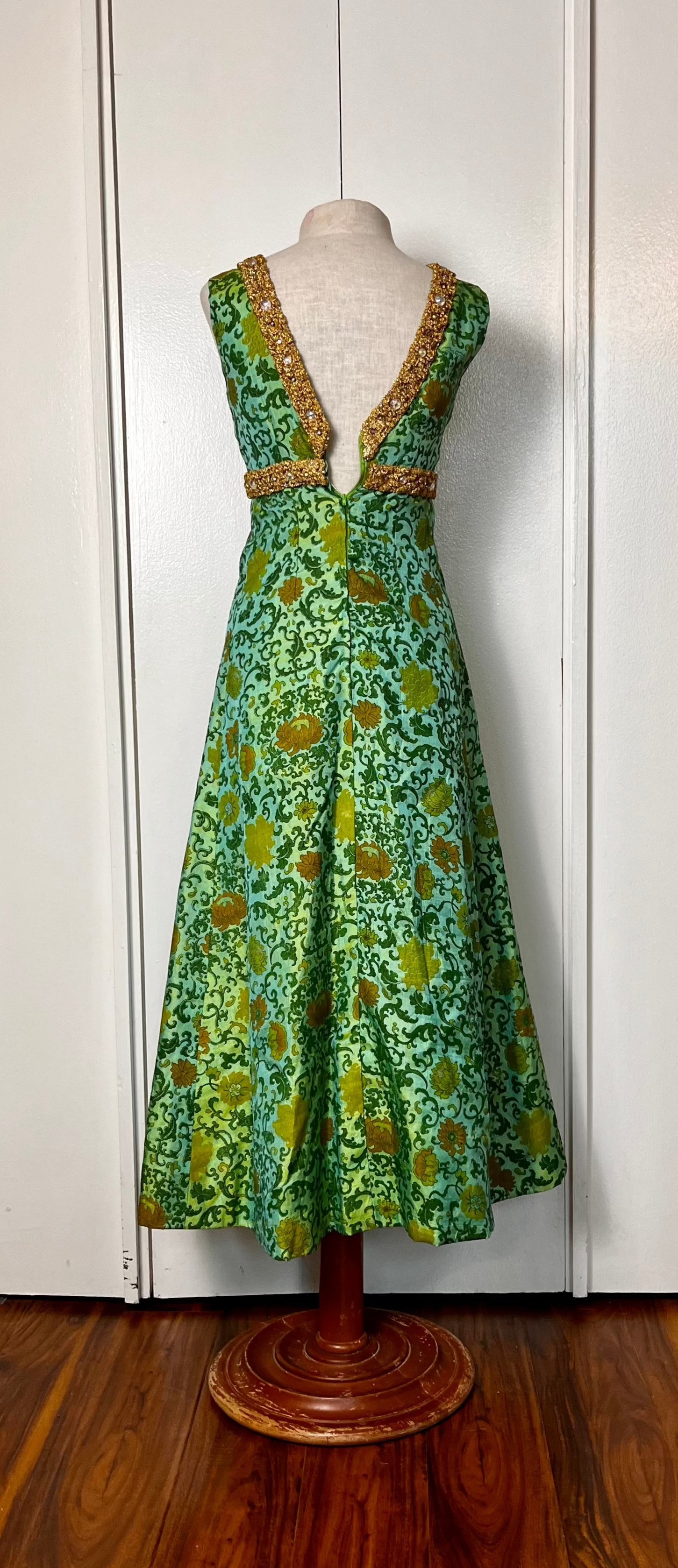 Vintage 1960's Ivy & Floral Jade-Green Brocade-Like with Gold Shimmer Trim & Beads Empire Waist Maxi Dress