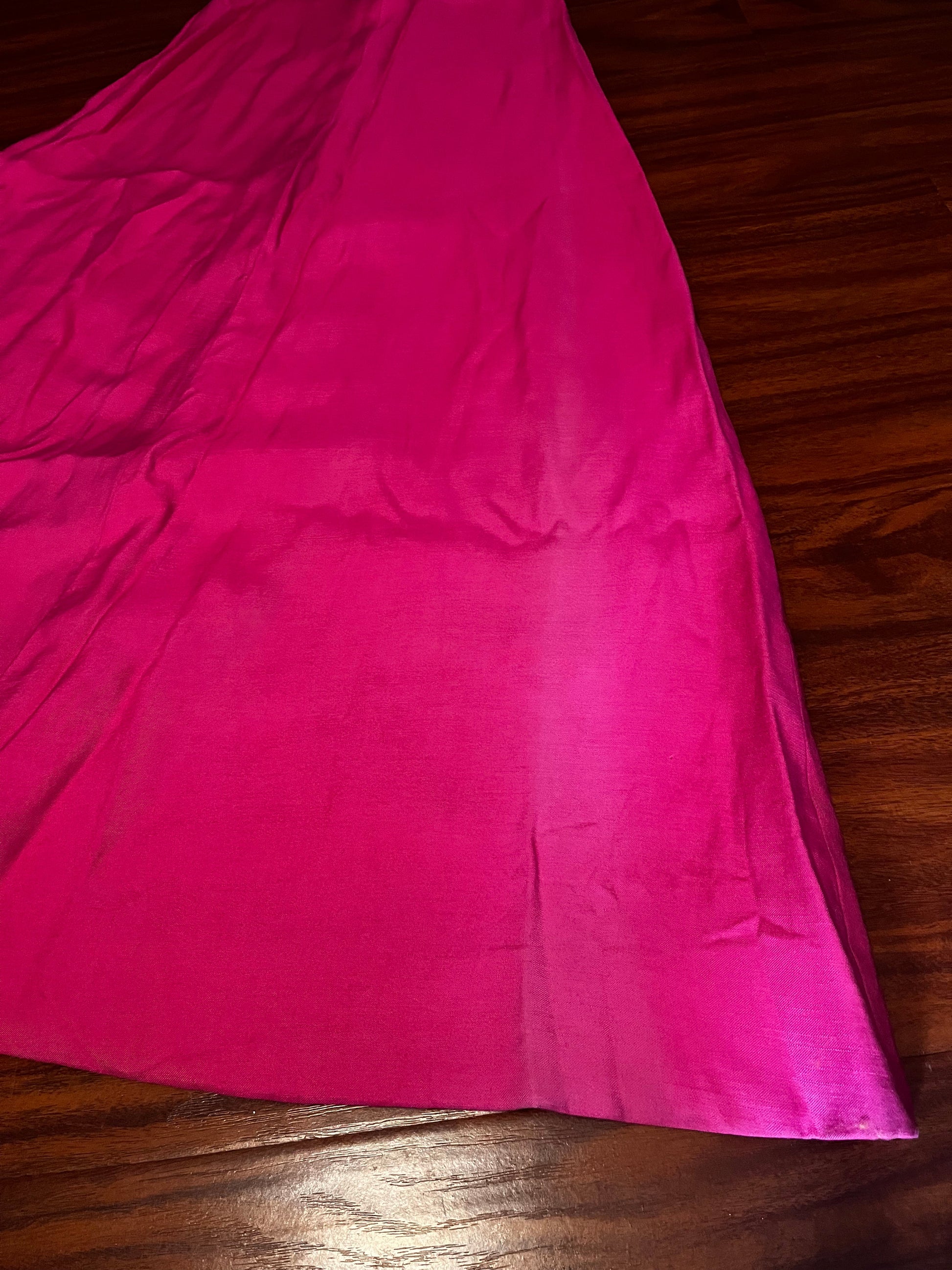 Fair condition. Material feels like a gabardine. There is no label nor size tags present. There is one small blemish/patch on the bottom of the skirt; see last photo. There is some sun fading on one side of both the front and back of the skirt - it is difficult to capture on camera and isn't apparent on the form as it is diffused by the drape of the skirt, so please see second to last photo, taken in bright, natural daylight.