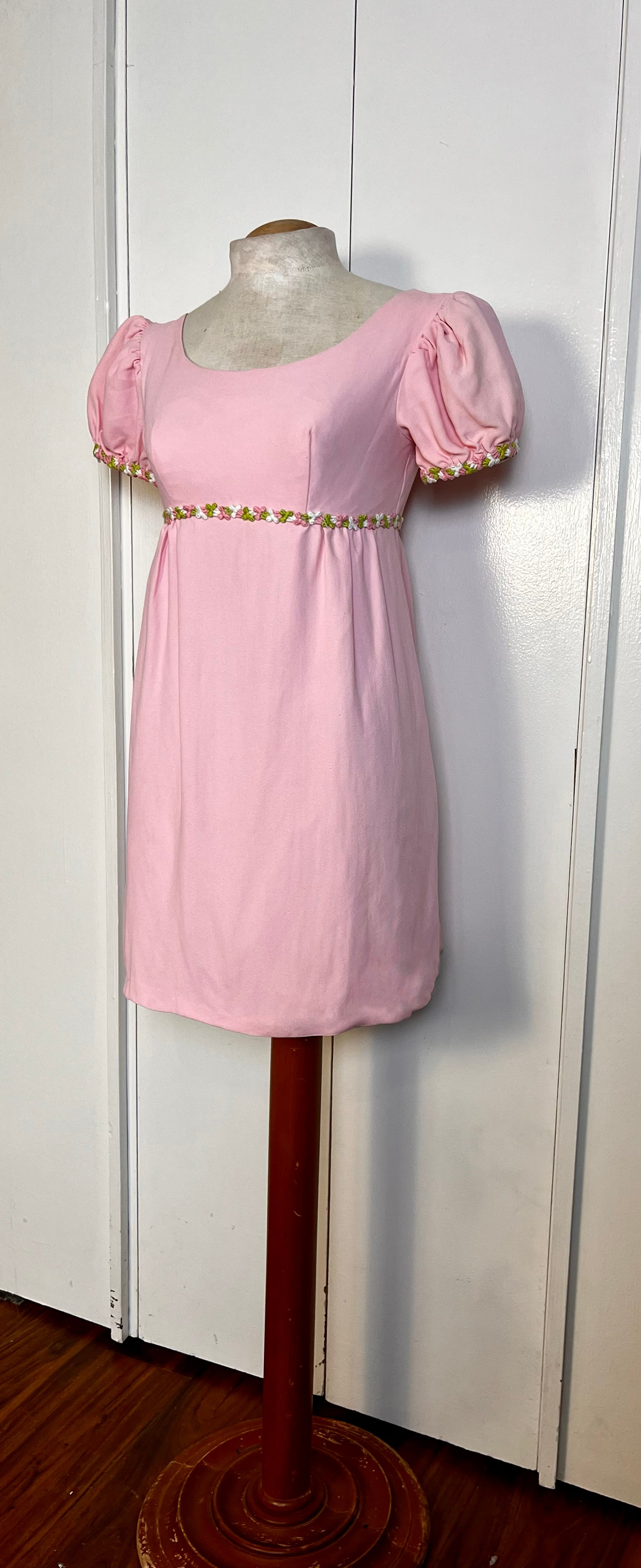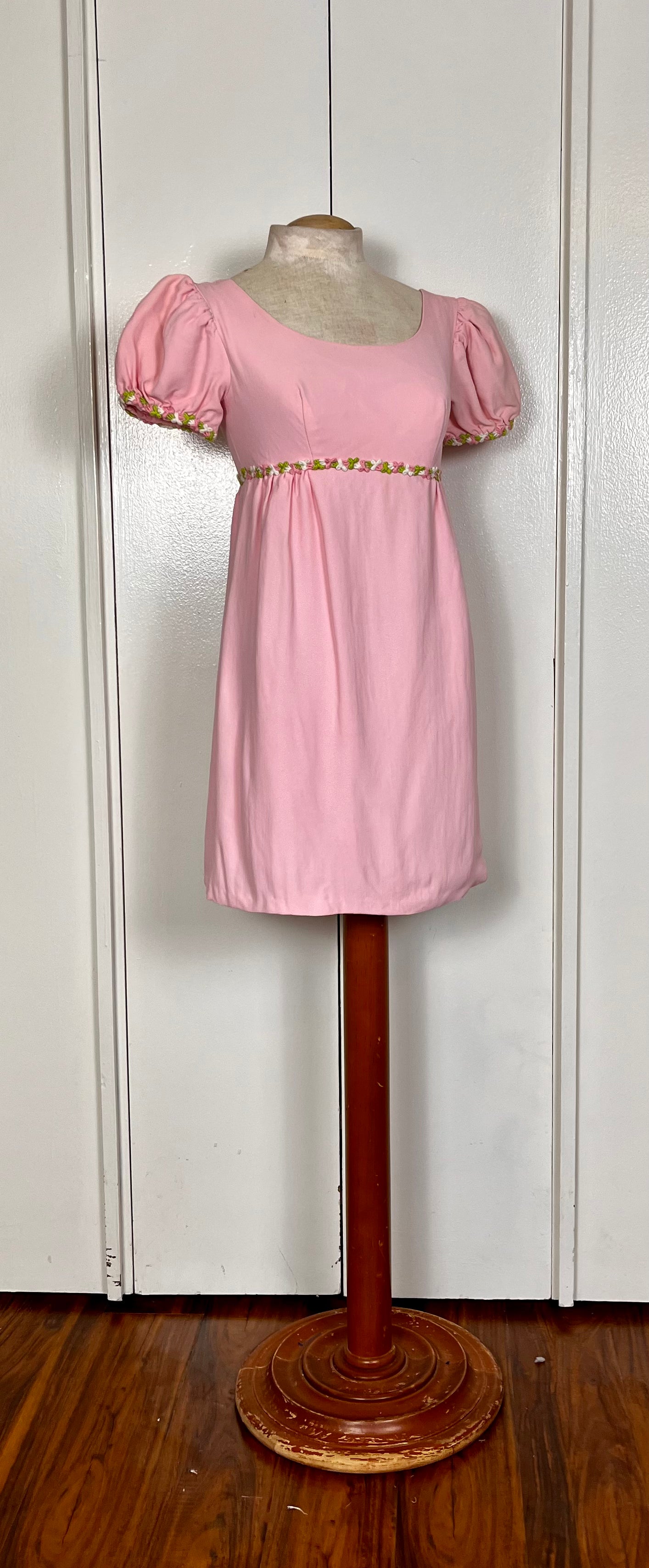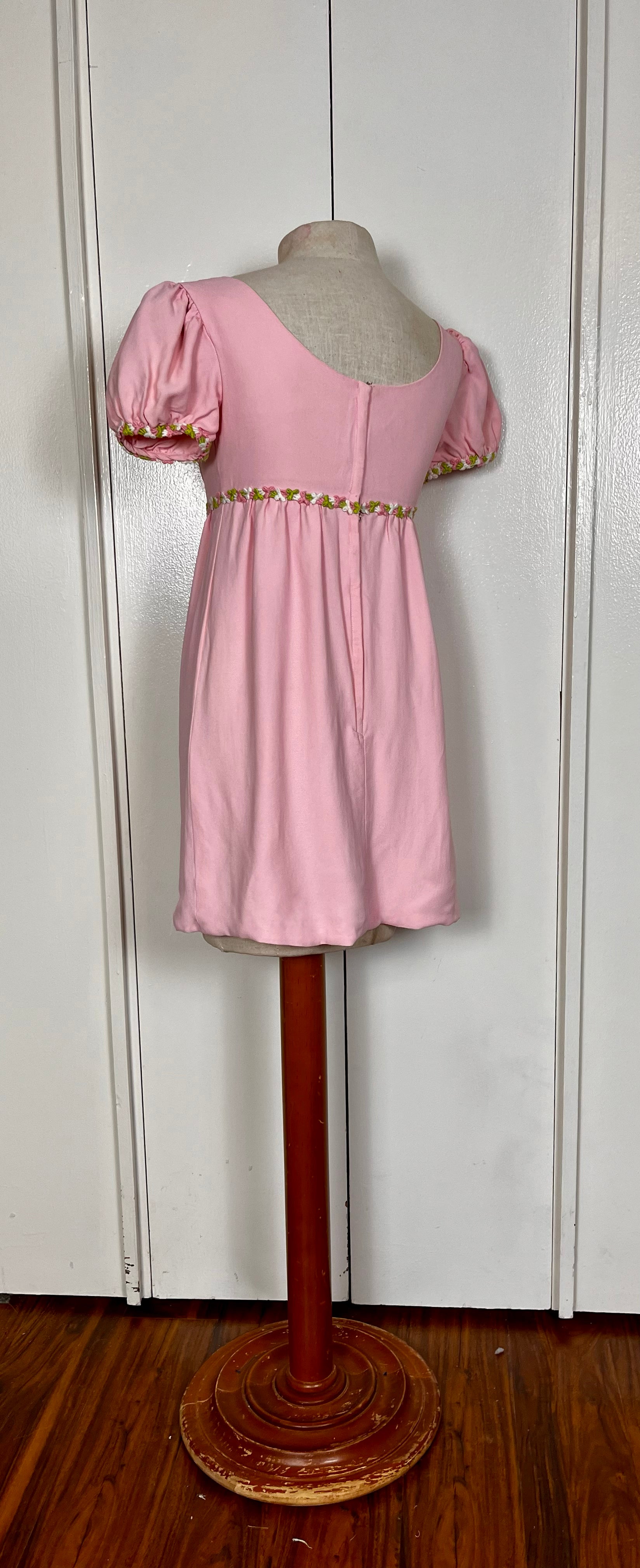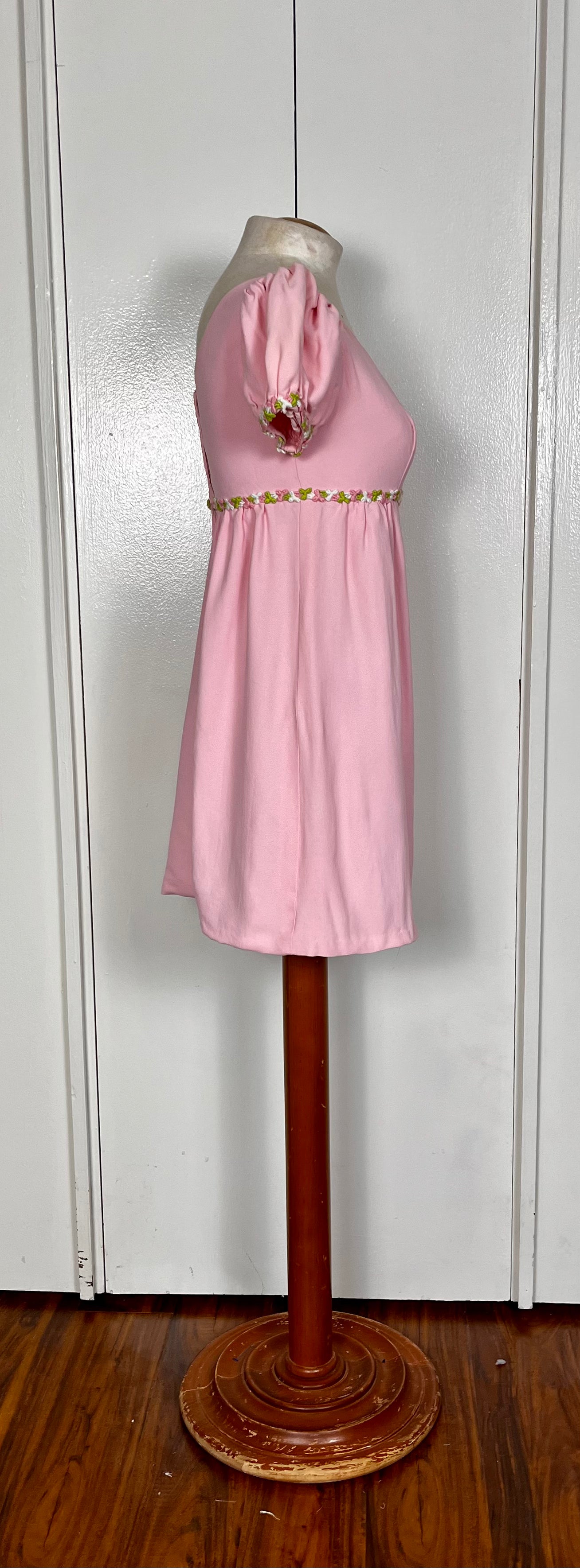 Vintage 1960's Baby Pink Micro Mini Puff Sleeve Babydoll Dress w/ Flower Trim