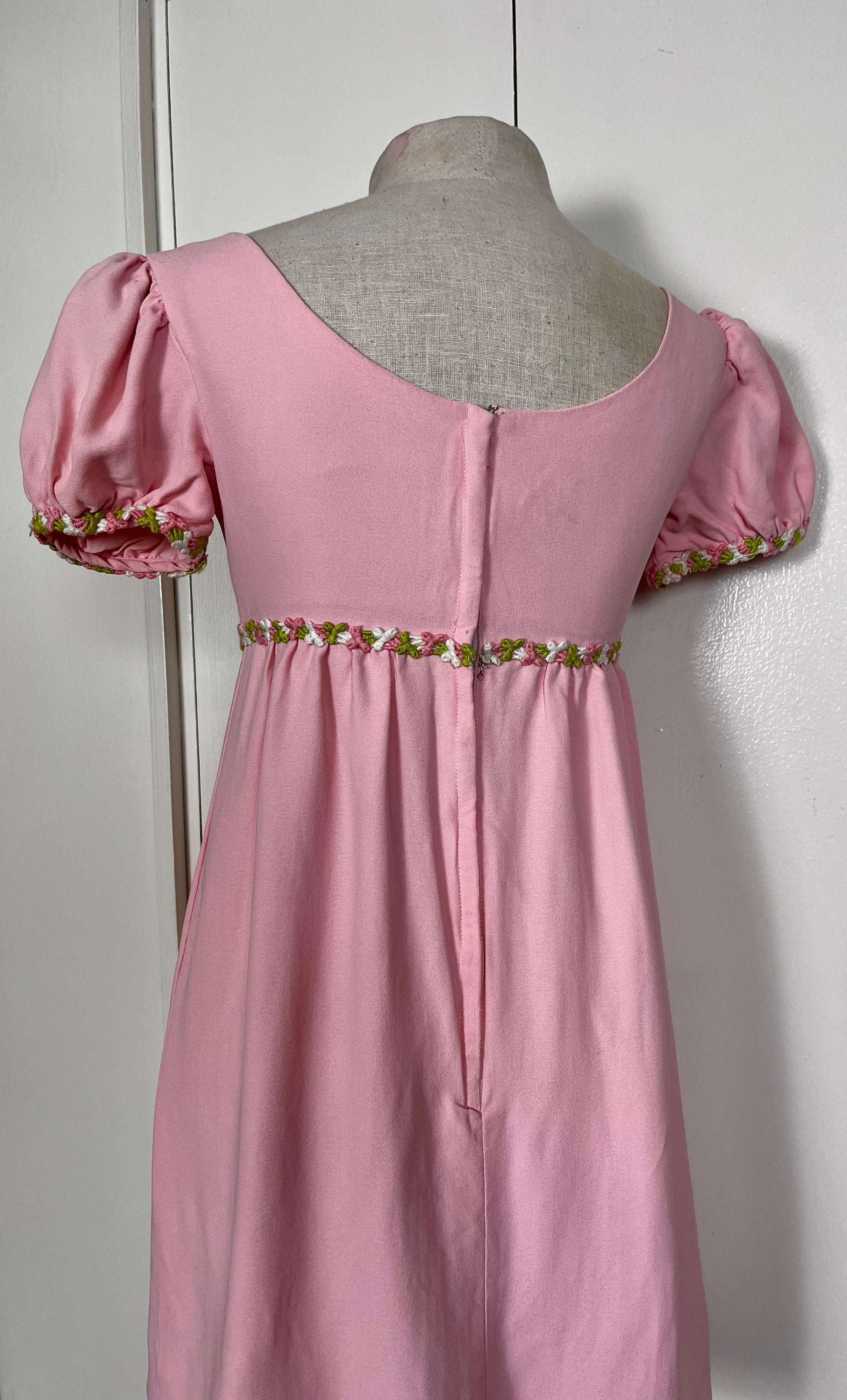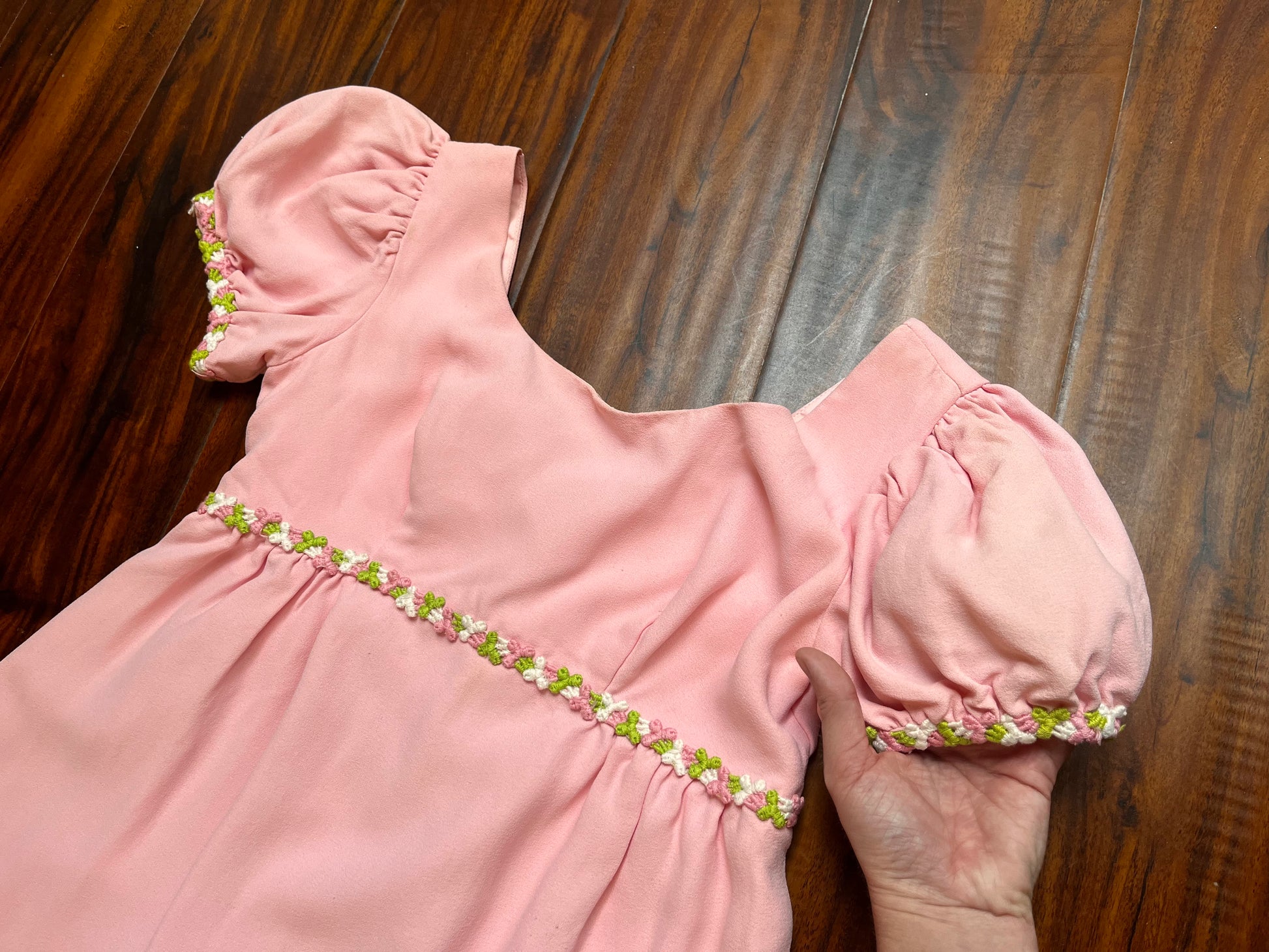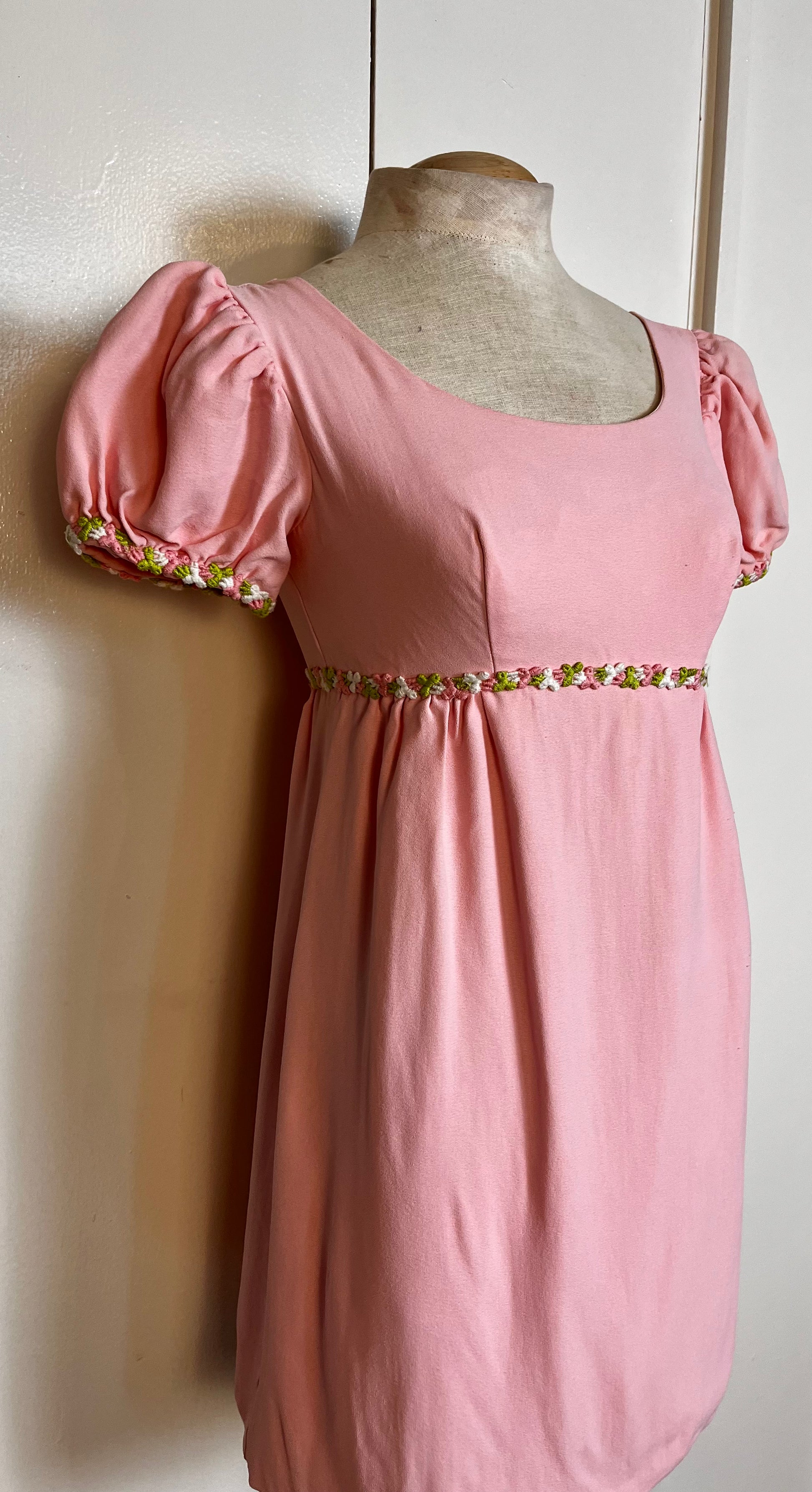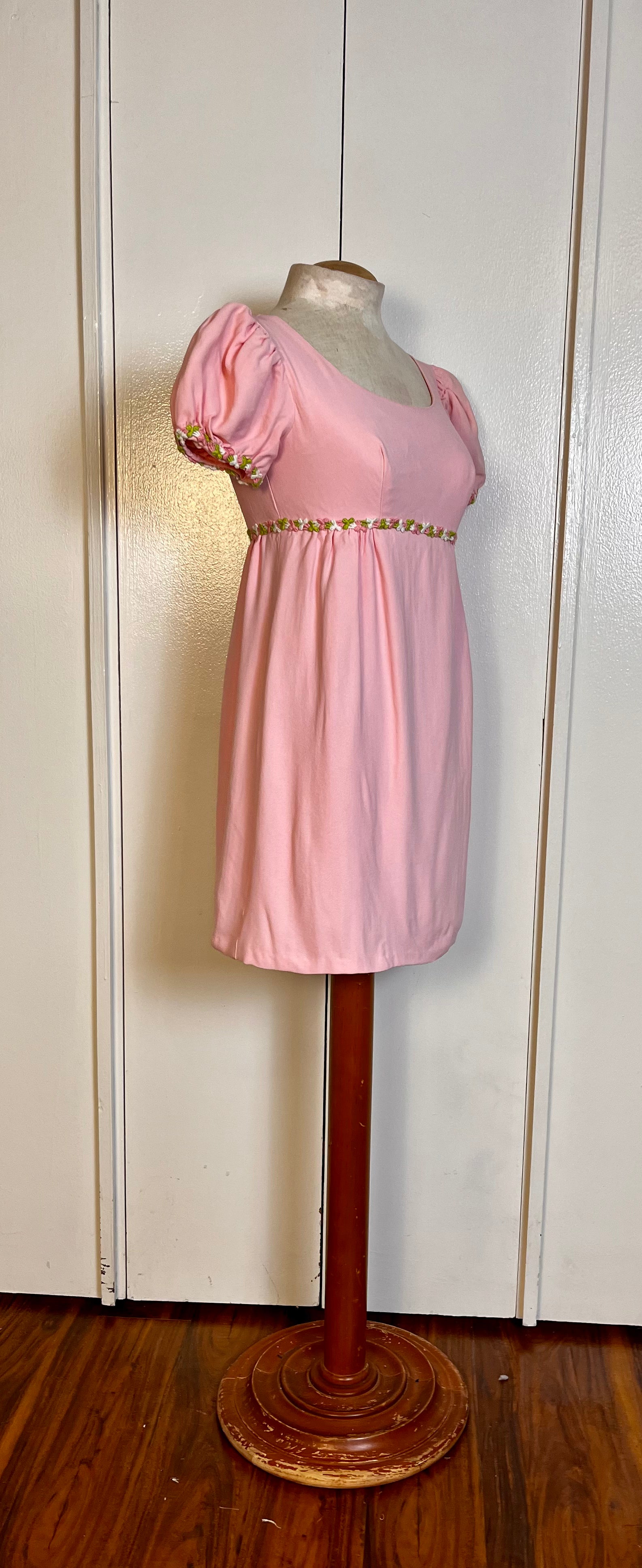 Vintage 1960's Baby Pink Micro Mini Puff Sleeve Babydoll Dress w/ Flower Trim