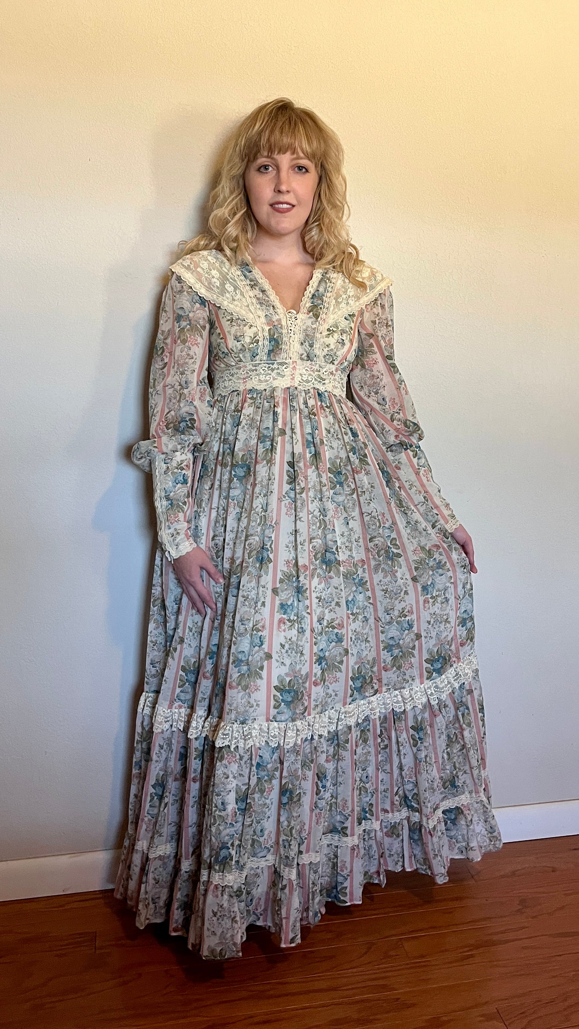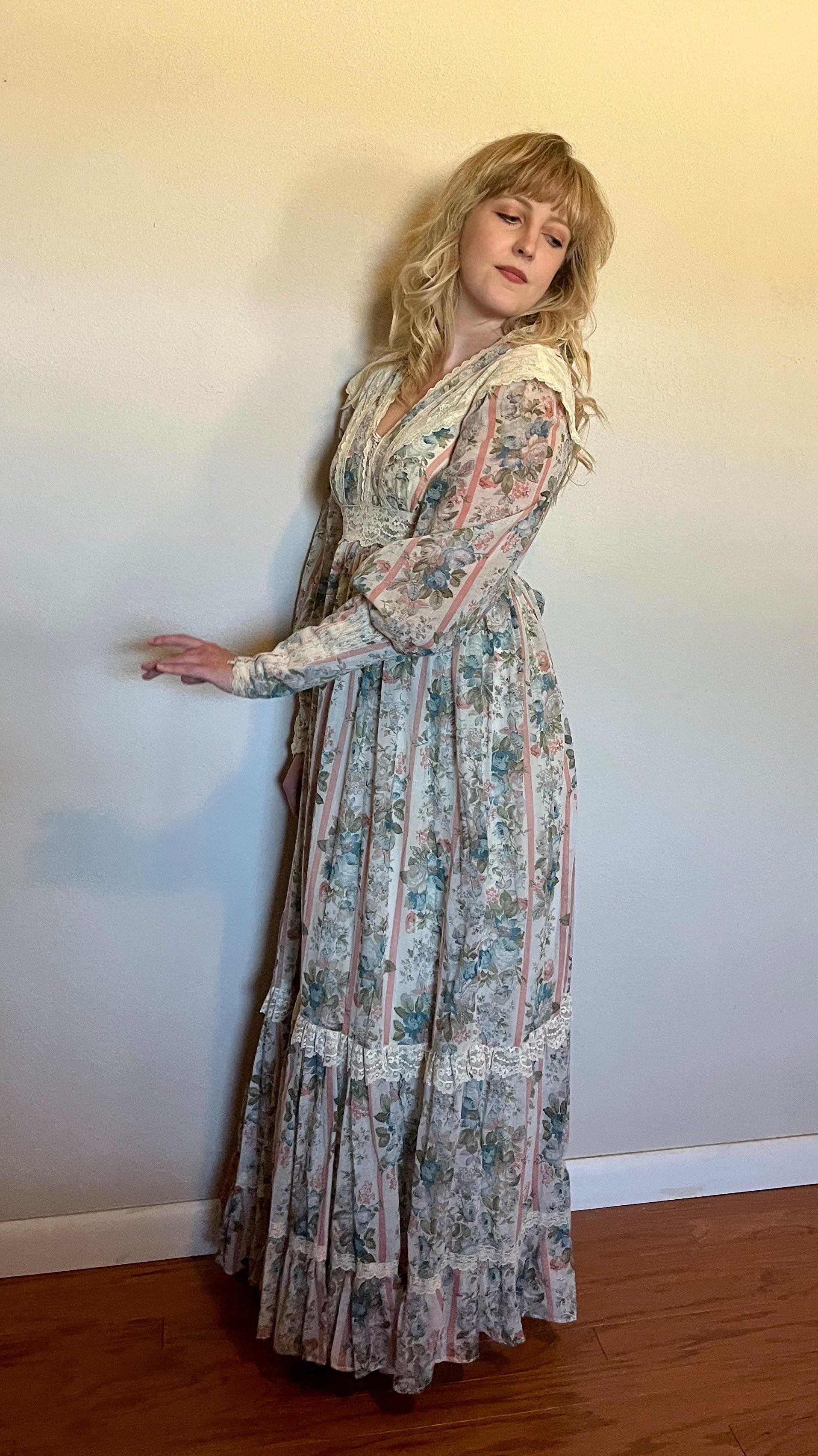 1970’s Gunne Sax Blue/Pink/Ivory Floral & Lace Long Sleeve Maxi Dress