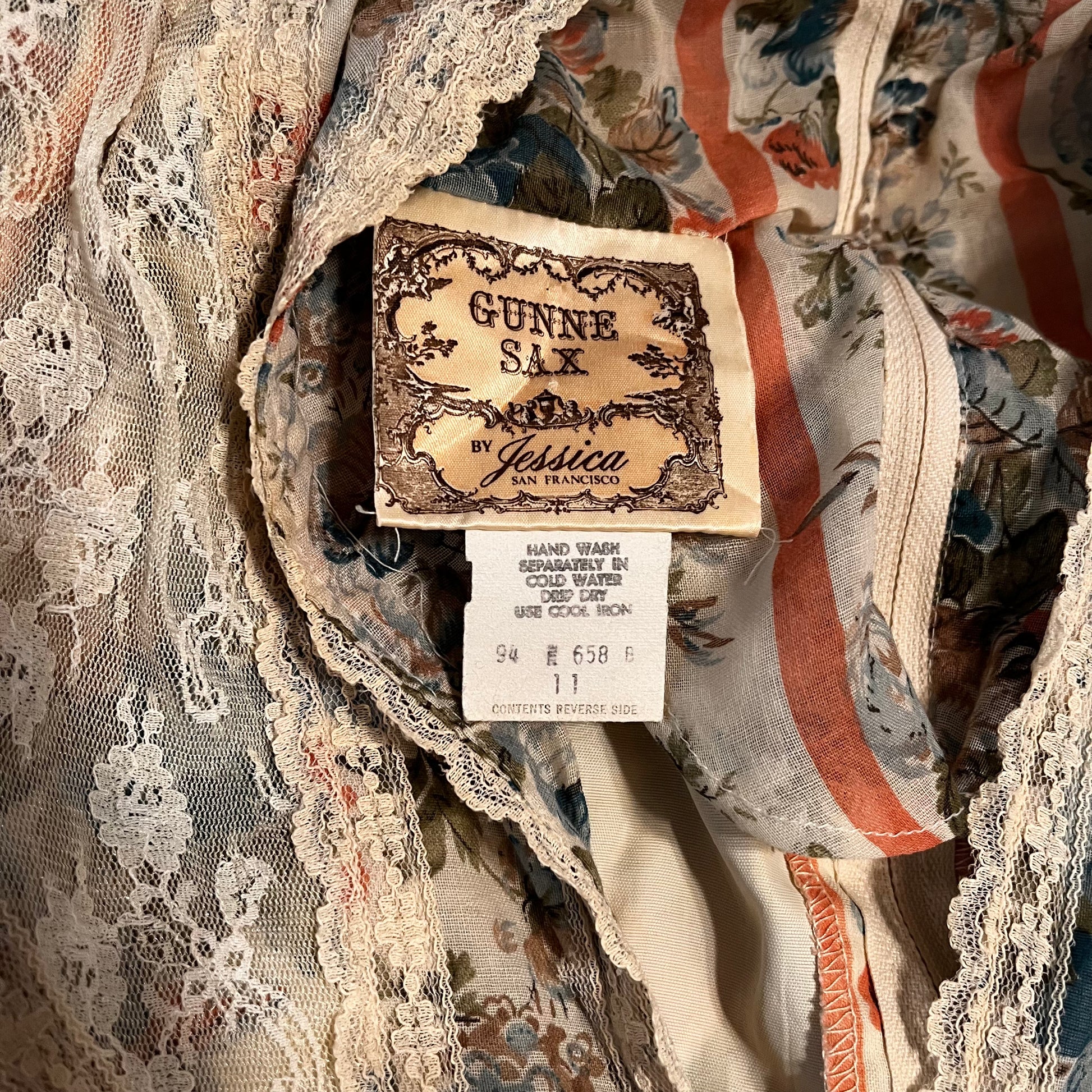 Vintage 1970’s Gunne Sax by Jessica McClintock Blue, Pink & Ivory Floral & Lace Long Sleeve Maxi Dress