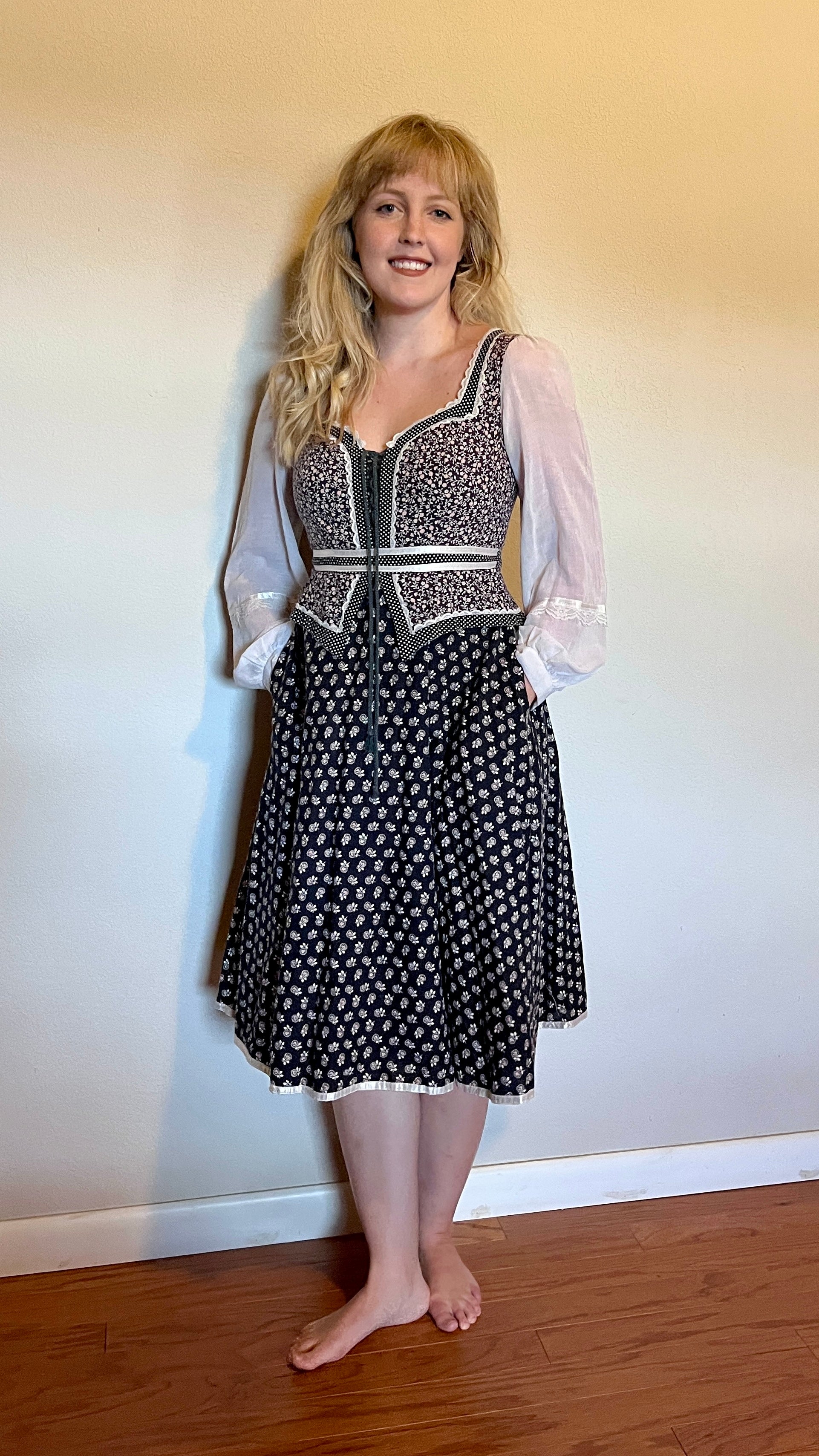 Good condition: The dress had minor sun-fading at the tops of the shoulders which we have corrected to restore its original color. Other areas of the dress show less than minor areas of sun exposure and wash + wear: there are no particular spots or streaks of sun fading, but rather an overall sense of prior use, as the cotton has been gently broken-in by previous owner(s). Originally this dress would have had an additional coordinating polka dot skirt band at the bottom of the skirt, but it had been [previously] altered.