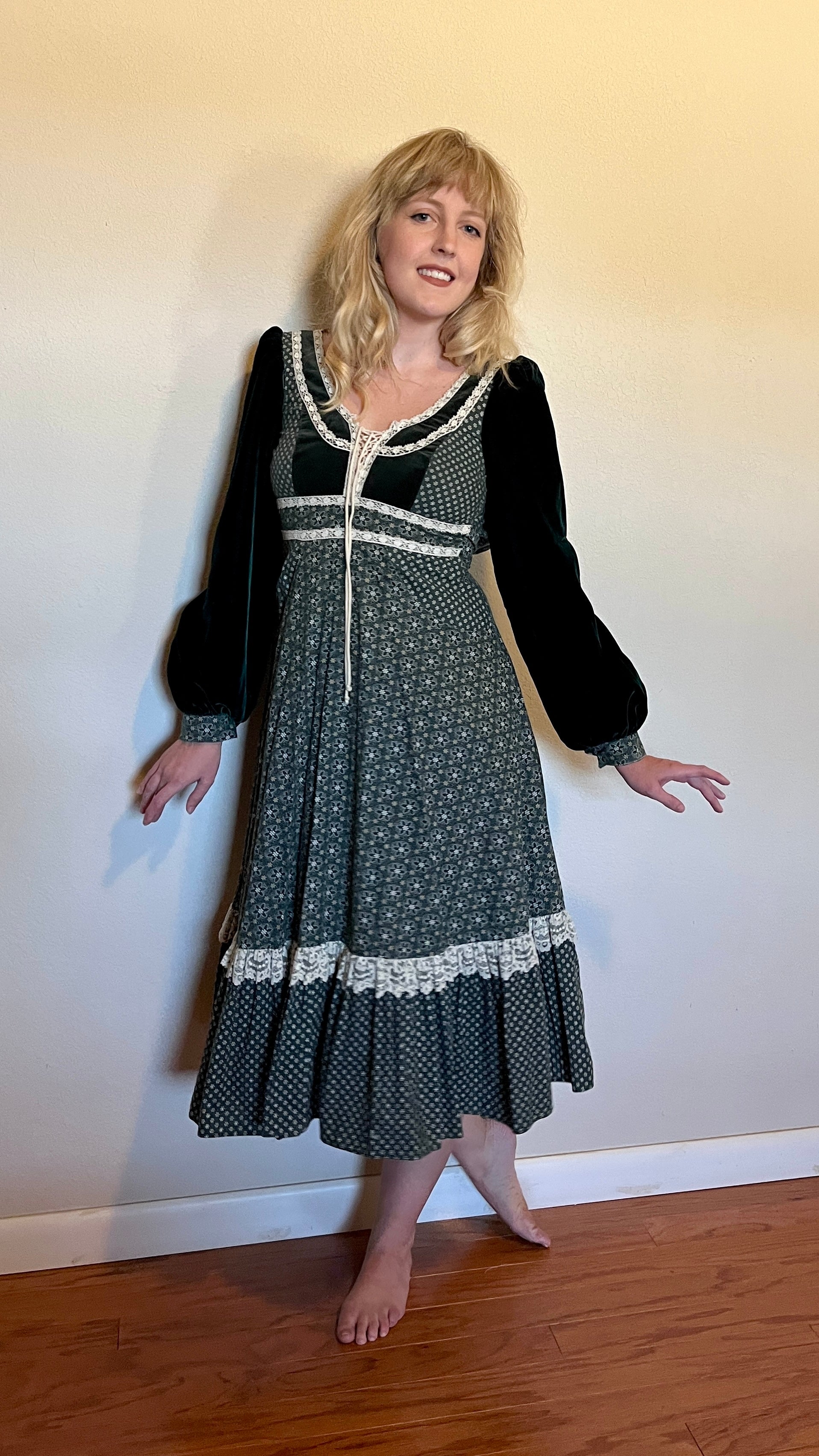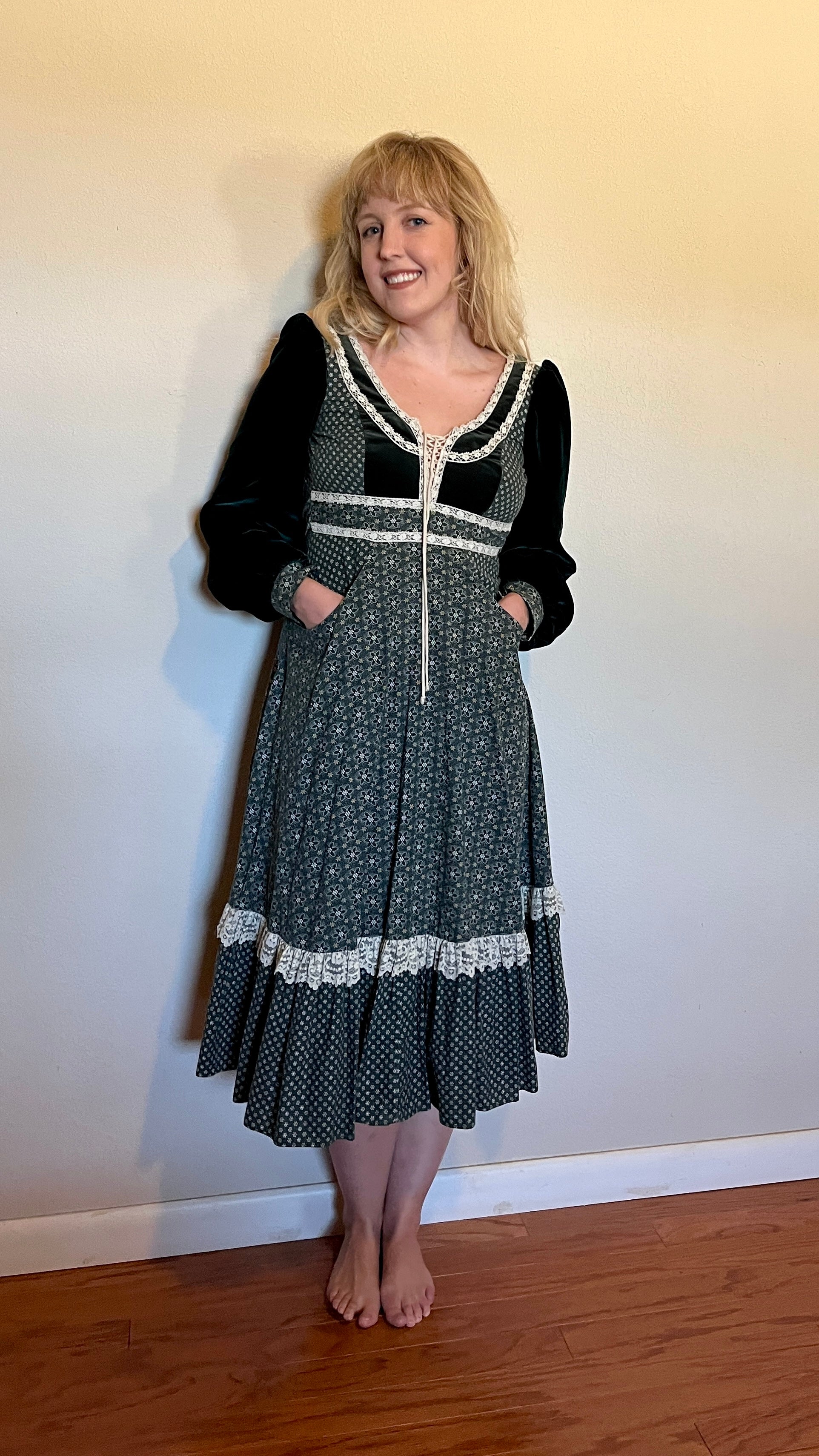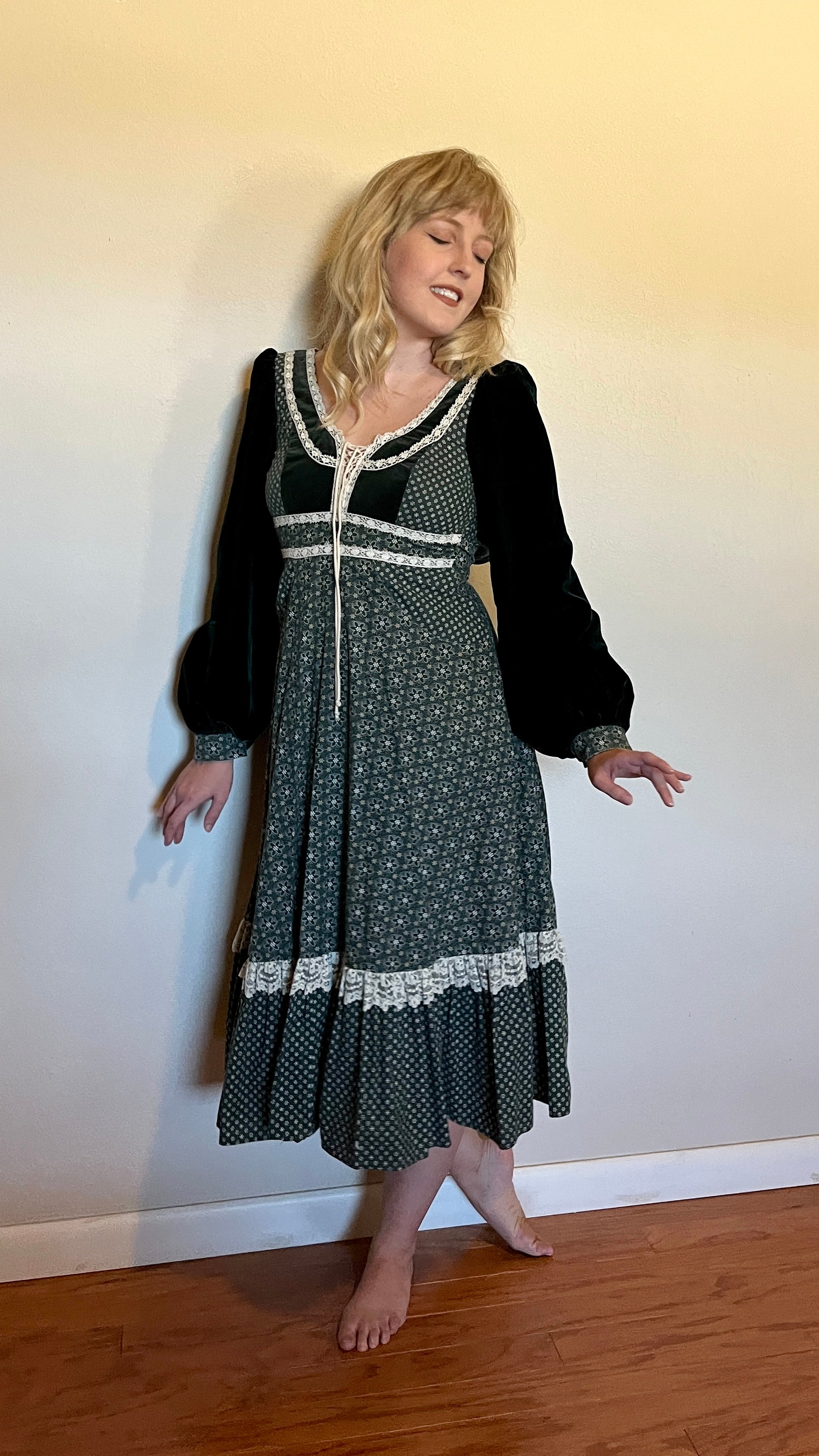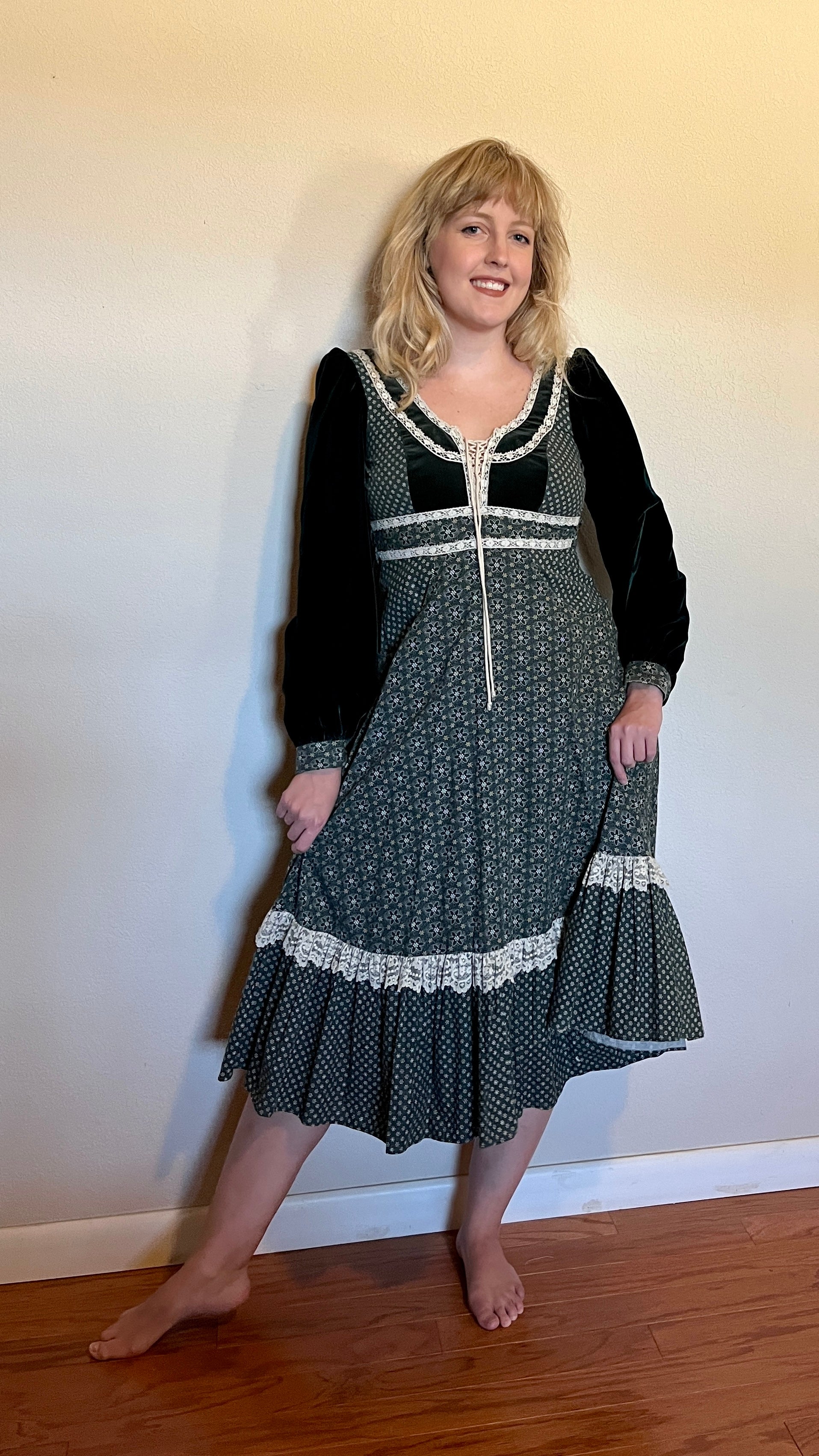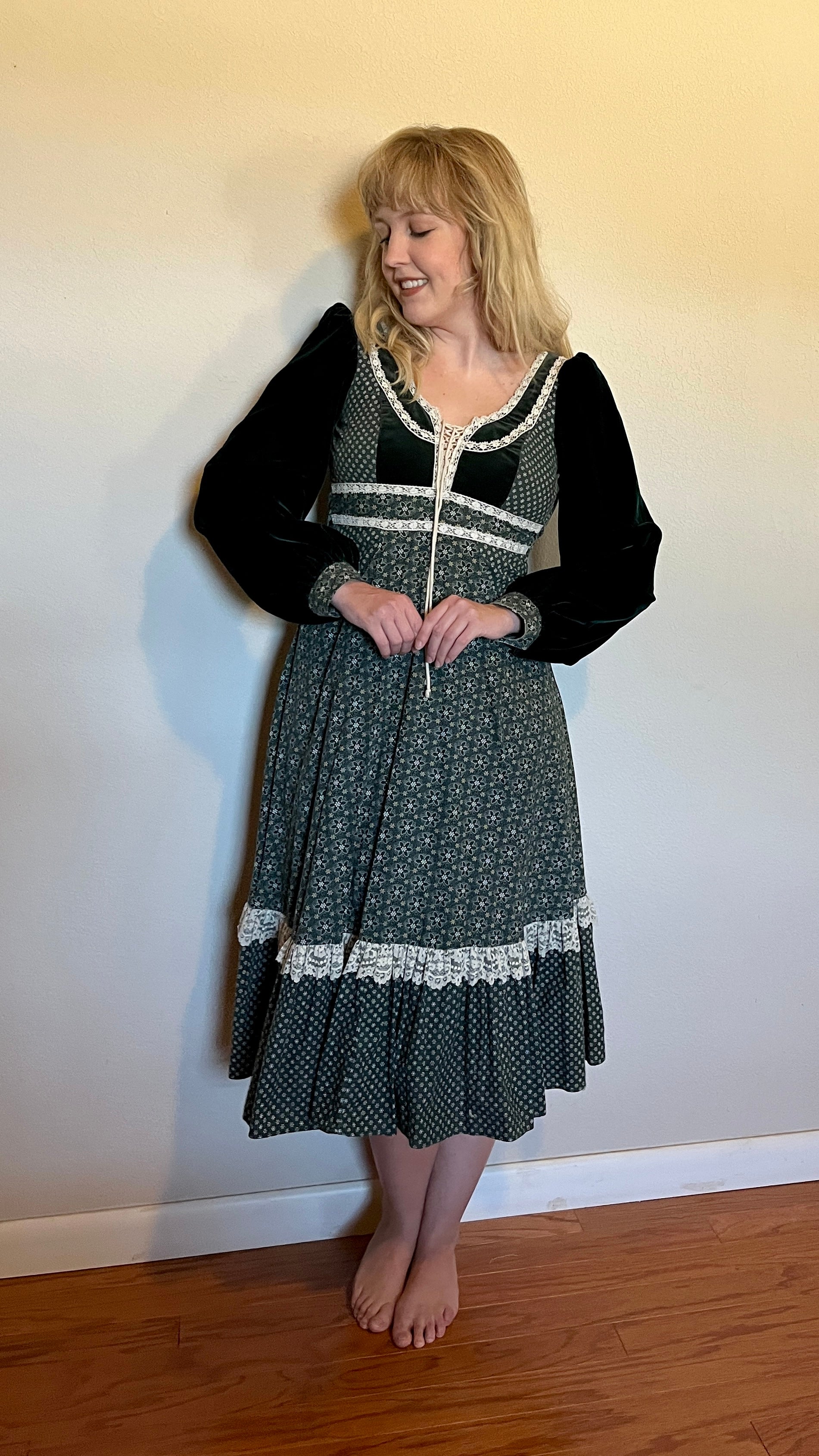 Vintage 1970’s Gunne Sax by Jessica McClintock Green Calico Midi Dress (Altered)