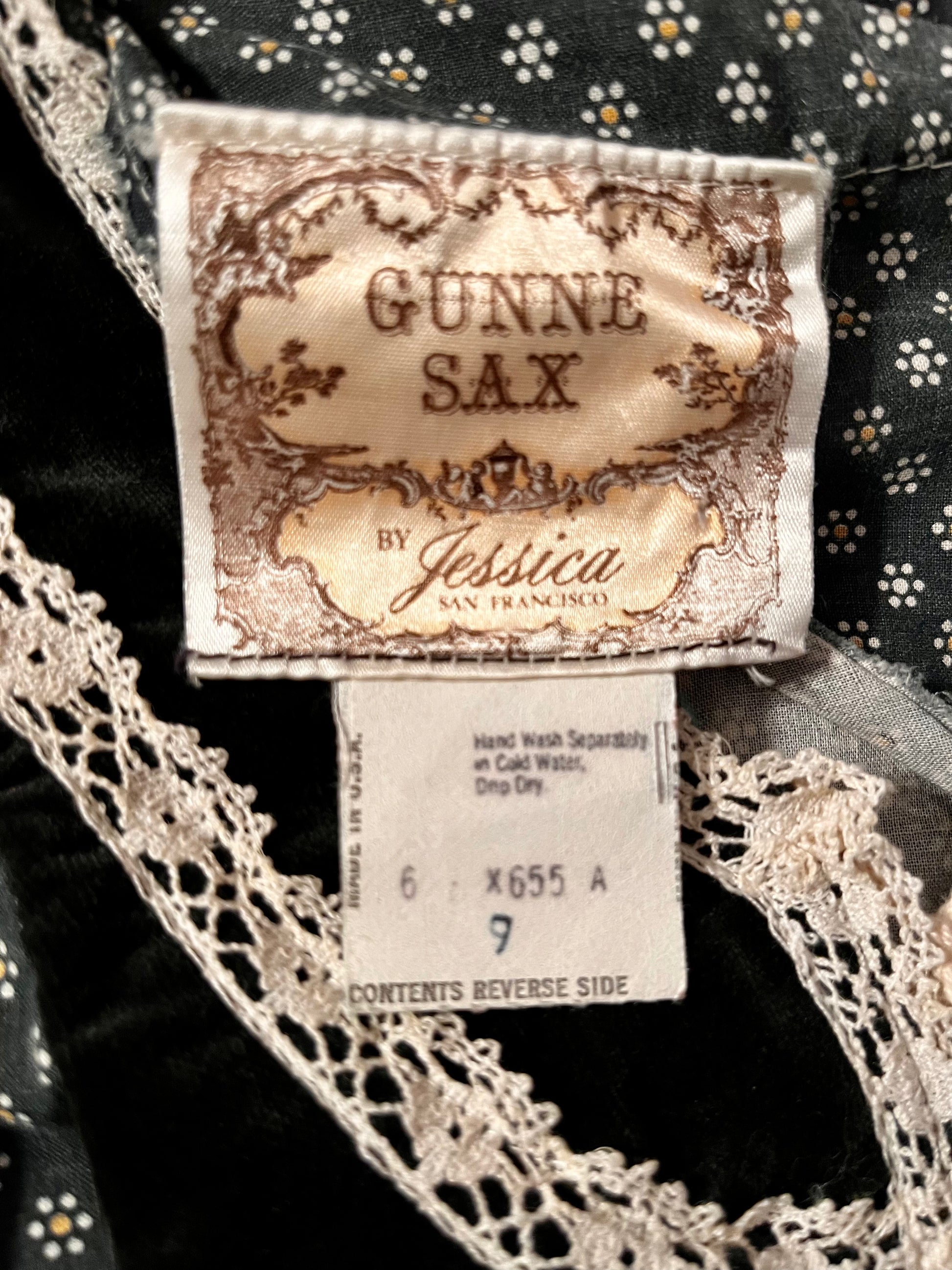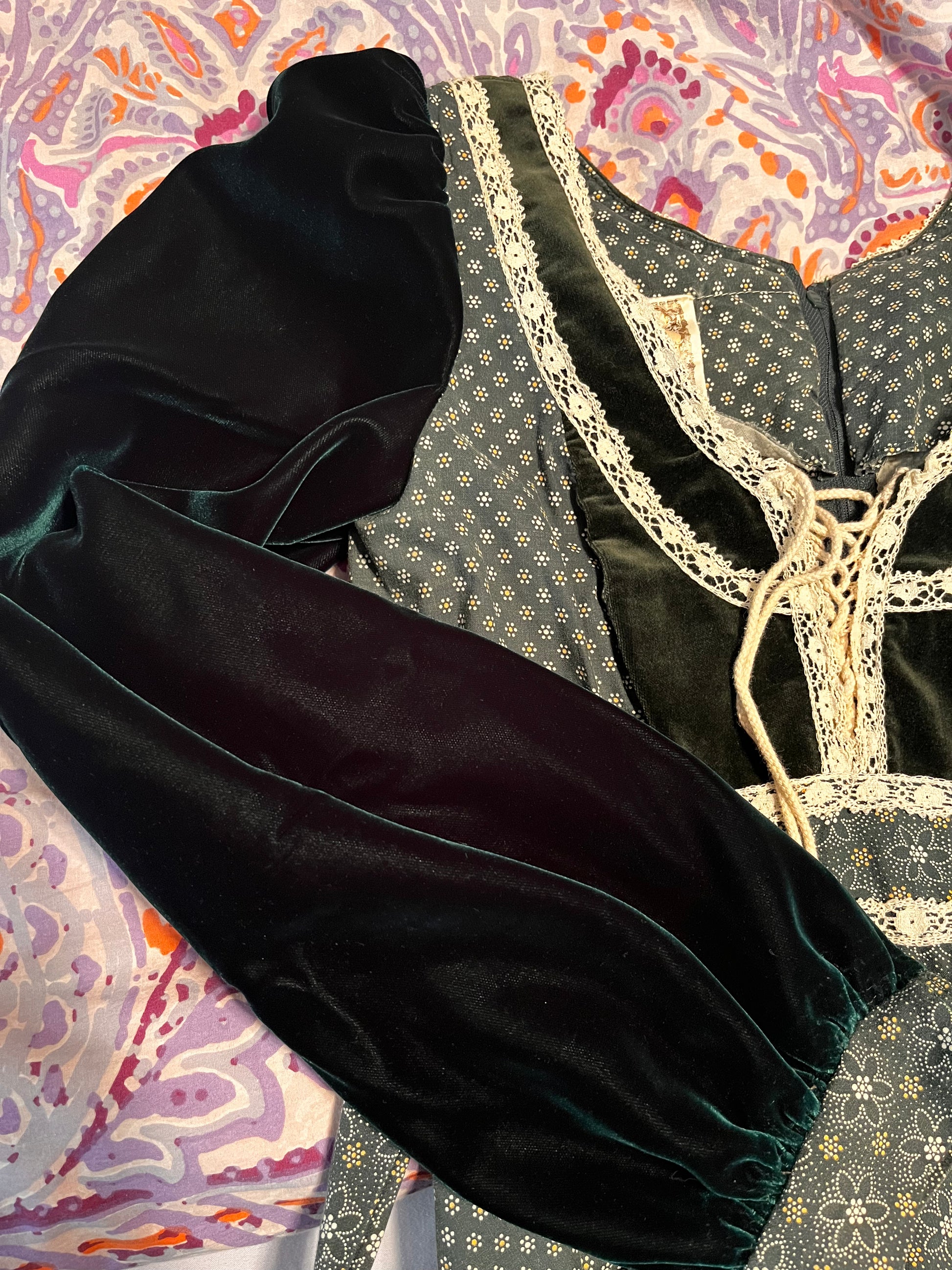 Good condition: The original sleeves to this dress had been removed by its prior owner: we found a coordinating green velvet fabric to match the center front velvet panel on the bodice and used a Simplicity Gunne Sax sleeve pattern piece to recreate the original shape. We used a small portion of the fabric from the waist ties to construct matching cuffs. Please note that there is a slight difference in tone between the sleeve and the front, as the sleeve is a green with a blue-undertone color and the front is a green with a yellow-undertone color. There is also a very small, hand-sewn mend at the skirt hem.