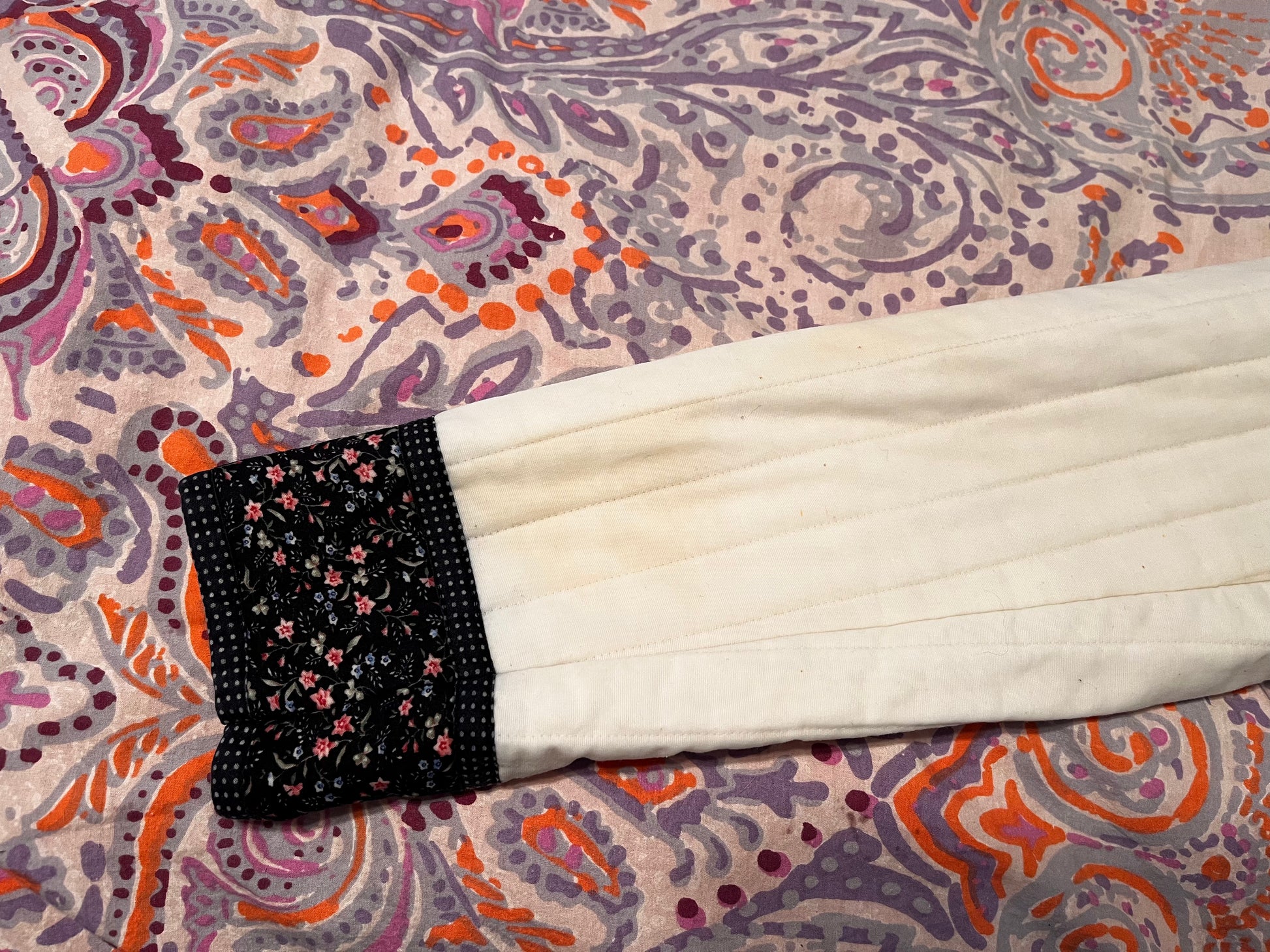 Fair condition: The toggle button on the collar is missing; all others are intact. There are signs of prior wash and wear evident on the blue polka dot trim as some fade has occurred over time. There is an area on the sleeve near the cuff that has some yellowing (please see last photo)