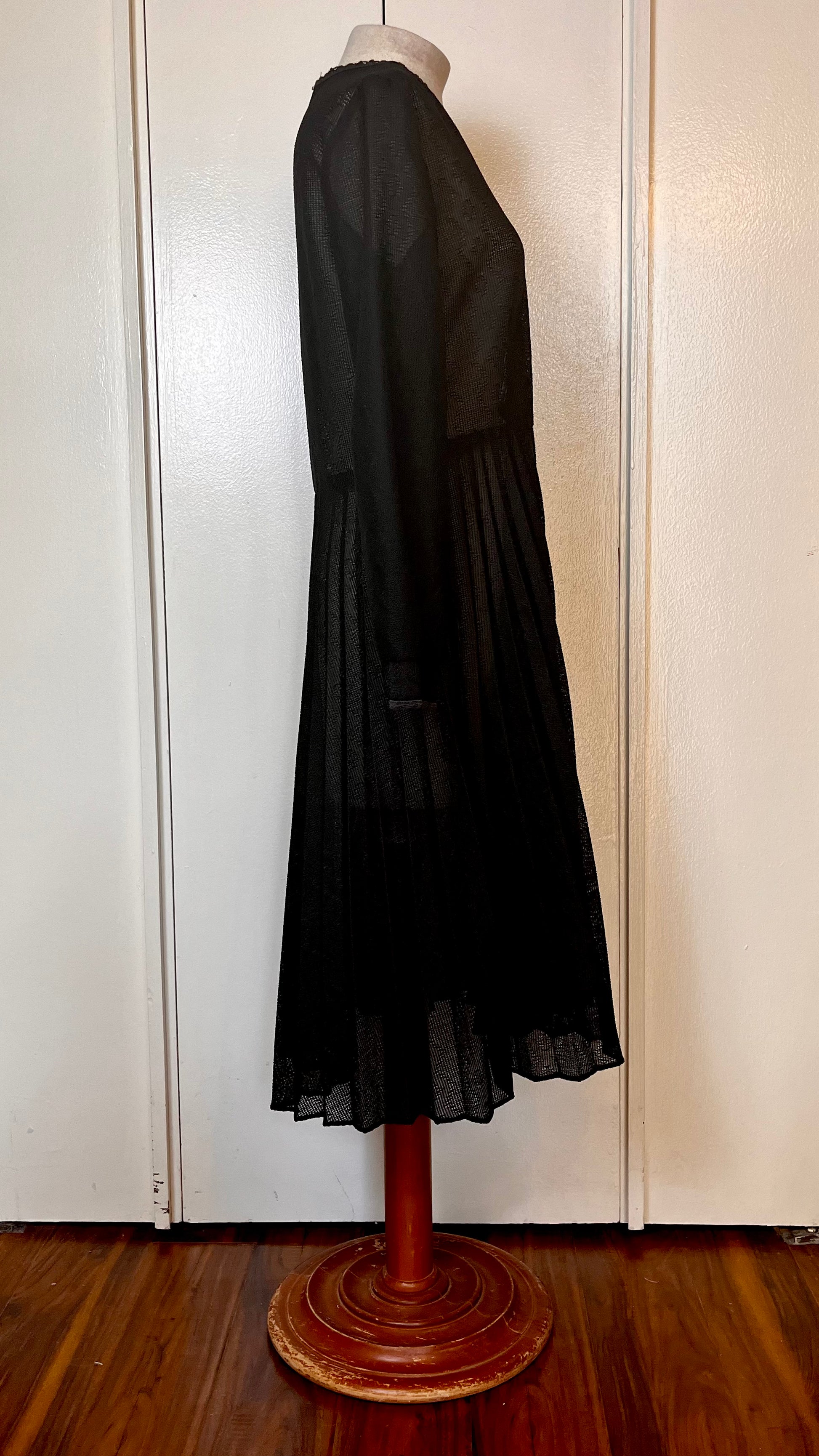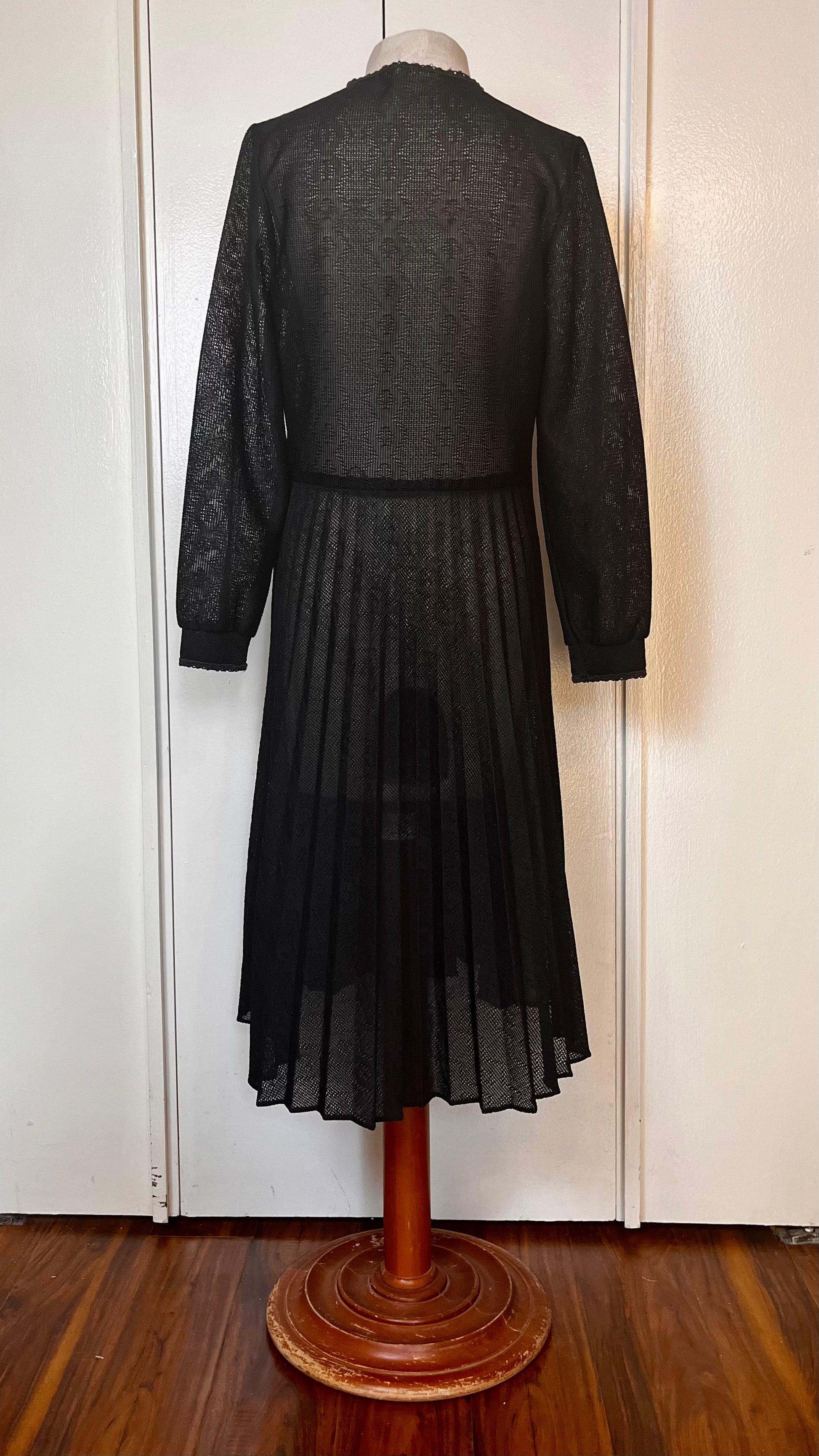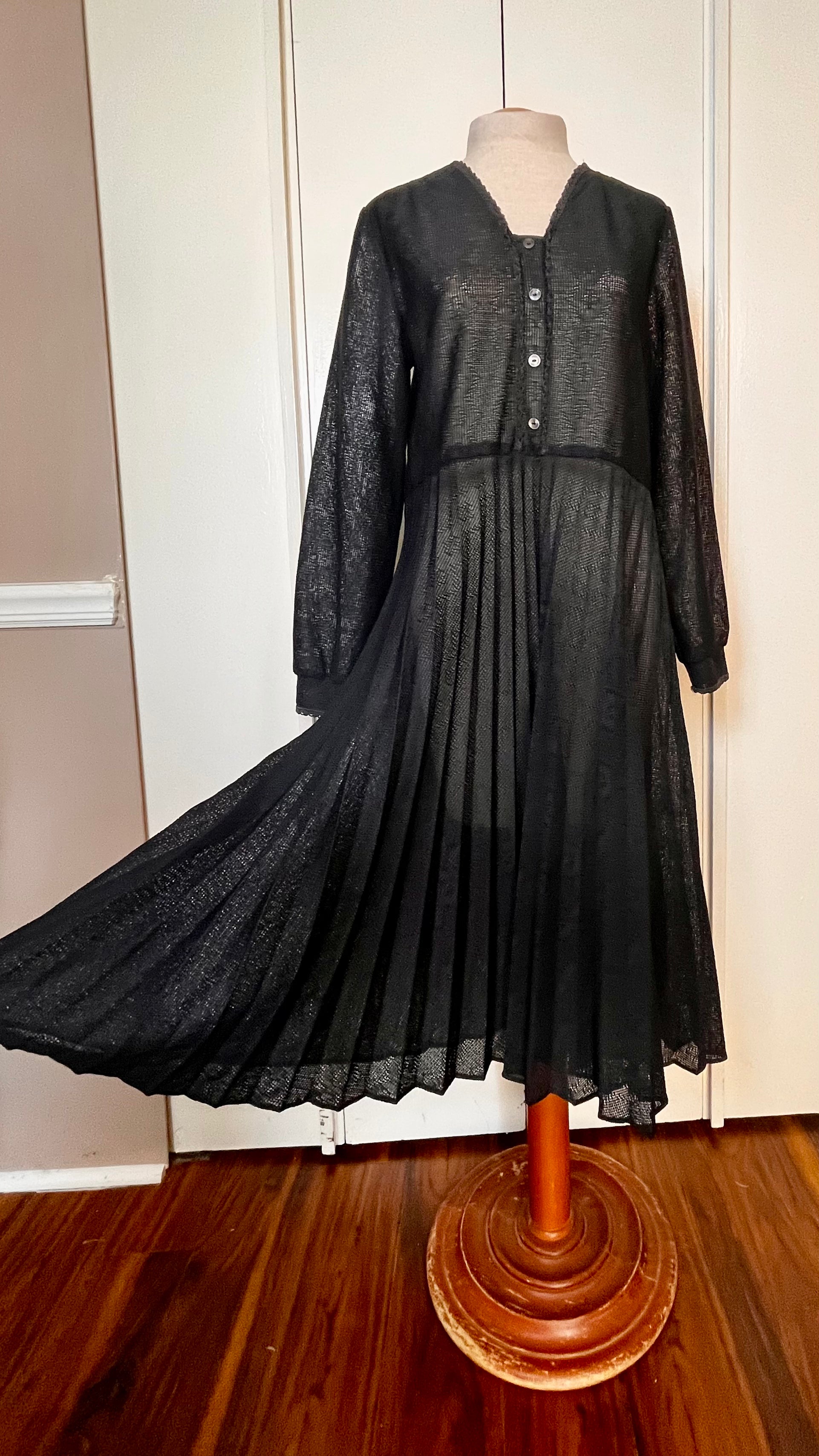 Vintage 1970’s Montgomery Ward Semi-Sheer Black Mesh Net Midi Dress with Balloon Sleeves, Pleated Skirt, and Button-Front Accent
