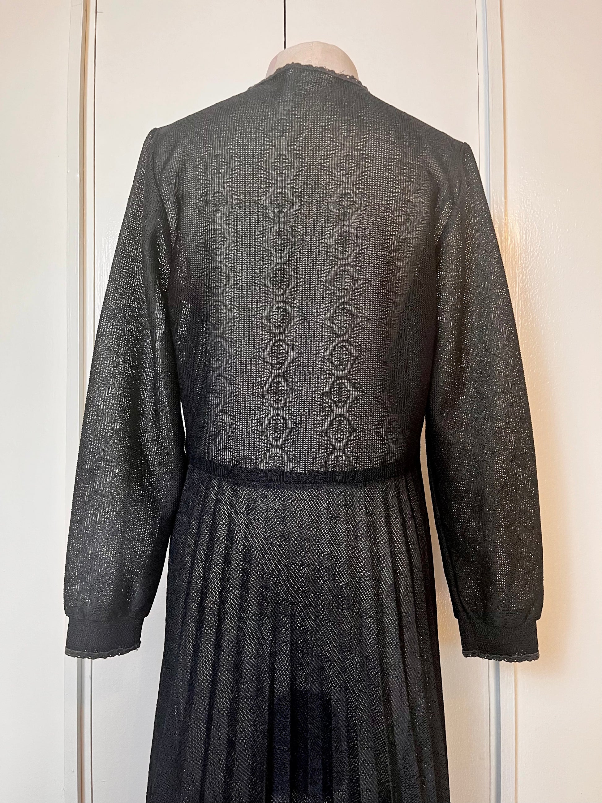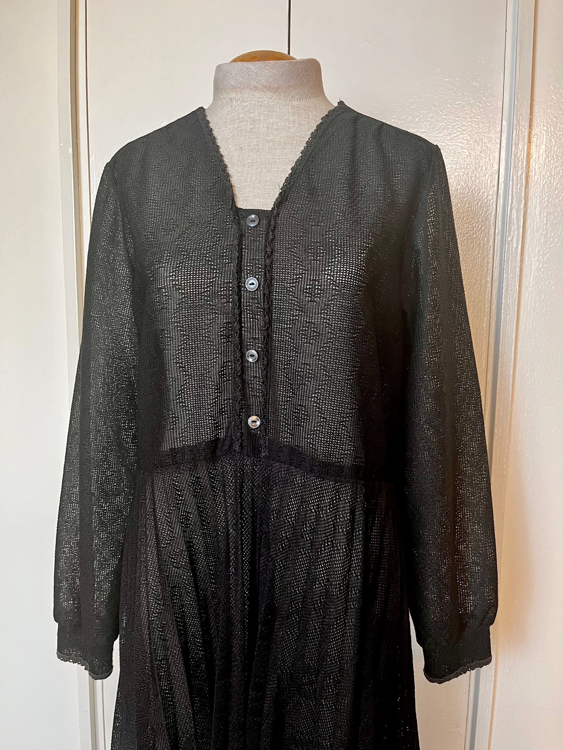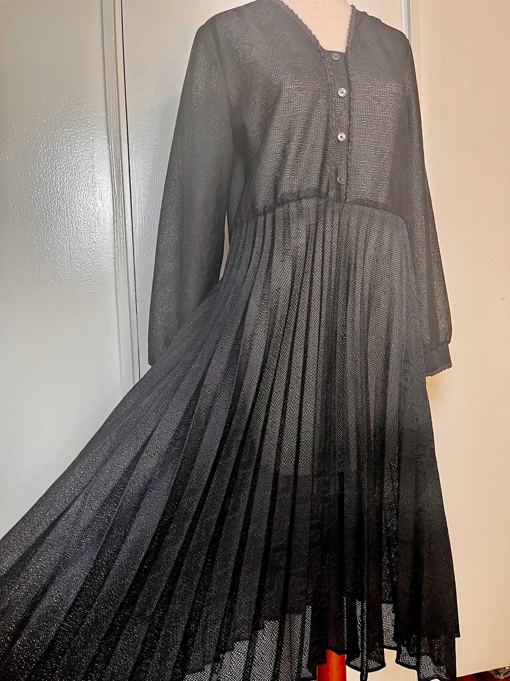 Vintage 1970’s Montgomery Ward Semi-Sheer Black Mesh Net Midi Dress with Balloon Sleeves, Pleated Skirt, and Button-Front Accent