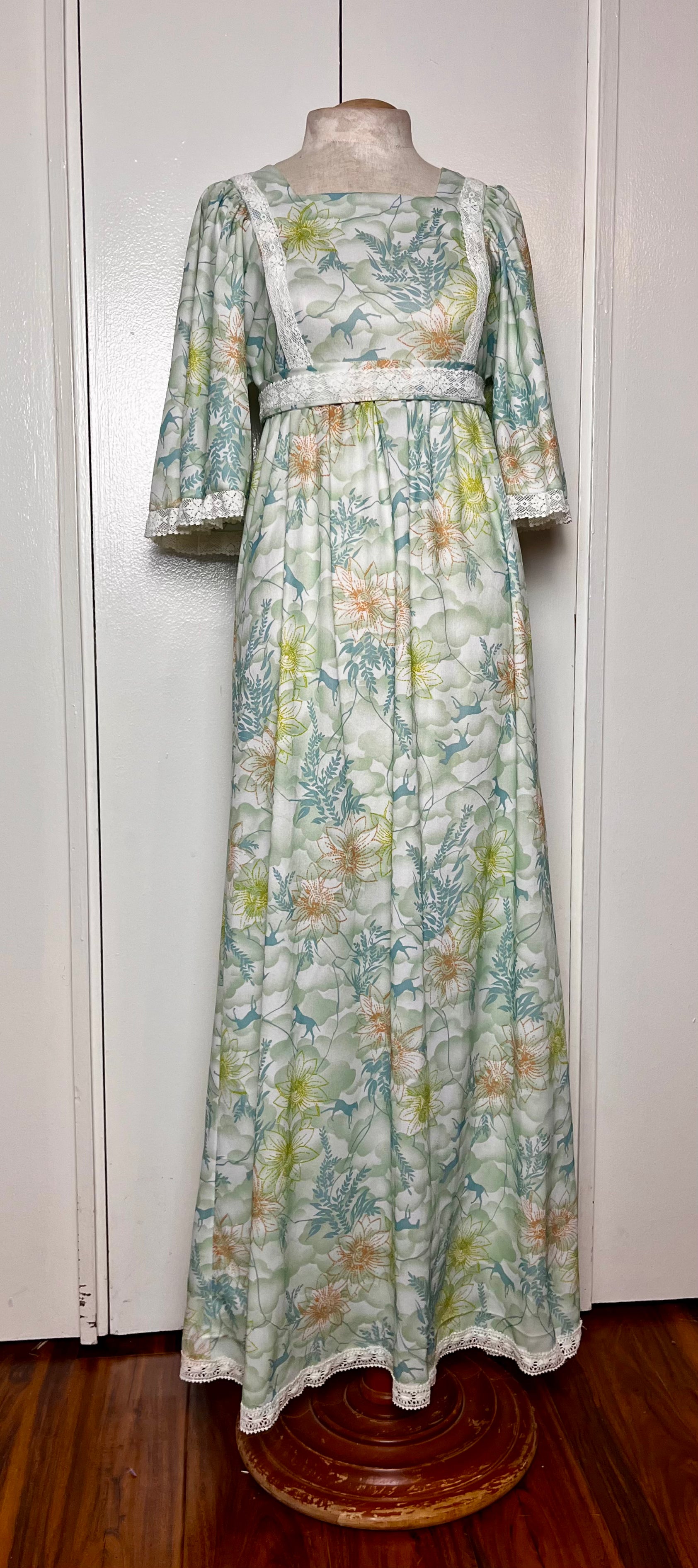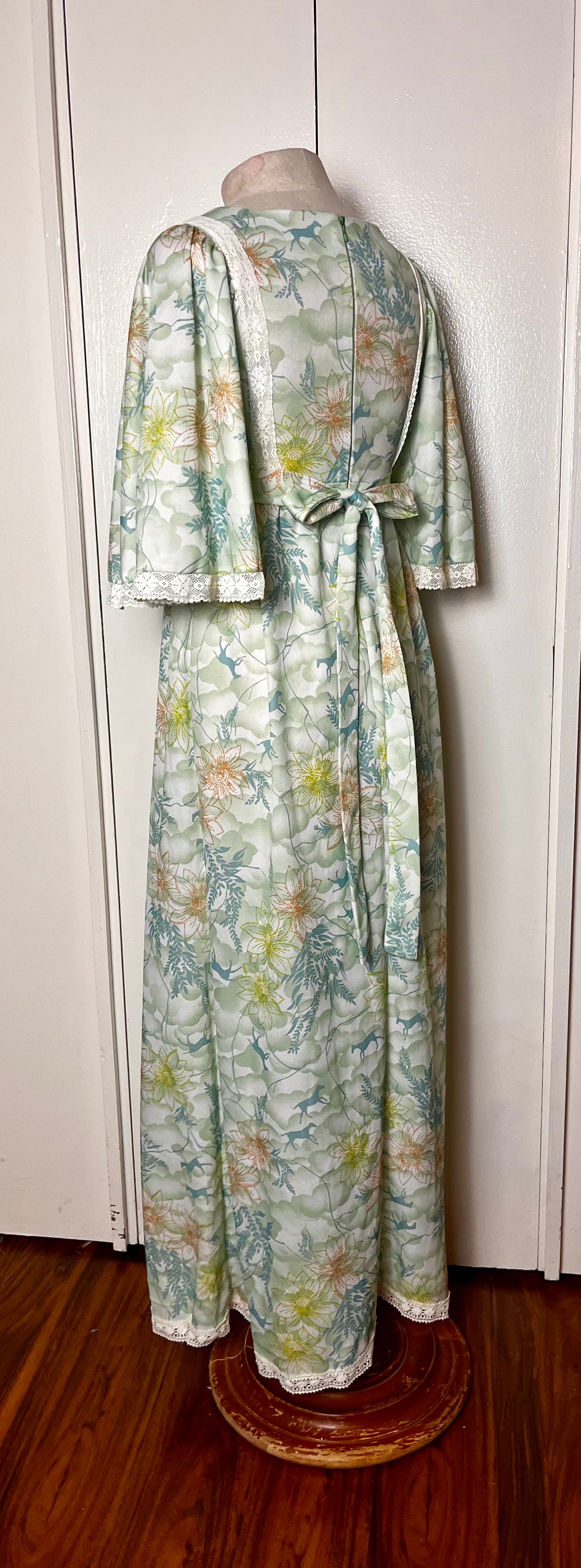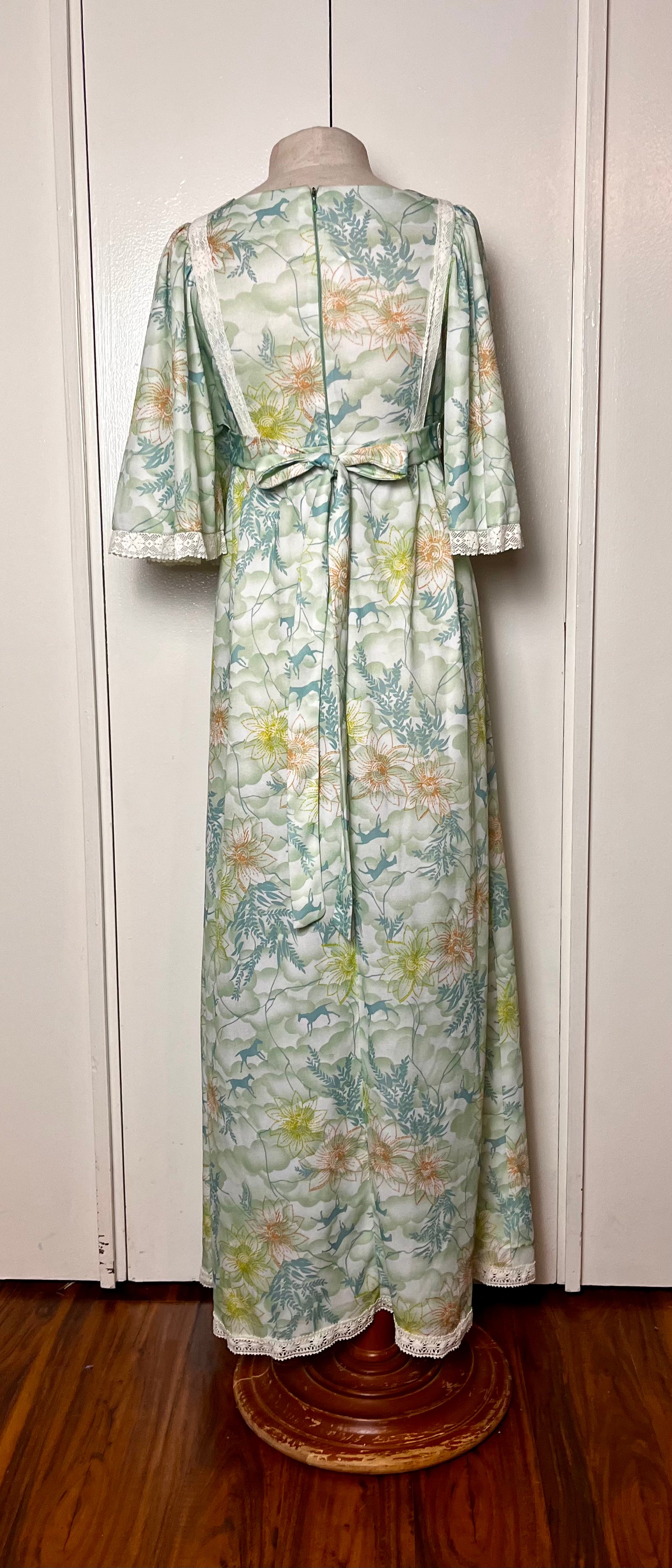 Vintage 1970’s Teal Horse-Print Flutter Sleeve Maxi Dress