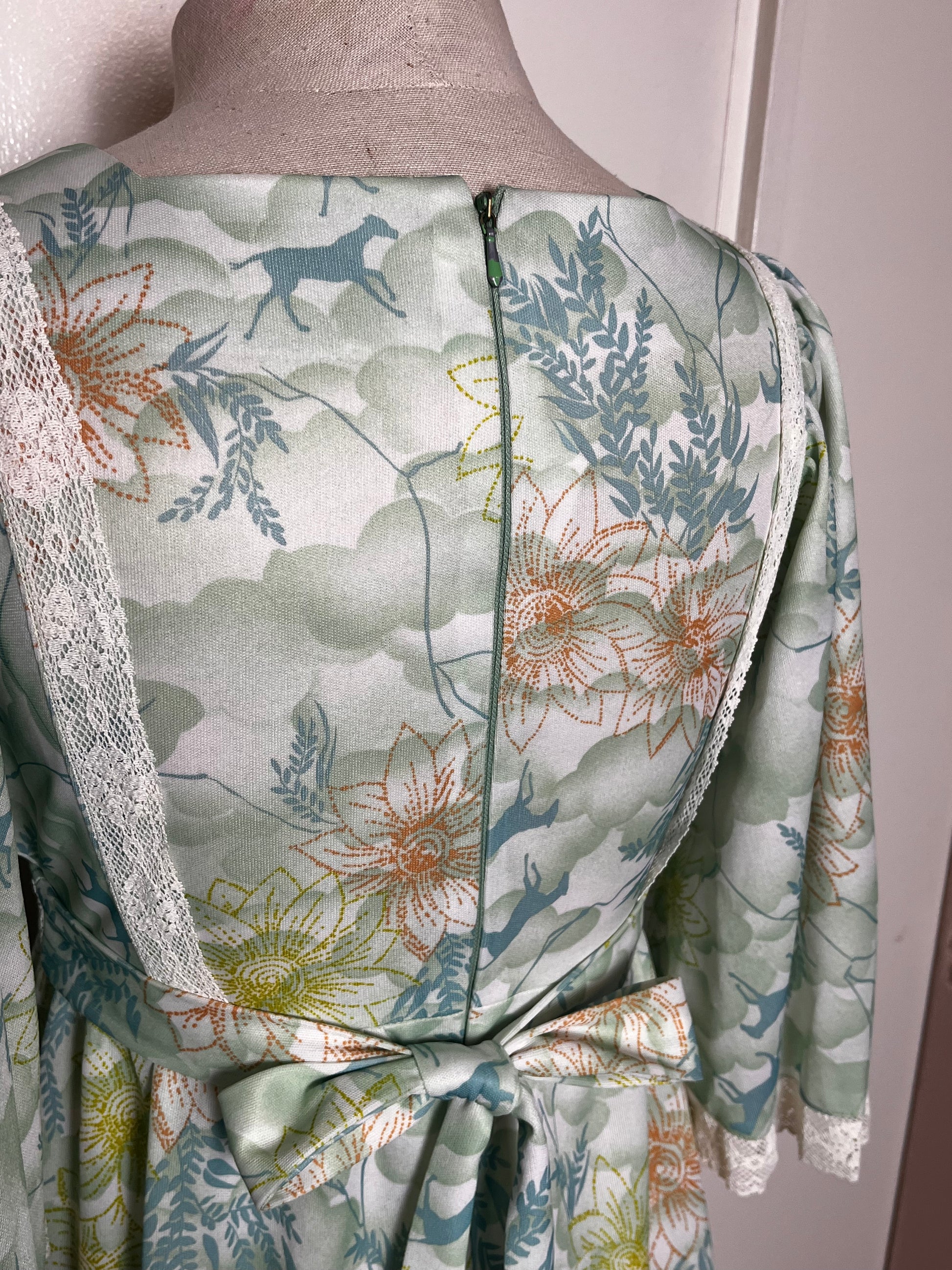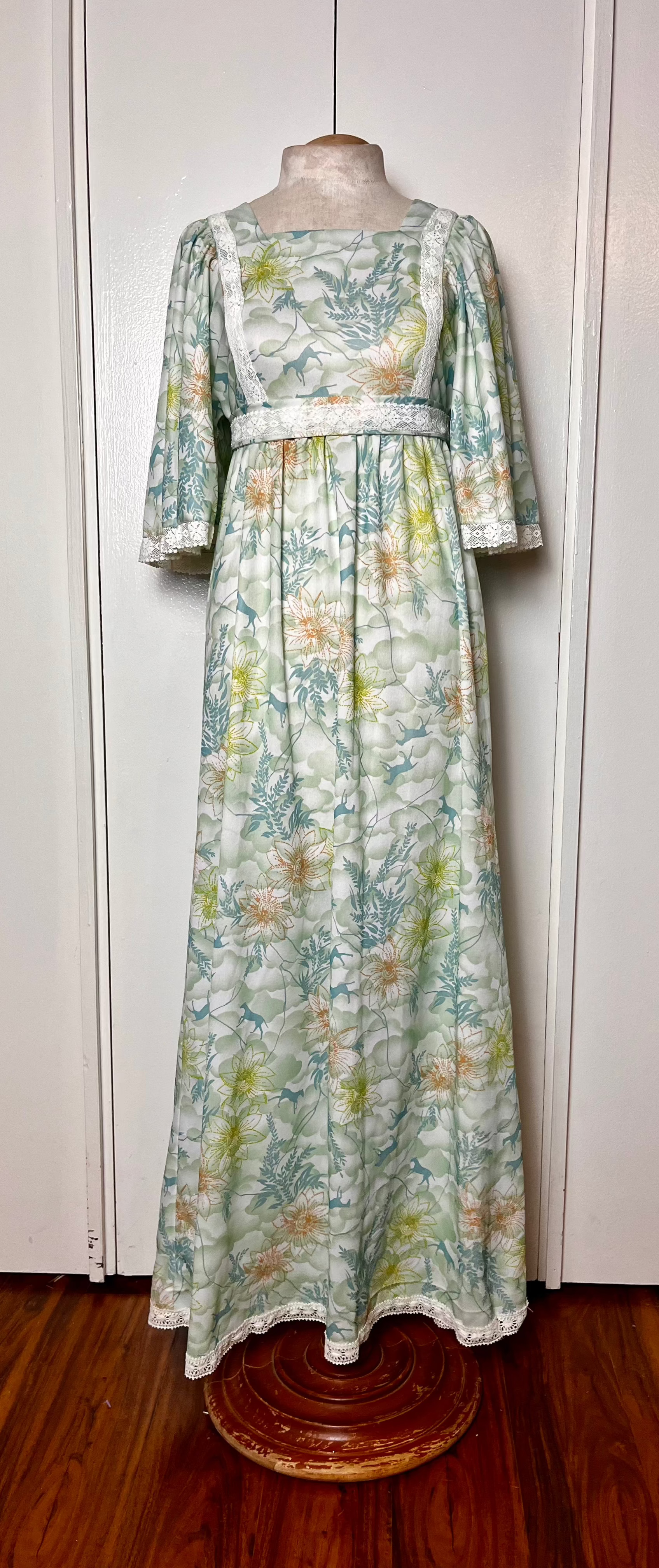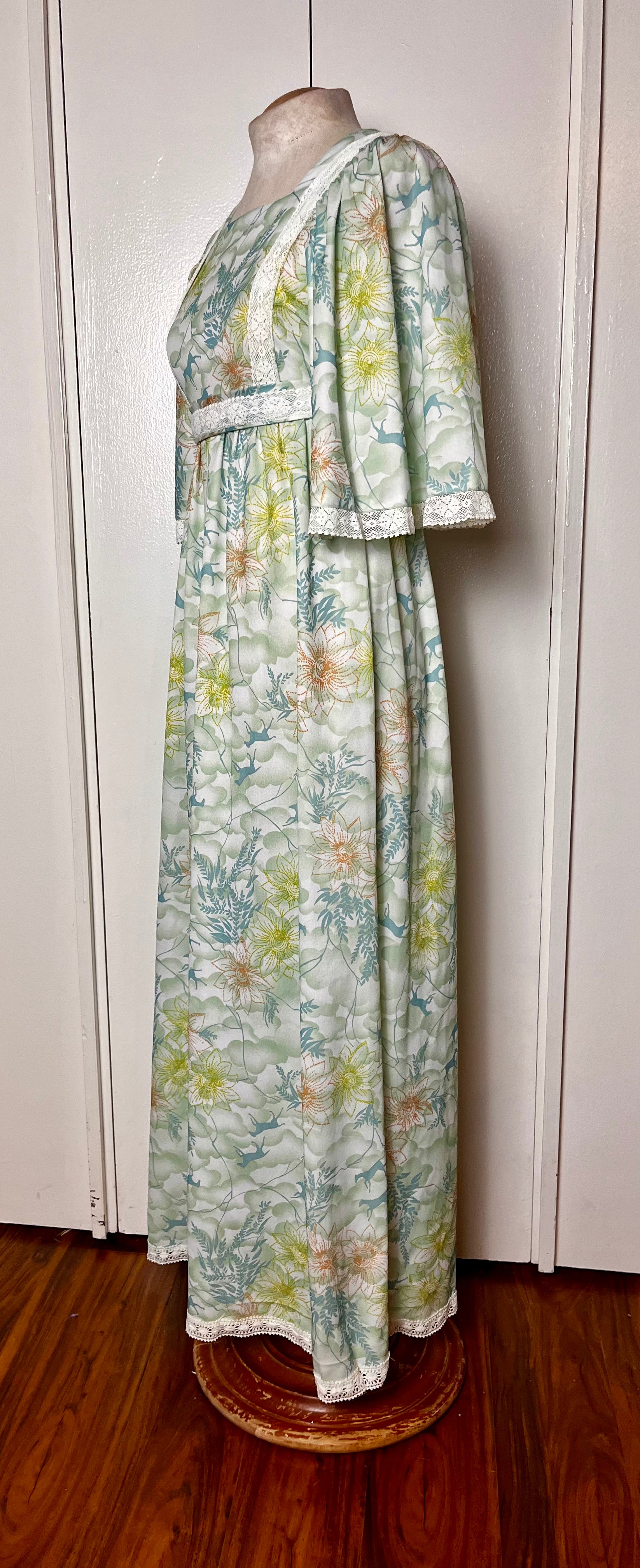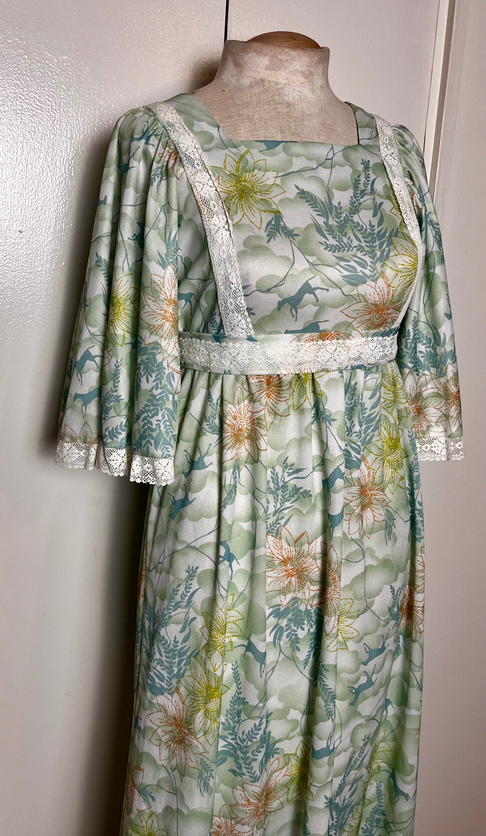 Vintage 1970’s Teal Horse-Print Flutter Sleeve Maxi Dress