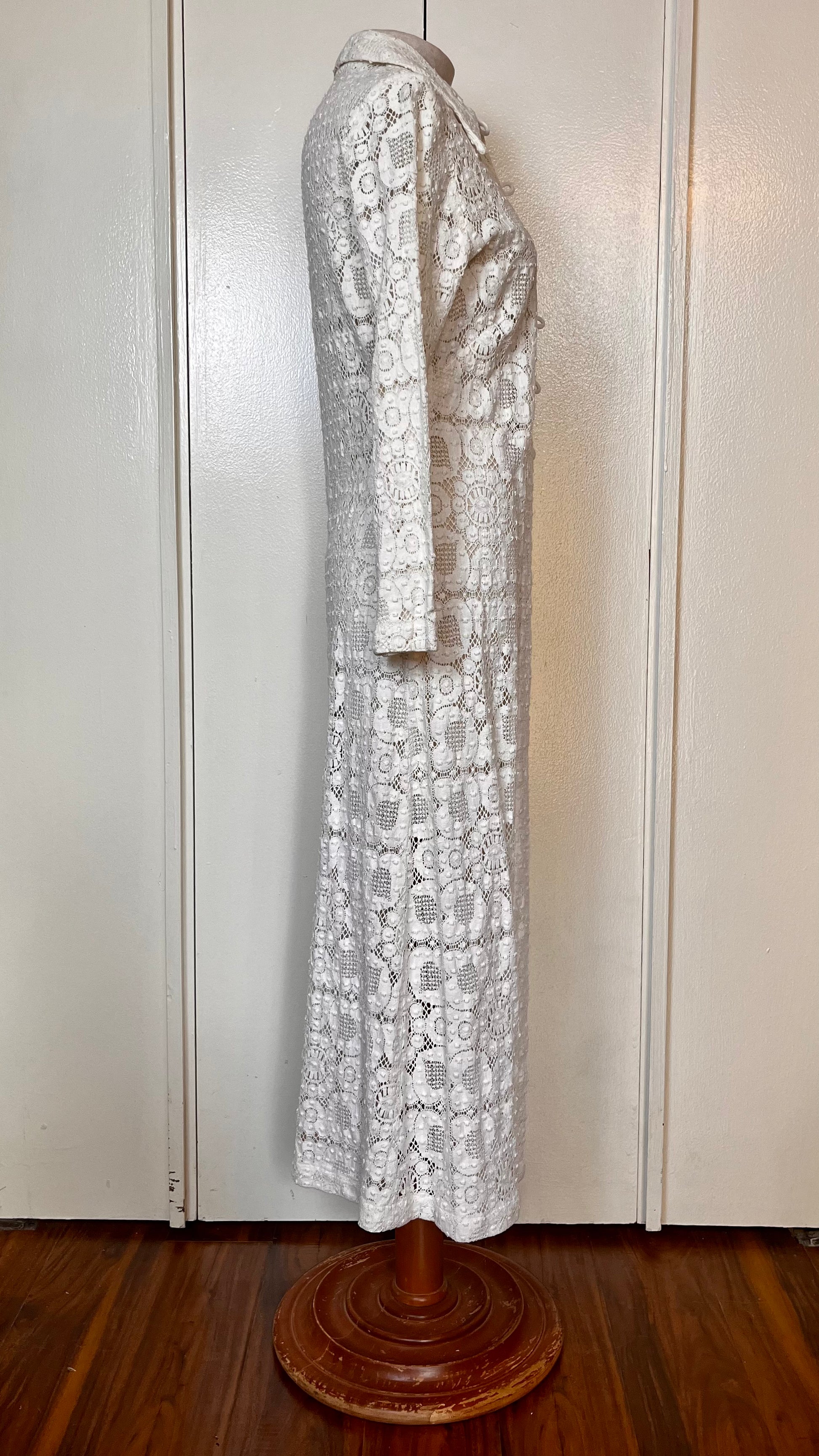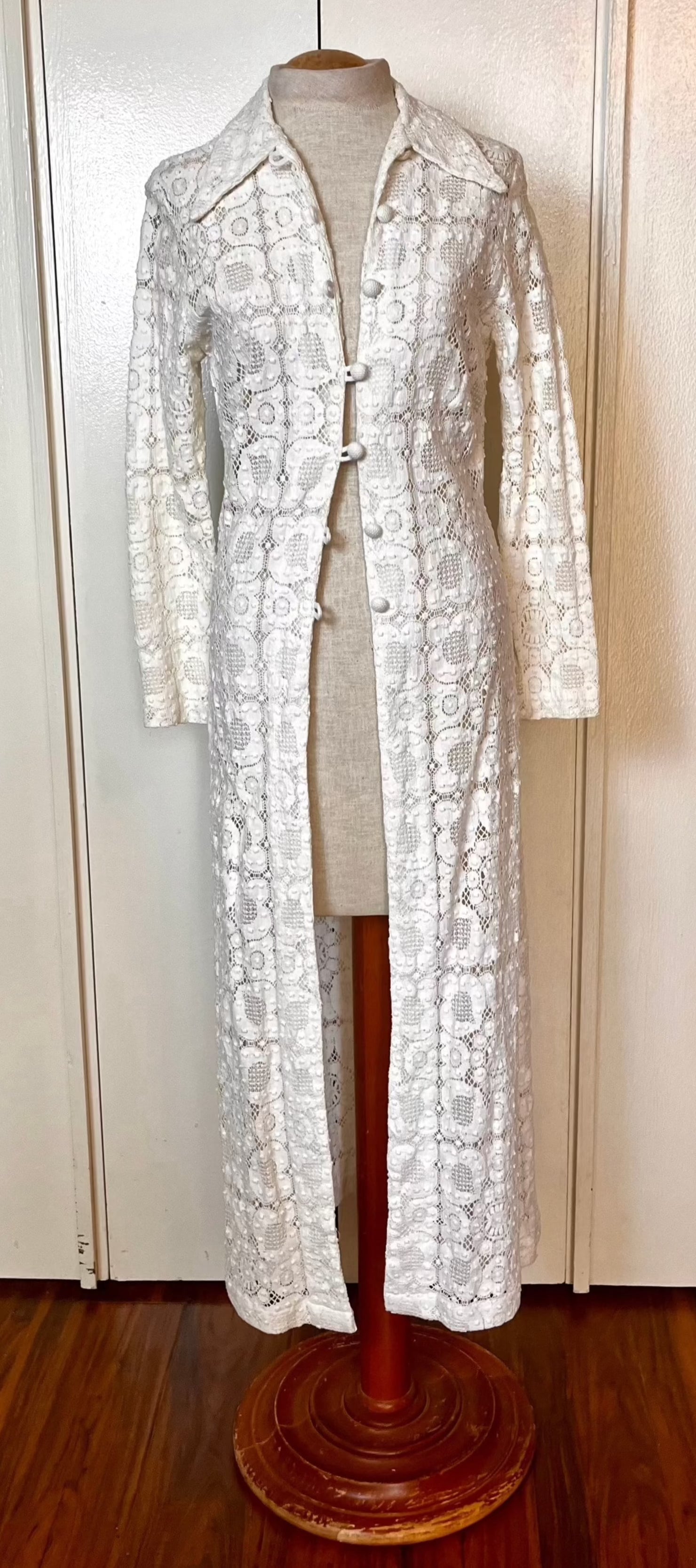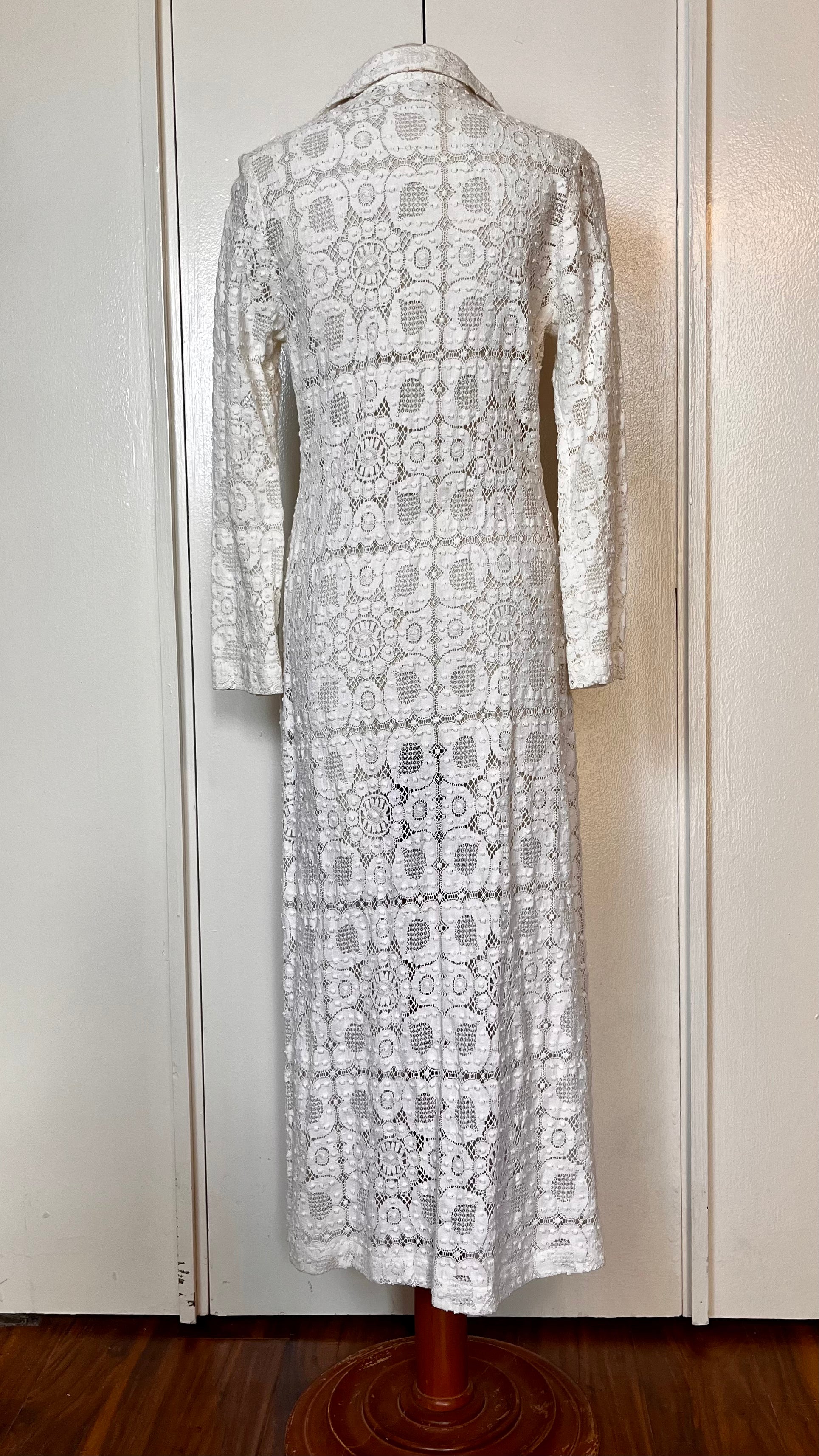 Vintage 1970’s Young Dimensions / Saks Fifth Avenue Crochet Lace Dagger Collar Button-Front Long Sleeve Duster Coat