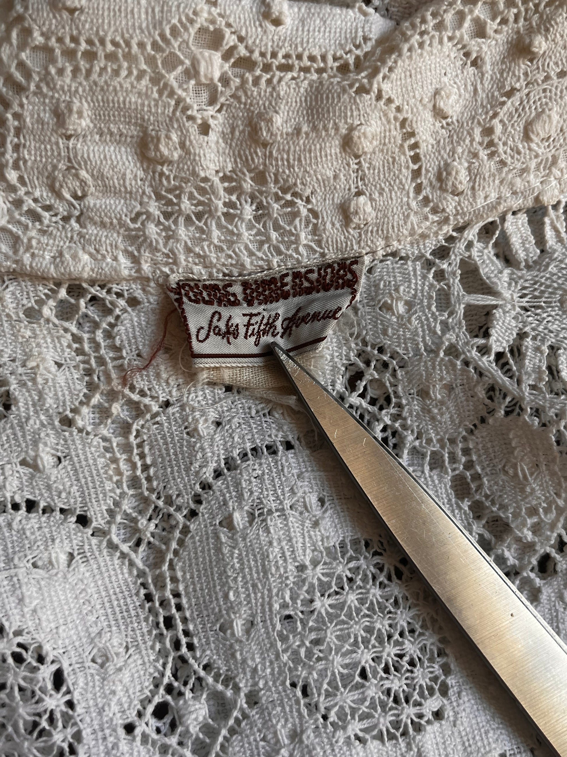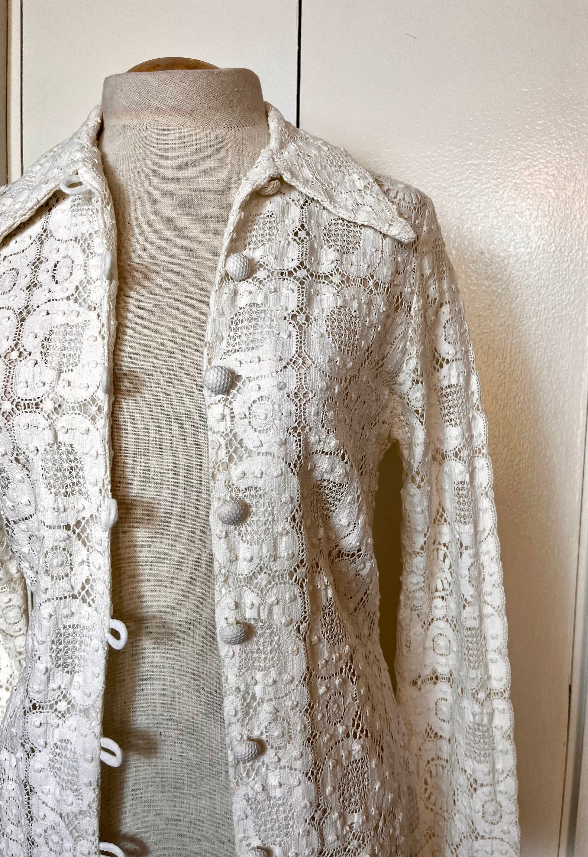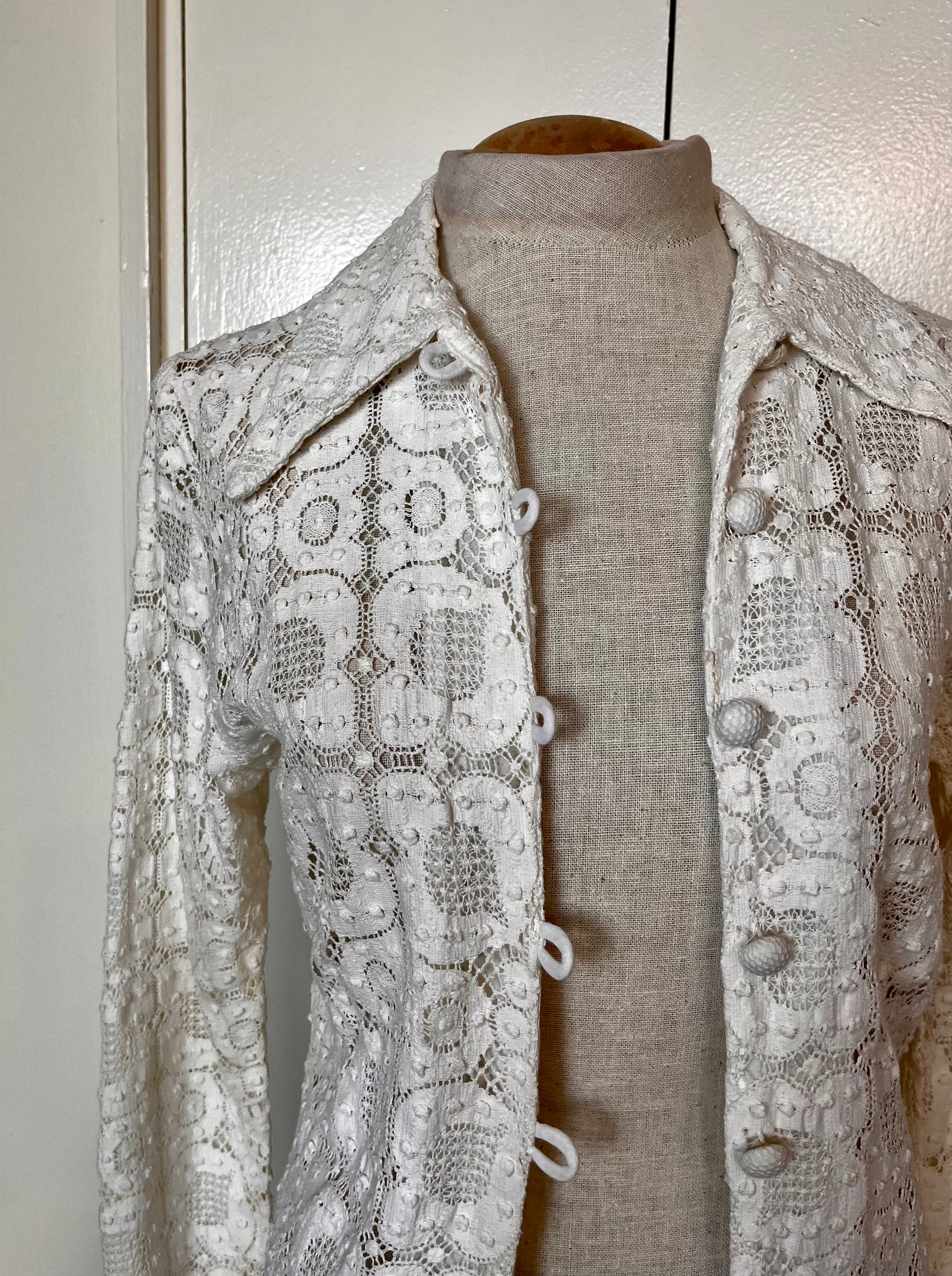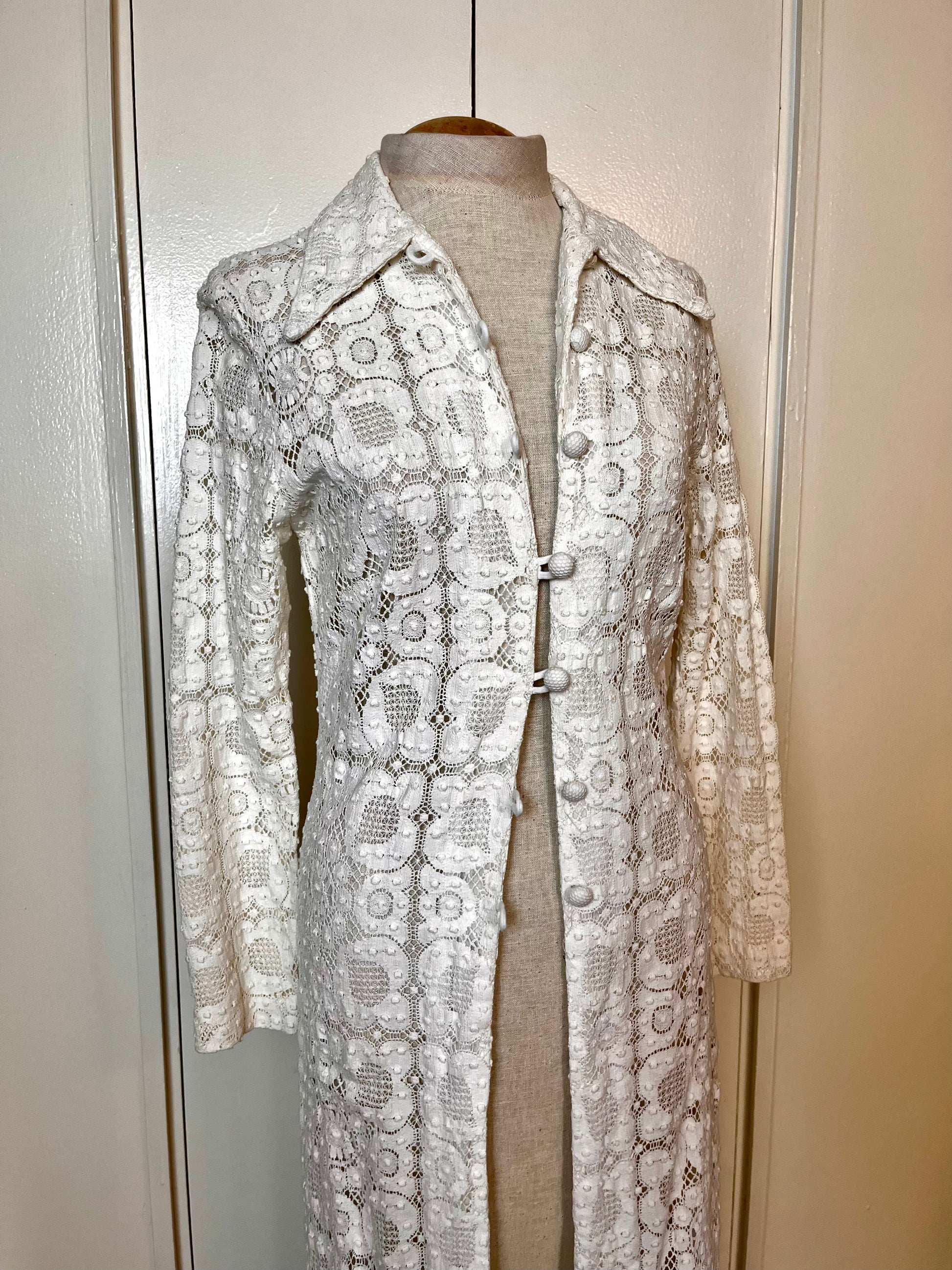 Vintage 1970’s Young Dimensions / Saks Fifth Avenue Crochet Lace Dagger Collar Button-Front Long Sleeve Duster Coat
