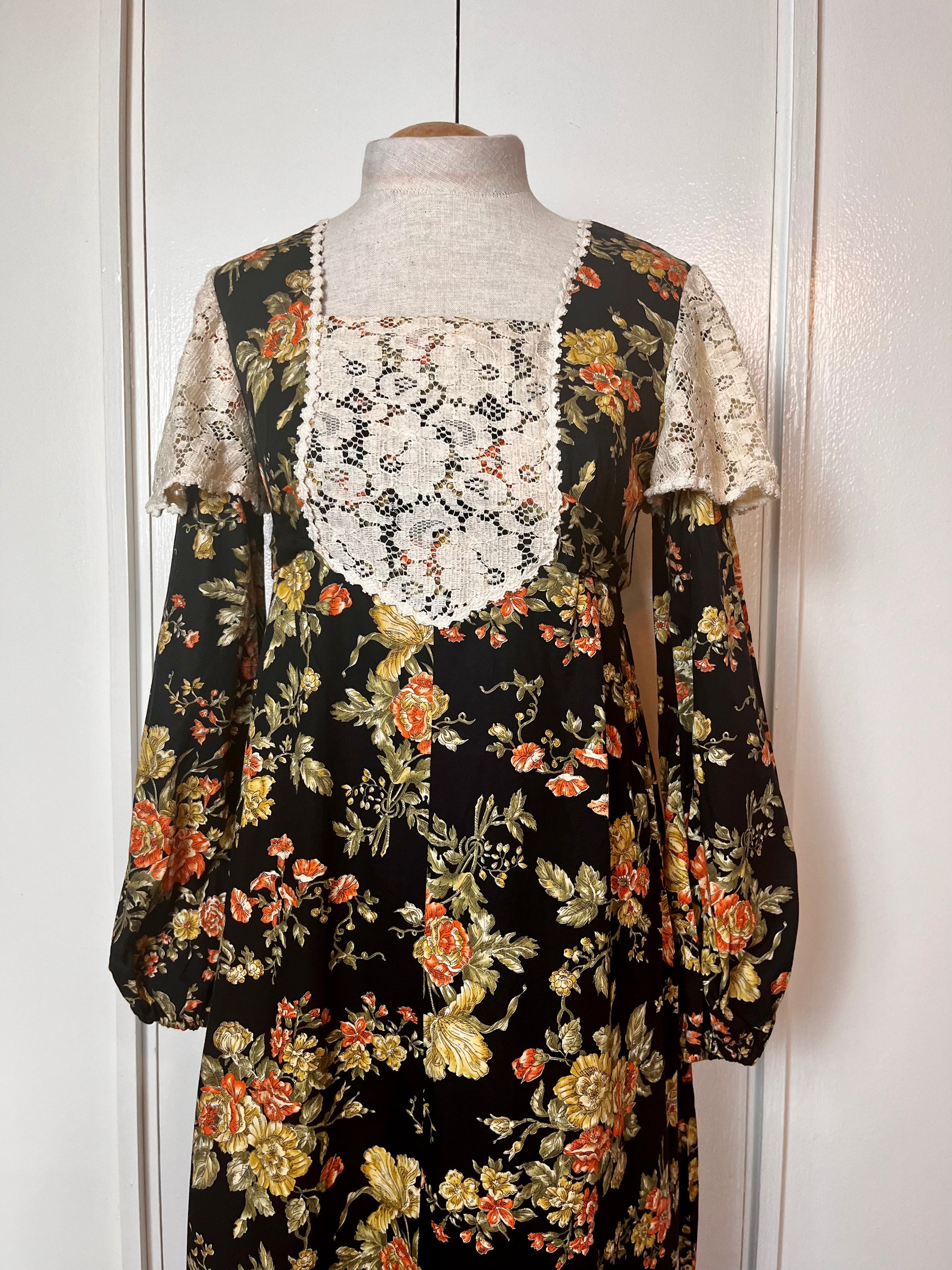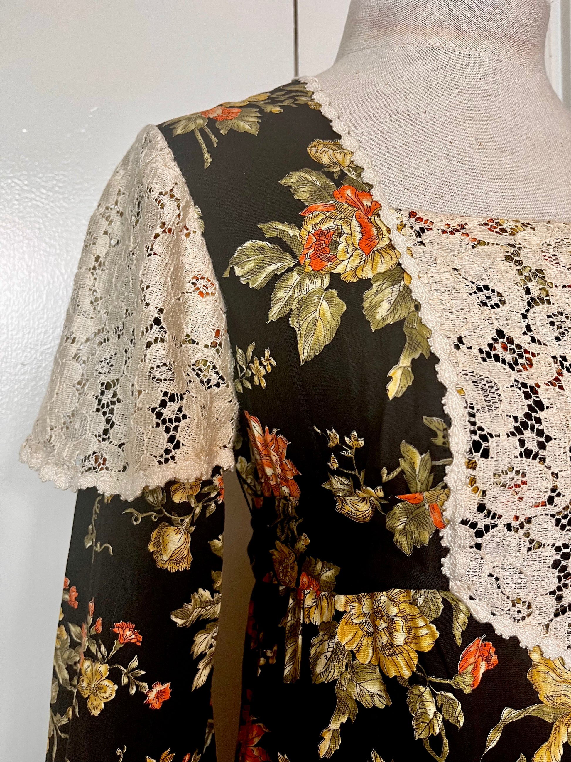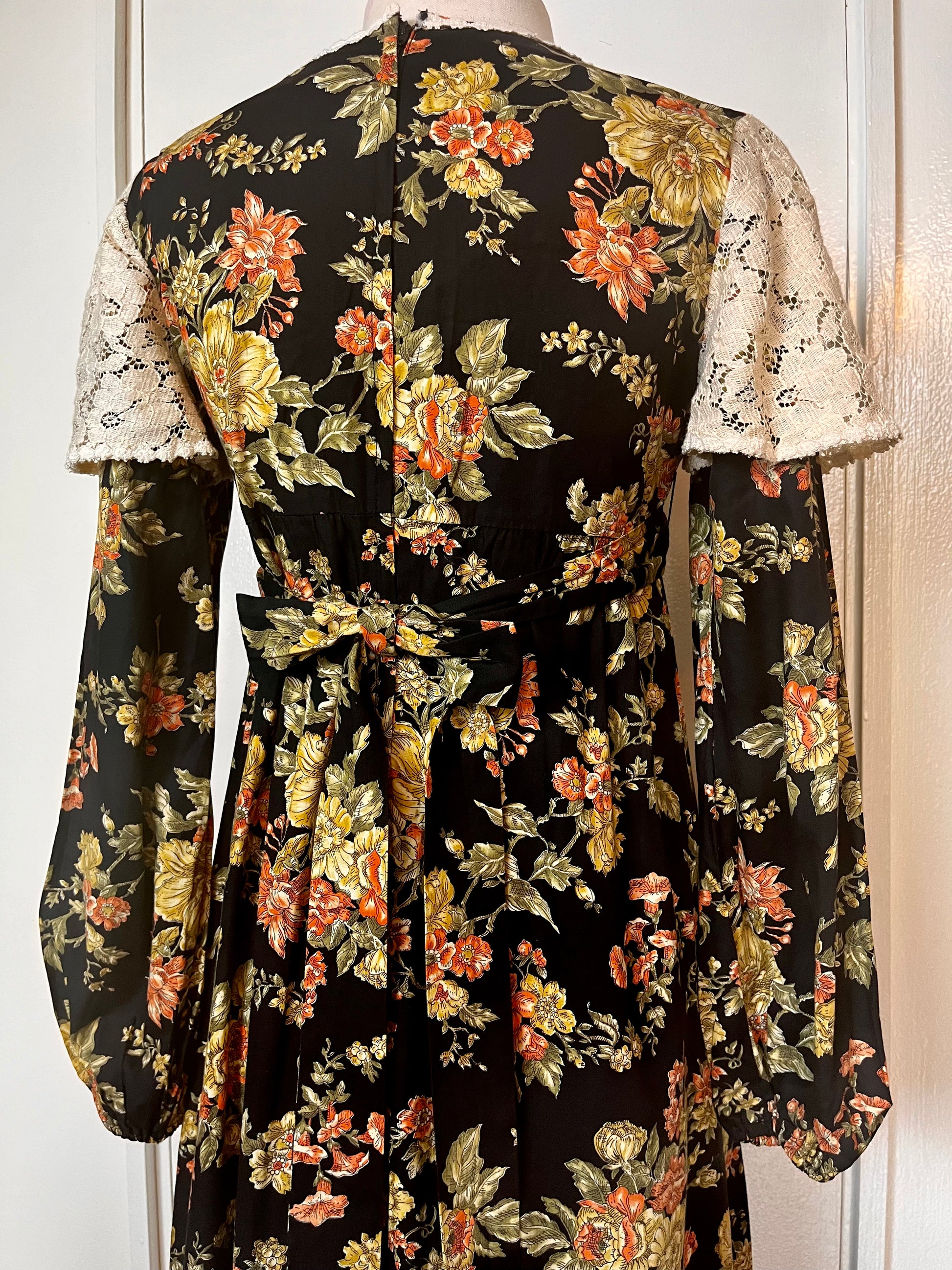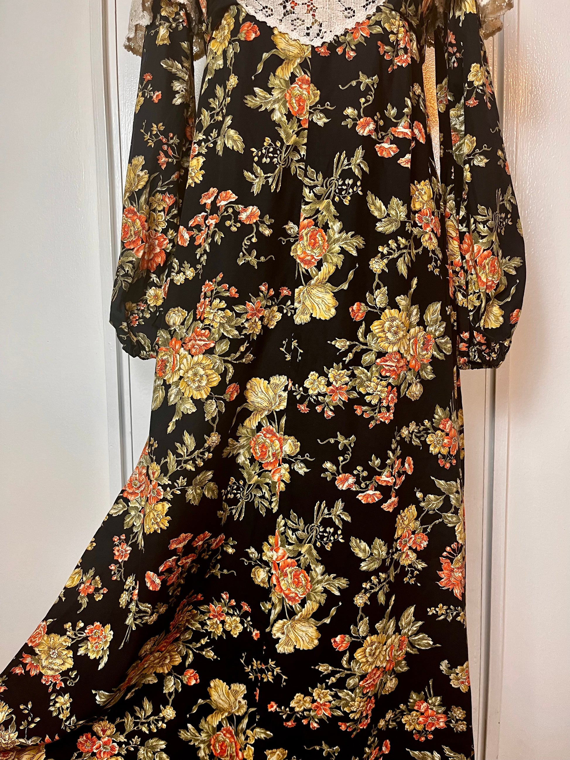 Vintage 1970’s Young Edwardian by Arpeja Black w/ Orange & Yellow Flowers Long Sleeve Maxi Dress with Long Balloon Sleeves & Crochet Lace Bib Accent