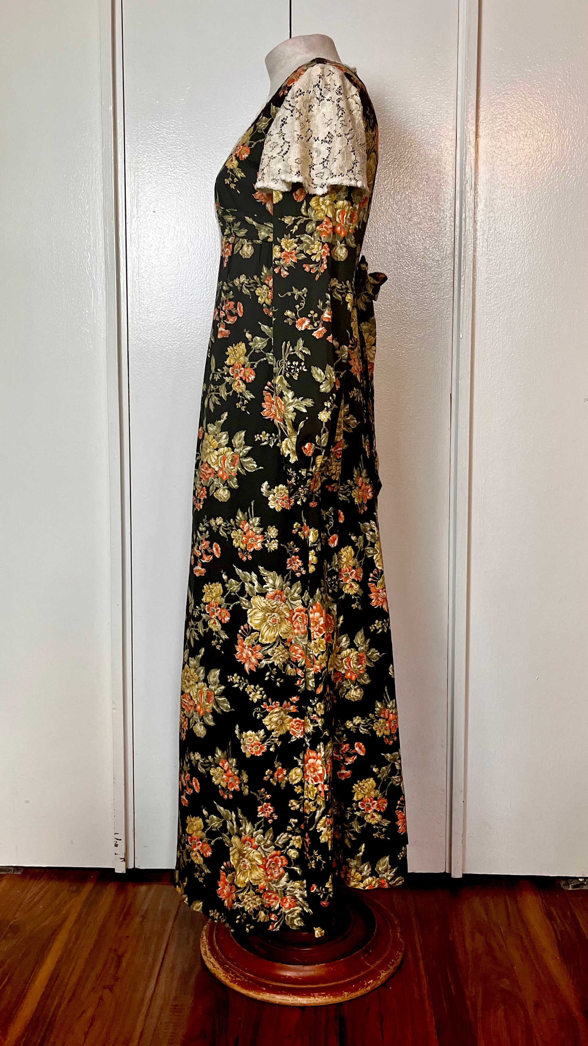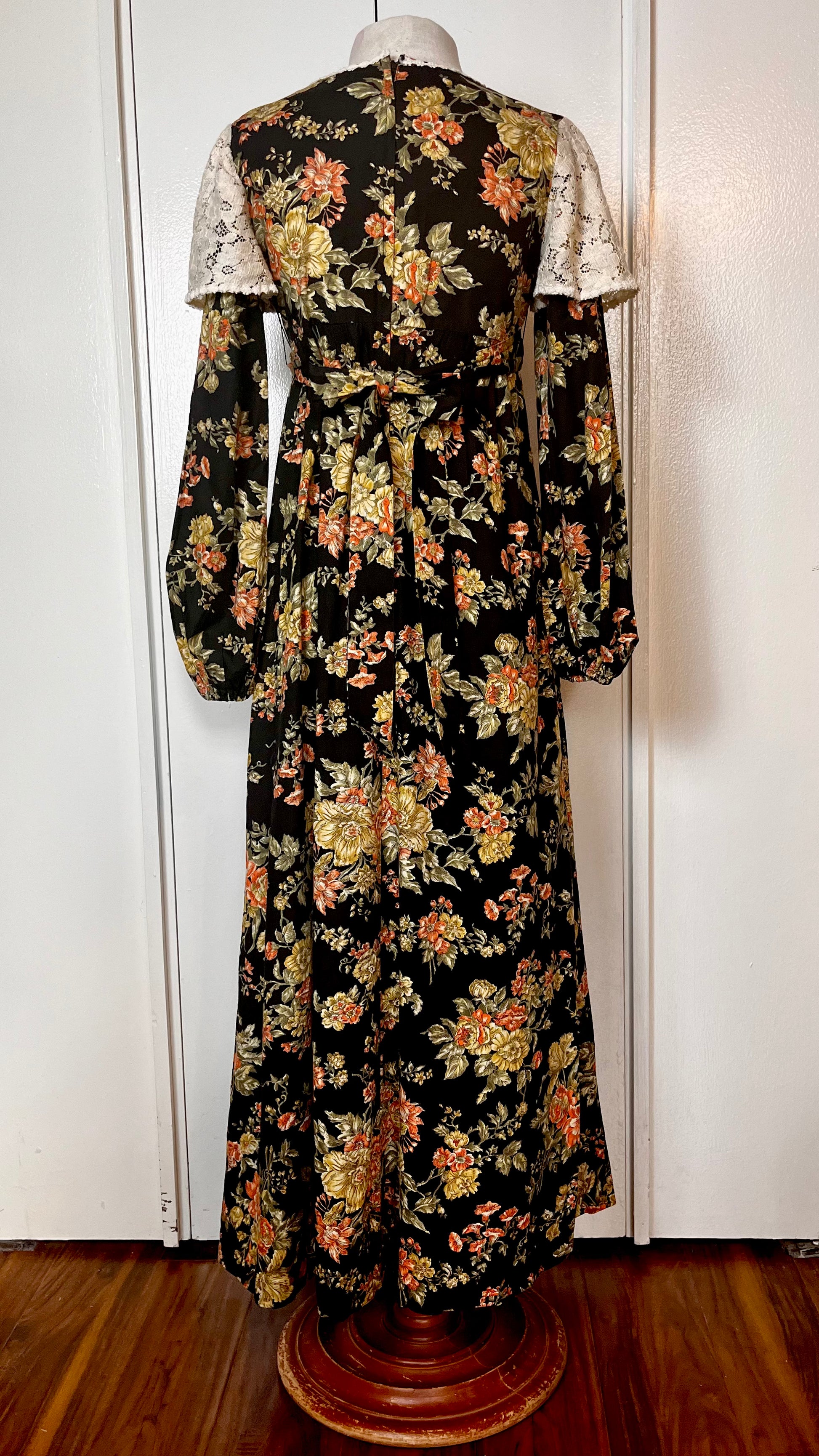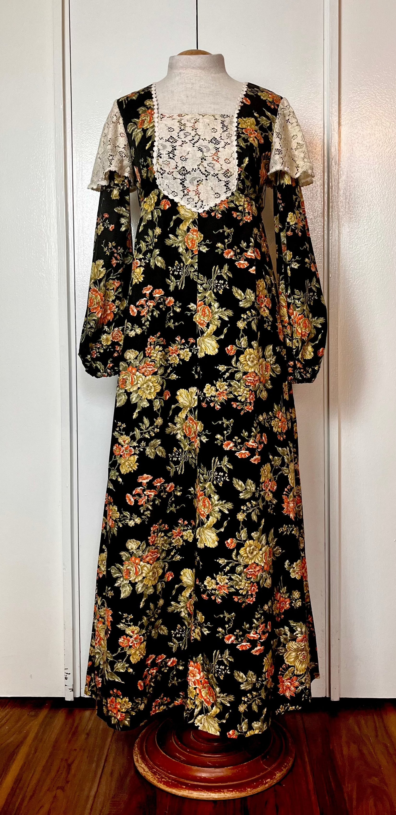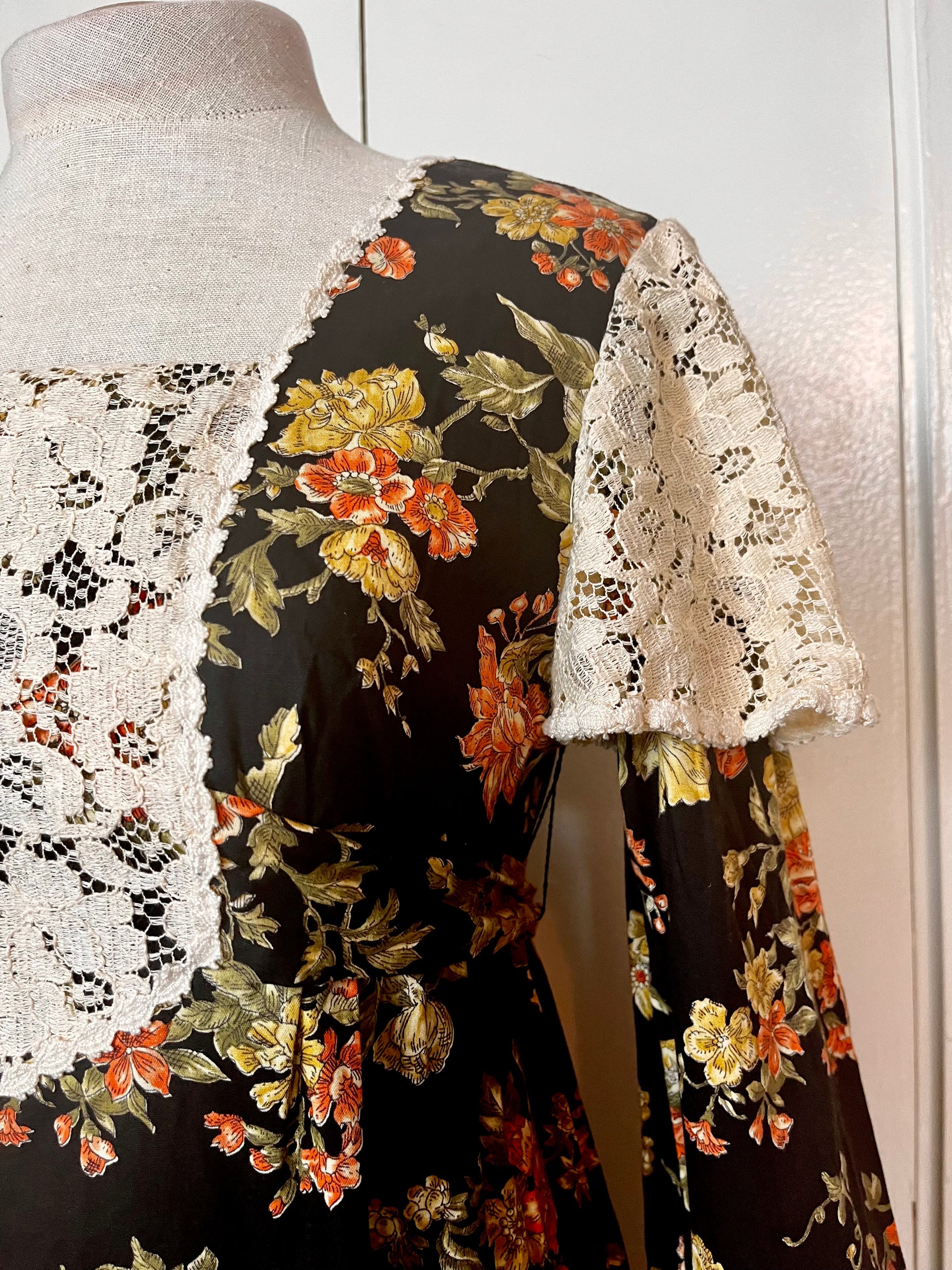 Vintage 1970’s Young Edwardian by Arpeja Black w/ Orange & Yellow Flowers Long Sleeve Maxi Dress with Long Balloon Sleeves & Crochet Lace Bib Accent