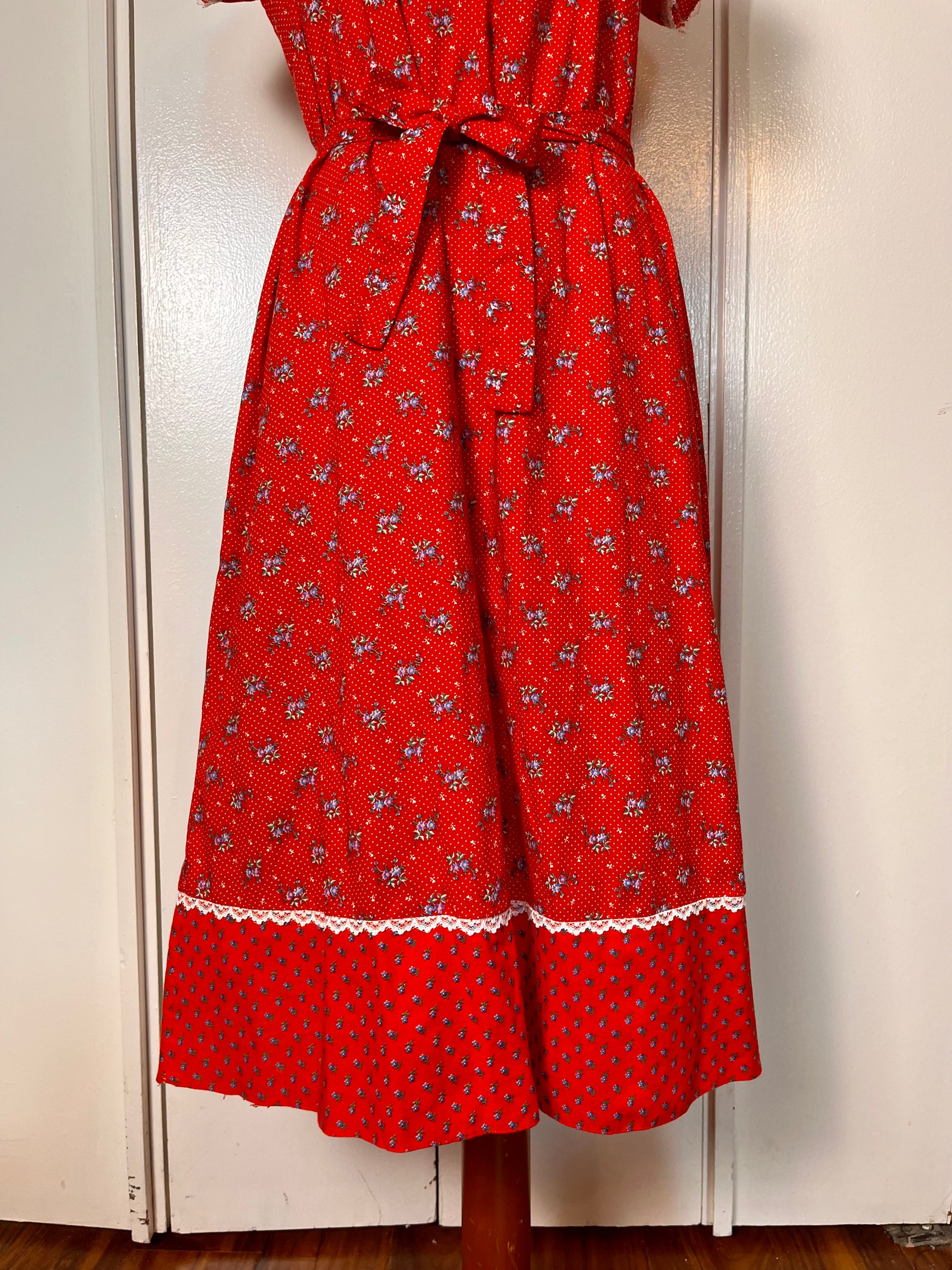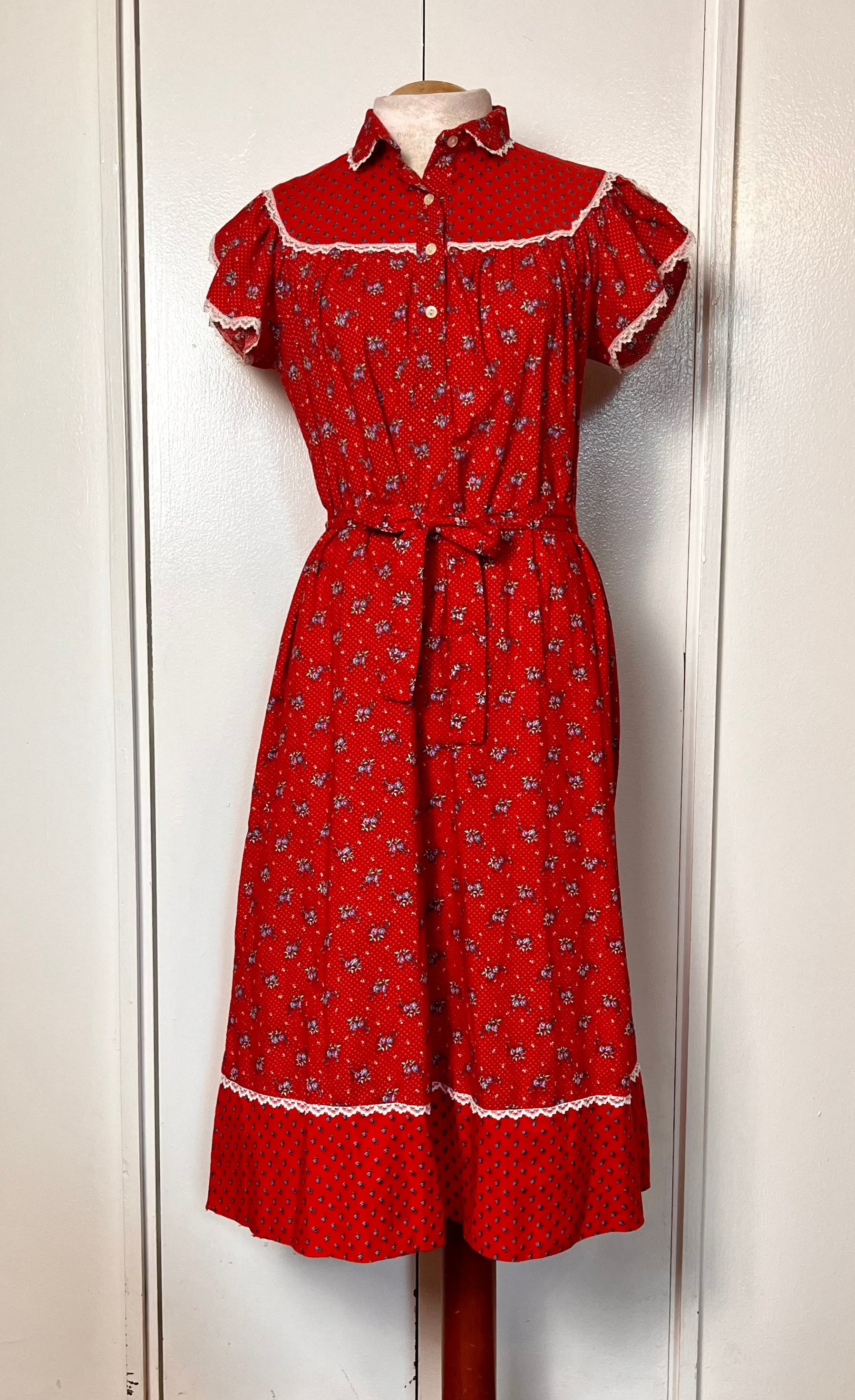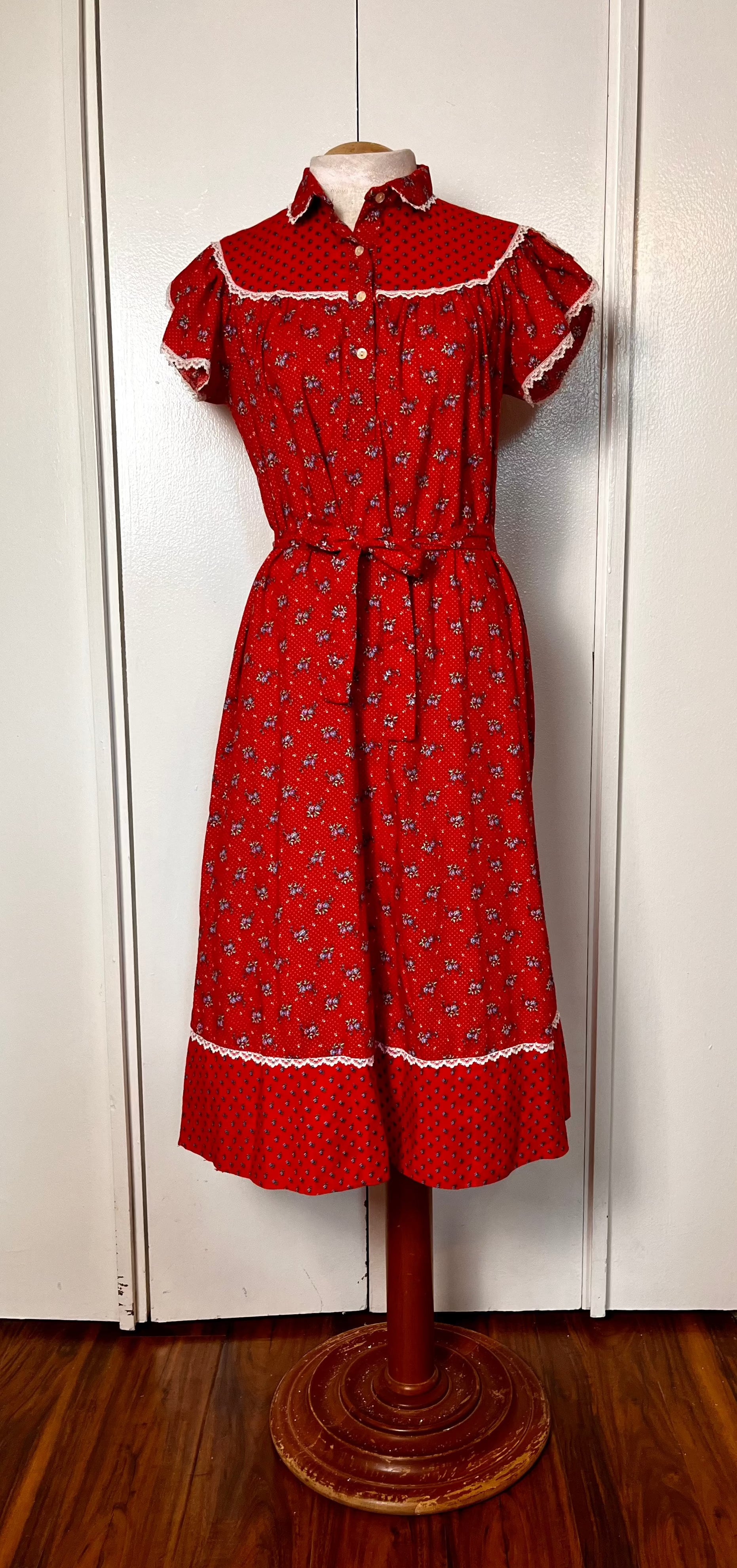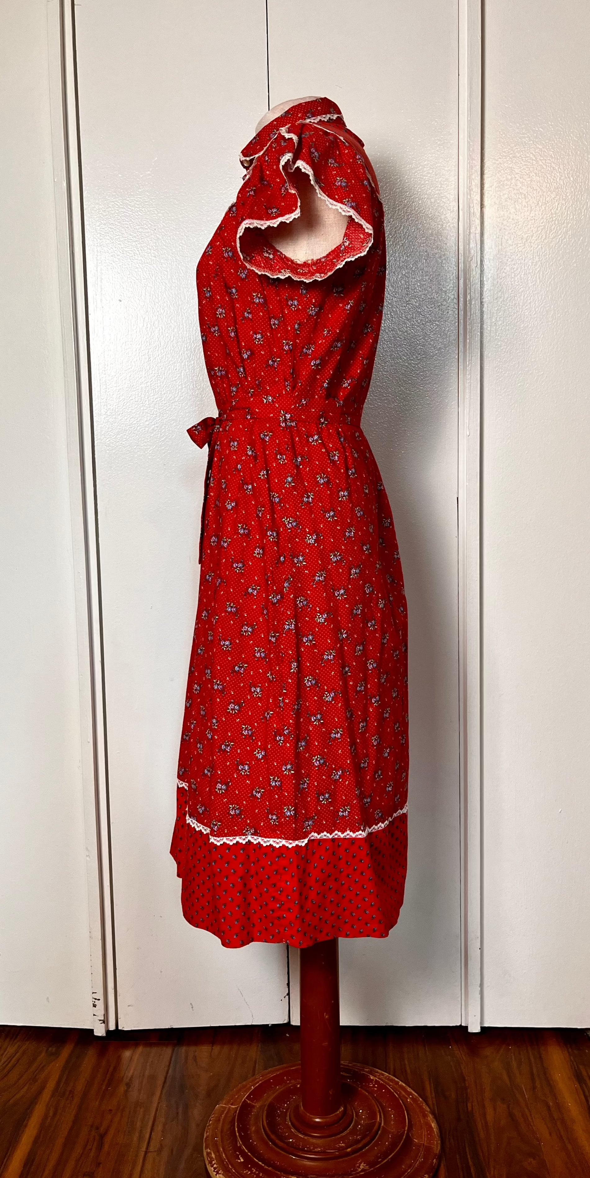 Vintage 1970's "Eber of San Francisco" Red Calico Flutter Sleeve Midi Dress with Belt