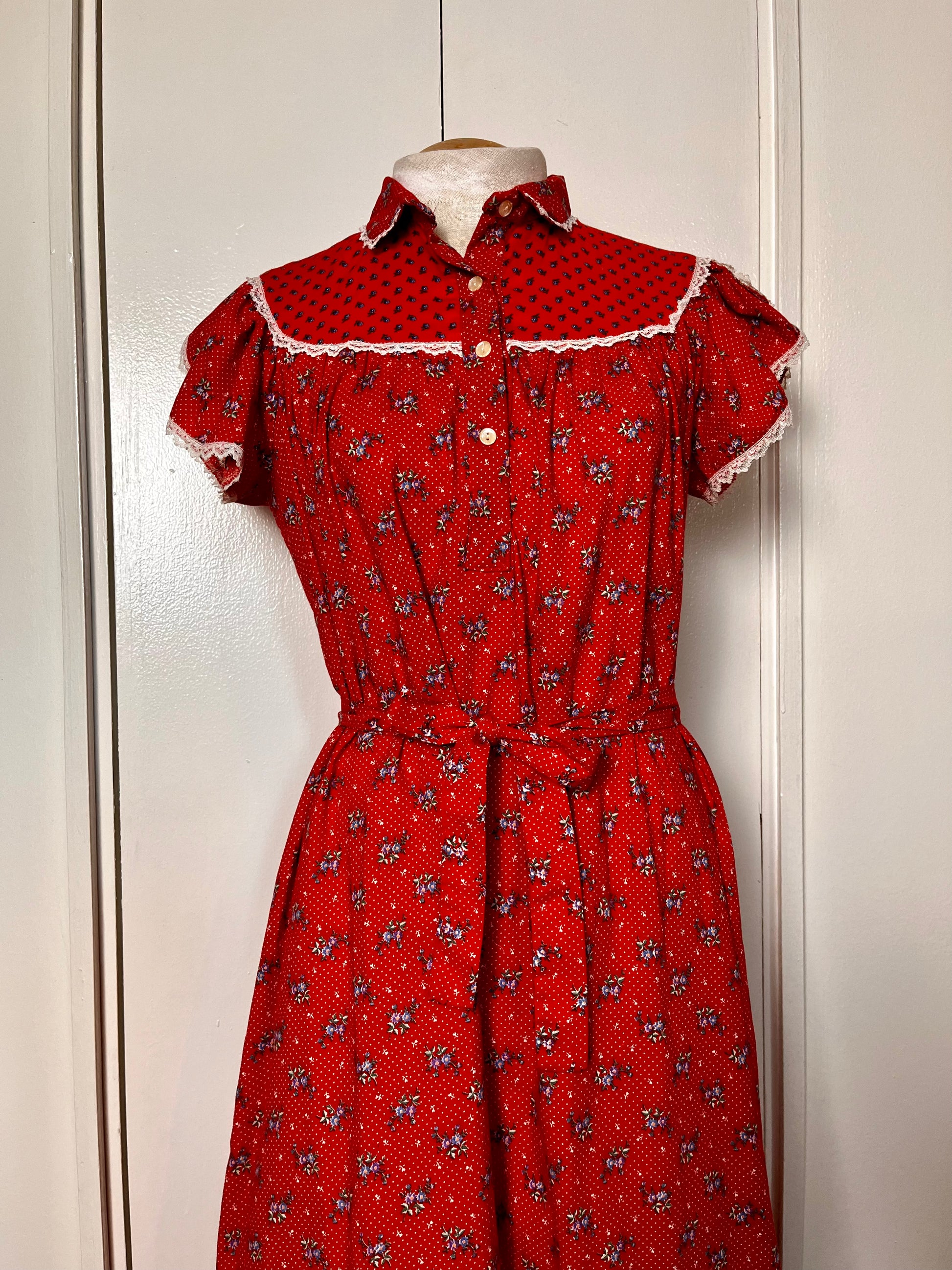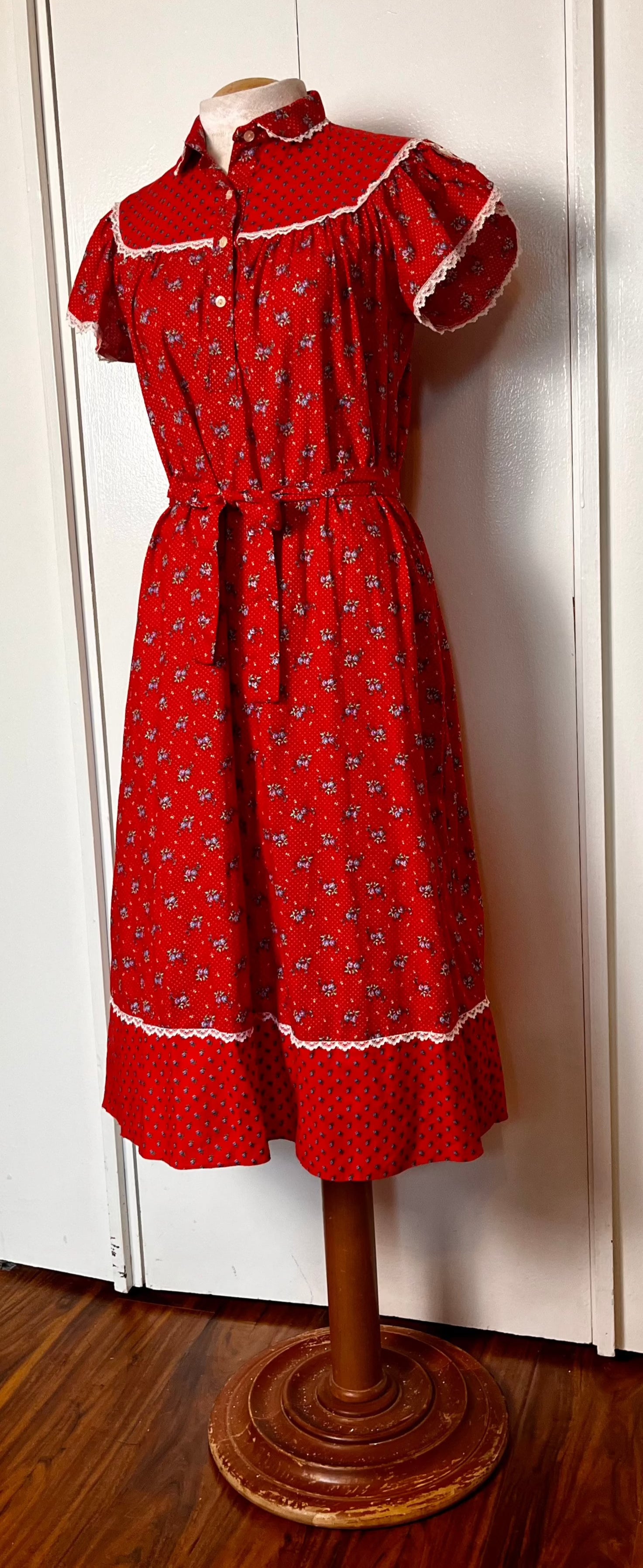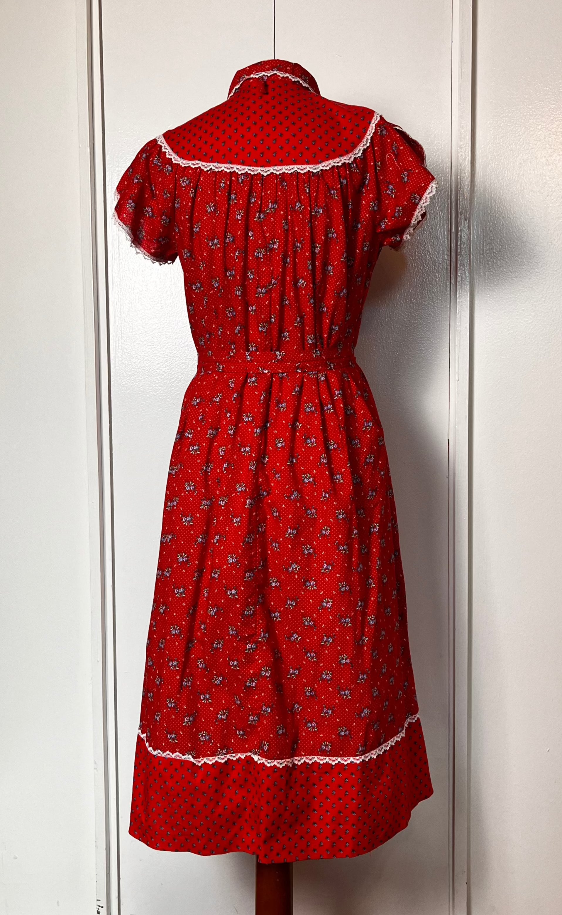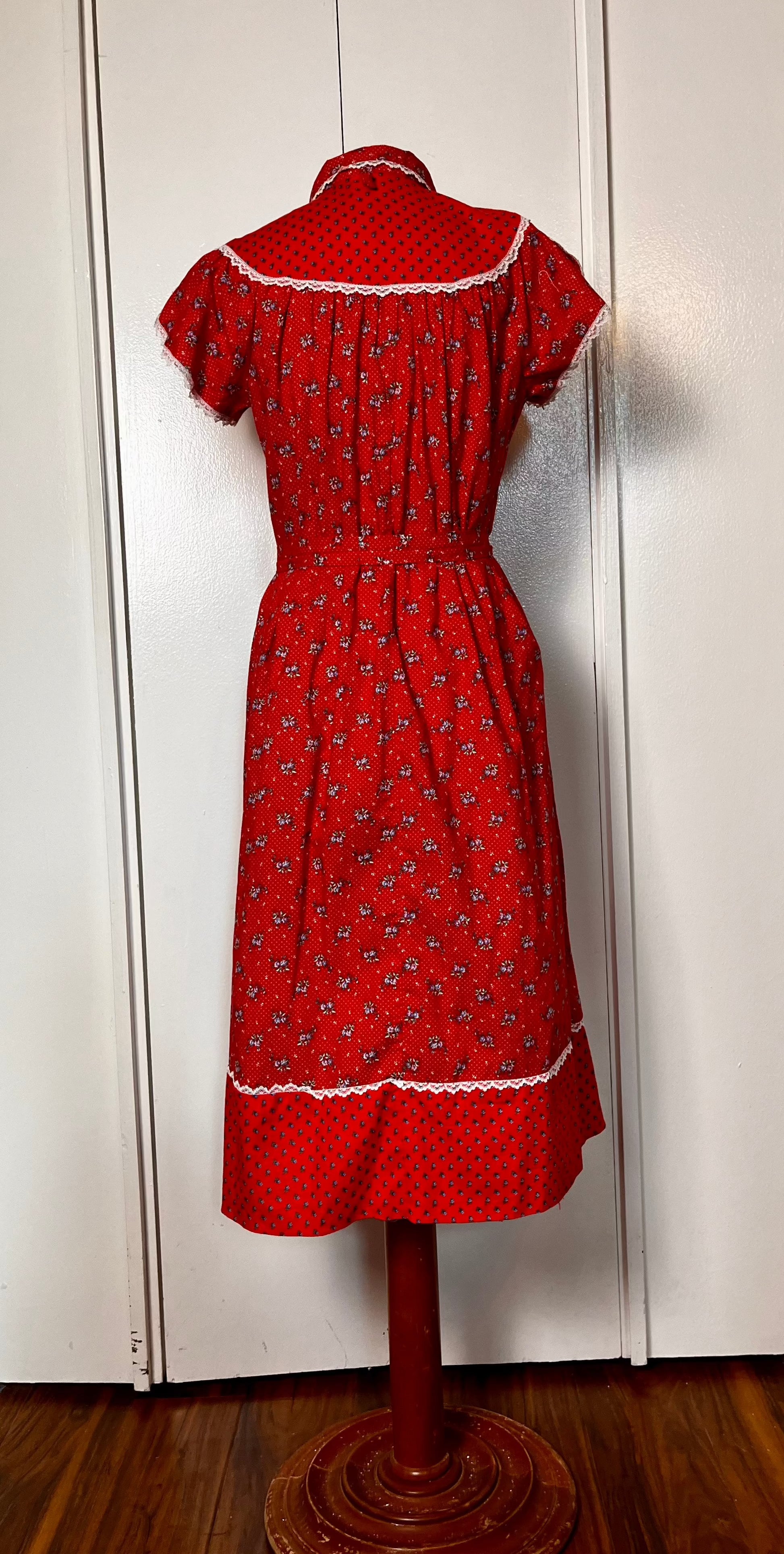 Vintage 1970's "Eber of San Francisco" Red Calico Flutter Sleeve Midi Dress with Belt