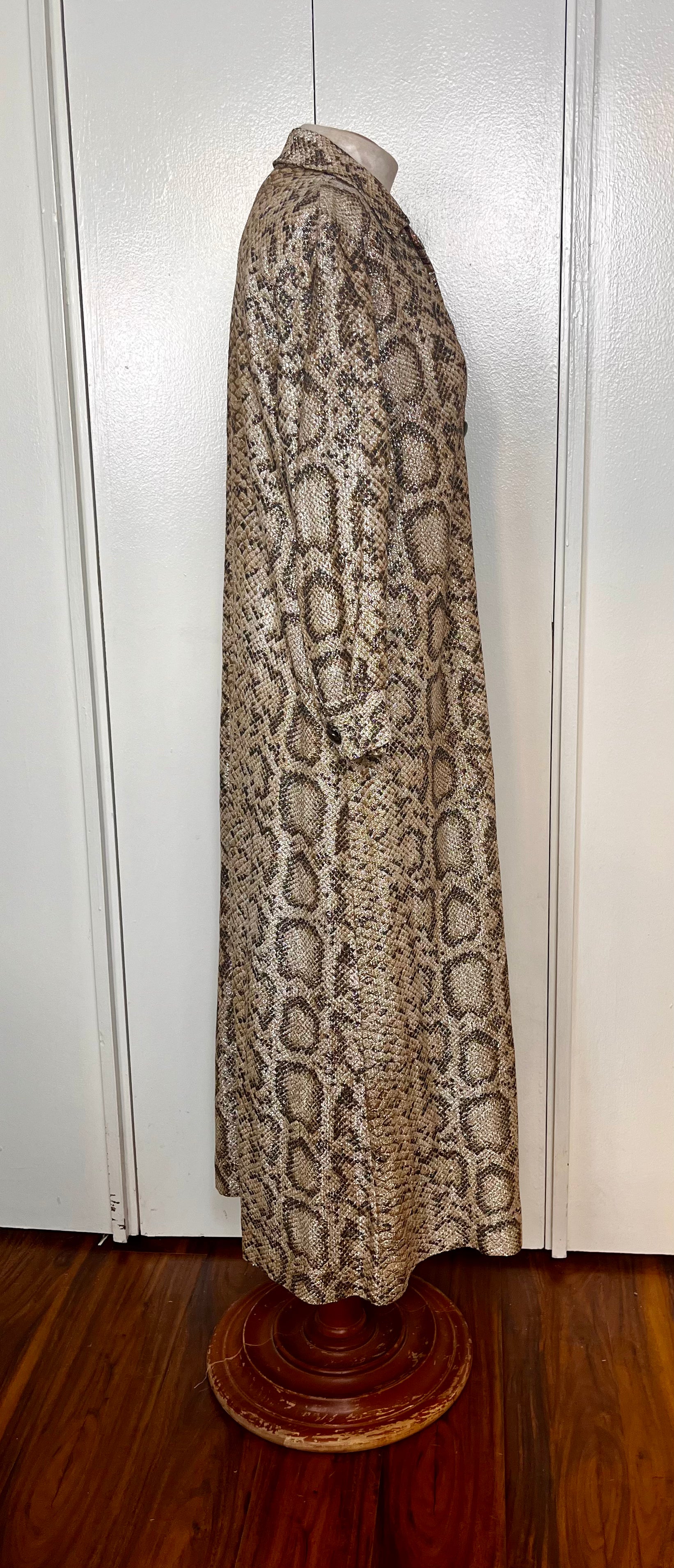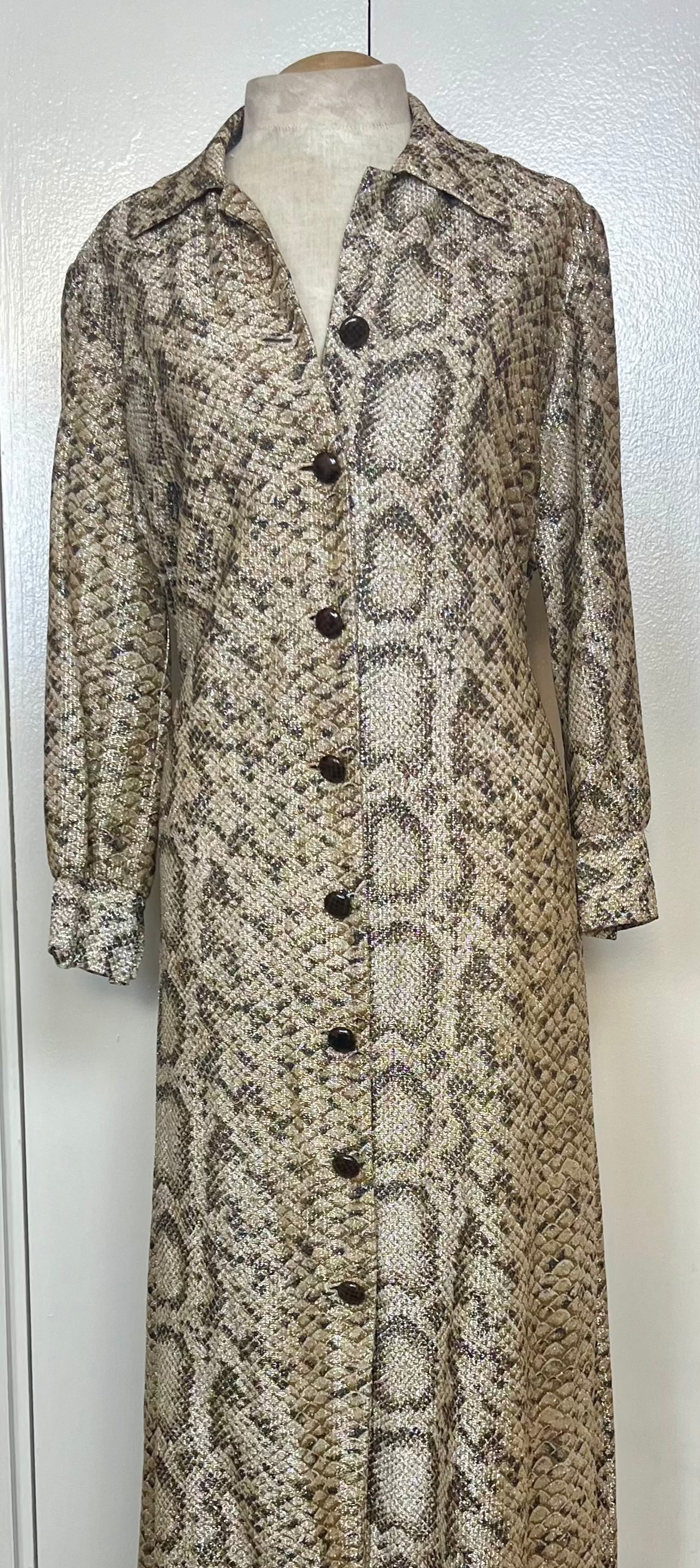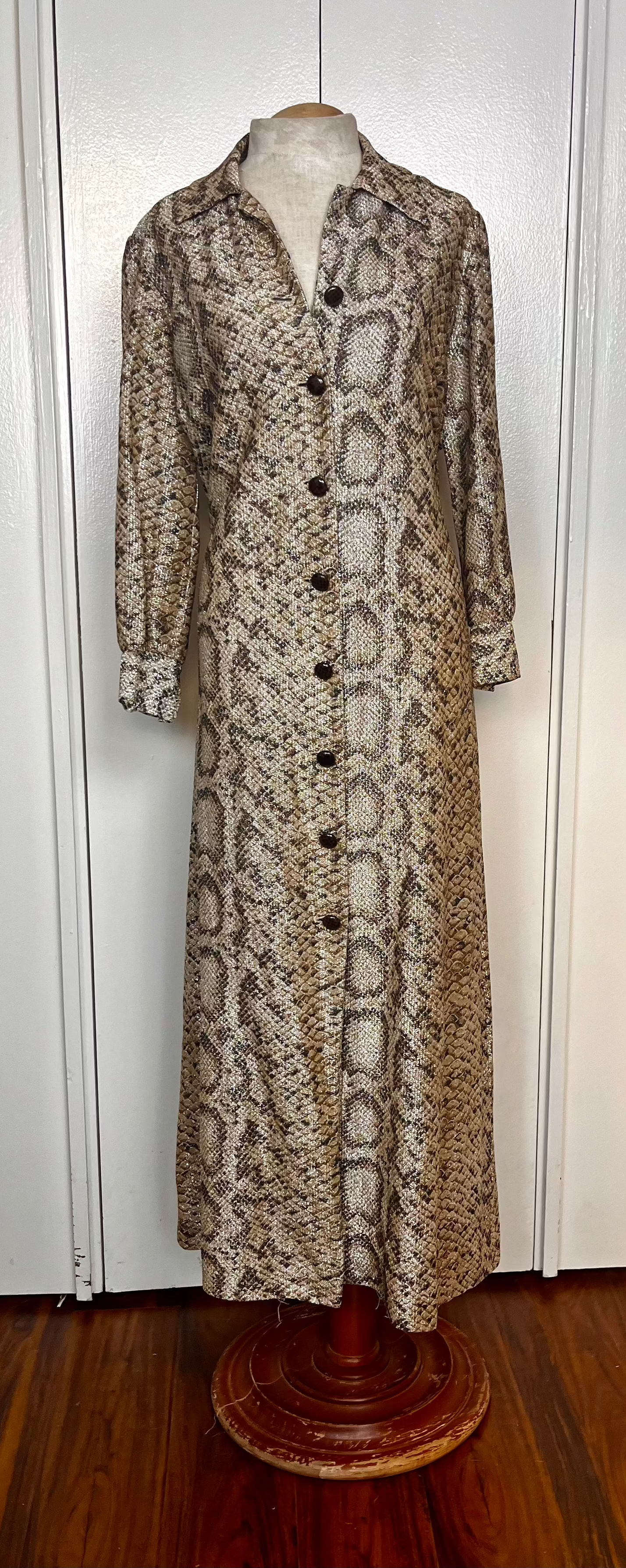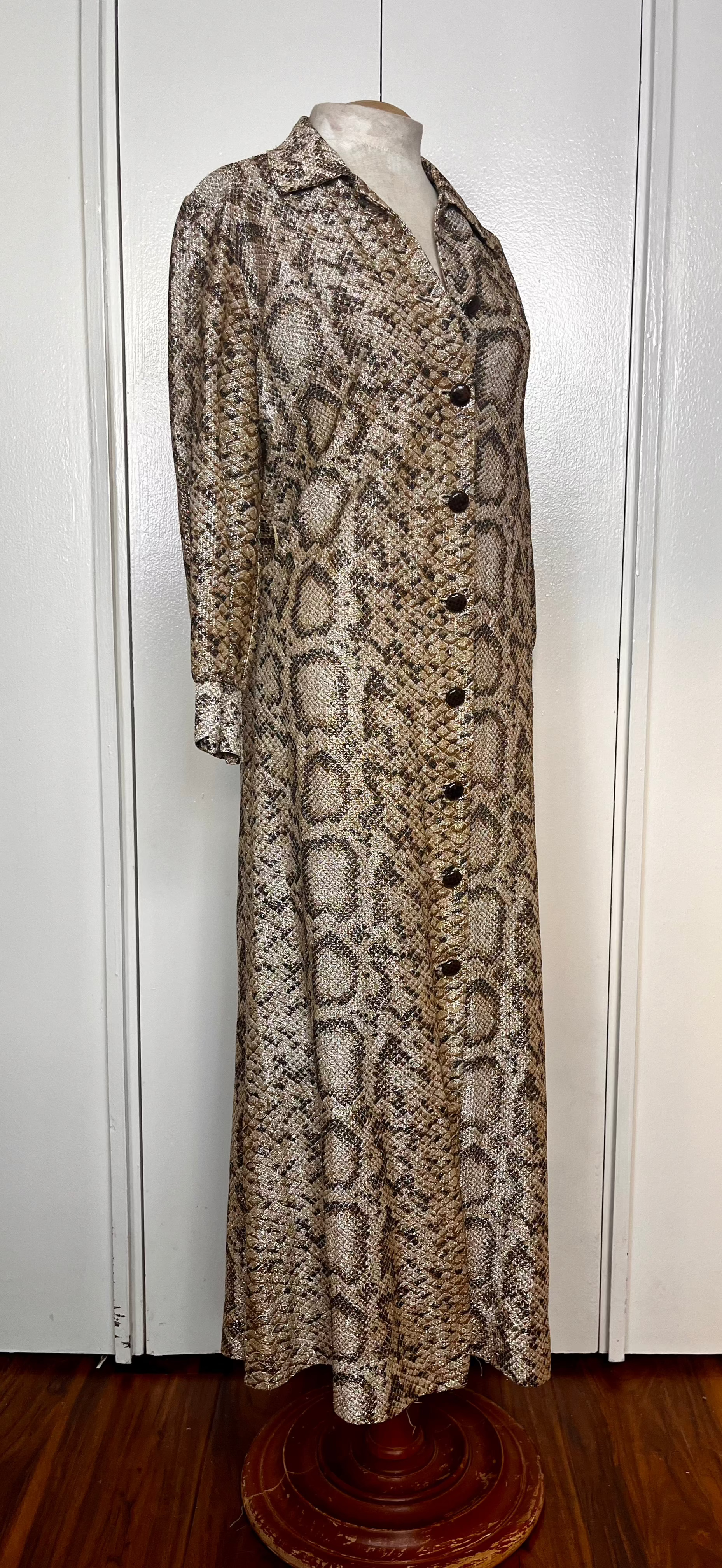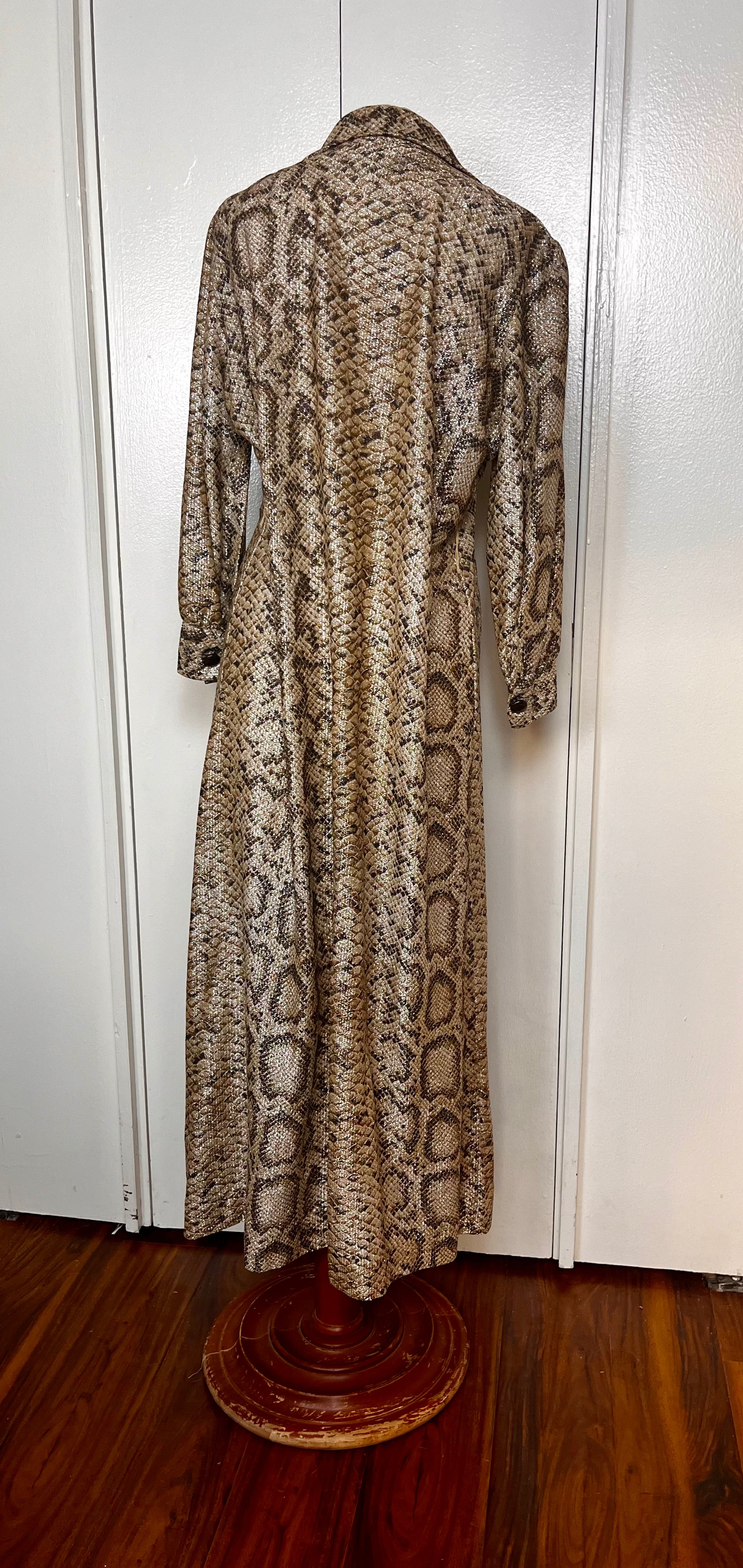Vintage 1970's Gold Lurex Snake-Motif Button-Front Long Sleeve Maxi Dress