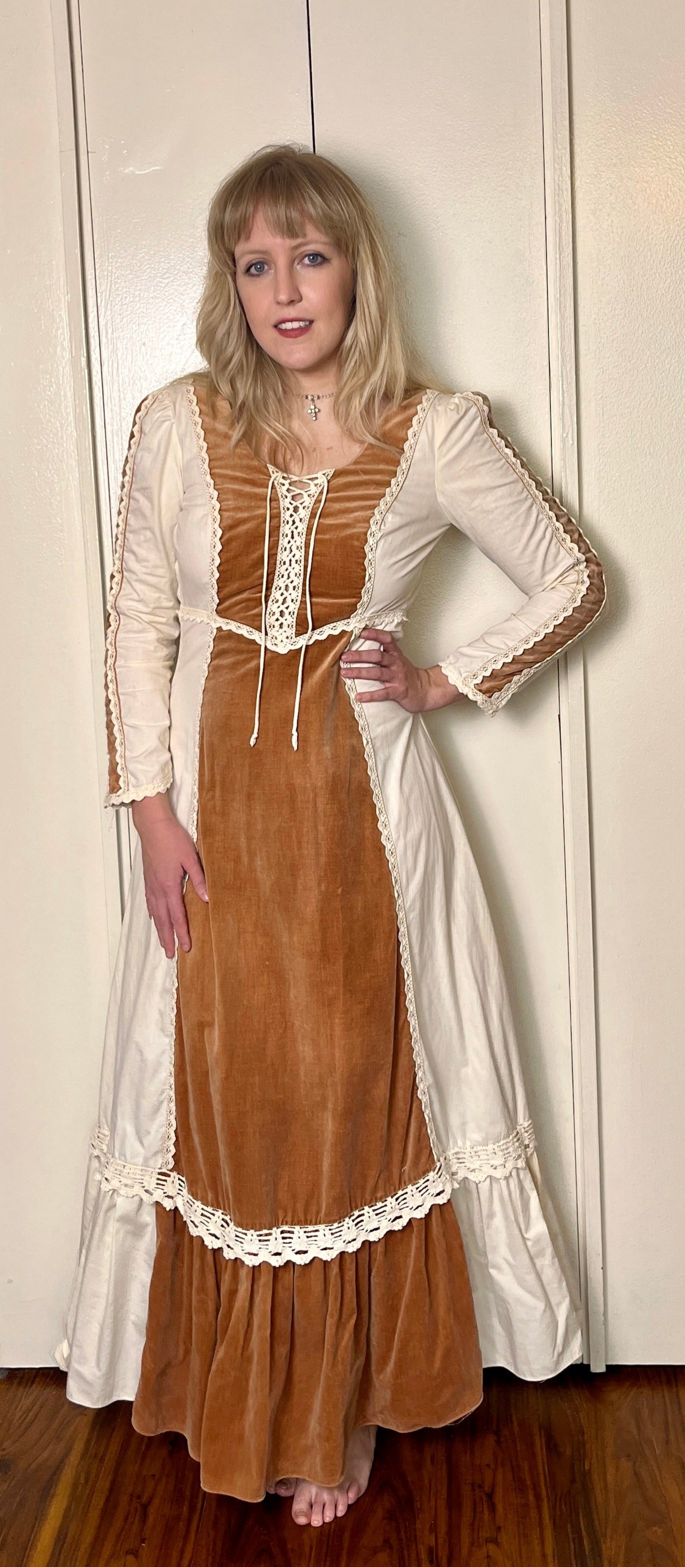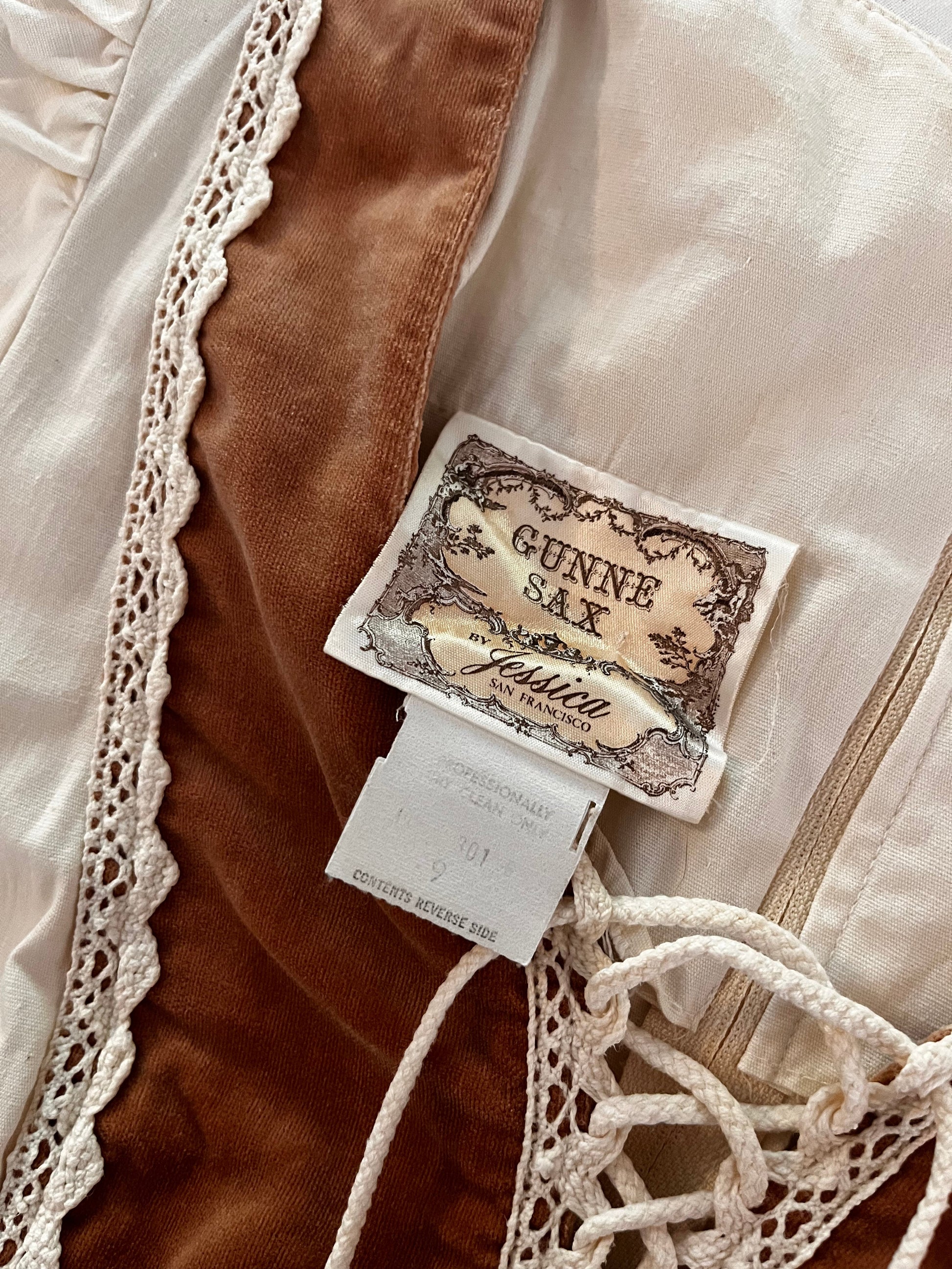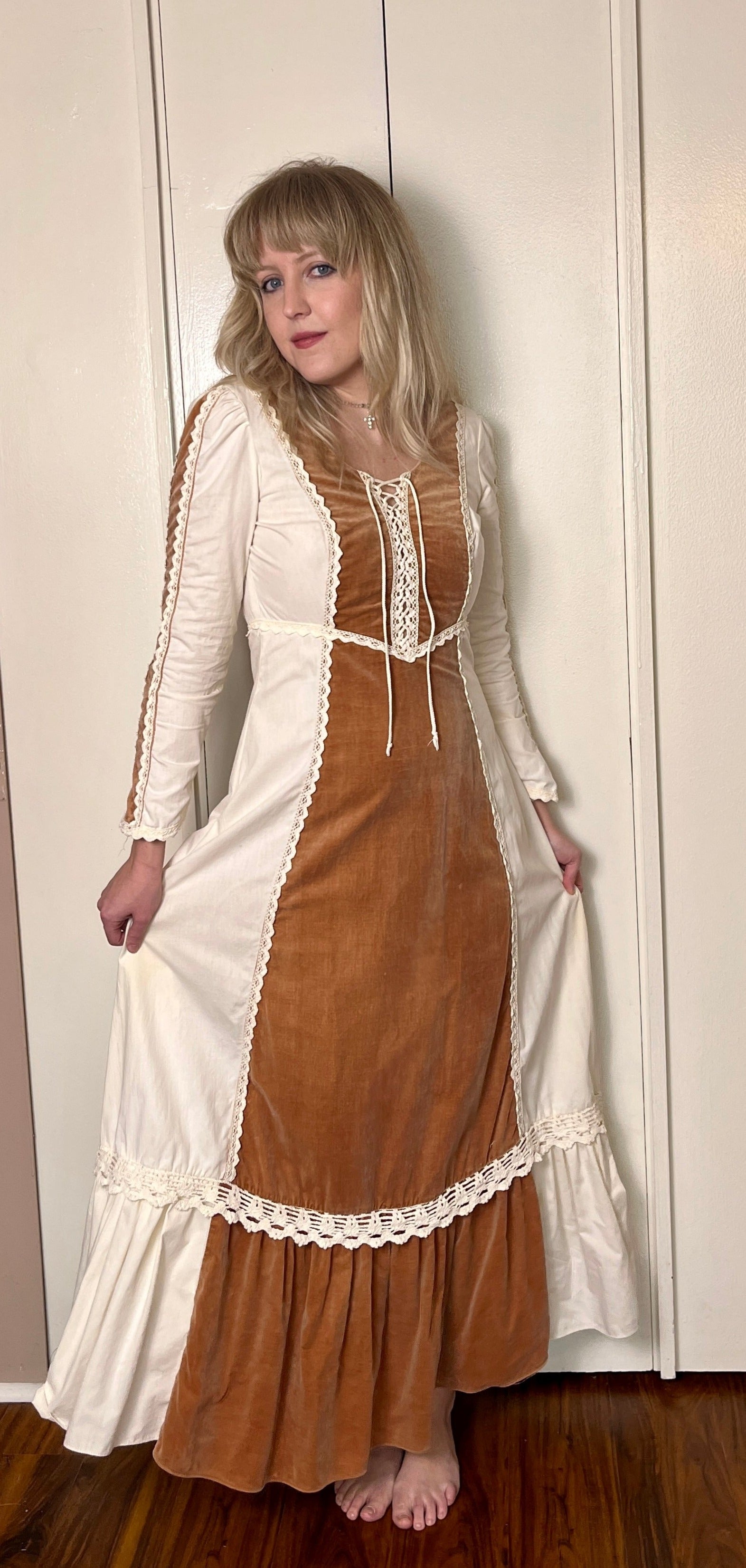 Vintage 1970's "Gunne Sax by Jessica McClintock" Brown Velvet & Cotton Muslin Corset-Front Long Sleeve Maxi Dress