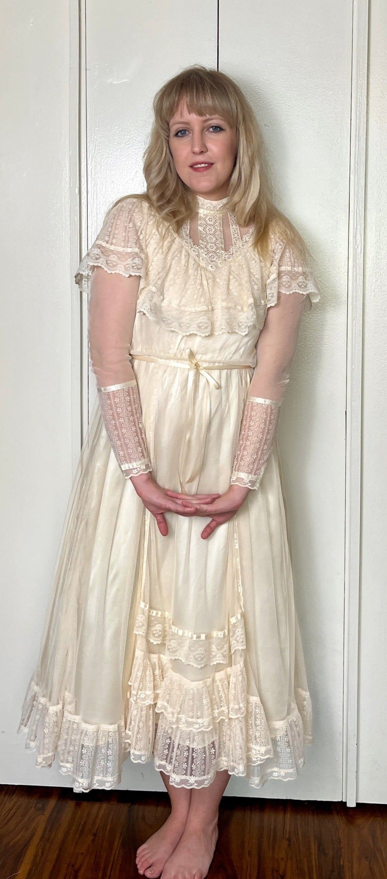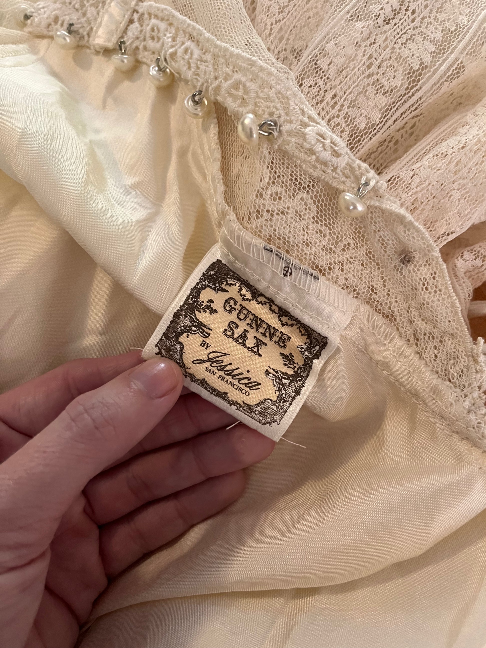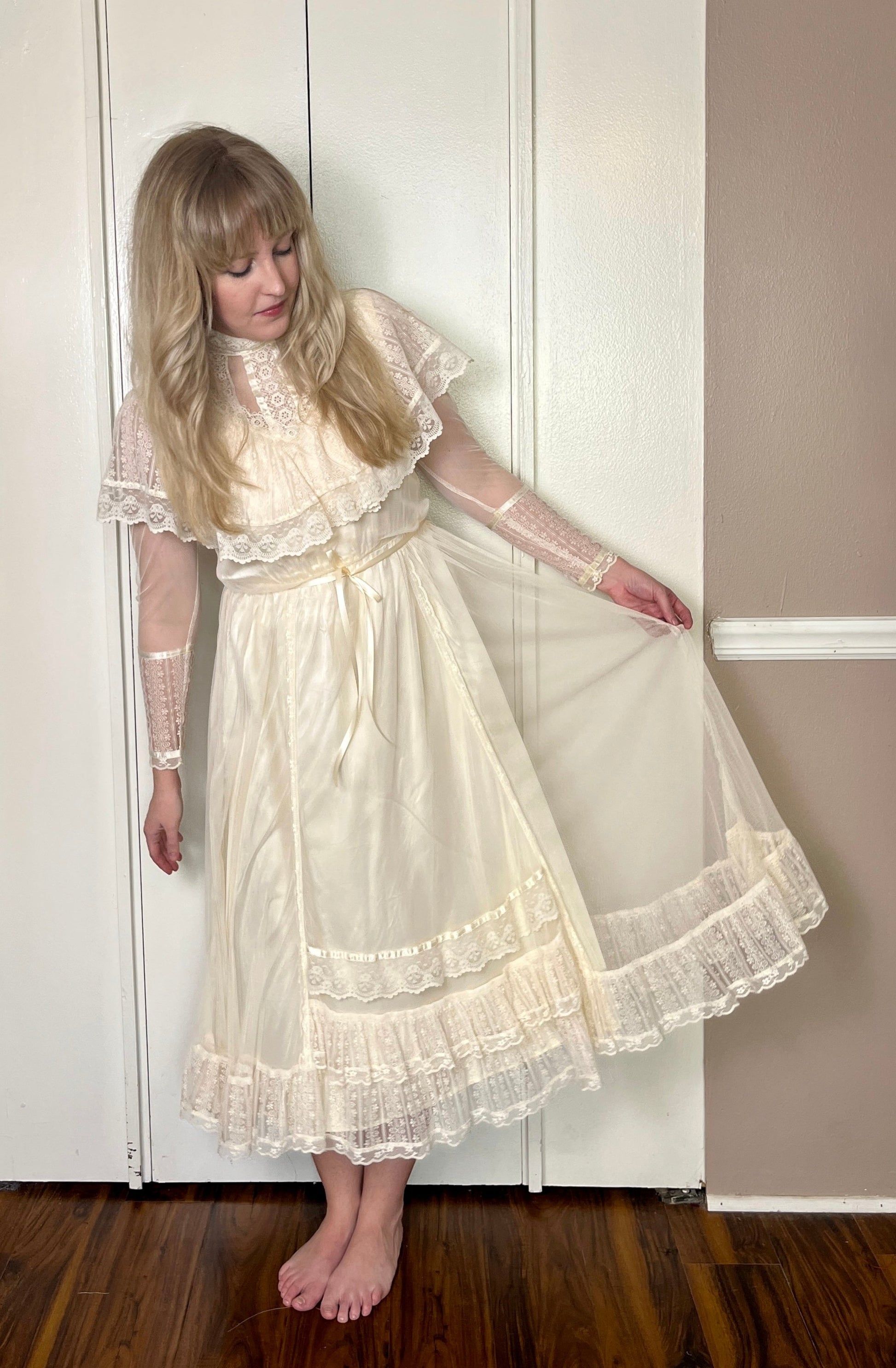 Vintage 1970's "Gunne Sax by Jessica McClintock" Ivory Satin & Mesh Midi Dress