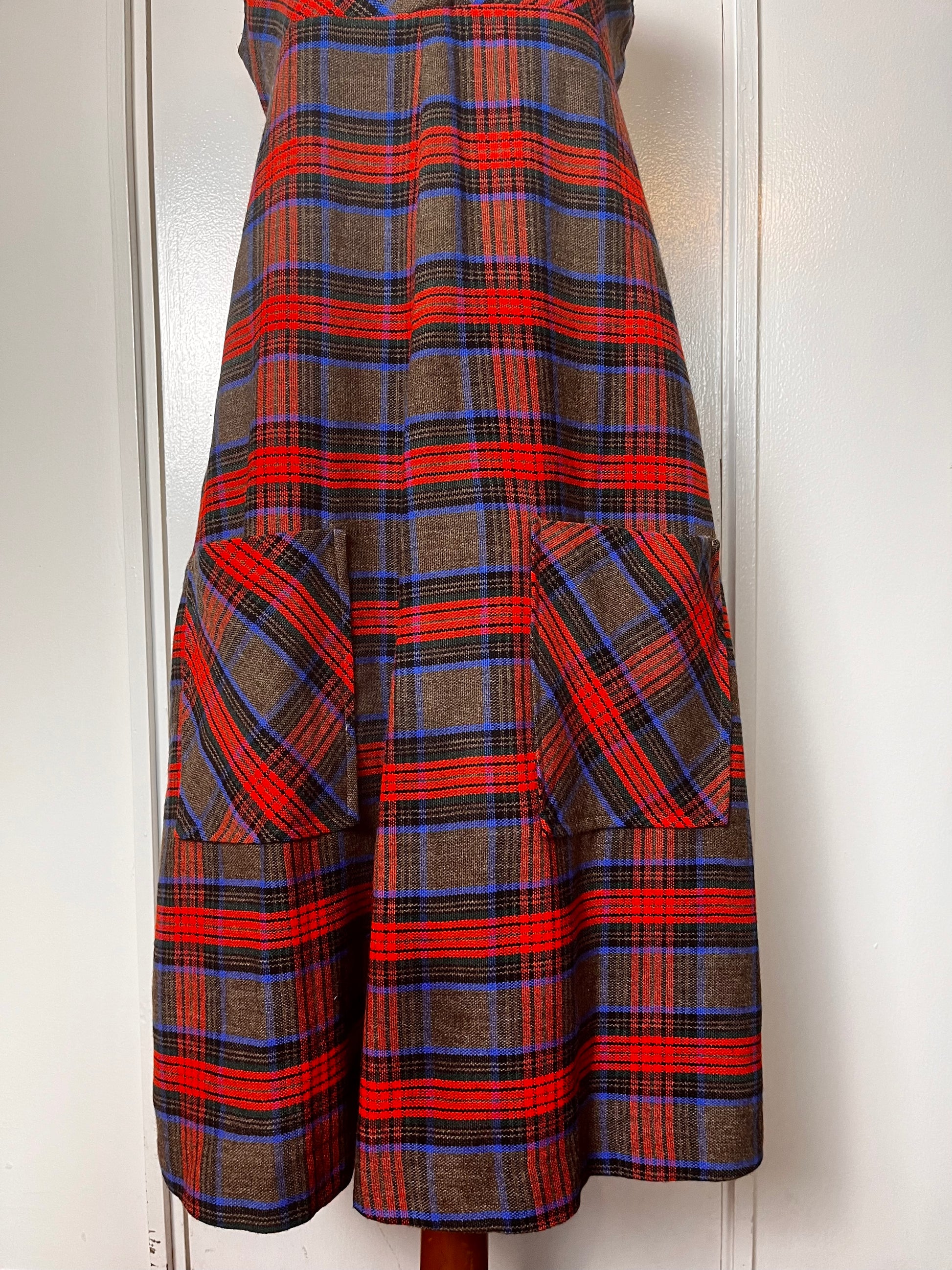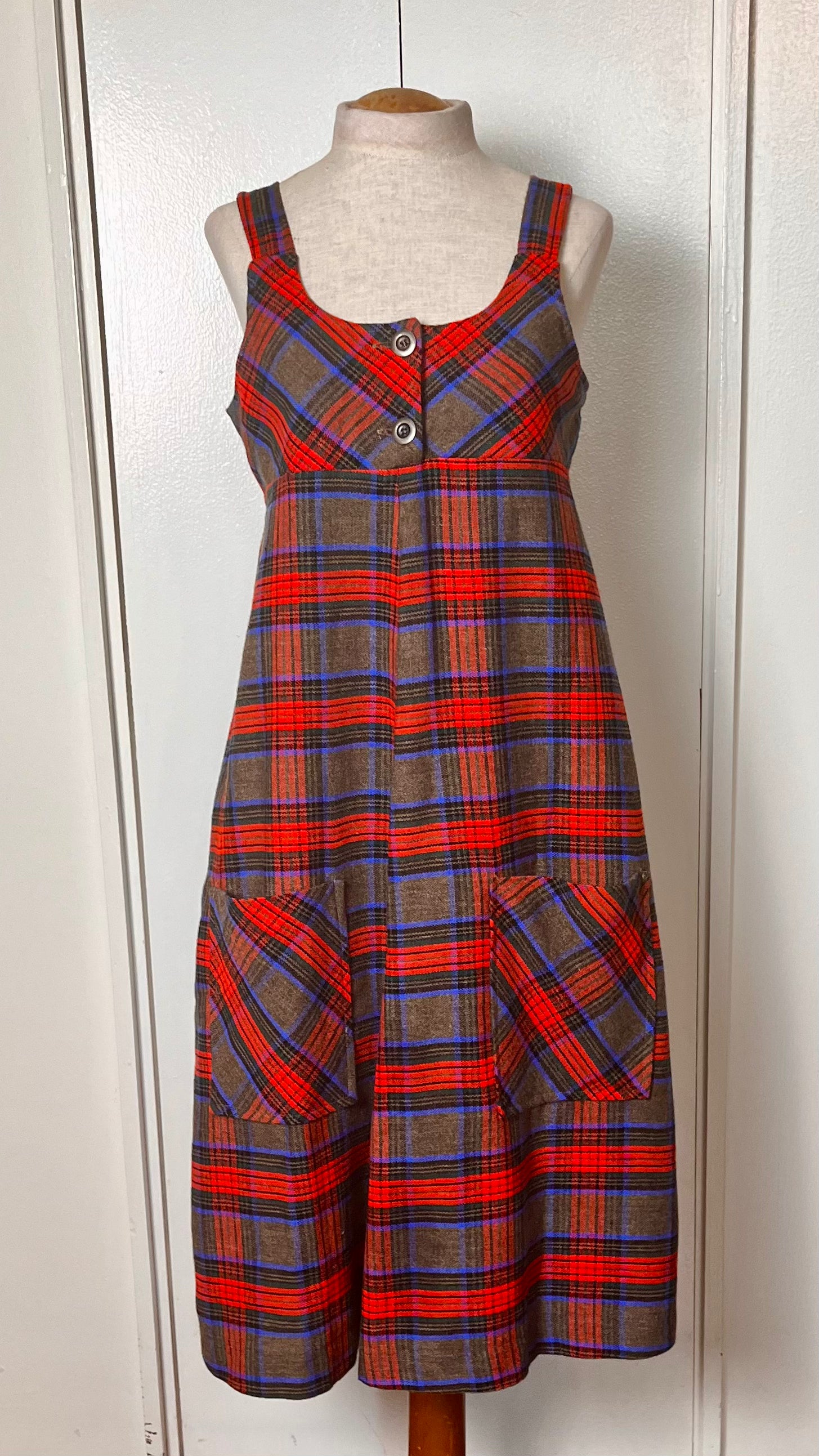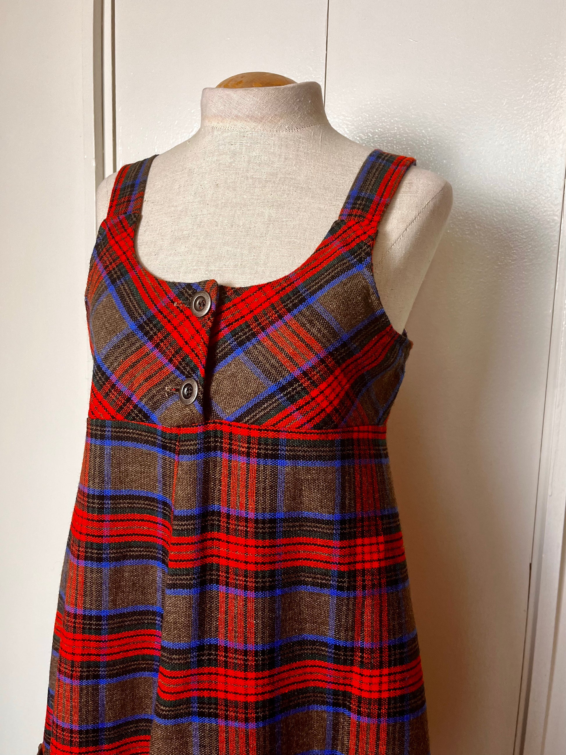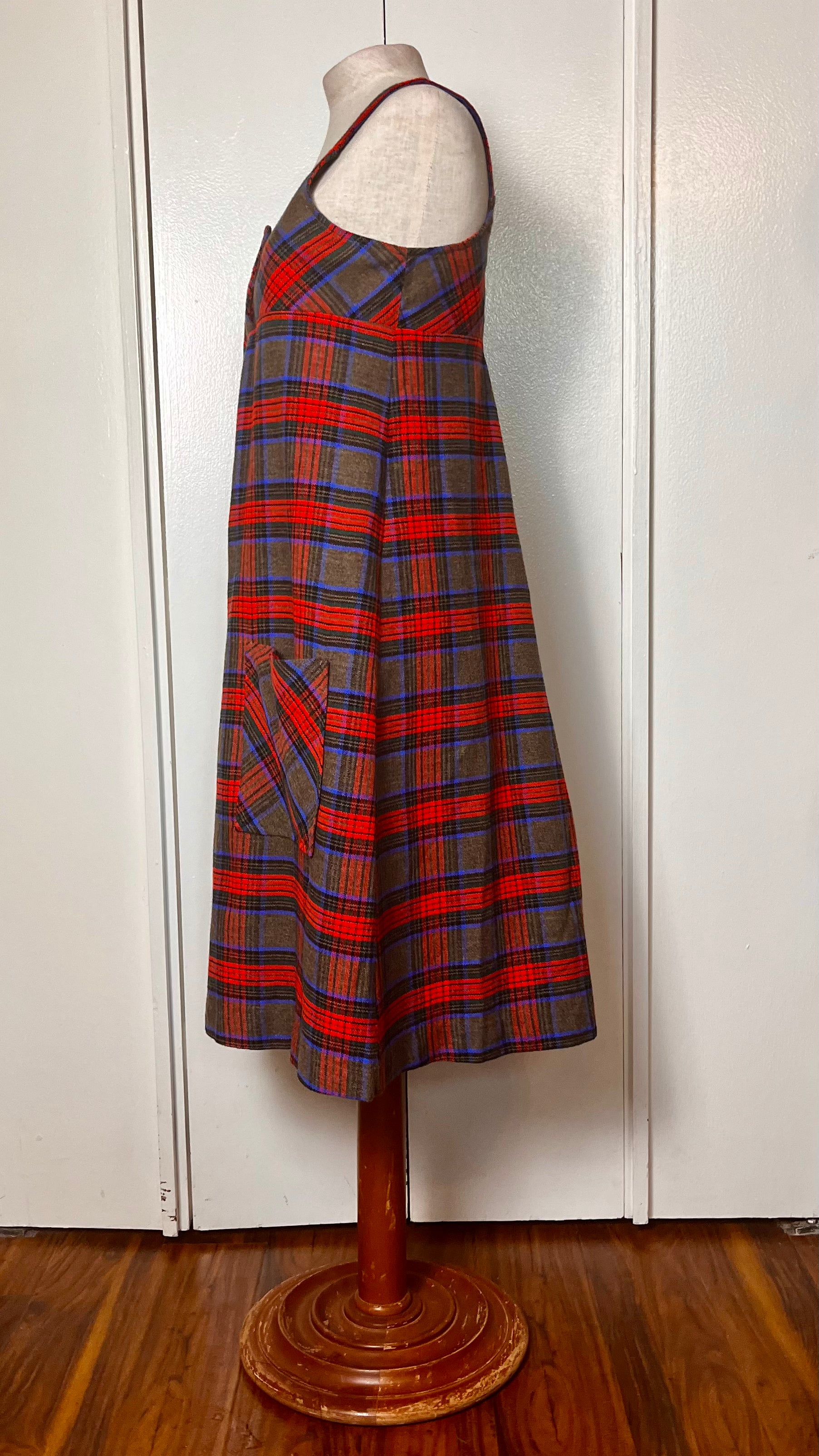 Vintage 1970's Plaid Button-Front Empire Waist Baby-Doll Wool Midi Tent Shift Dress
