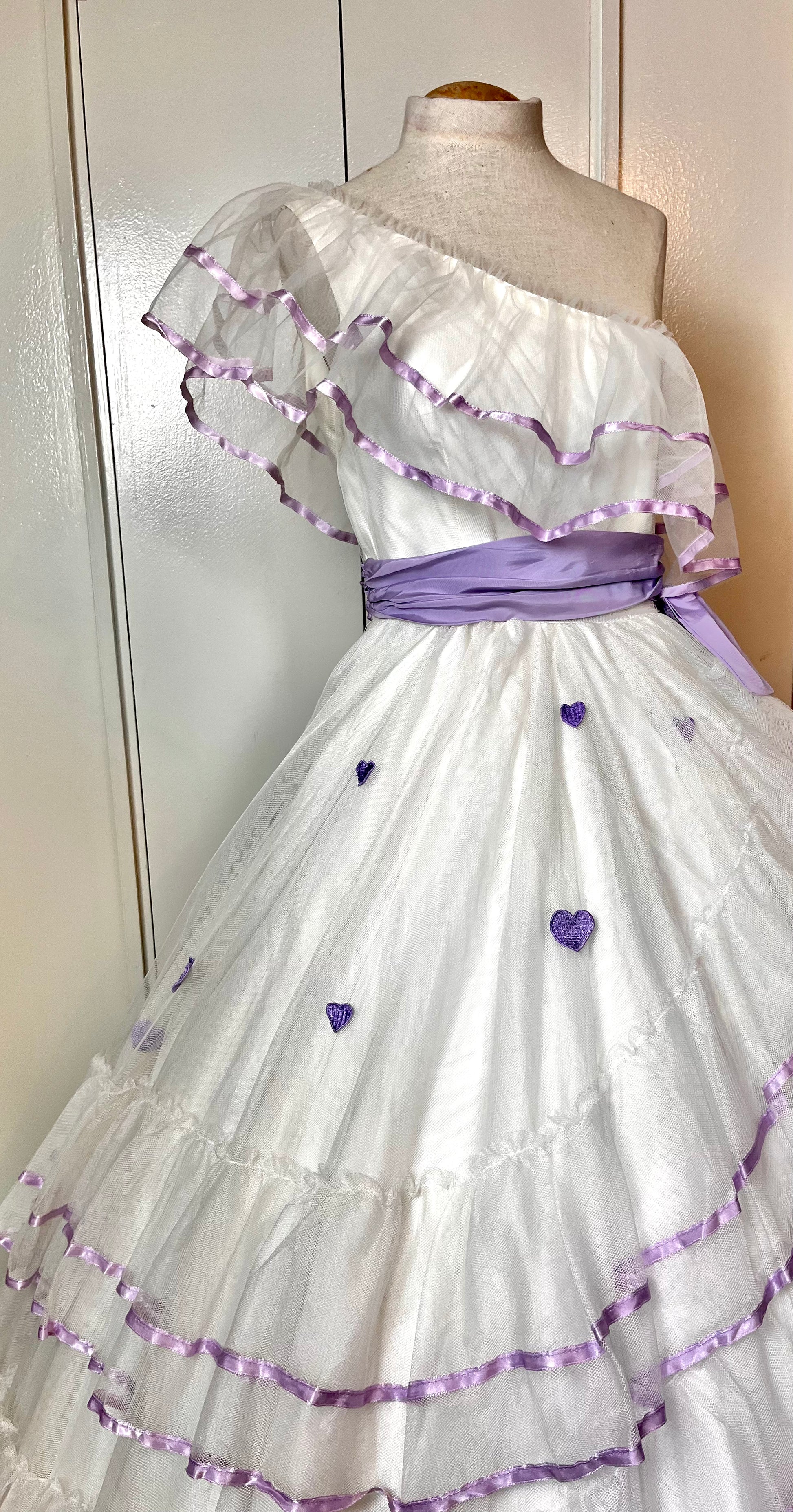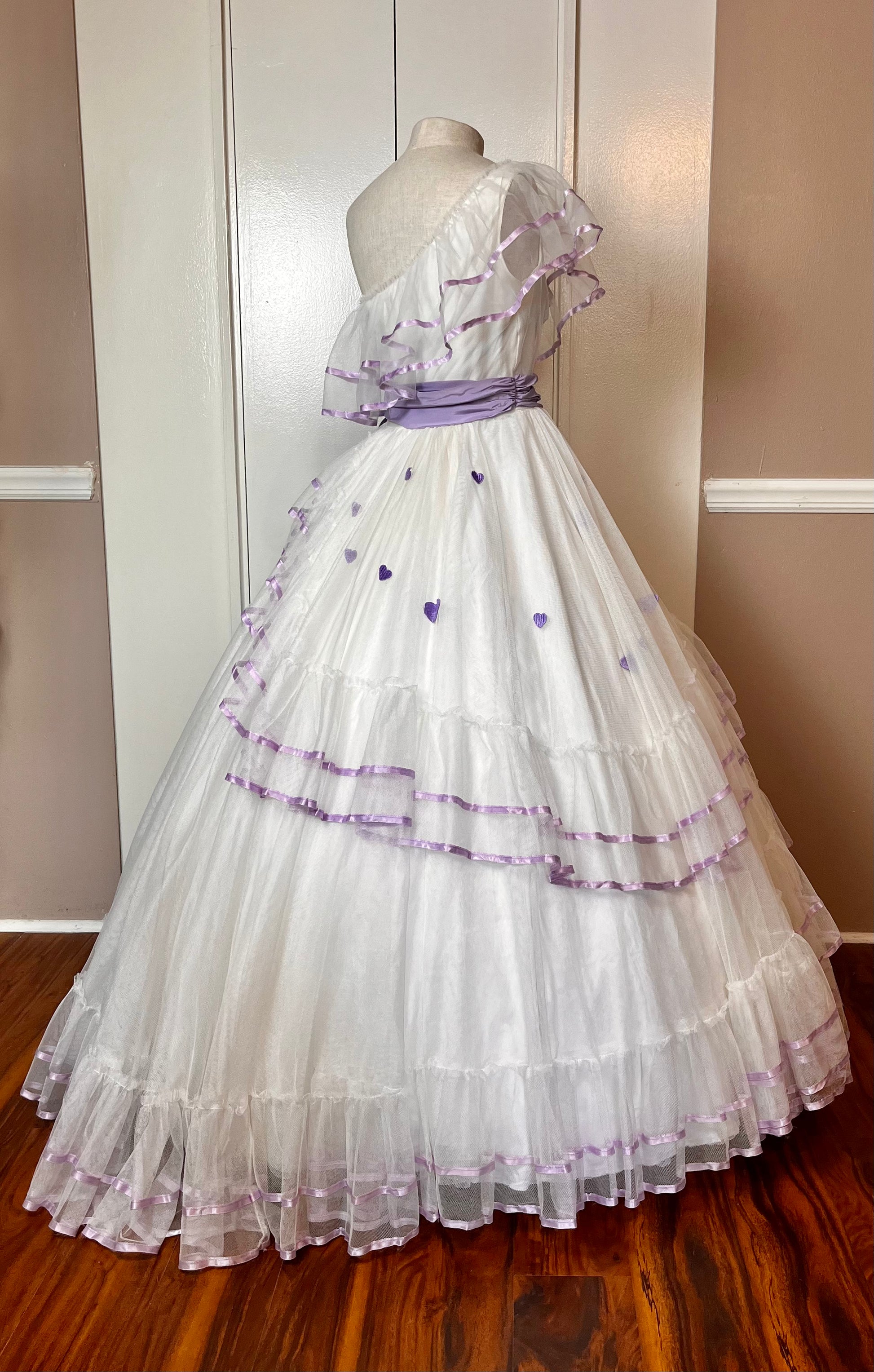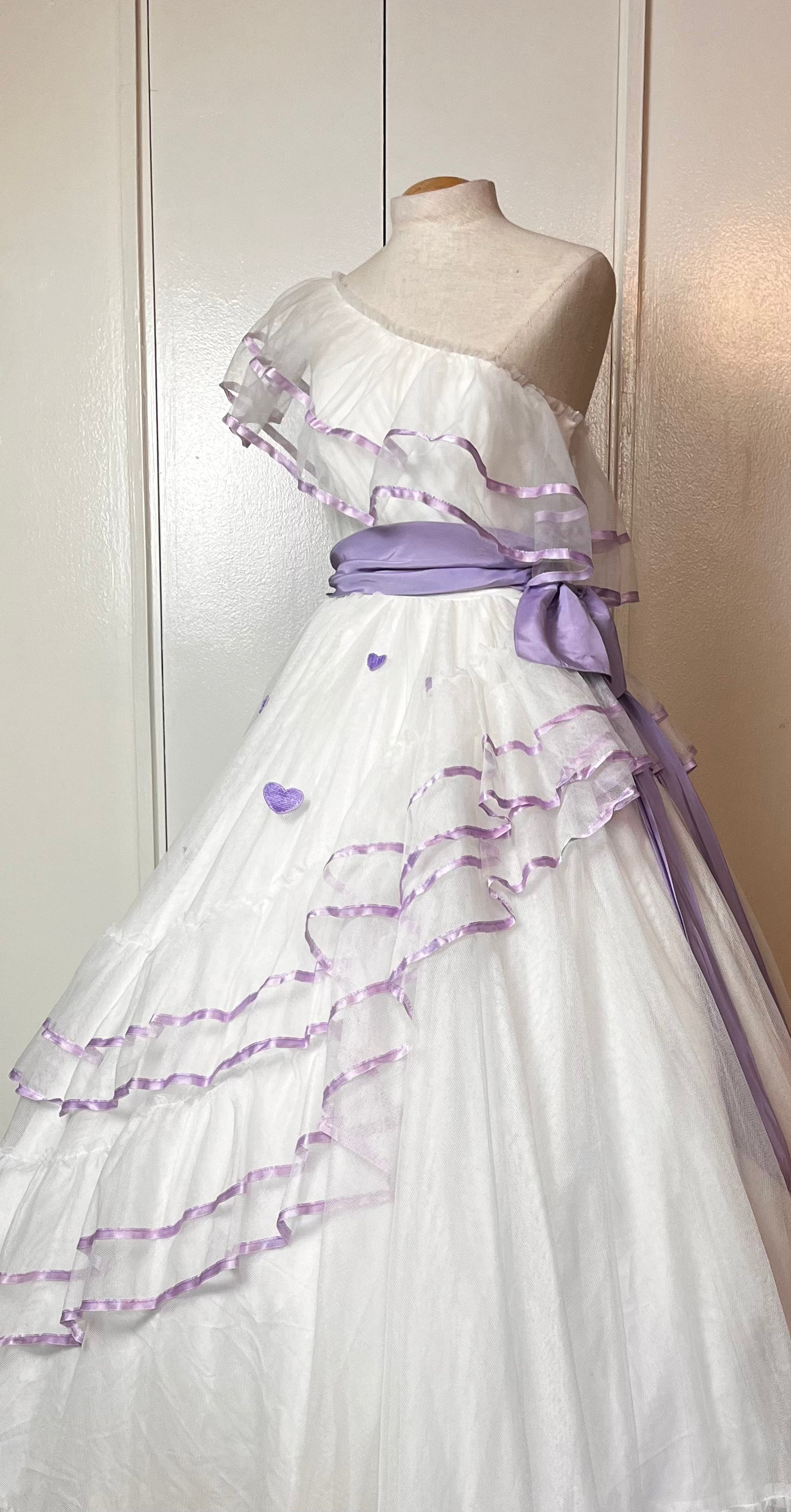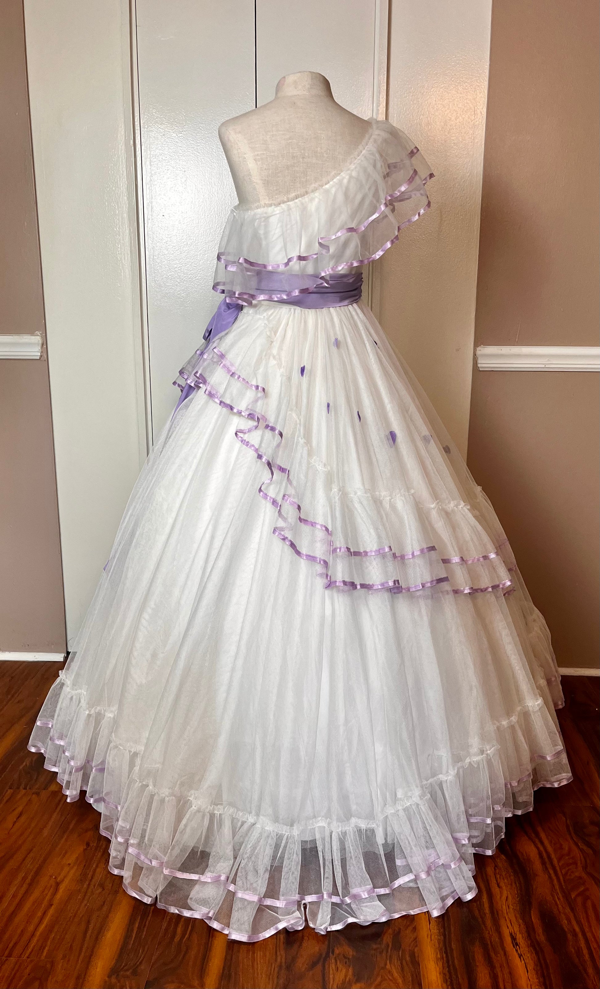 Vintage 1980’s Alfred Angelo White & Purple Queen of Hearts Ribbon Waterfall Ruffle Mesh Tulle One-Shoulder w/ Satin Sash Gown