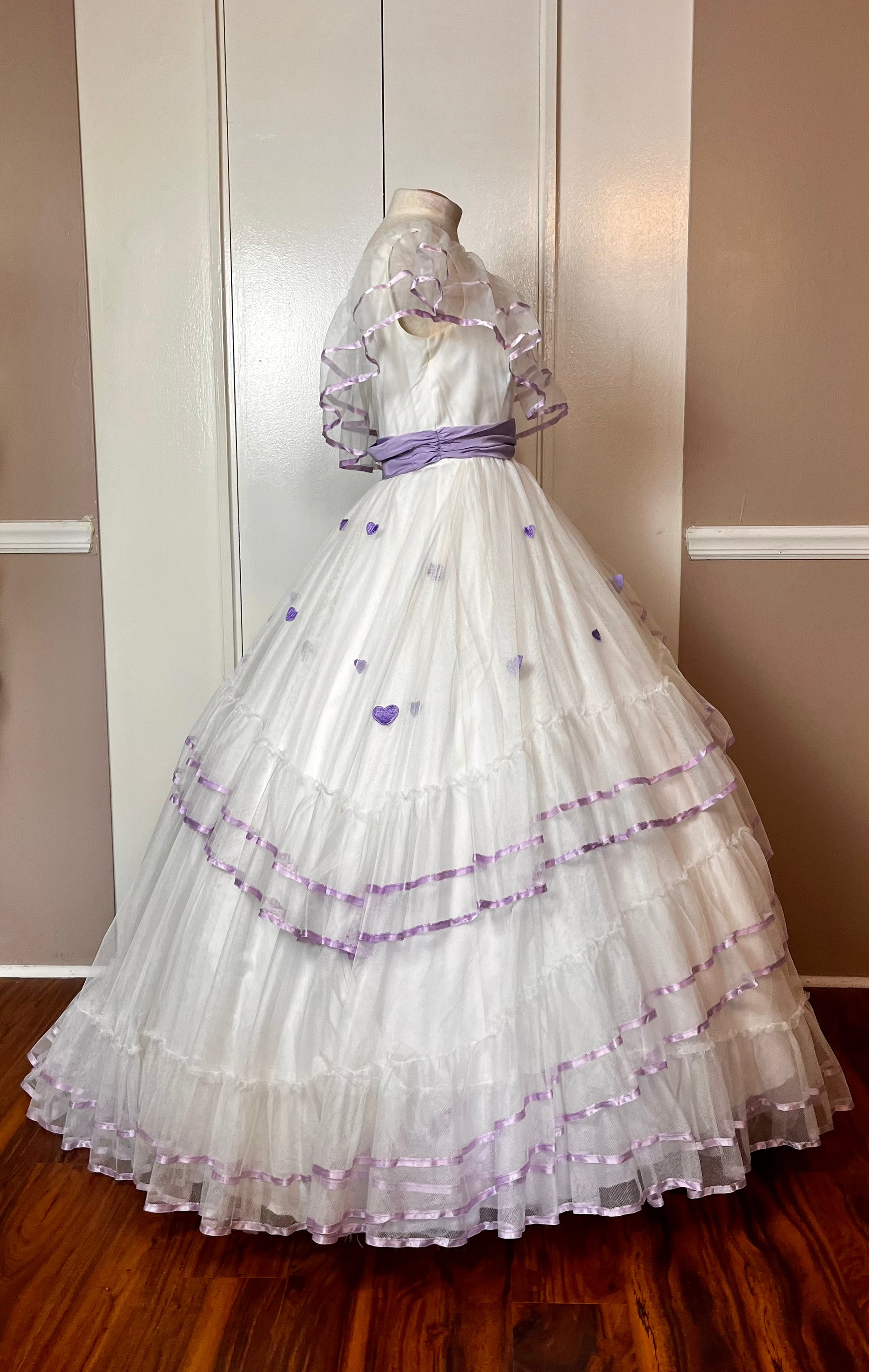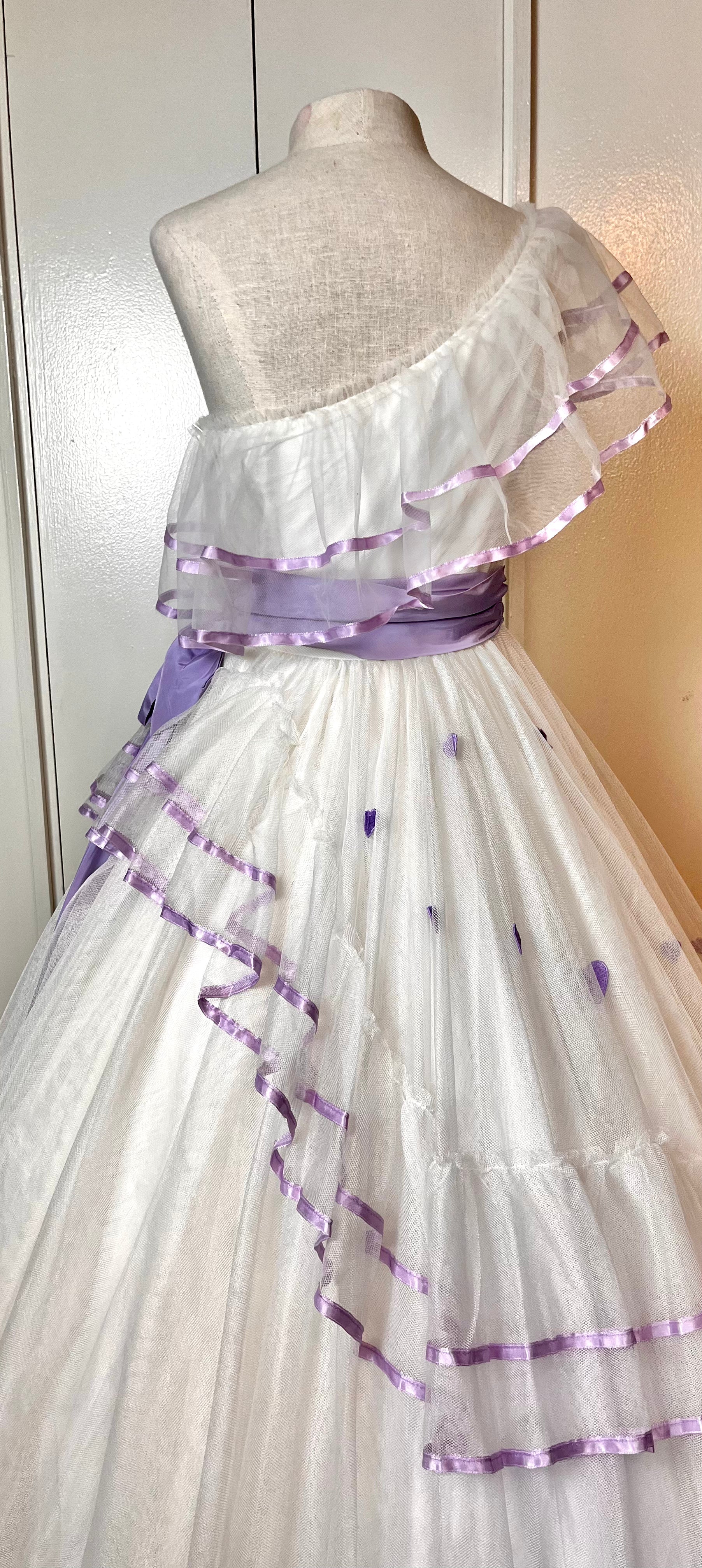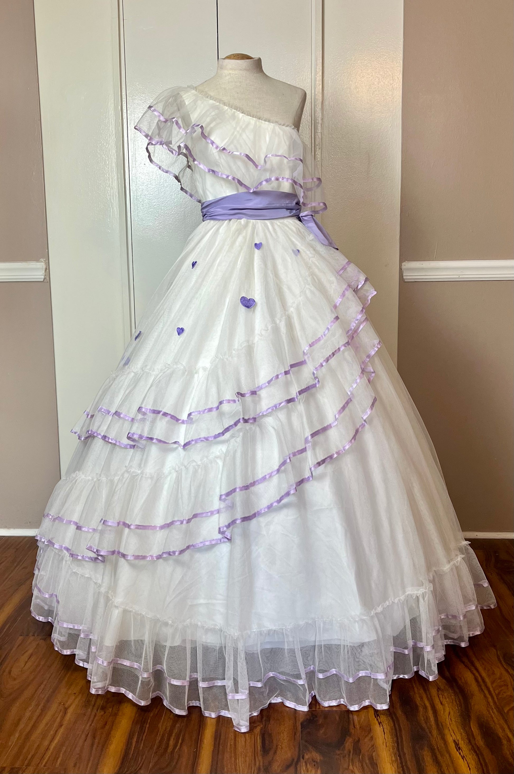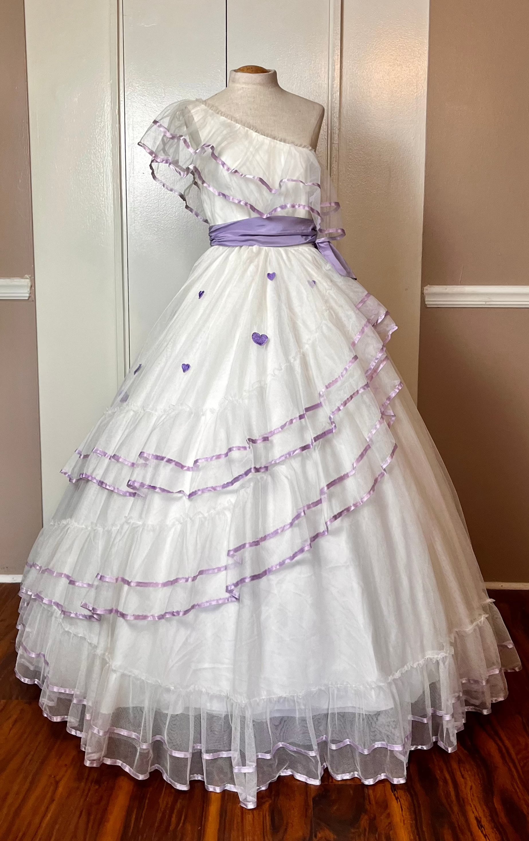 Vintage 1980’s Alfred Angelo White & Purple Queen of Hearts Ribbon Waterfall Ruffle Mesh Tulle One-Shoulder w/ Satin Sash Gown