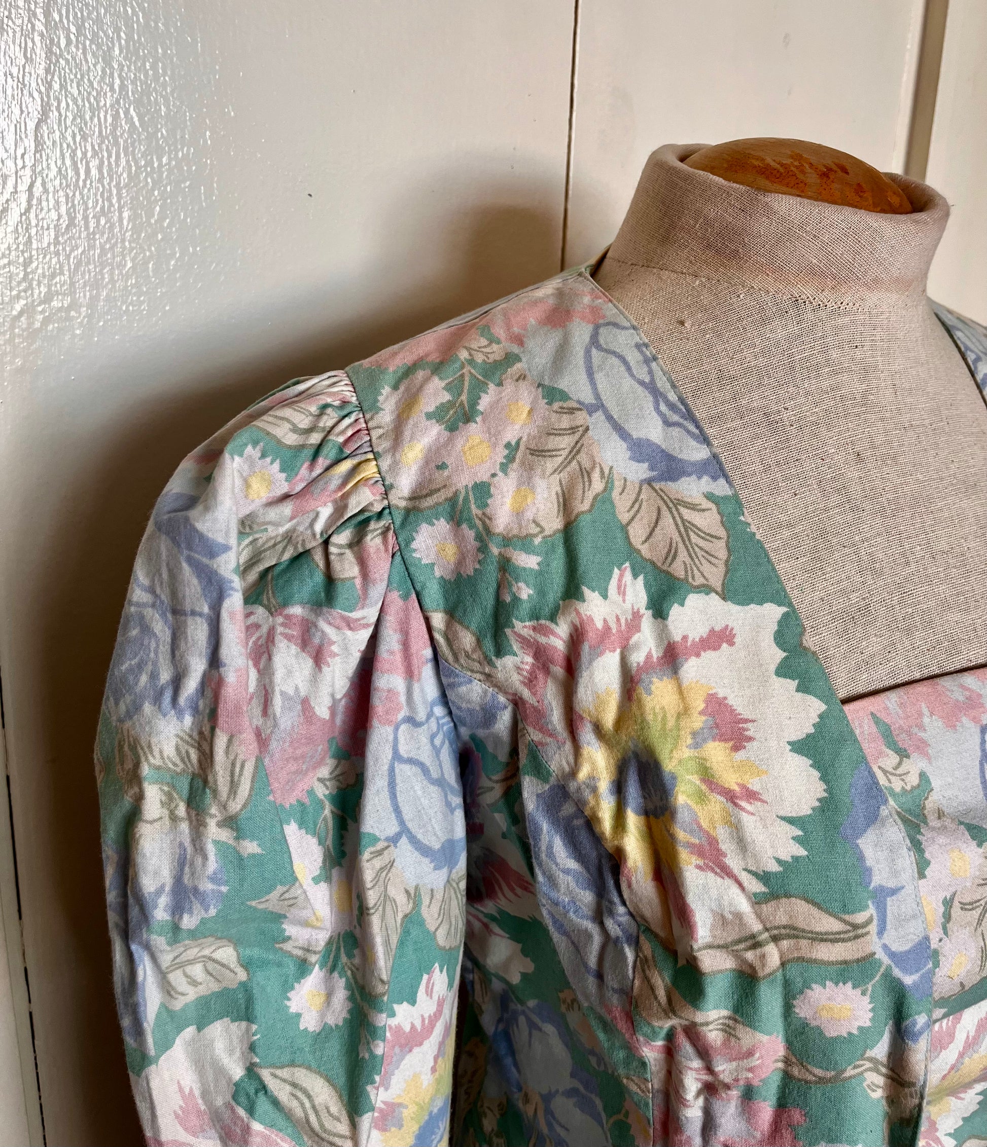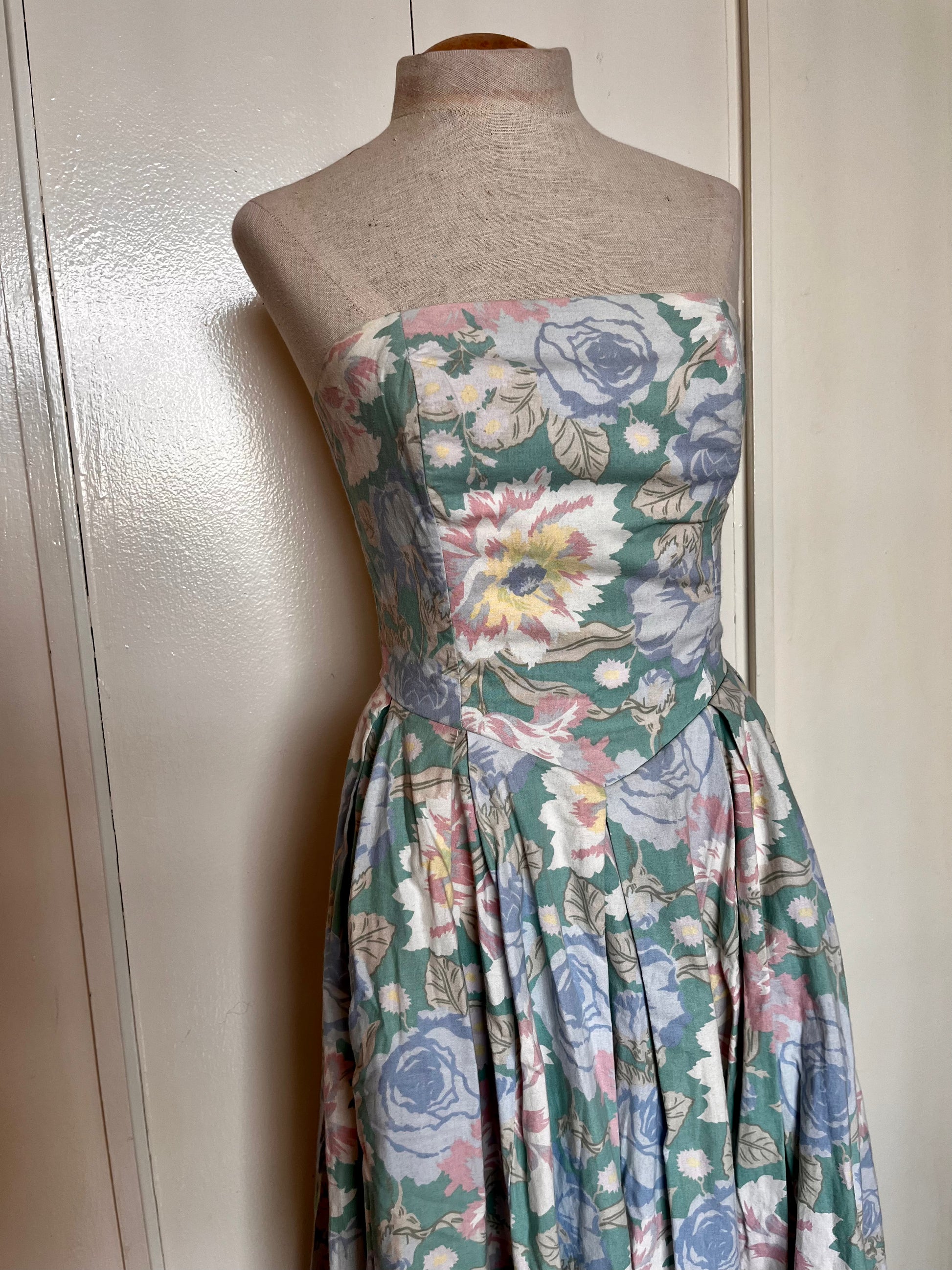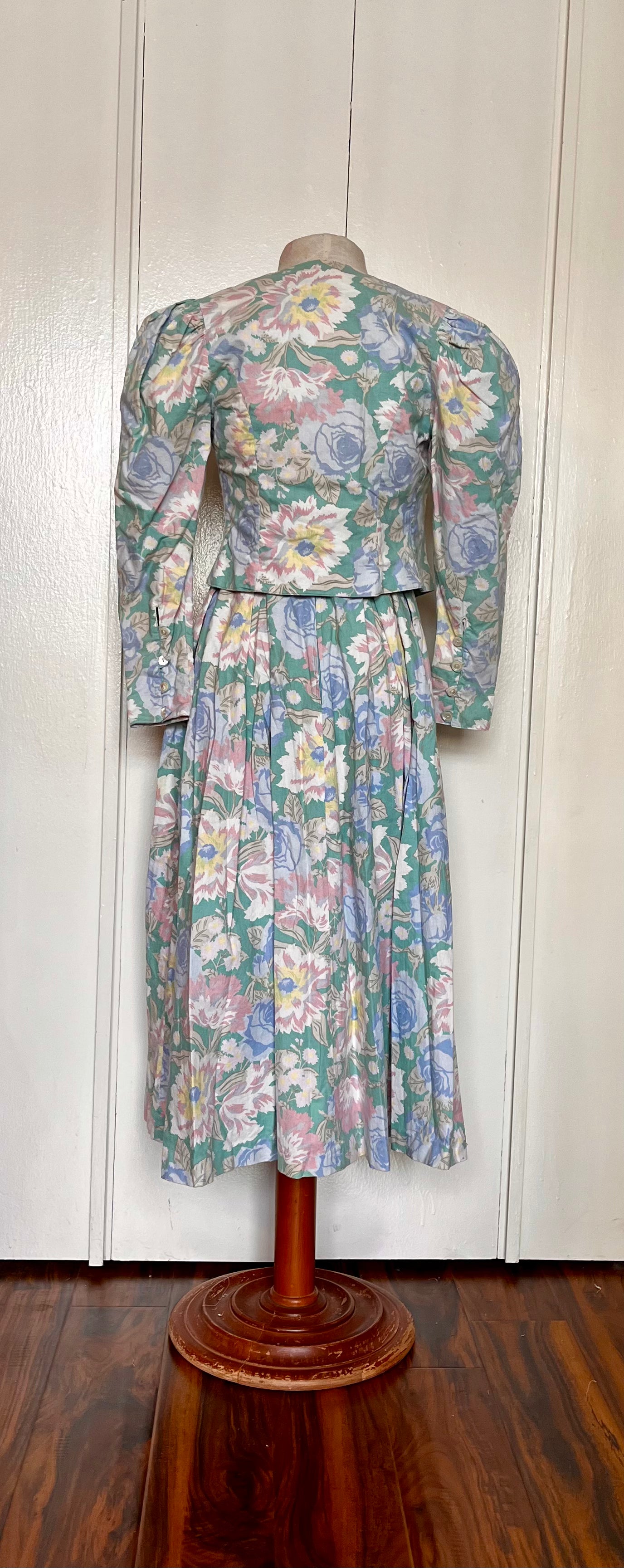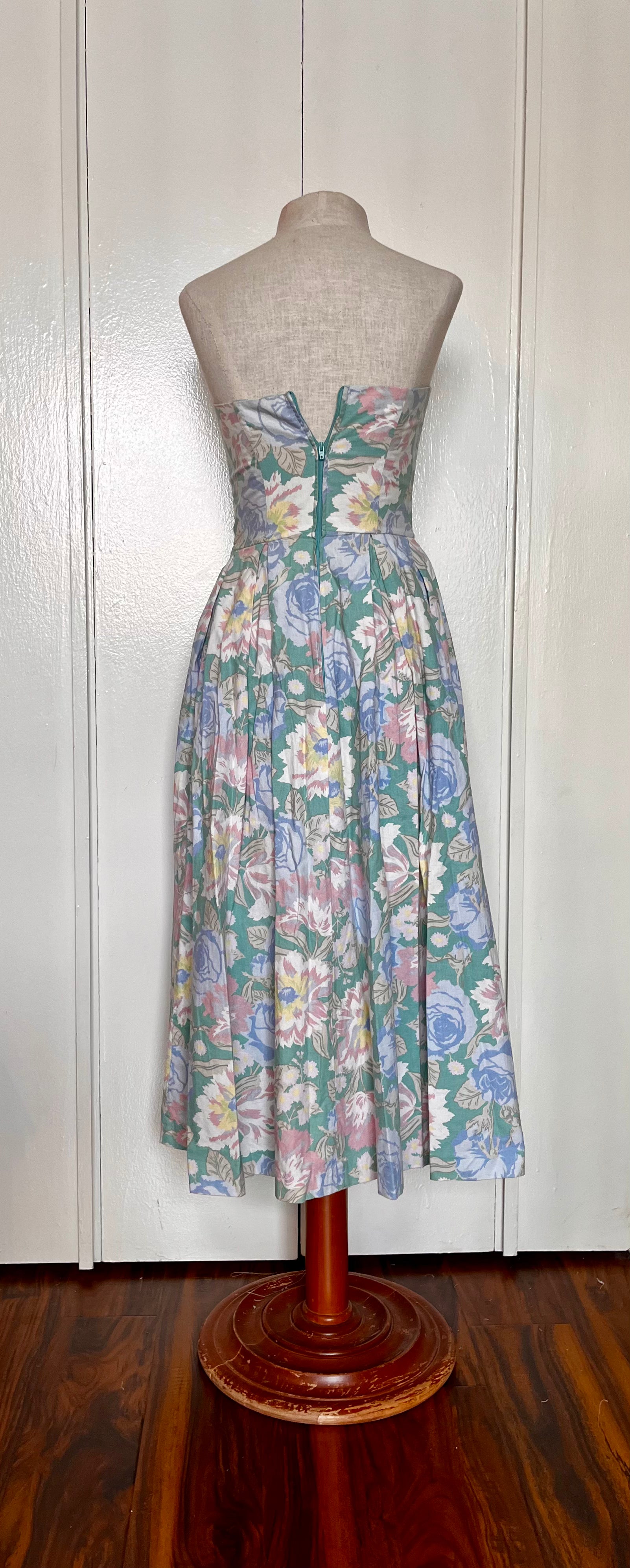 Vintage 1980’s "Laura Ashley" Jacket & Dress Set: Long Mutton Sleeve Open Jacket w/ Strapless Midi Dress in Green w/ Blue & Pink Flowers
