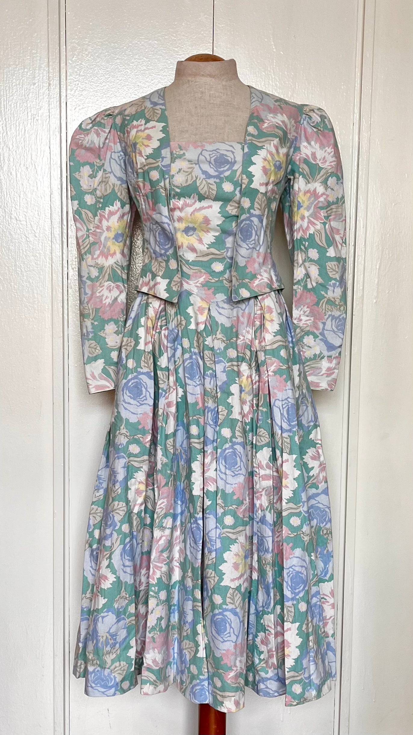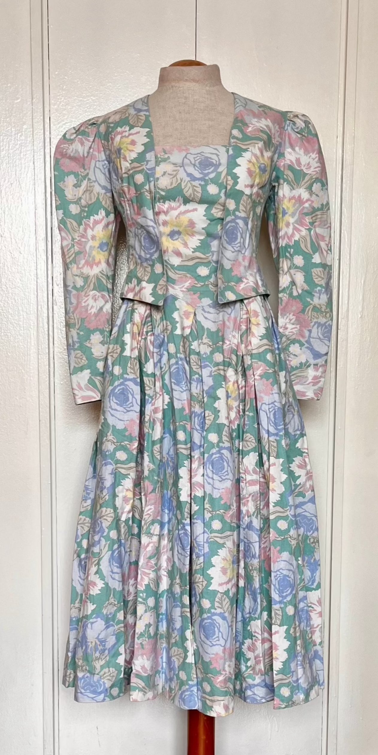 Vintage 1980’s Laura Ashley Jacket & Dress Set: Long Mutton Sleeve Open Jacket w/ Strapless Midi Dress in Green w/ Blue & Pink Flowers
