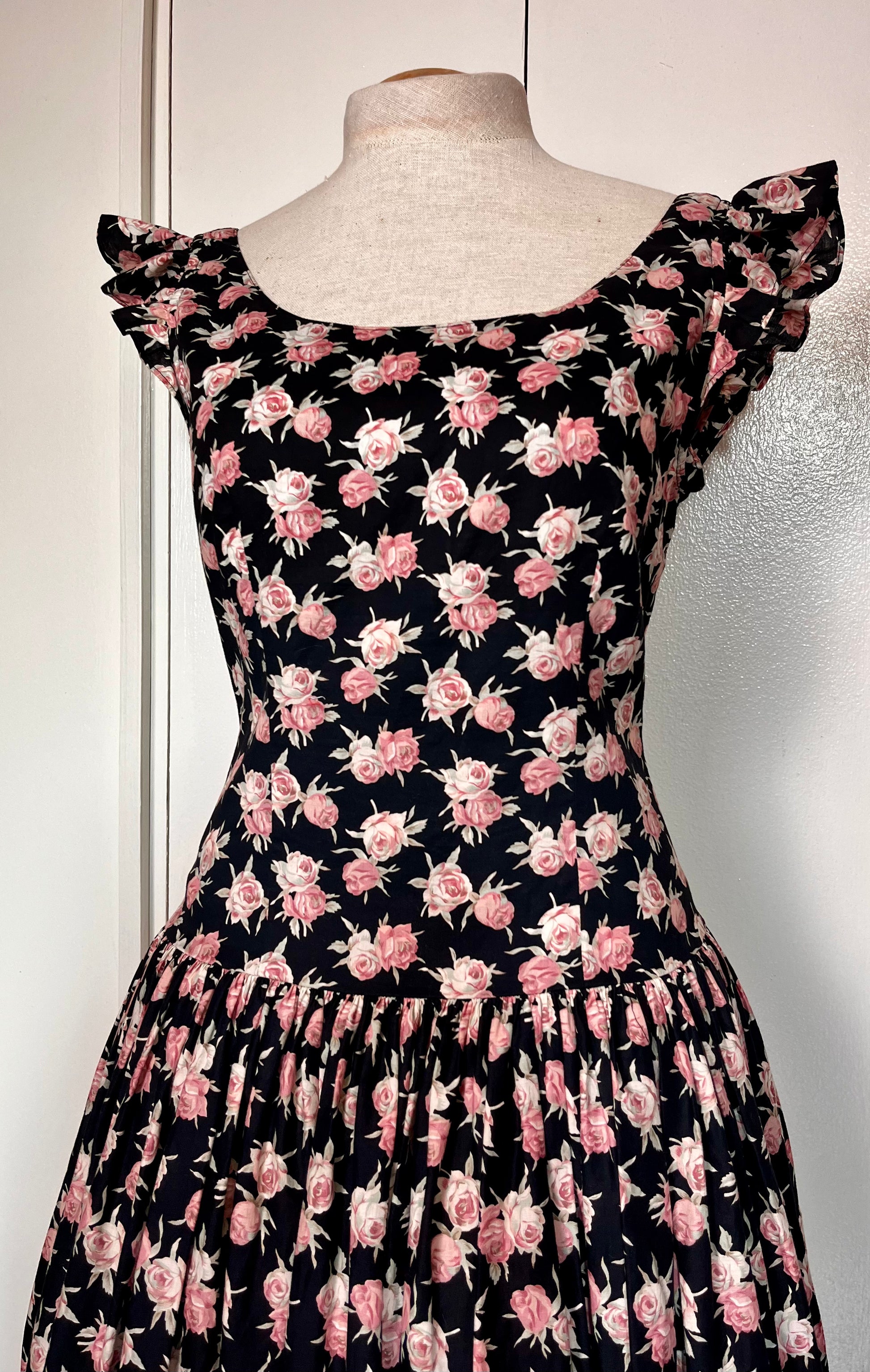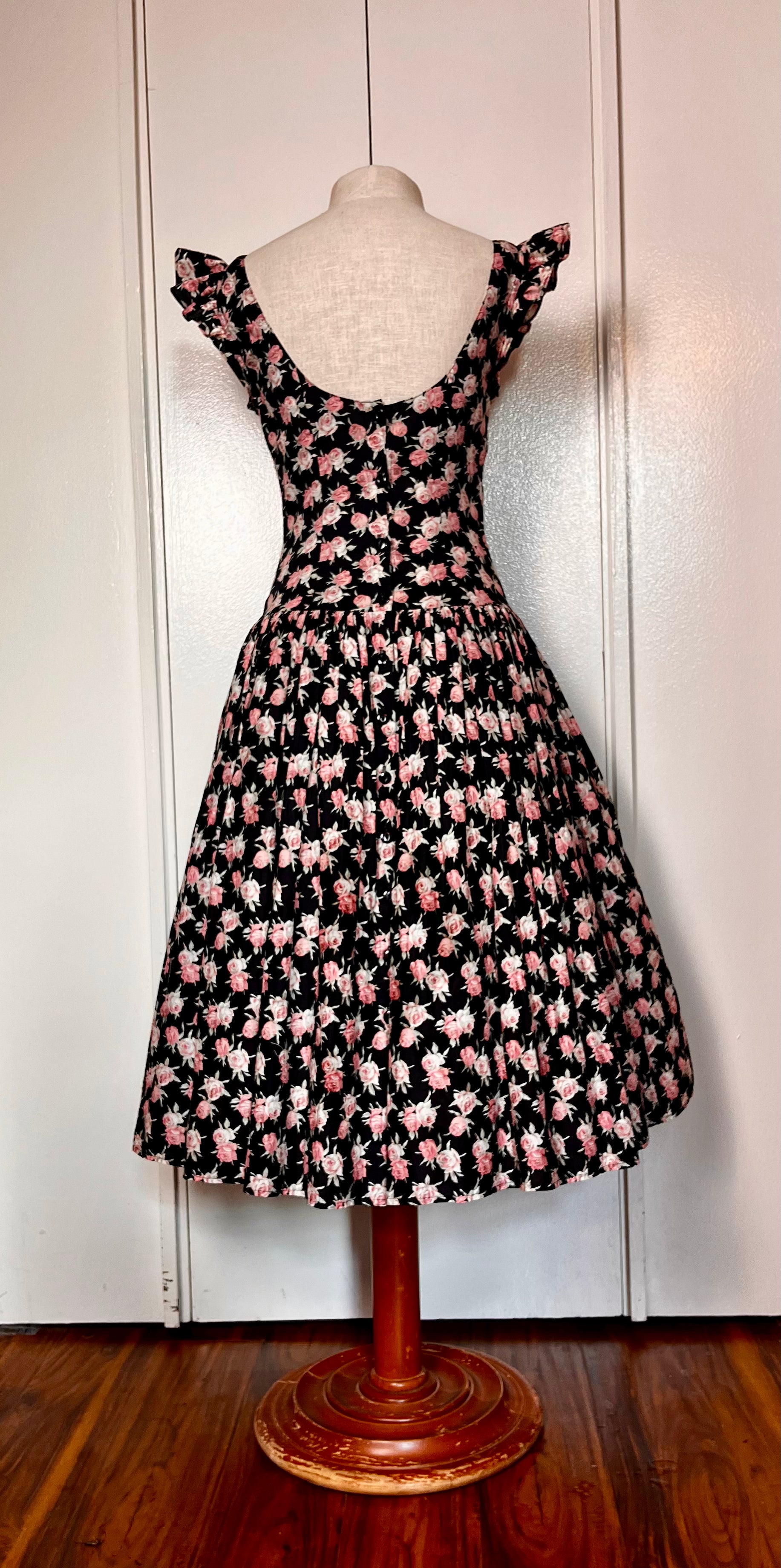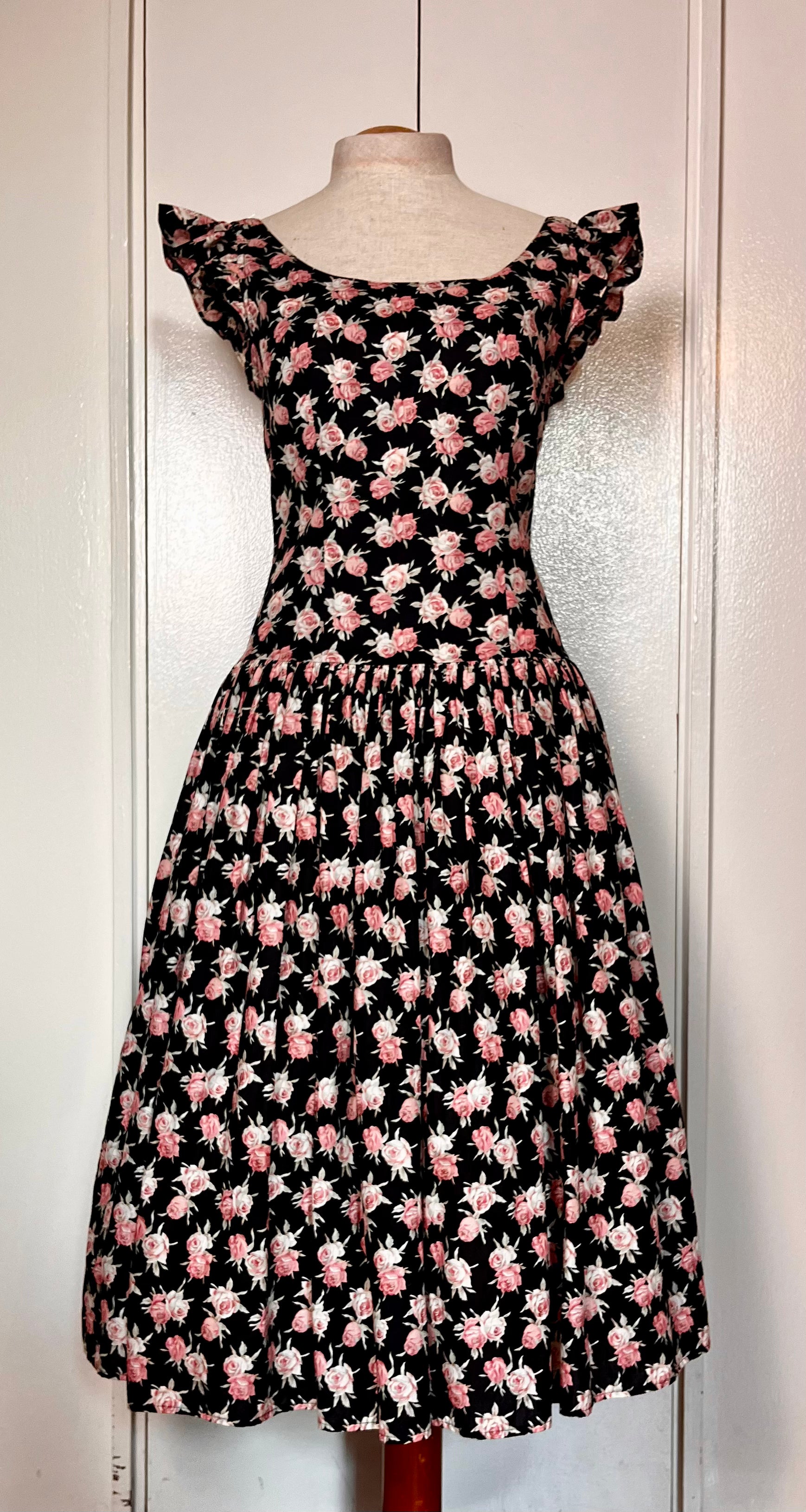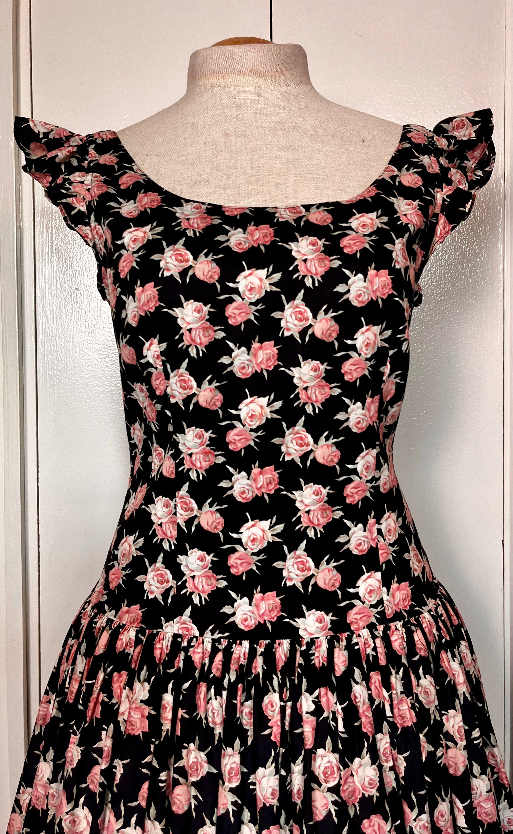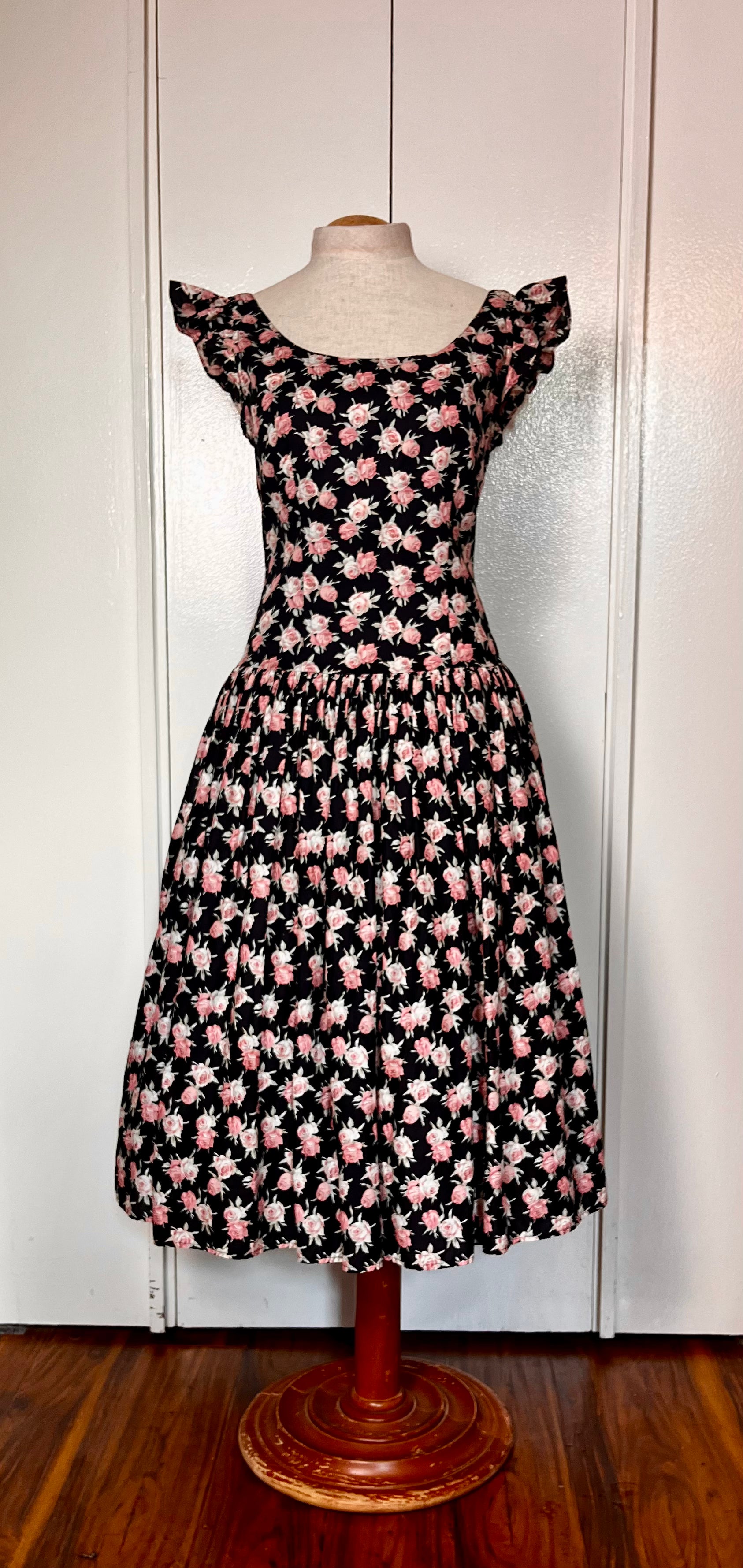Vintage 1980's "Eileen West" Black and Roses Flutter Sleeve Fit N Flare Dress