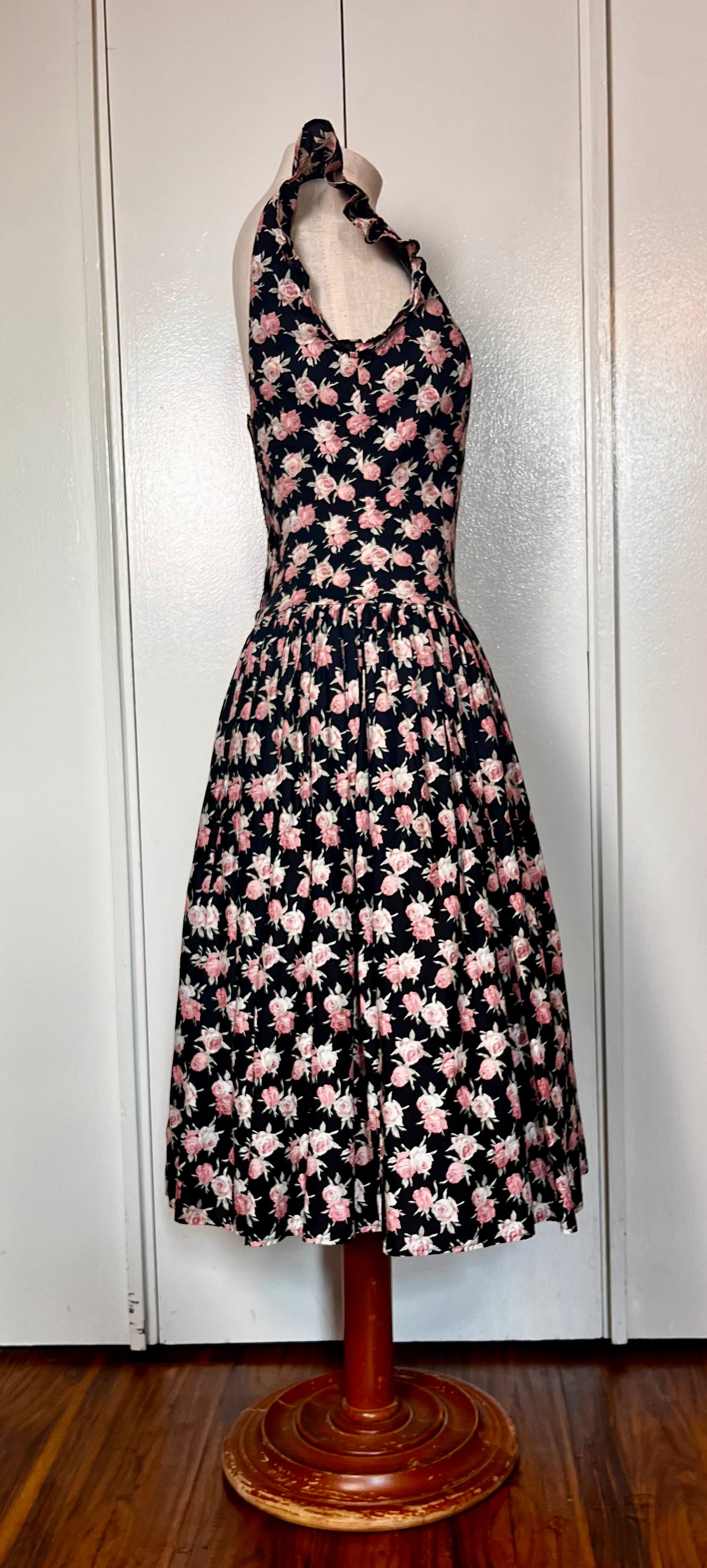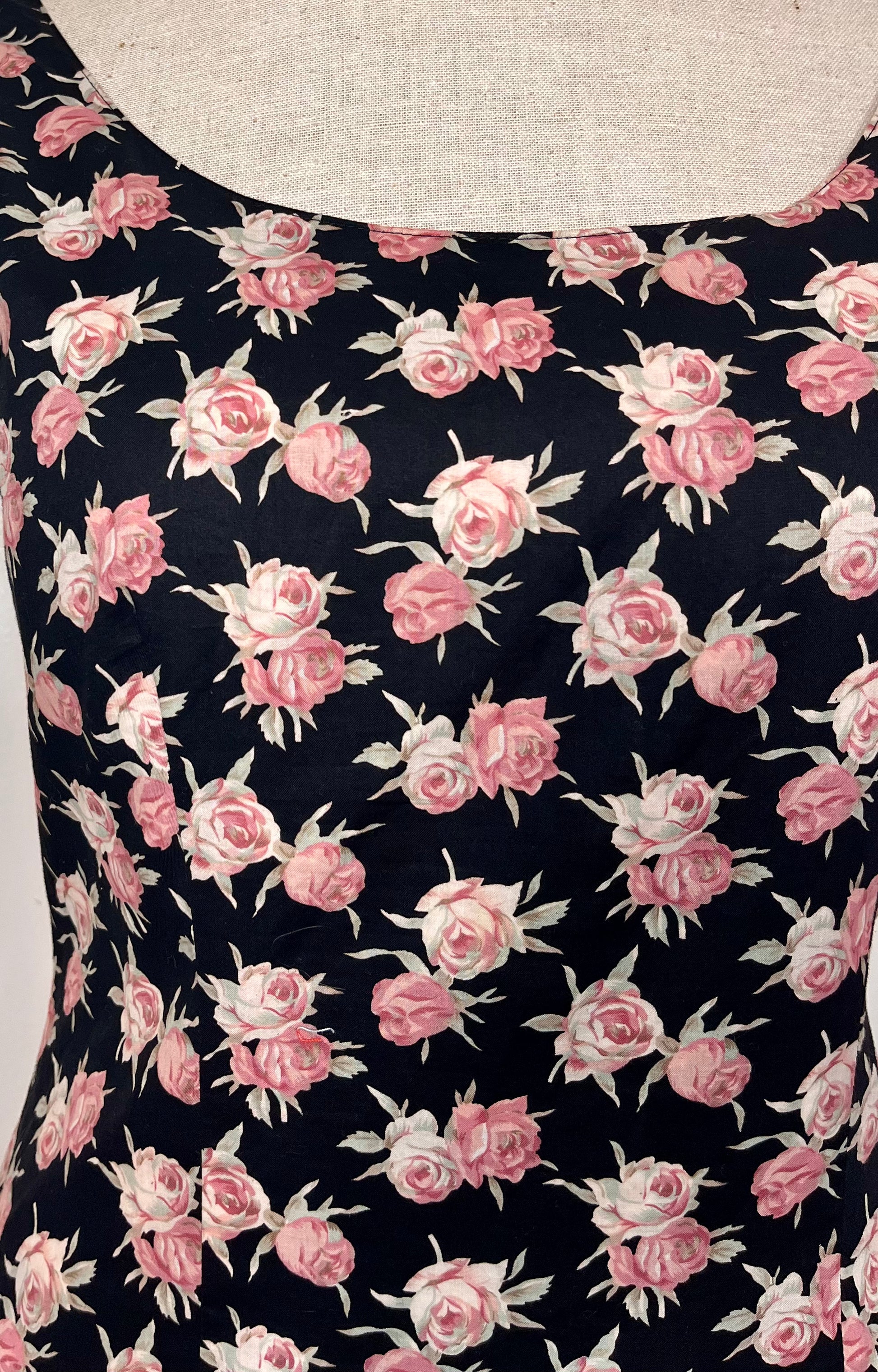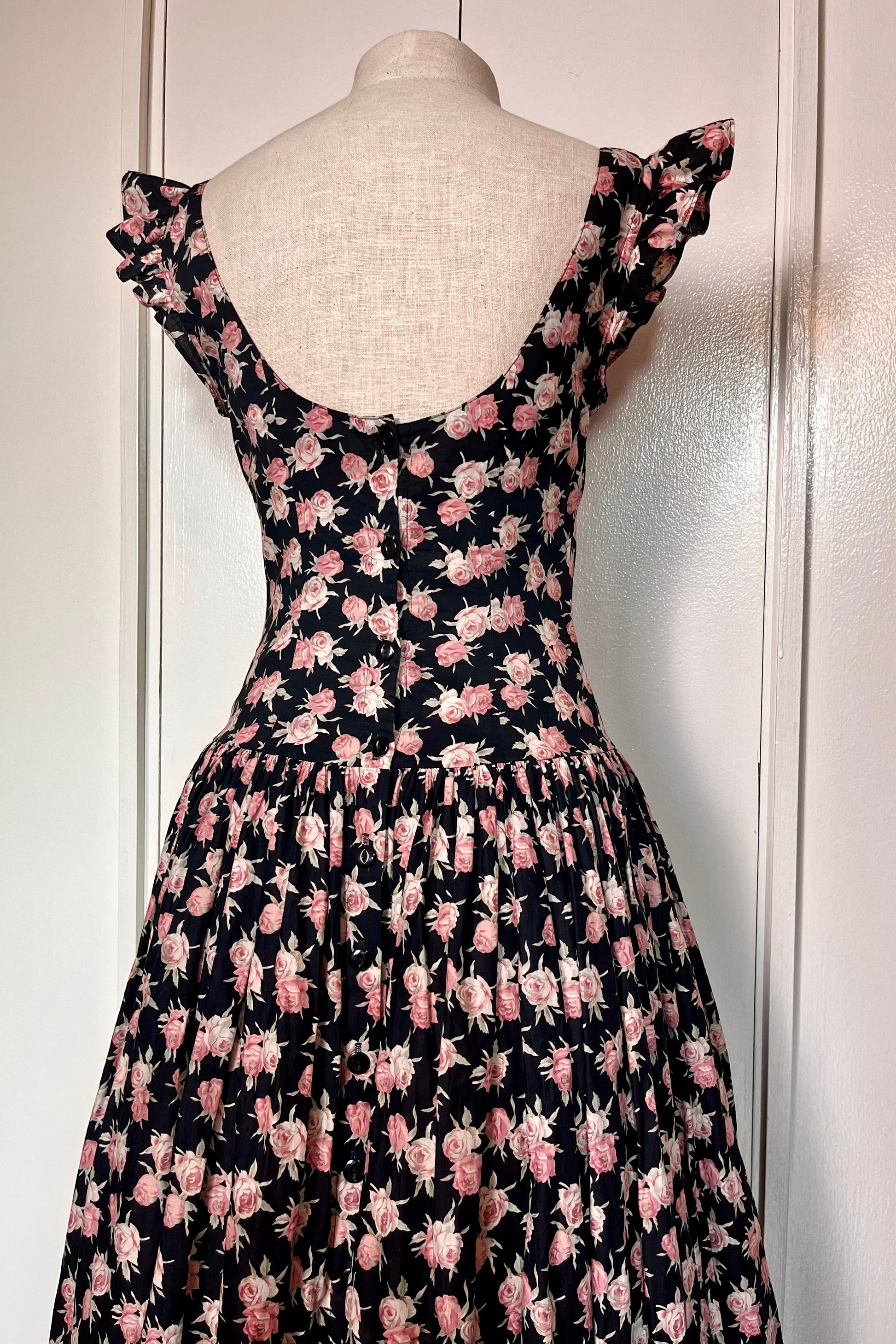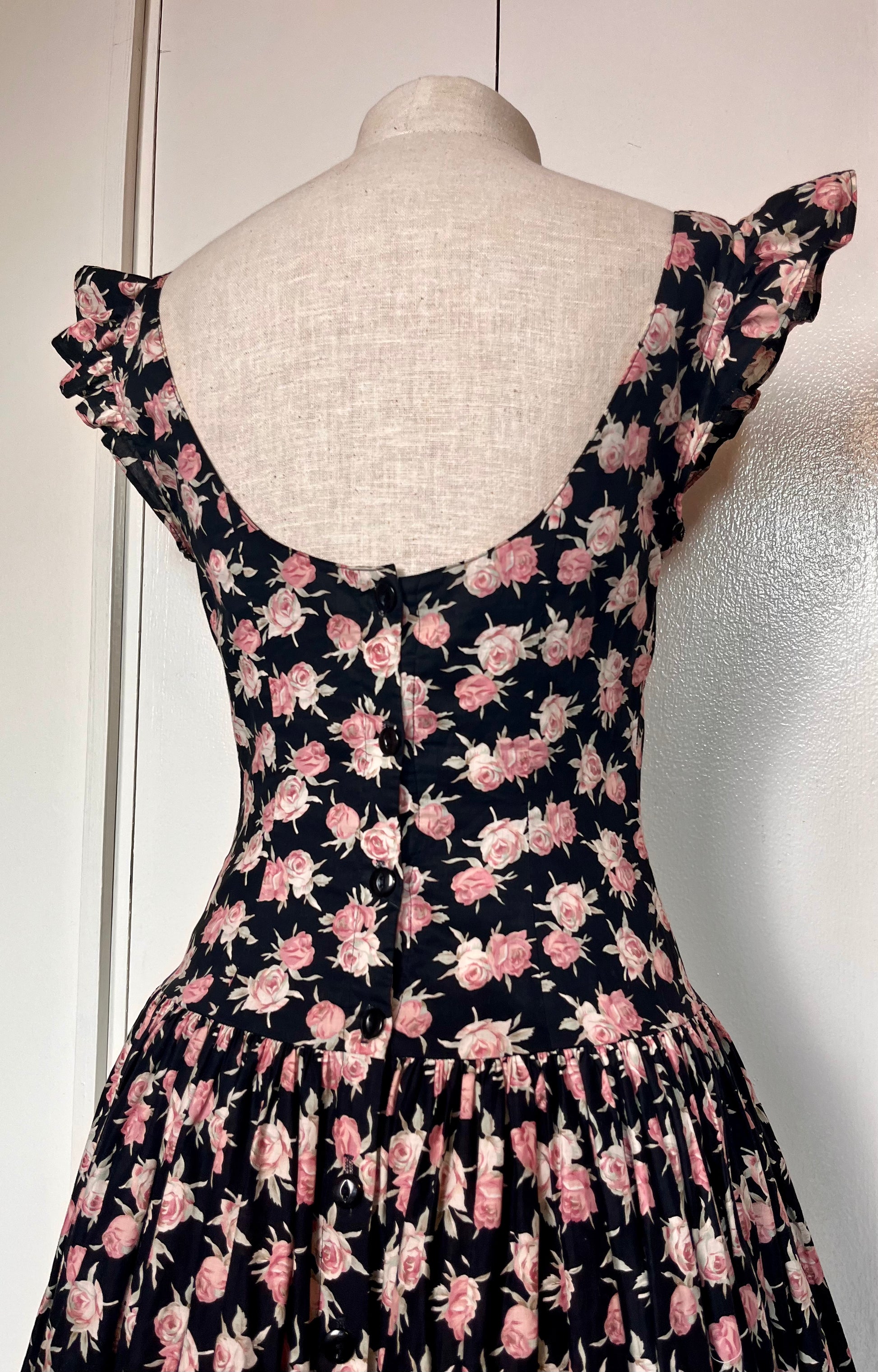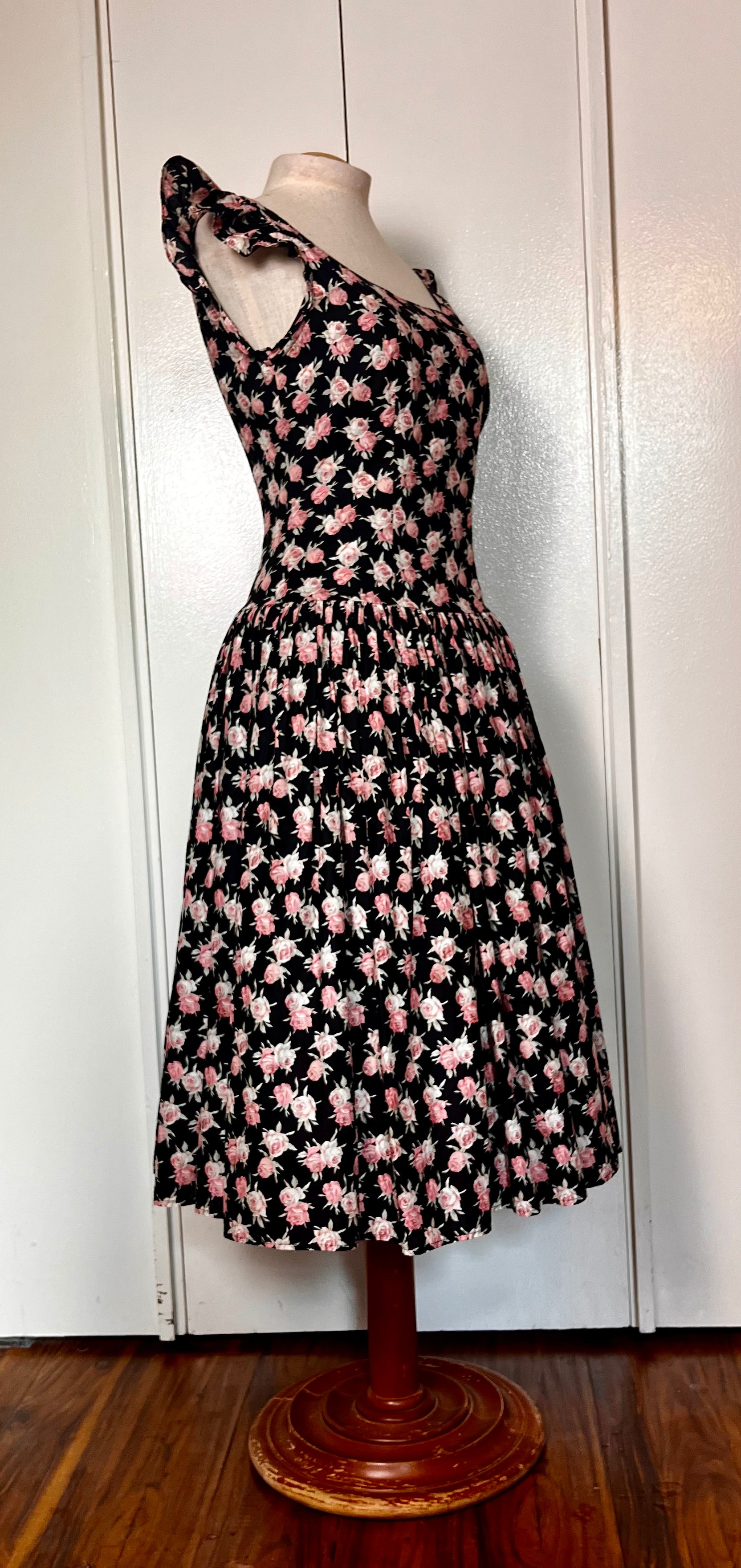 Vintage 1980's "Eileen West" Black and Roses Flutter Sleeve Fit N Flare Dress