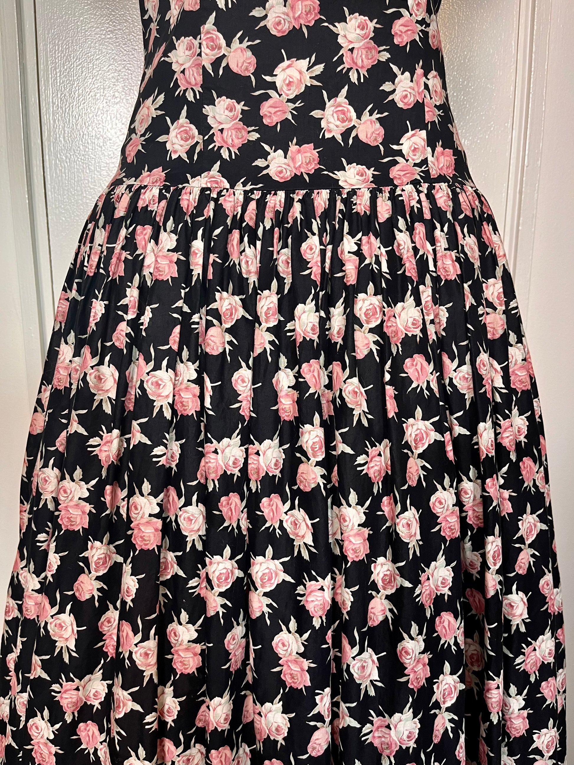 Vintage 1980's Eileen West Pink Roses Flutter Sleeve Button-Back Drop Waist Fit N Flare Dress