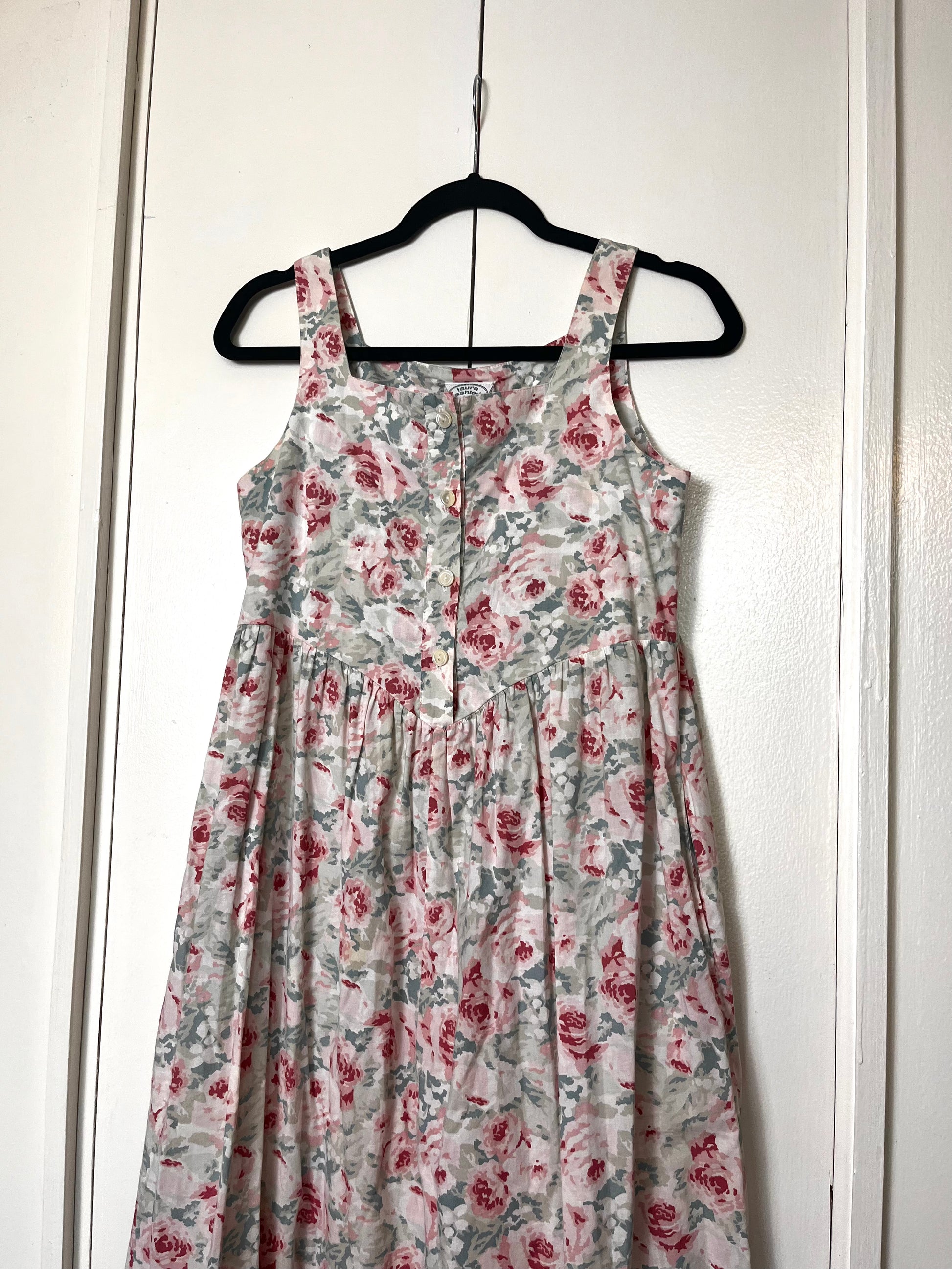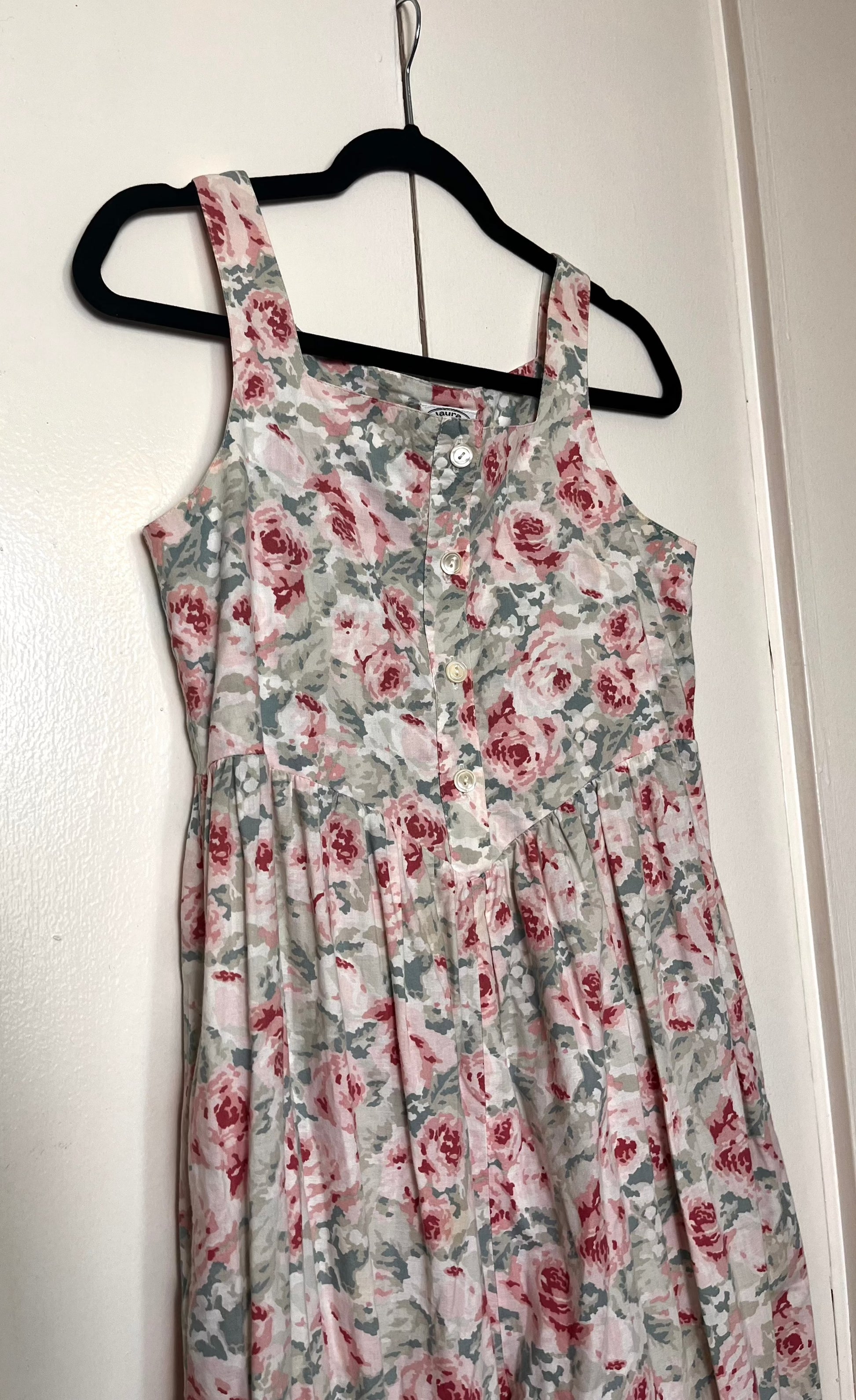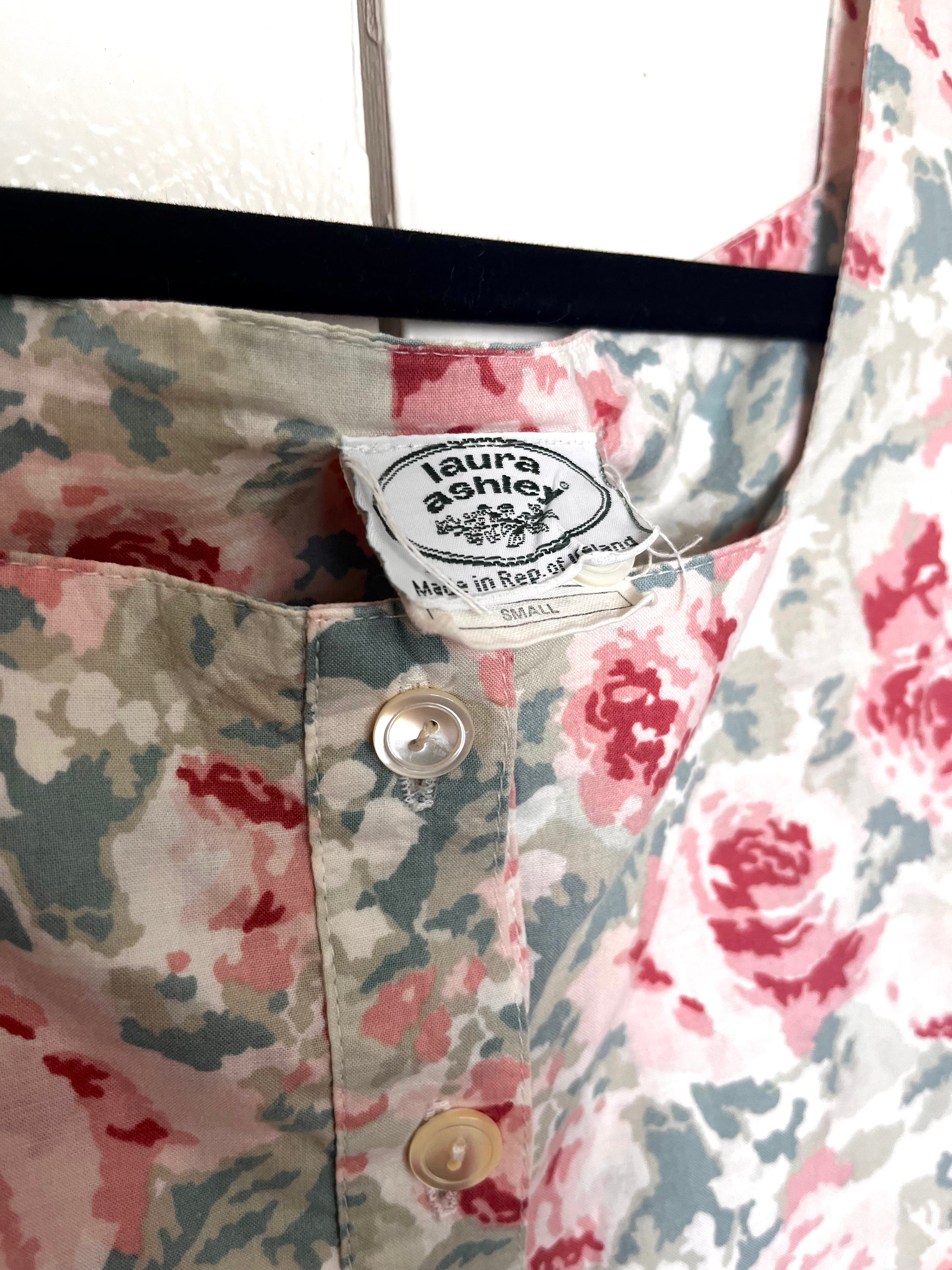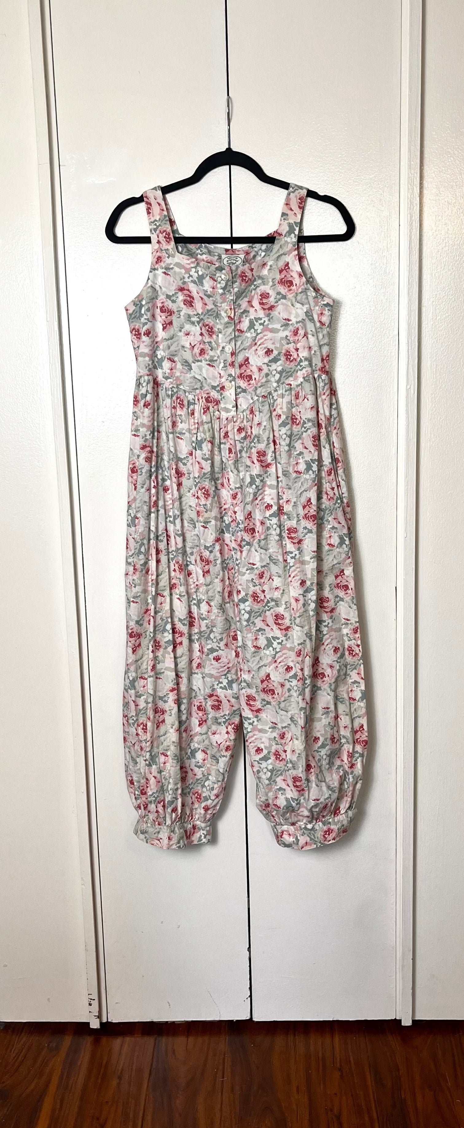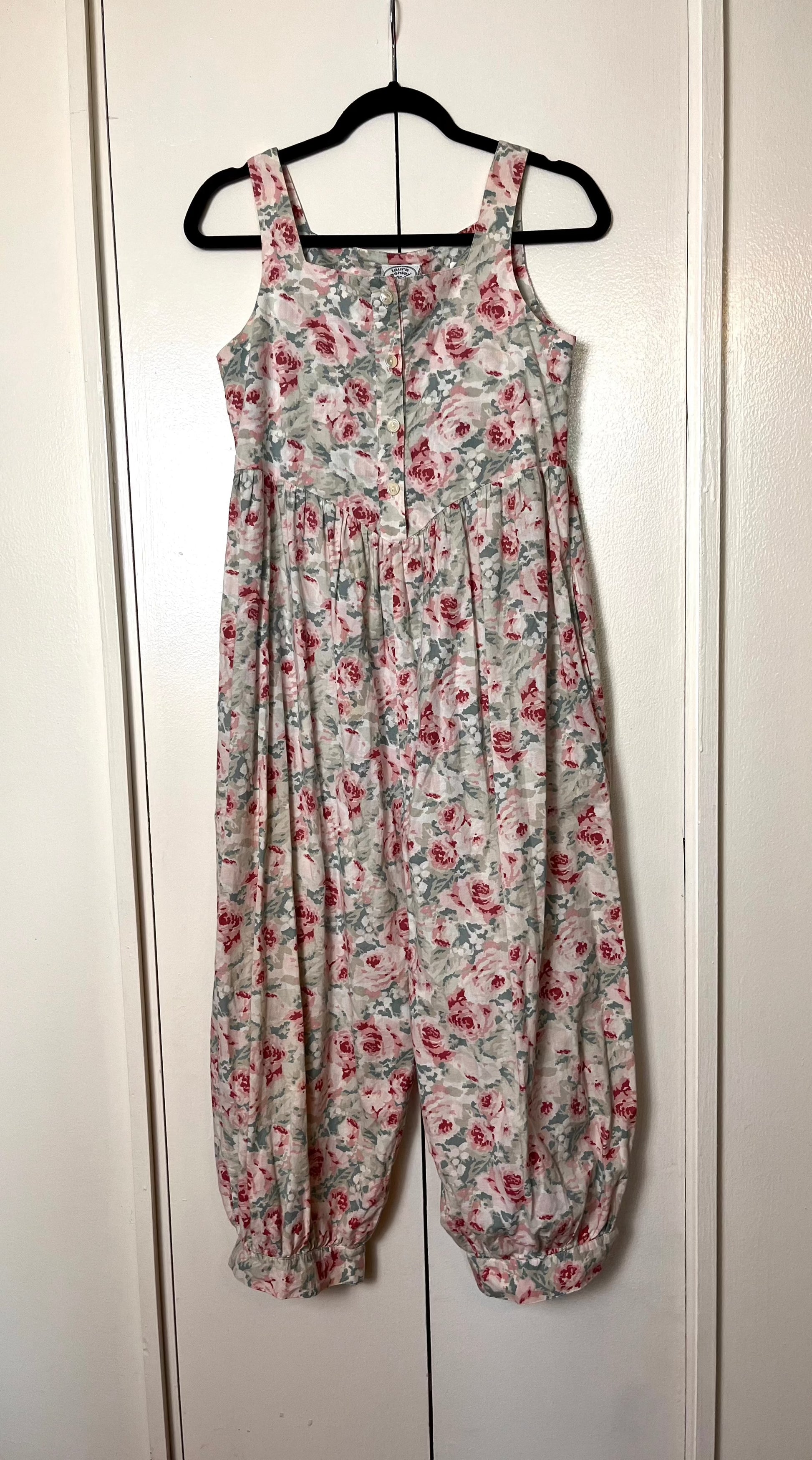 Vintage 1980's "Laura Ashley" Button-Front Pink Roses Floral Print Romper Jumpsuit Playsuit
