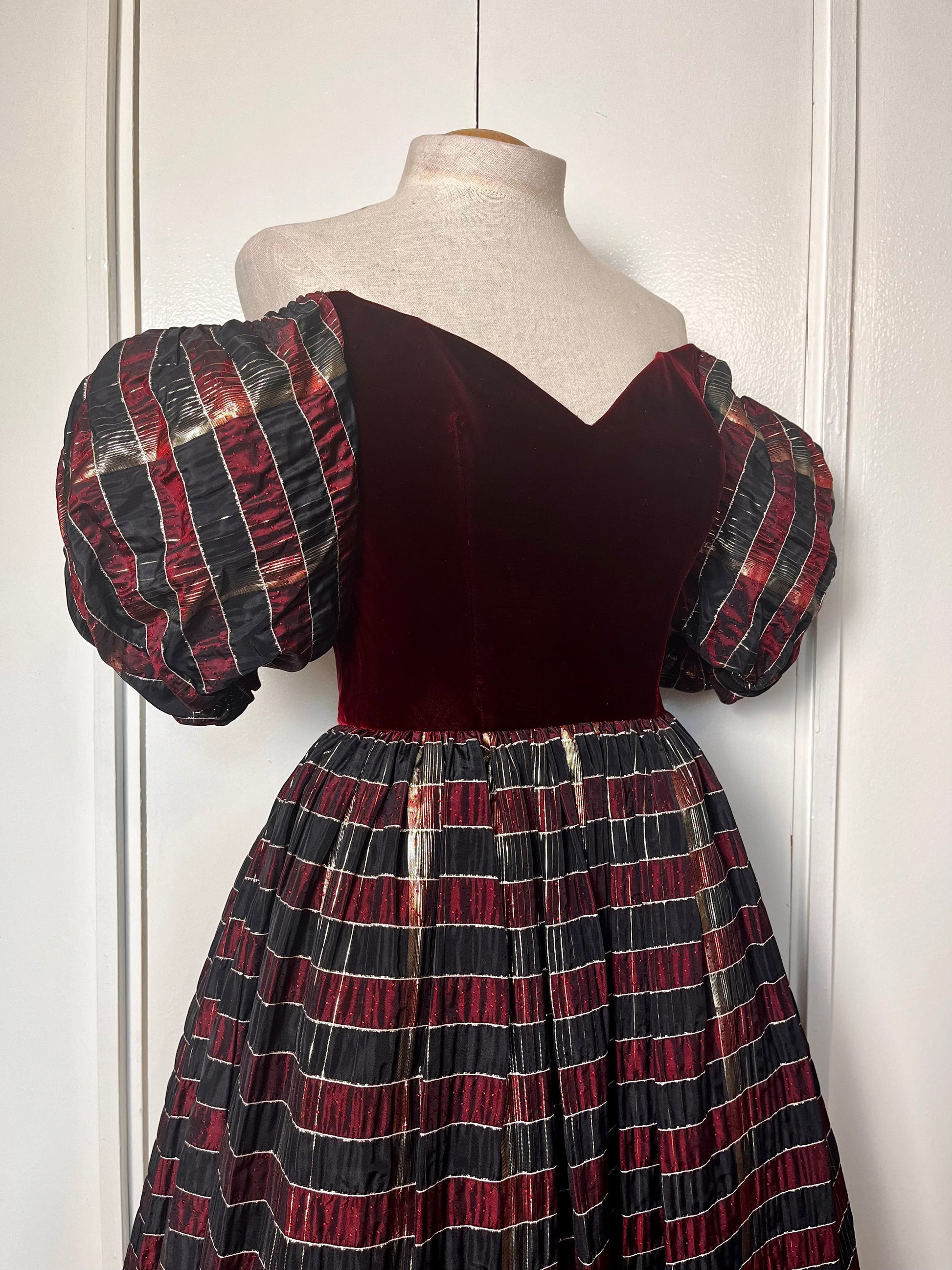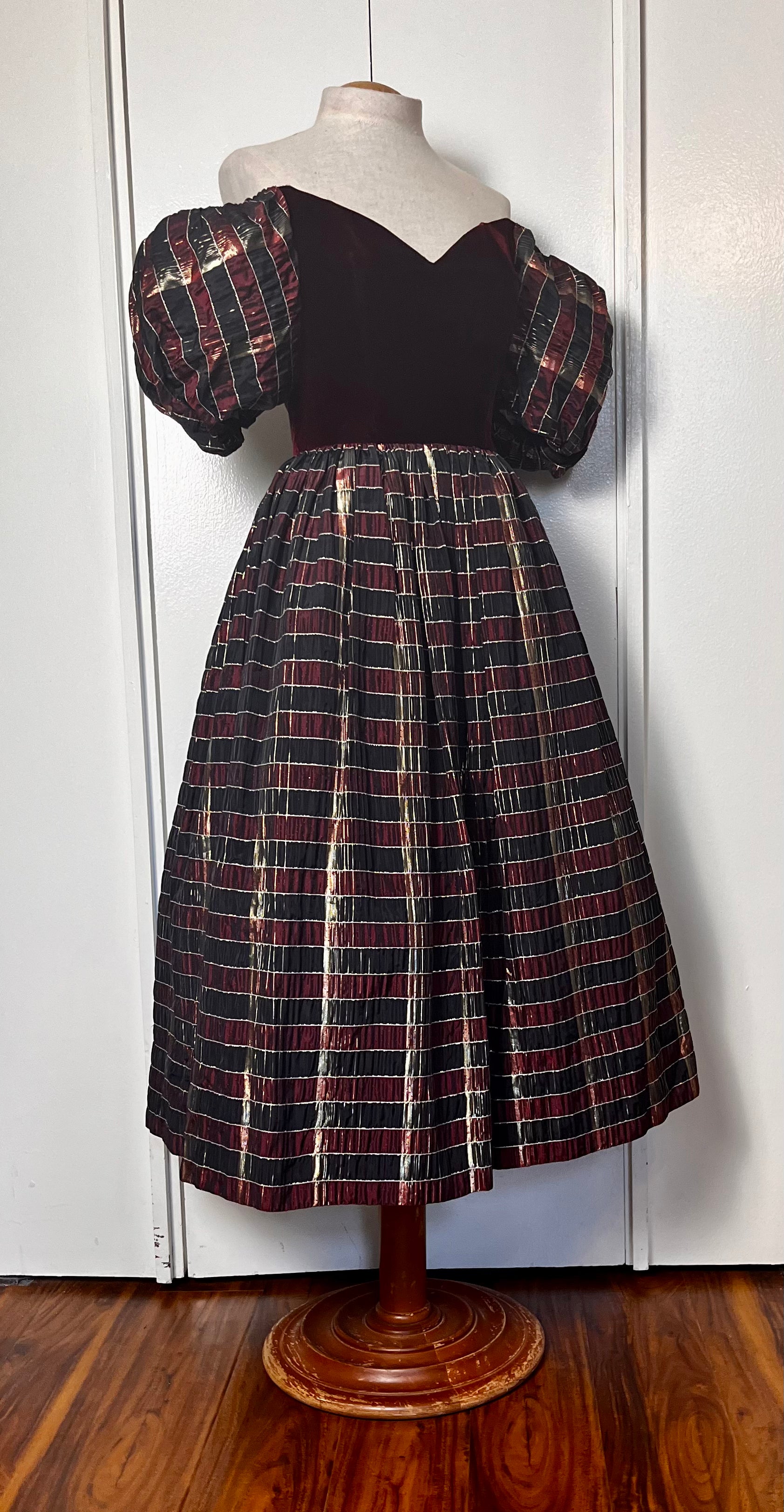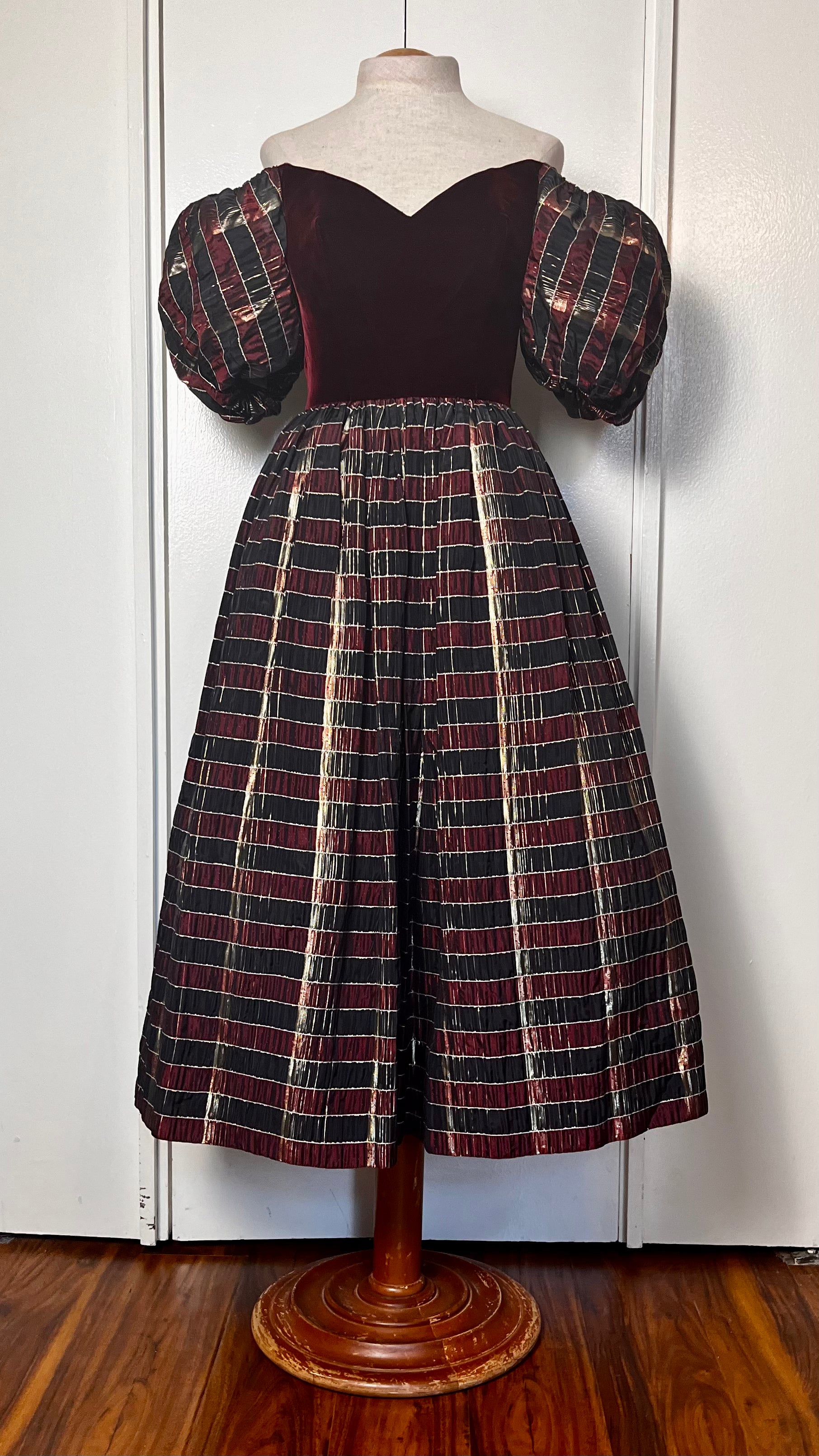 Vintage 1980's "Mike Benet" Red Velvet Puff Sleeve Plaid Gold Shimmer Taffeta Party Dress