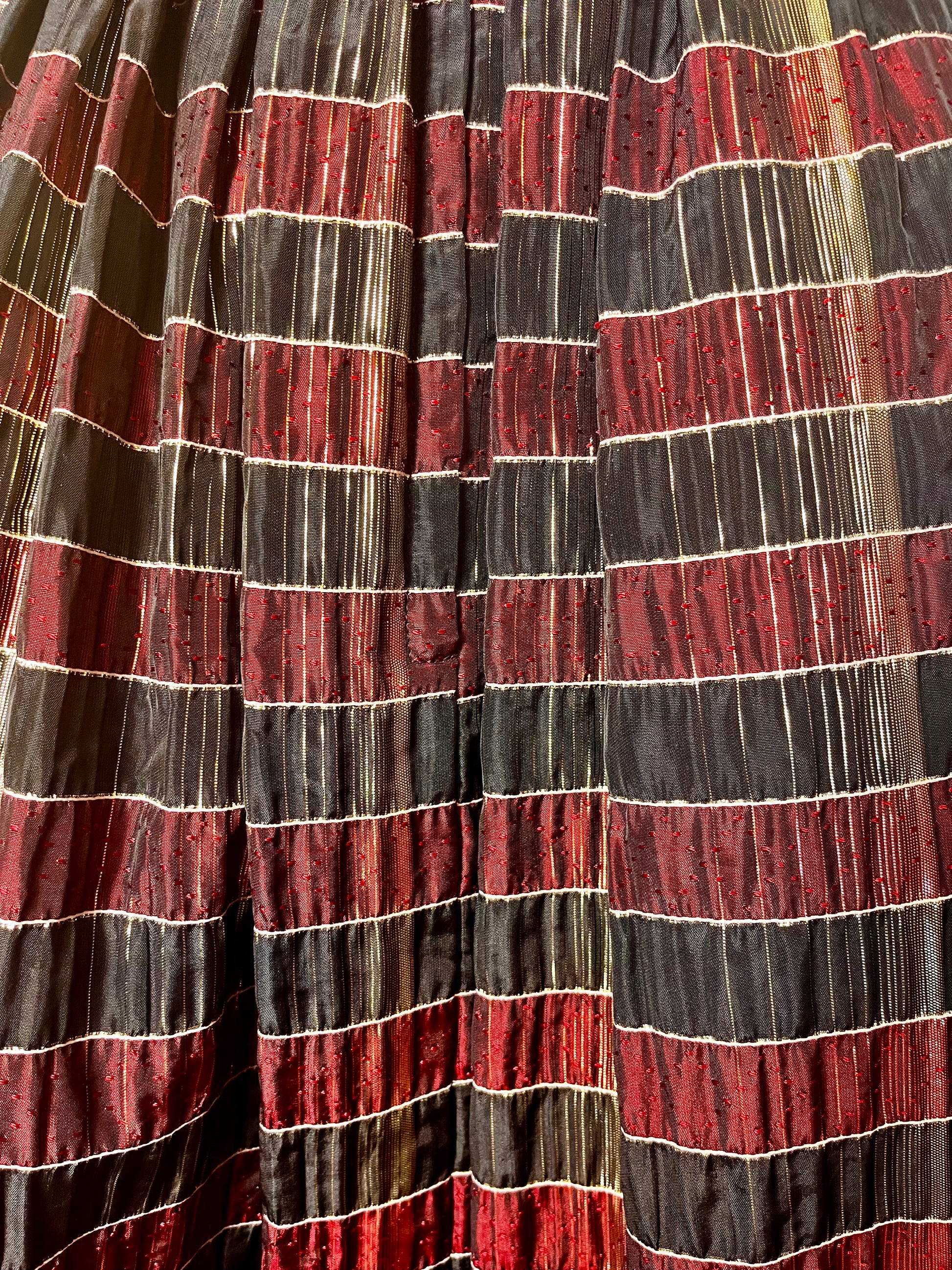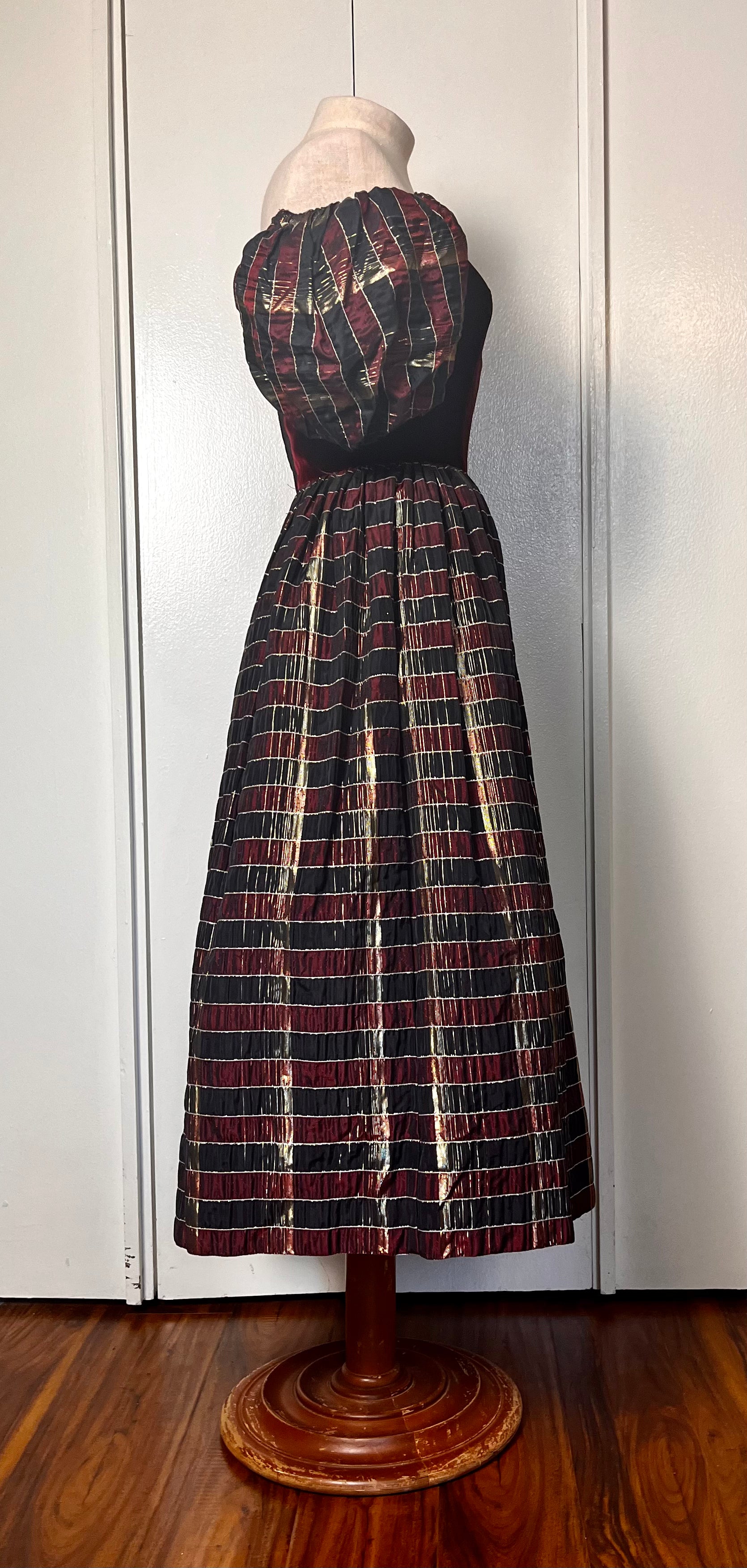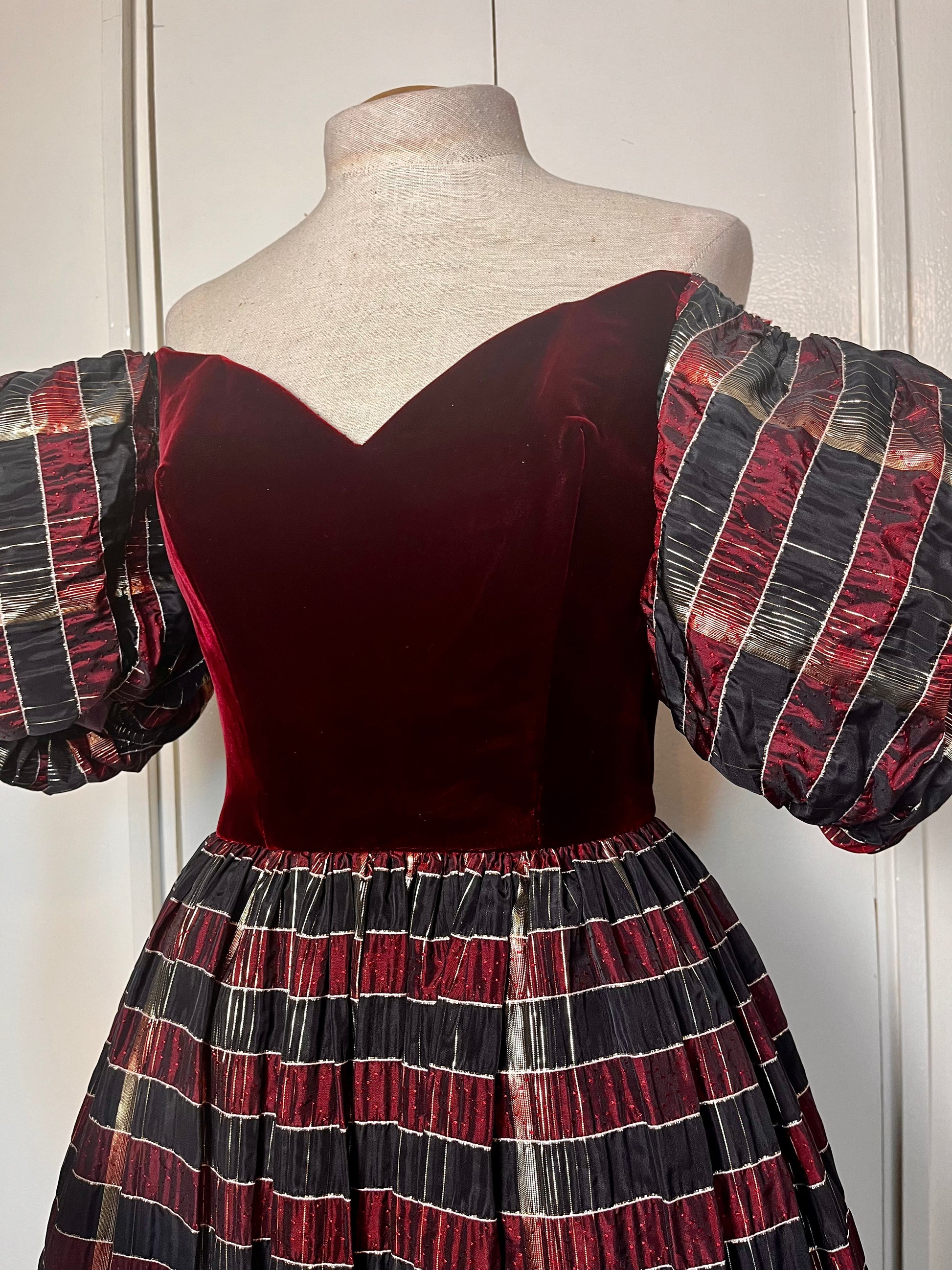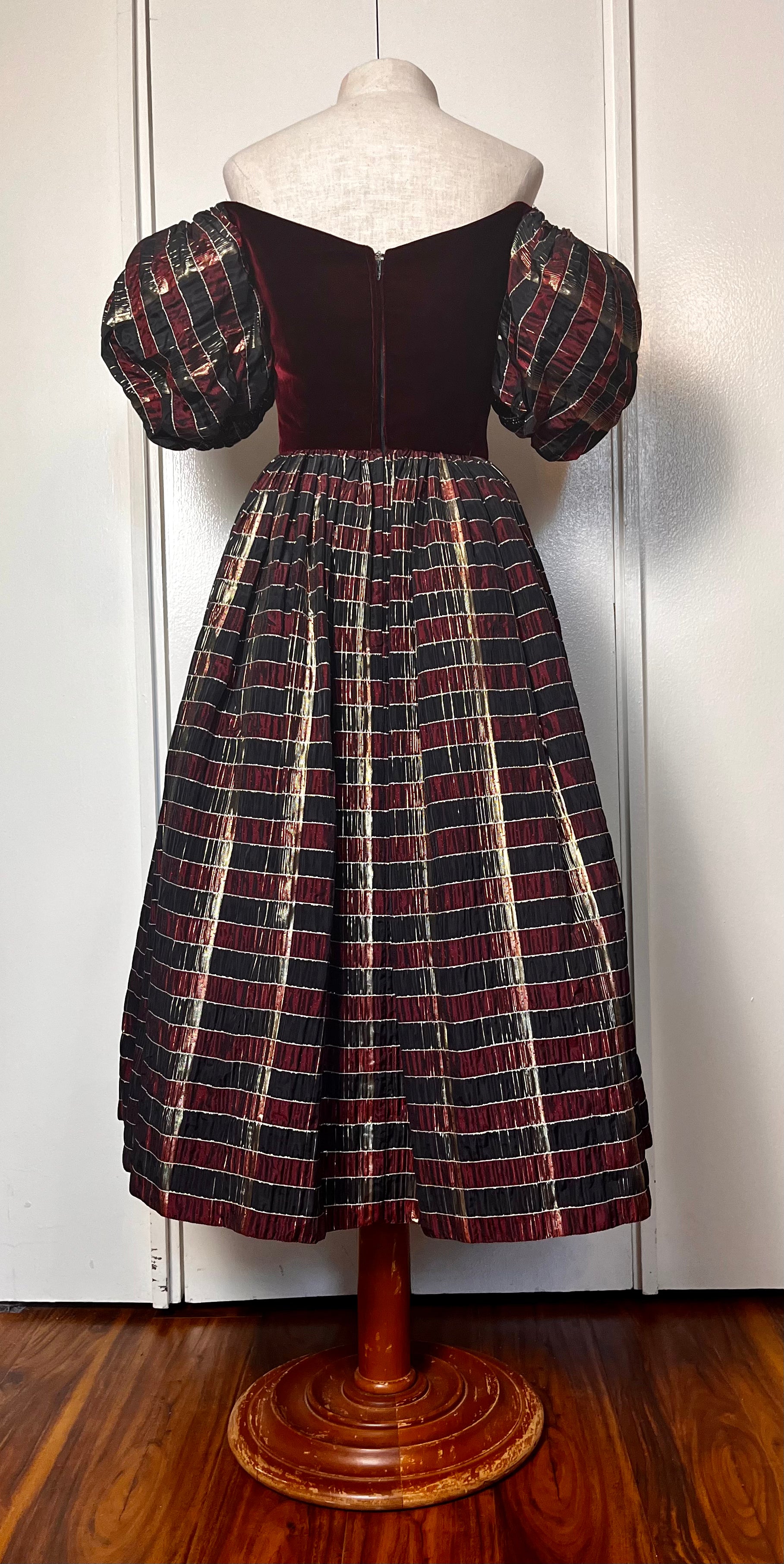 Vintage 1980's "Mike Benet" Red Velvet Puff Sleeve Plaid Gold Shimmer Taffeta Party Dress
