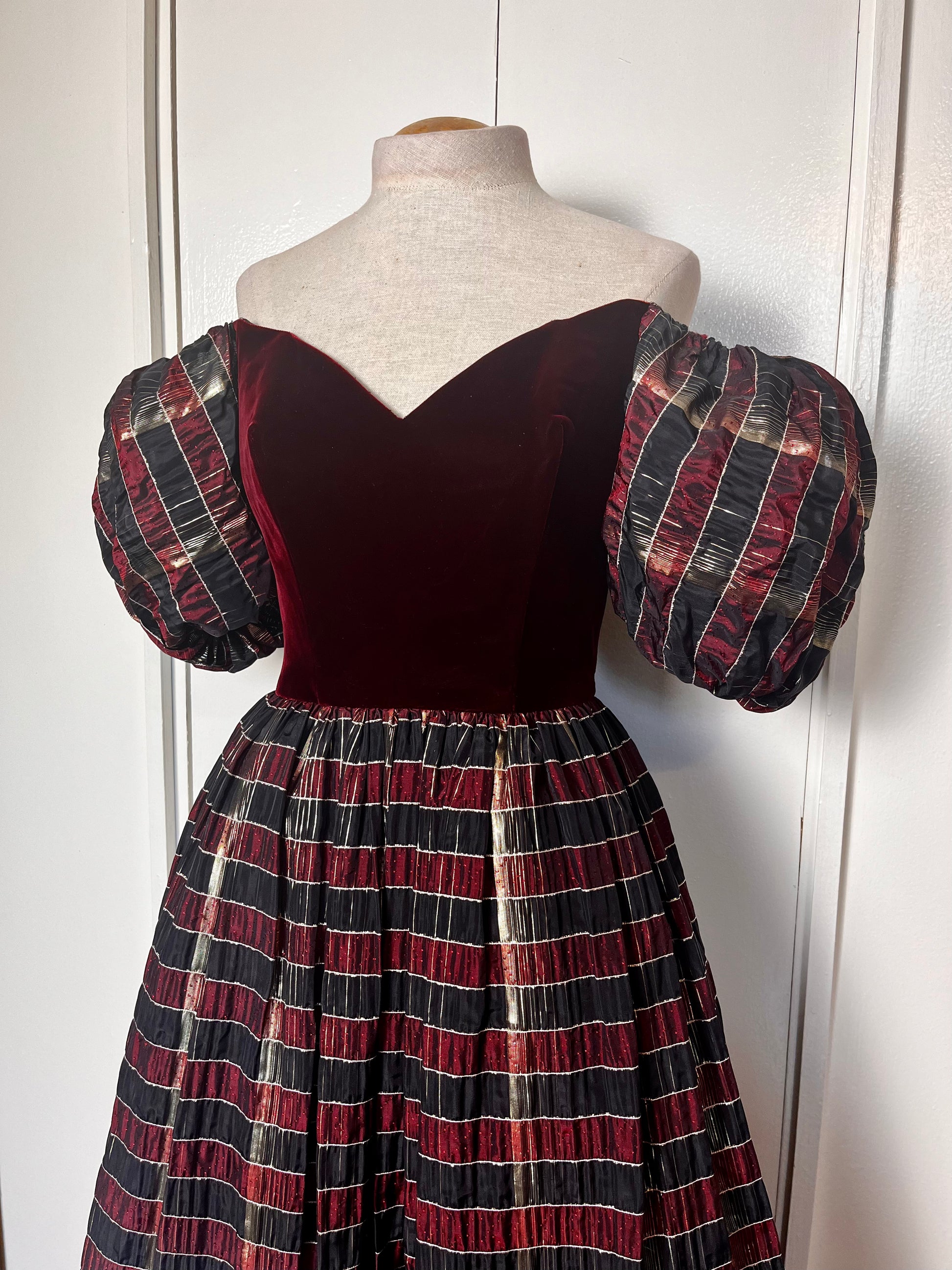 Vintage 1980's Mike Benet Deep Red Velvet Puff Sleeve Plaid Gold Shimmer Taffeta Party Dress