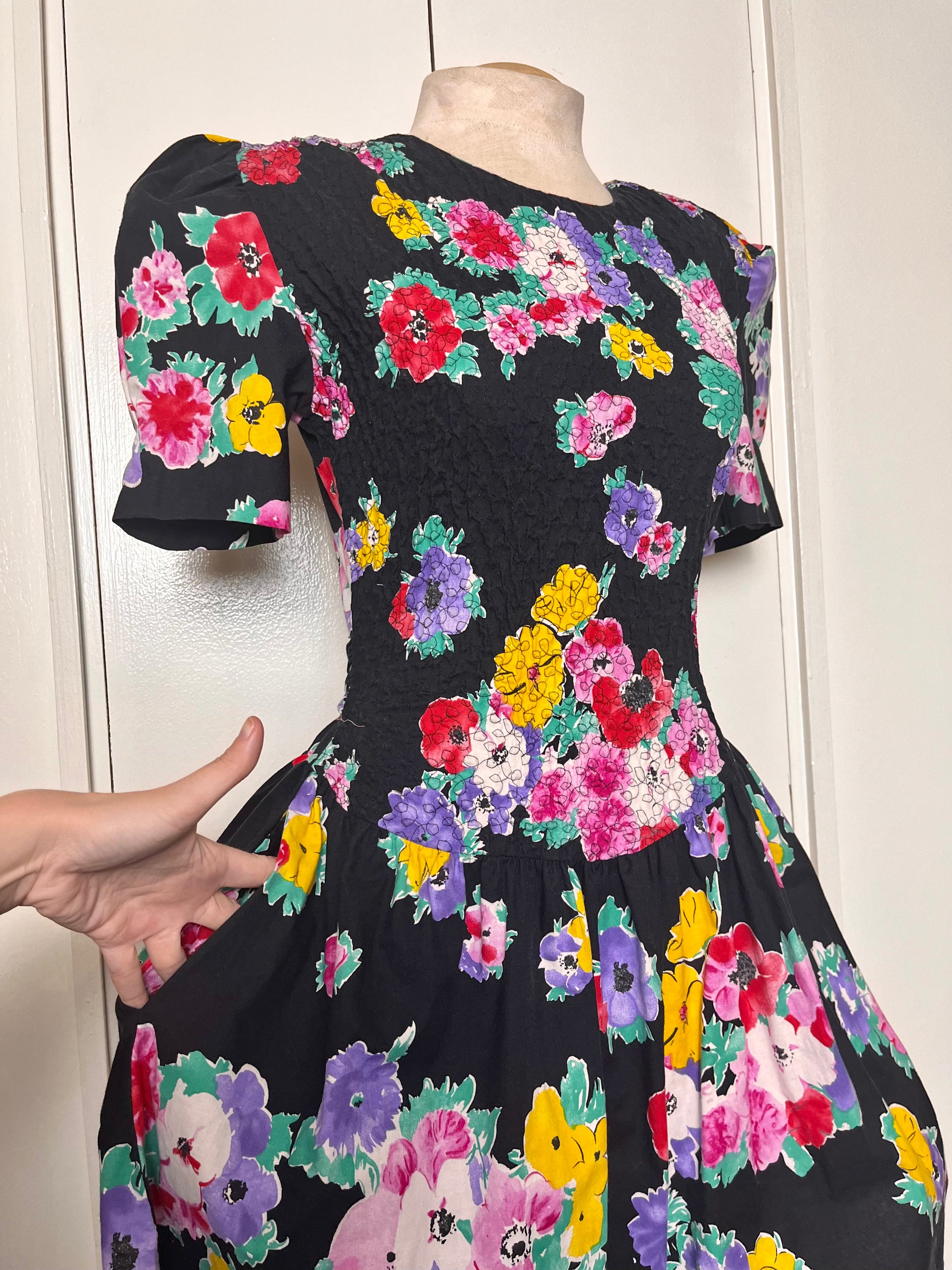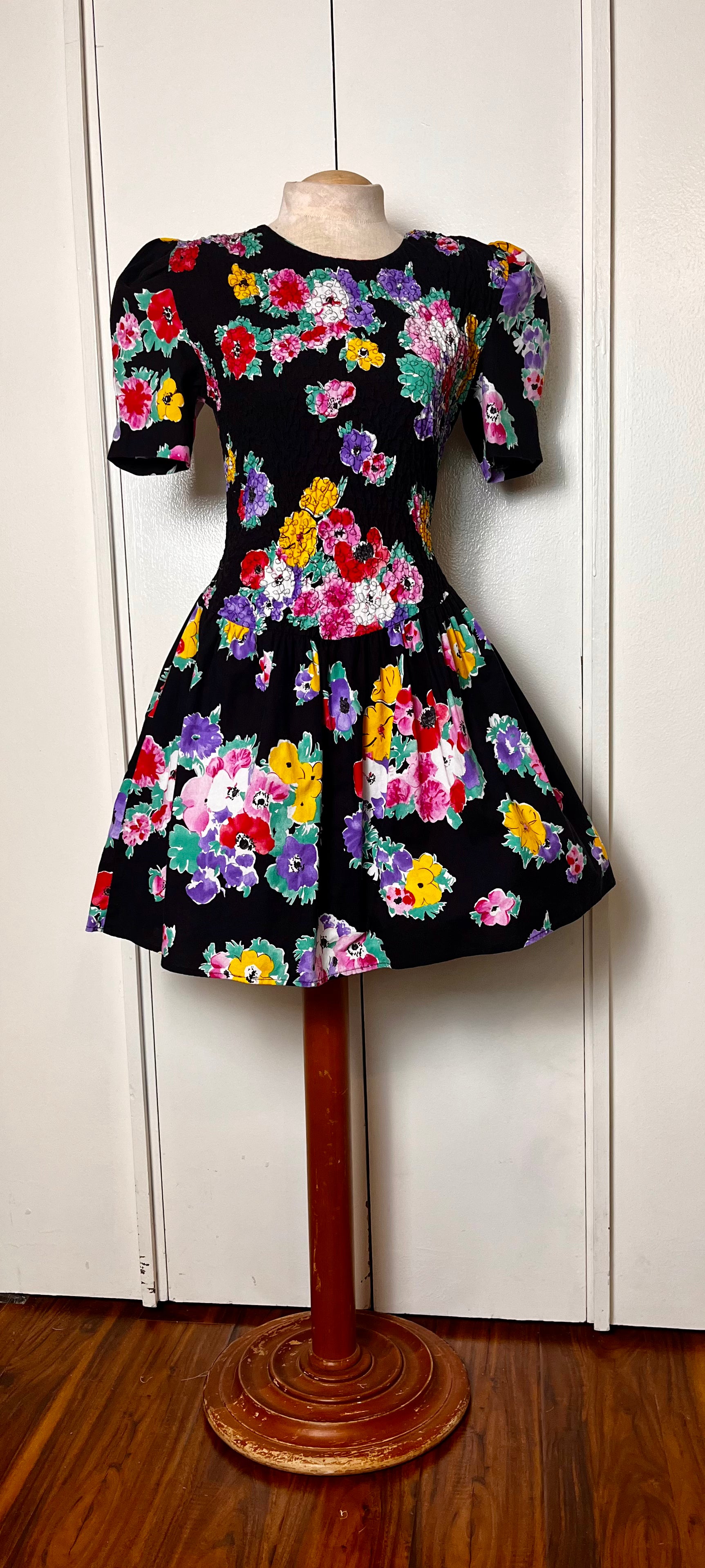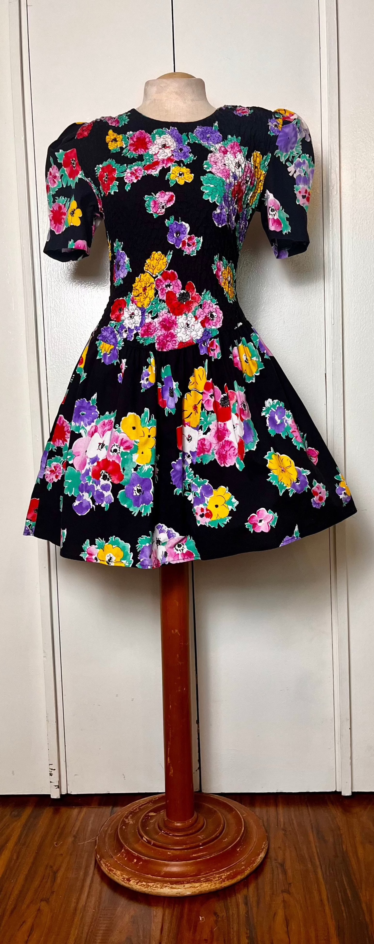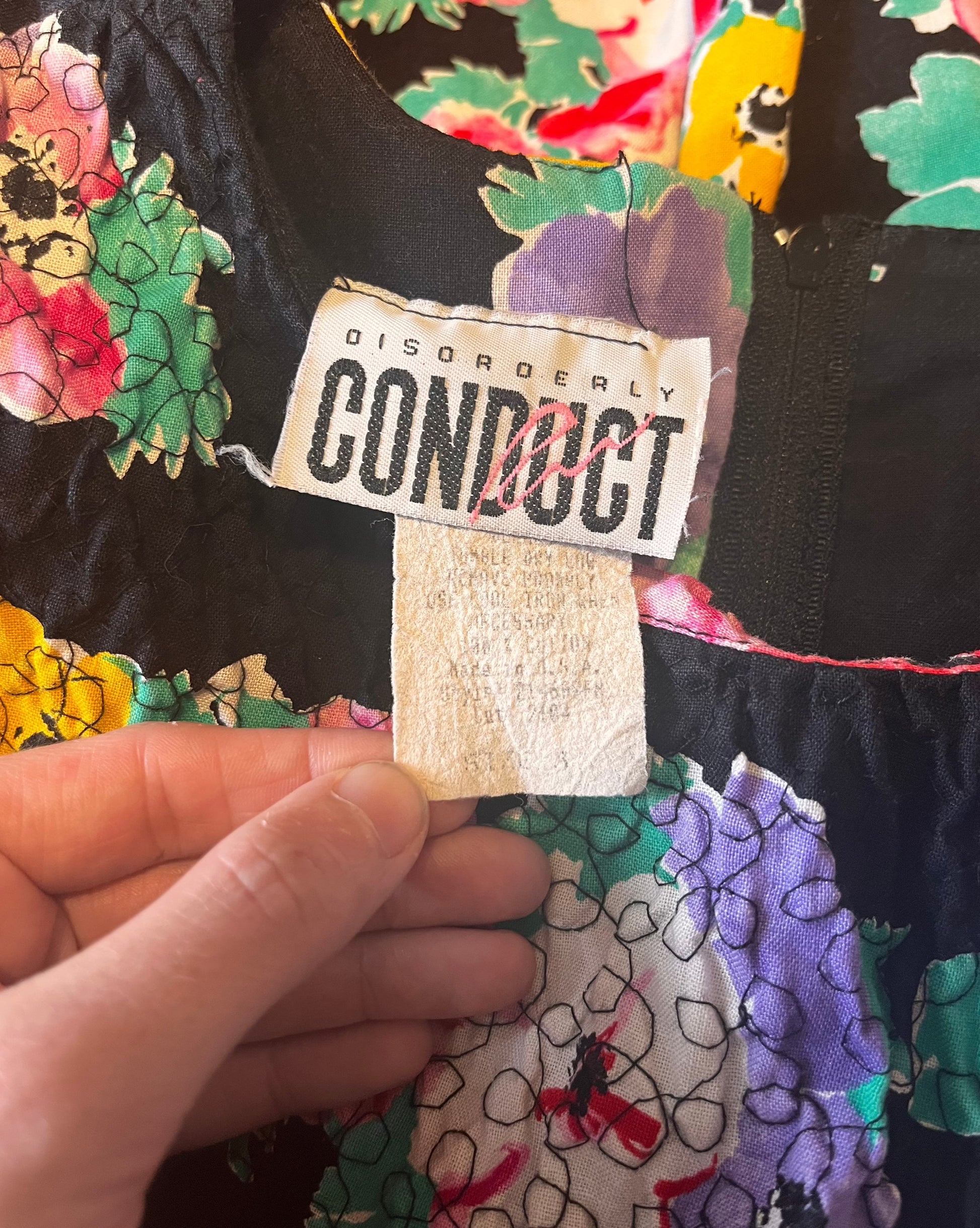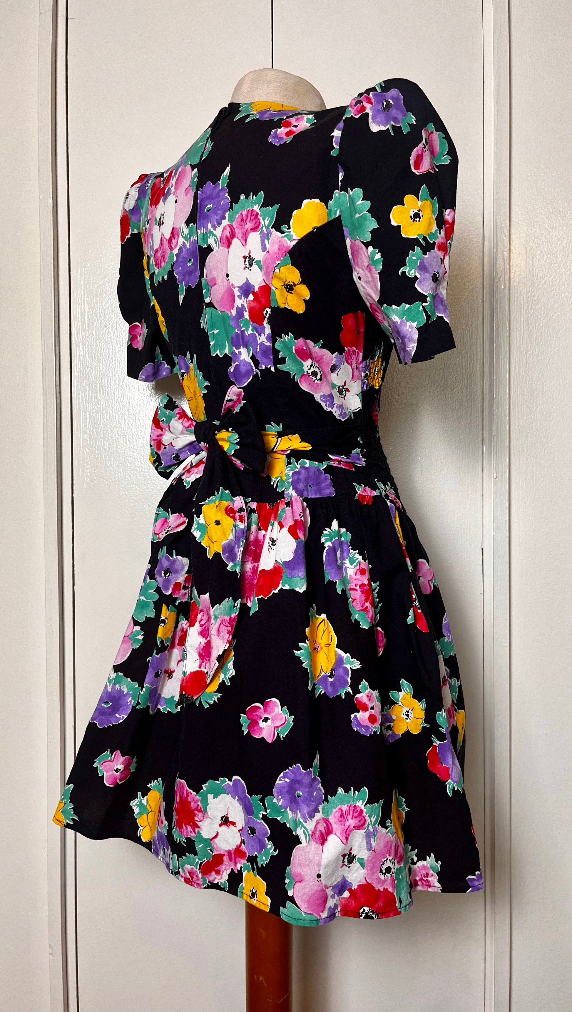 Vintage 1980's "Disorderly Conduct" Rainbow Floral Black Mini Dress