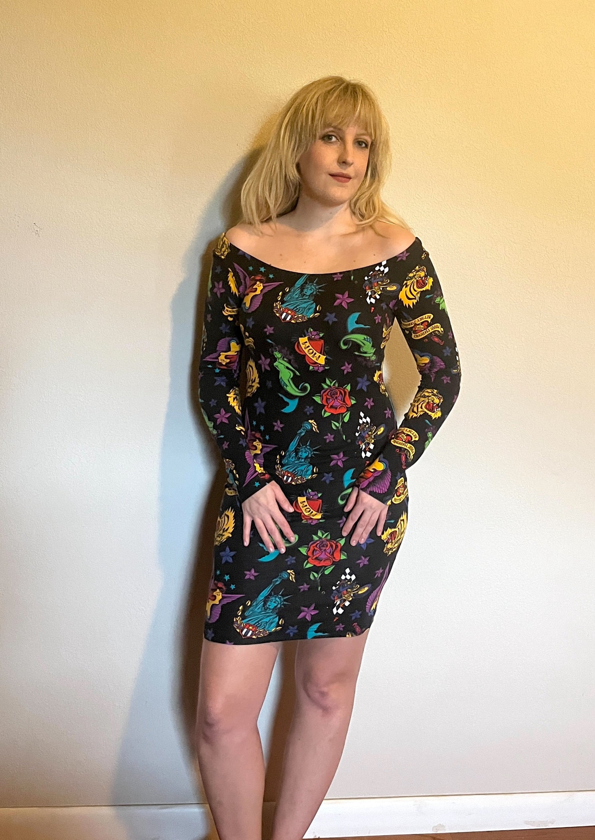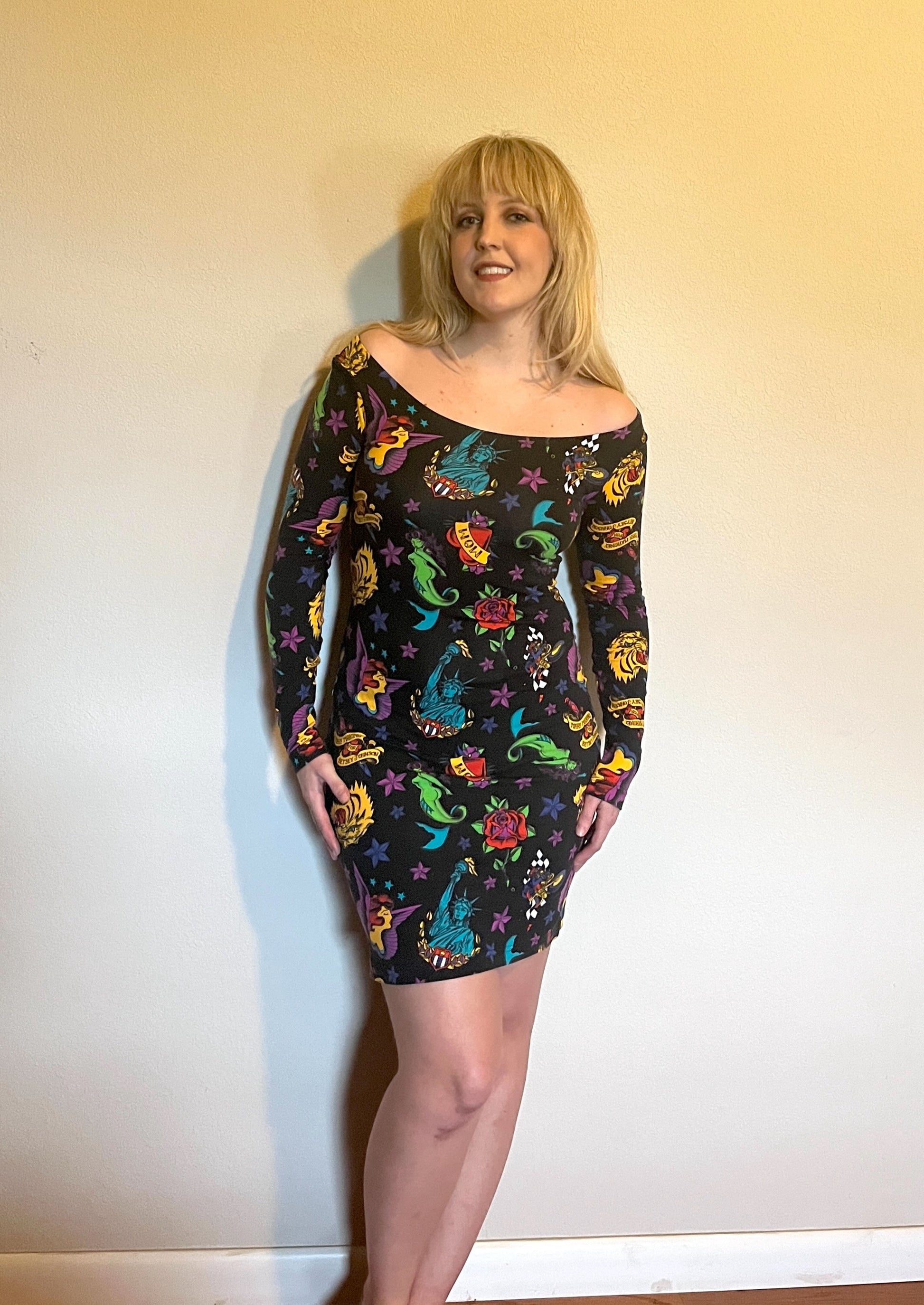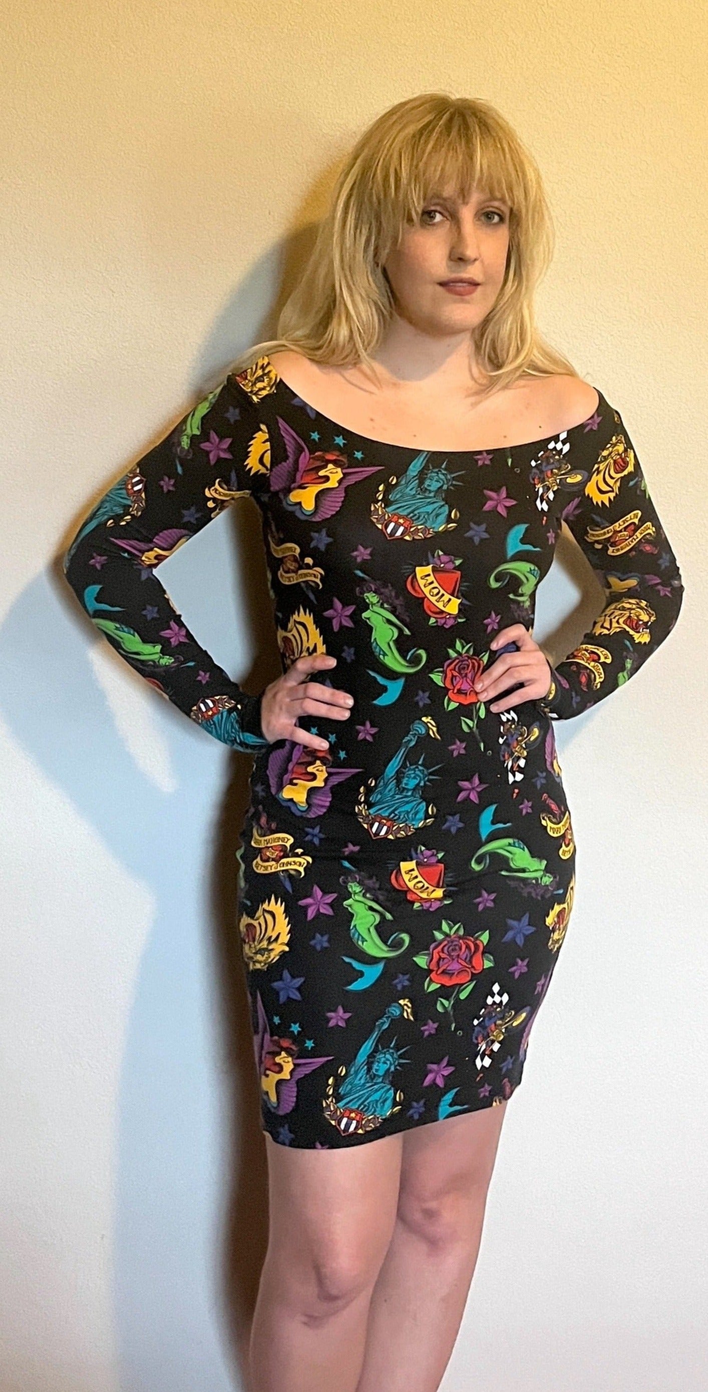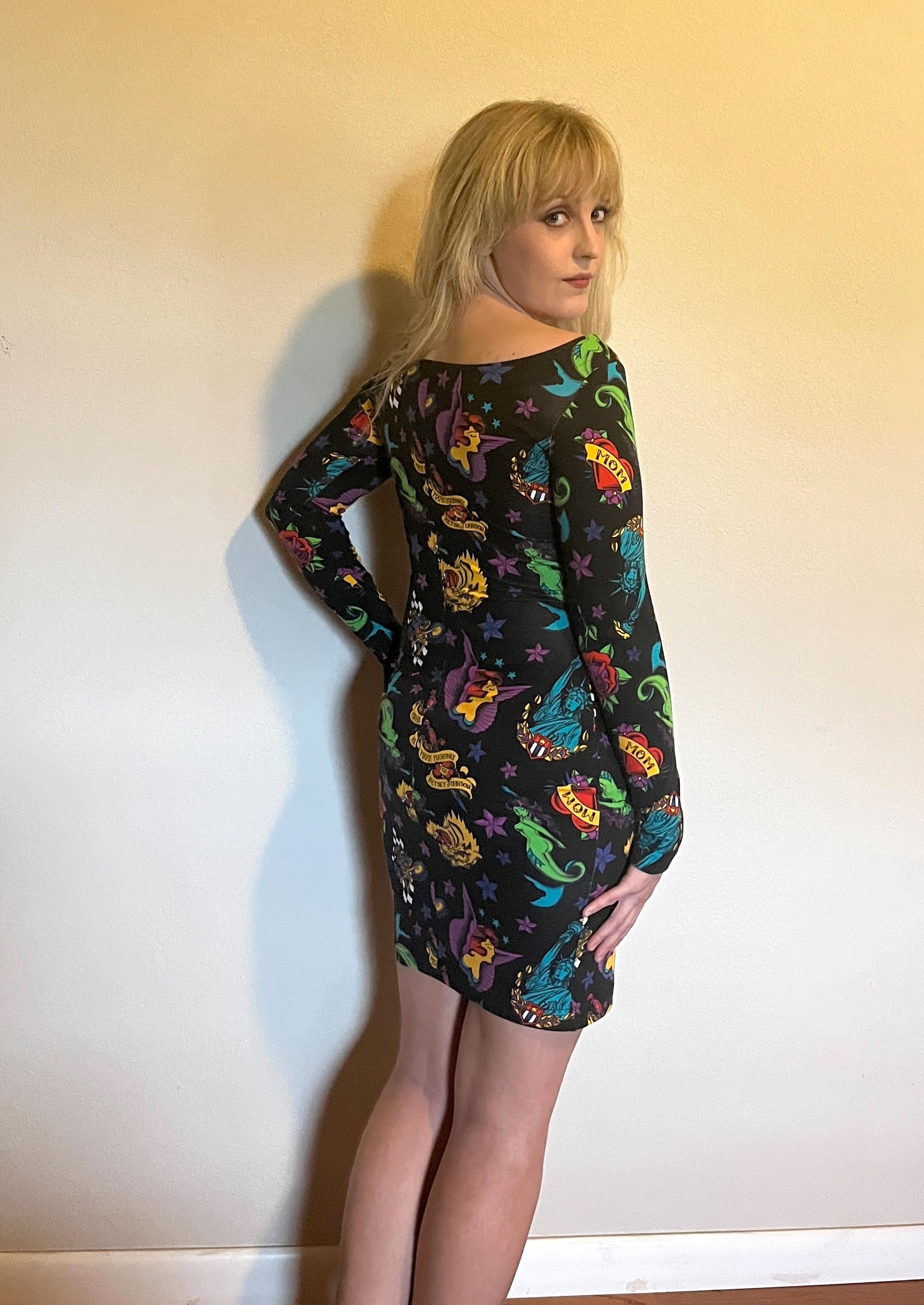 Vintage 1990's "Betsey Johnson" Traditional Americana Tattoo Print Black Bodycon Cotton Lycra Long Sleeve Mini Dress