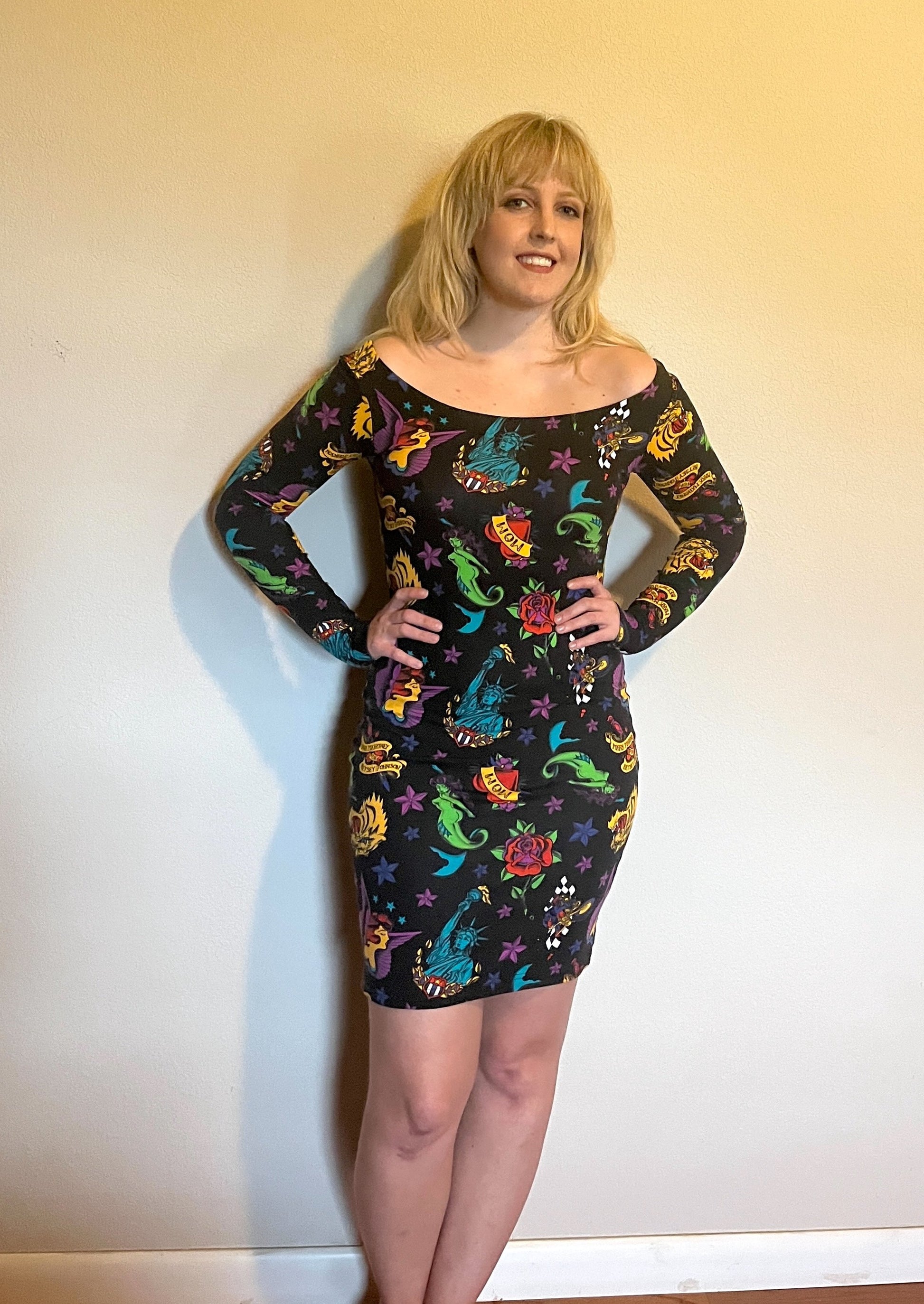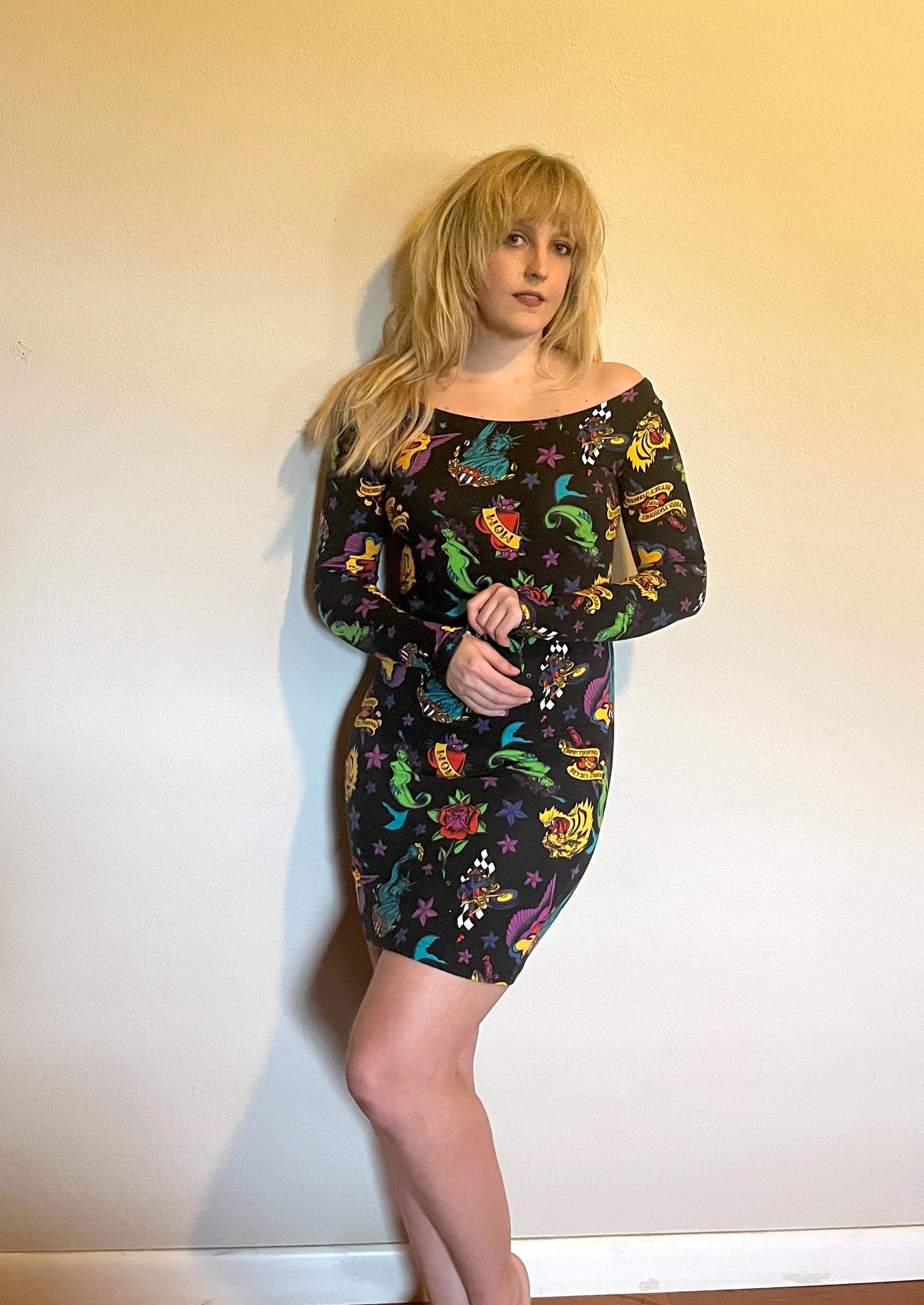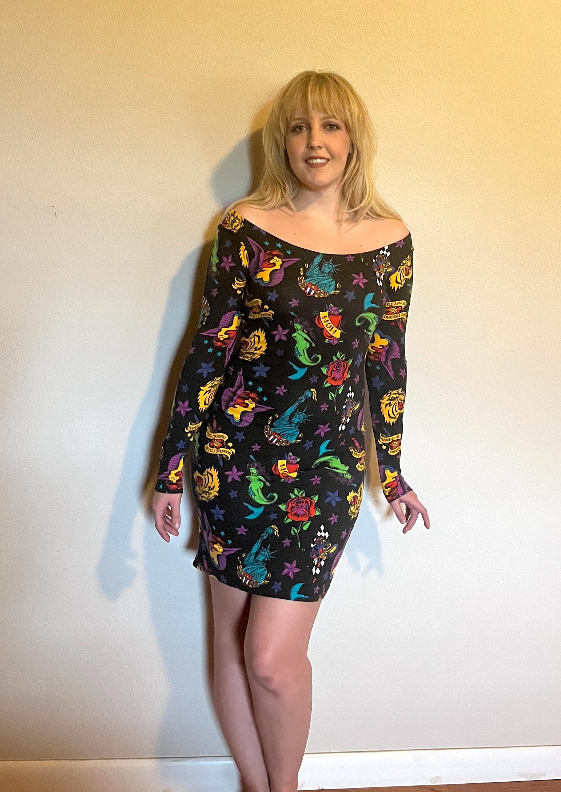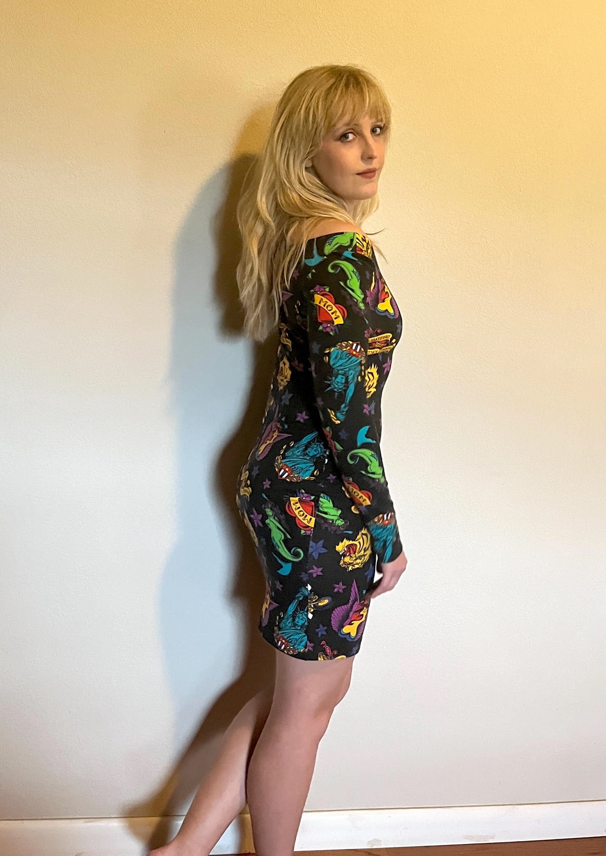 Vintage 1990's "Betsey Johnson" Traditional Americana Tattoo Print Black Bodycon Cotton Lycra Long Sleeve Mini Dress