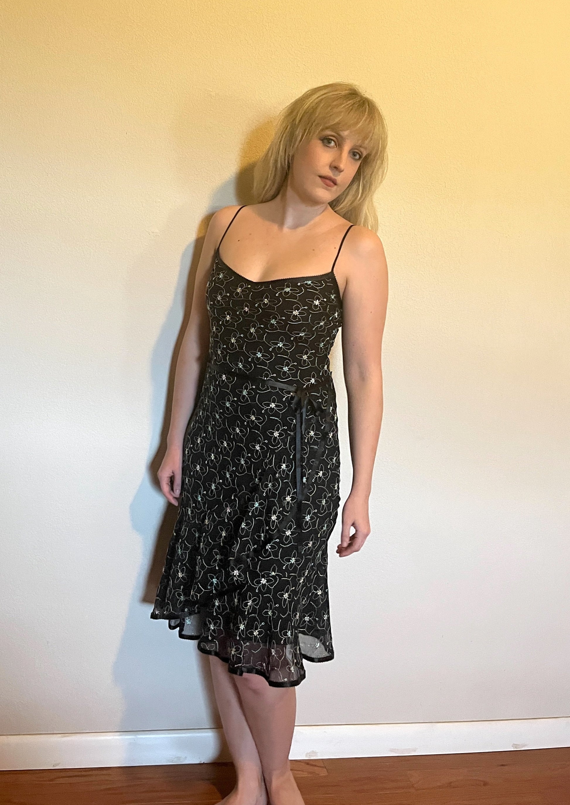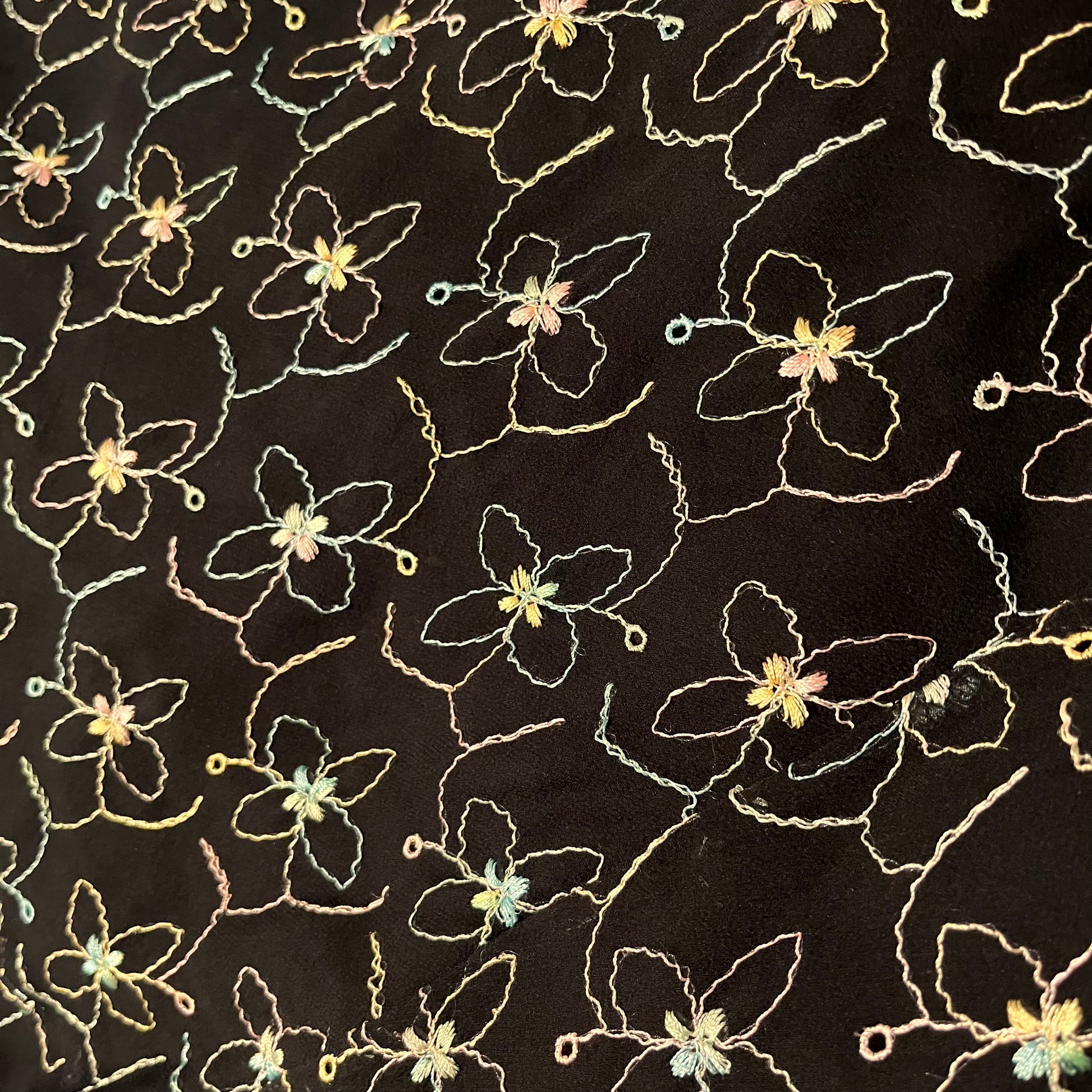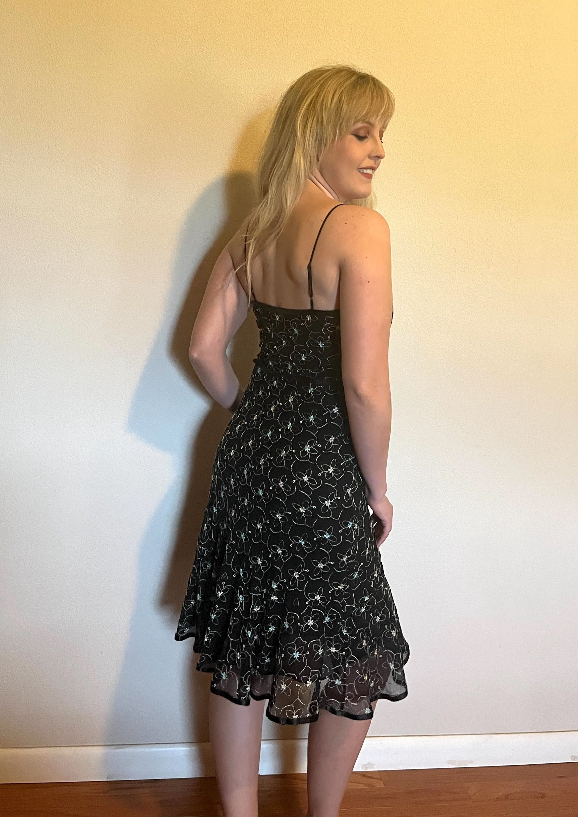 Vintage 1990's "Betsey Johnson" Slip Midi Dress w/ Asymmetrical Ruffle and Ribbon Belt in Embroidered Rainbow Flowers on Black