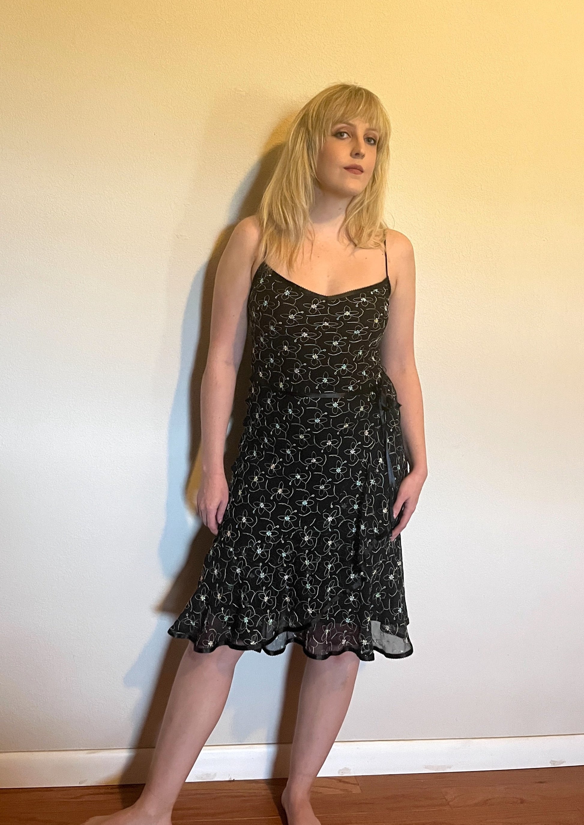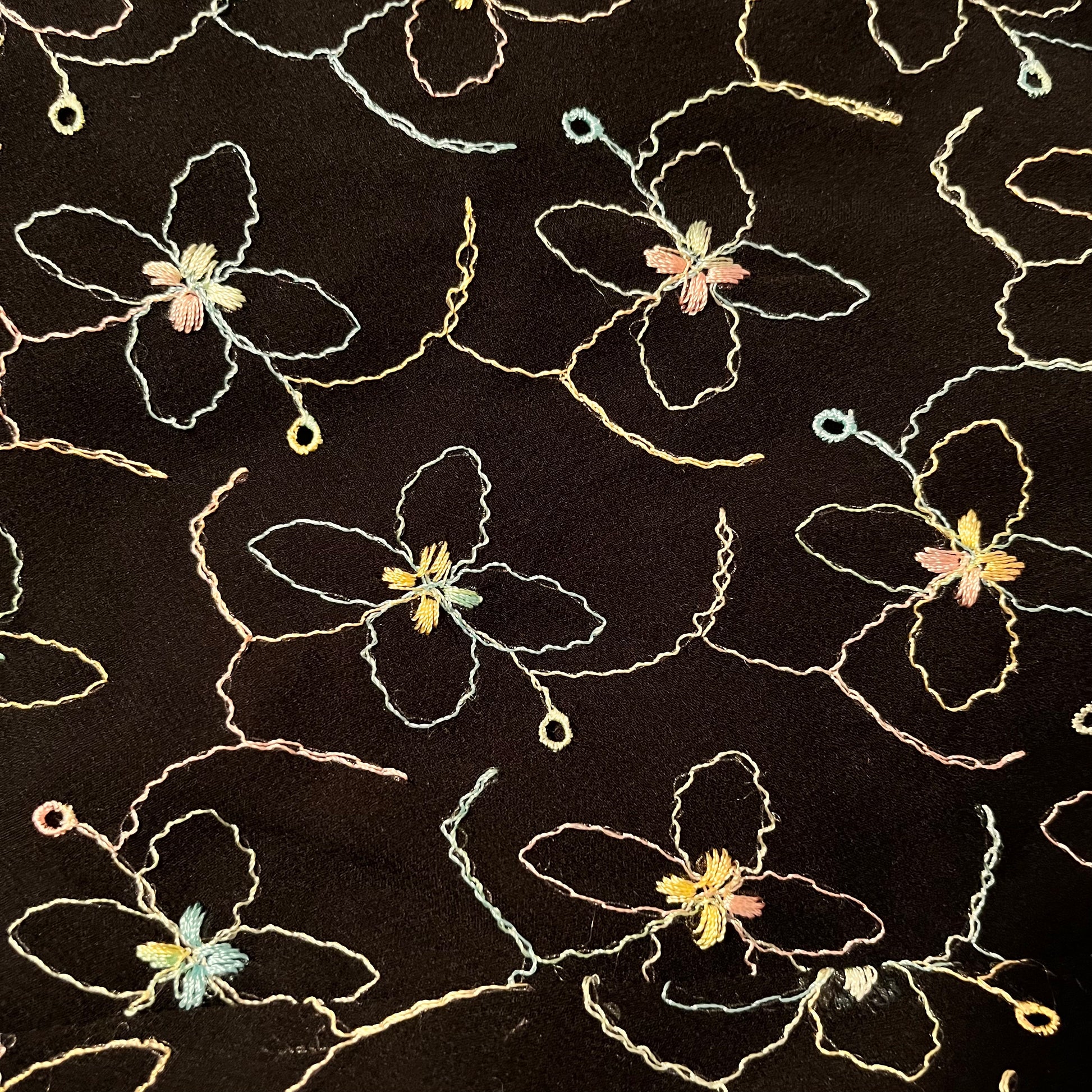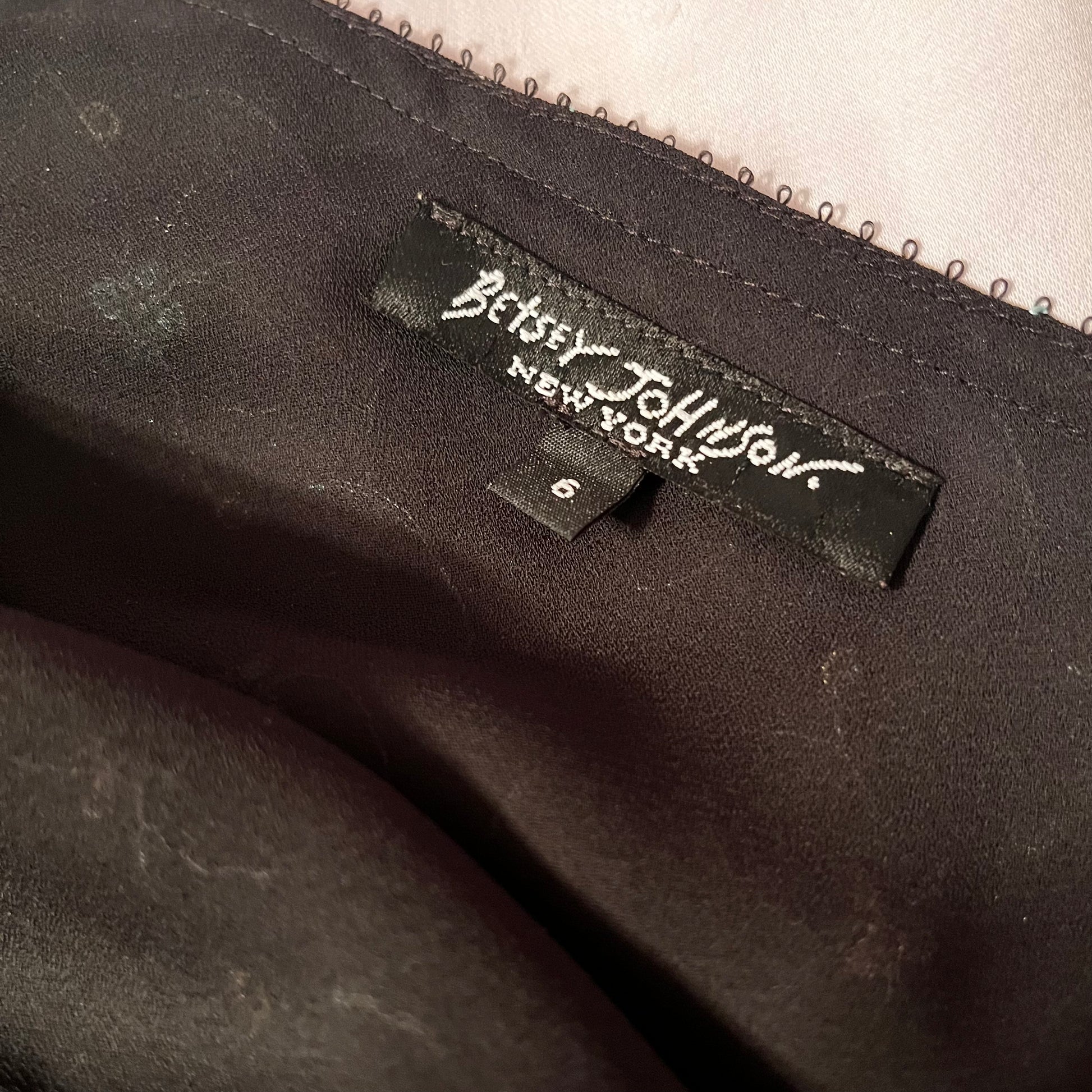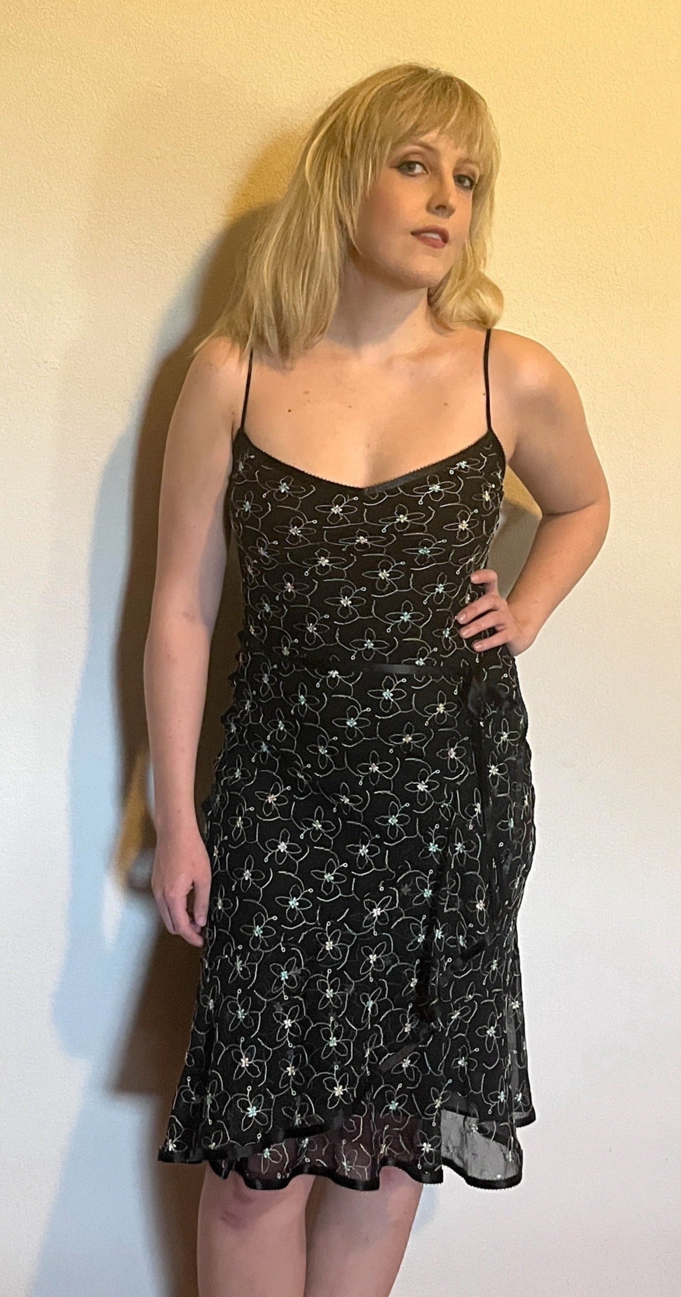 Vintage 1990's "Betsey Johnson" Slip Midi Dress w/ Asymmetrical Ruffle and Ribbon Belt in Embroidered Rainbow Flowers on Black