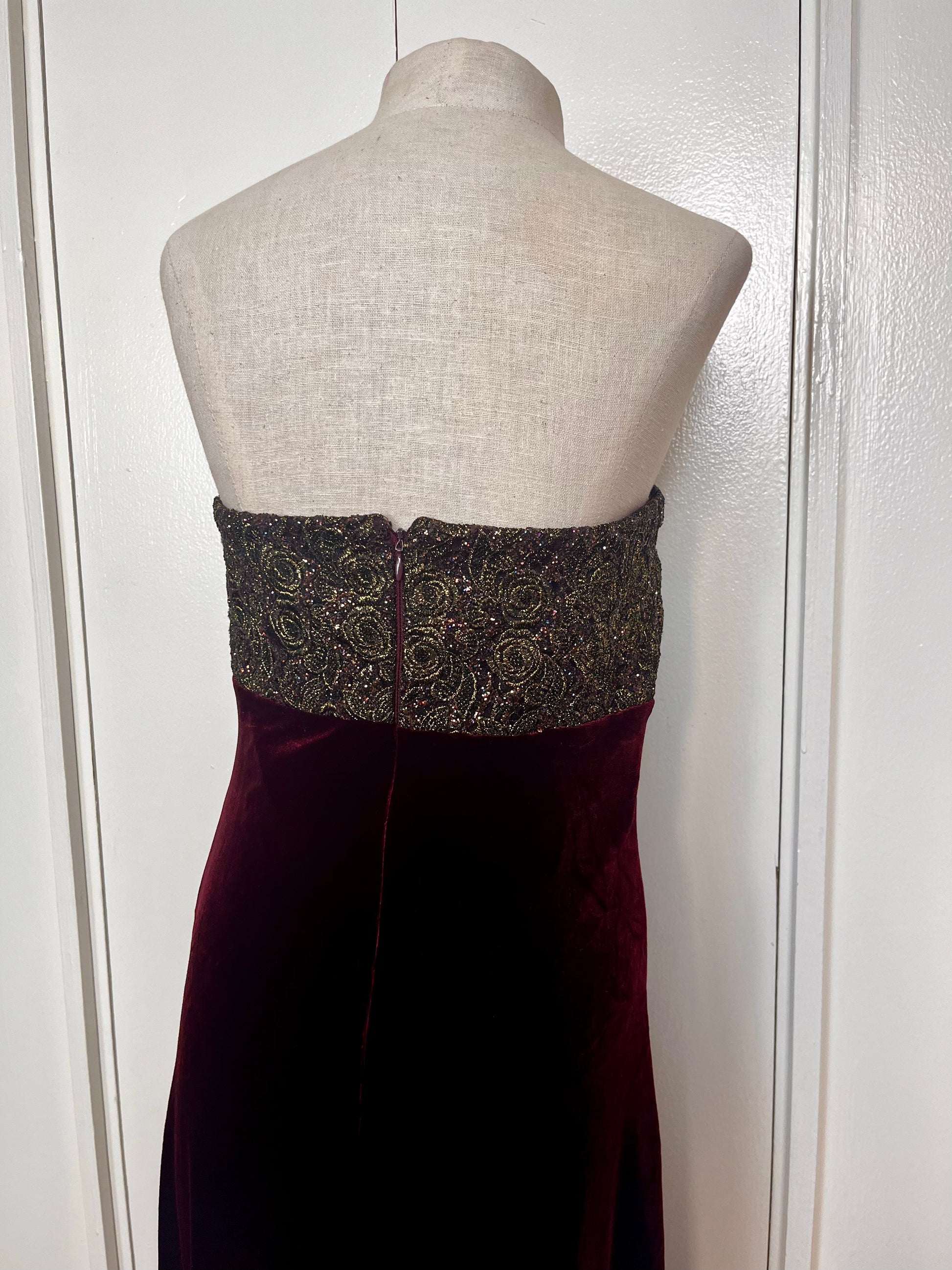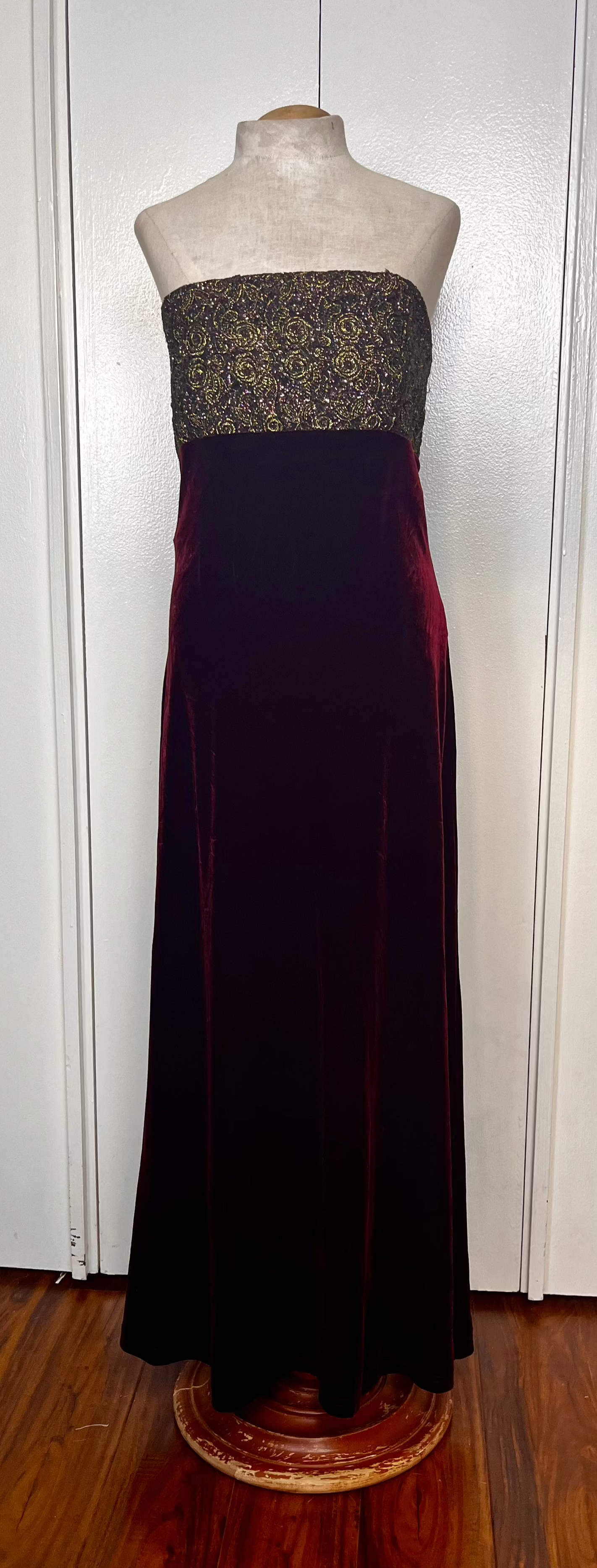 Vintage 1990's "Tom Barra" Burgundy & Gold Shimmer Strapless Maxi Dress