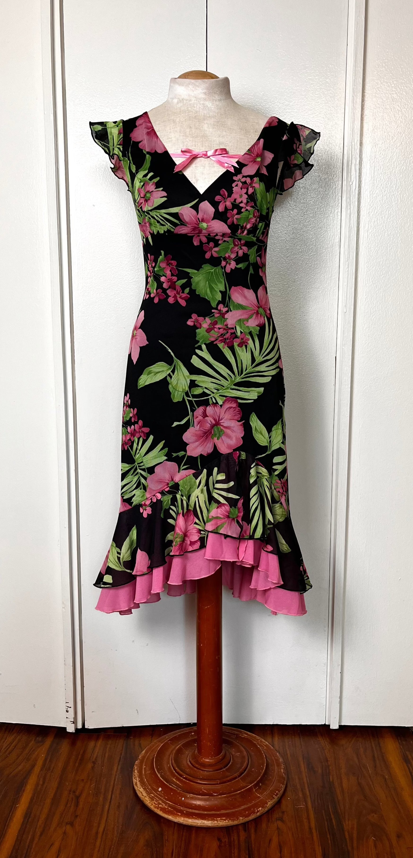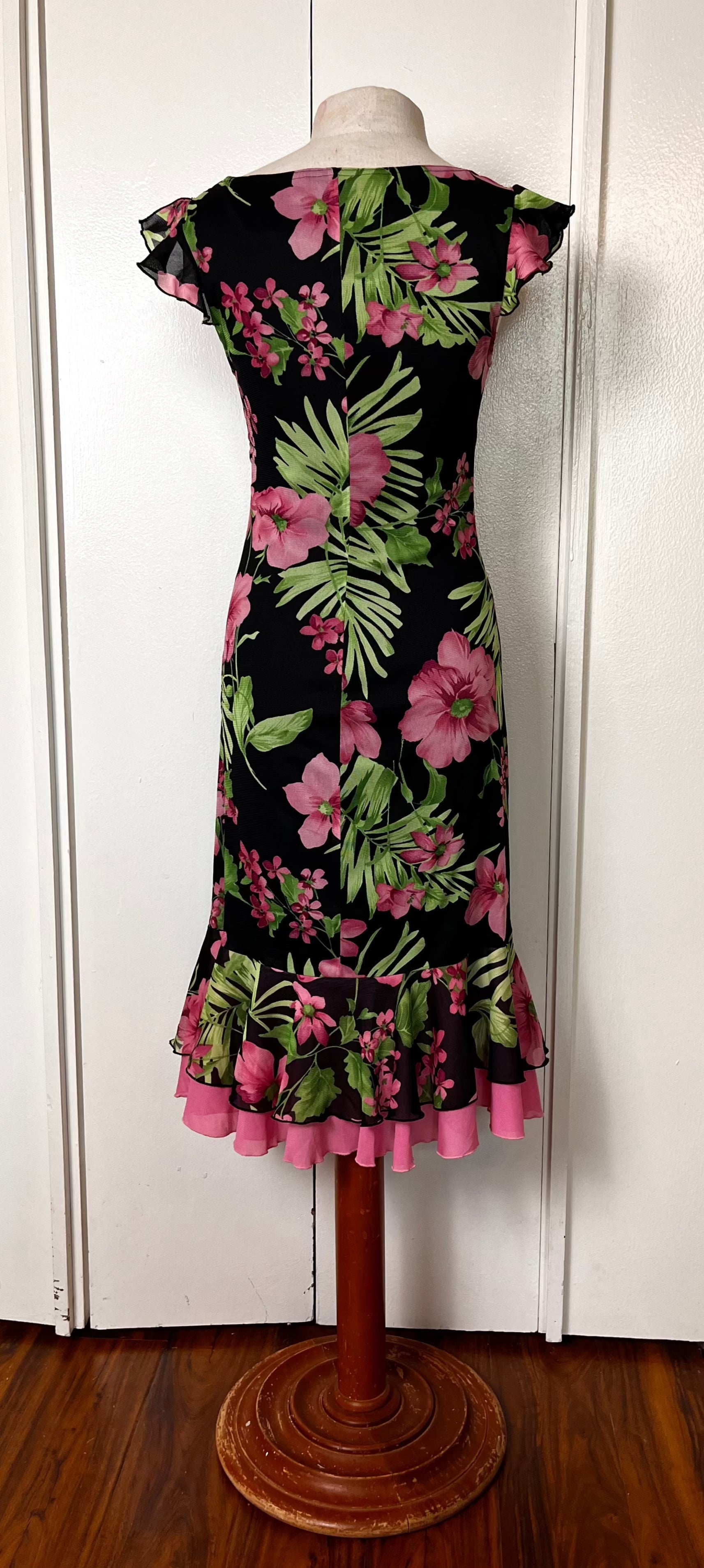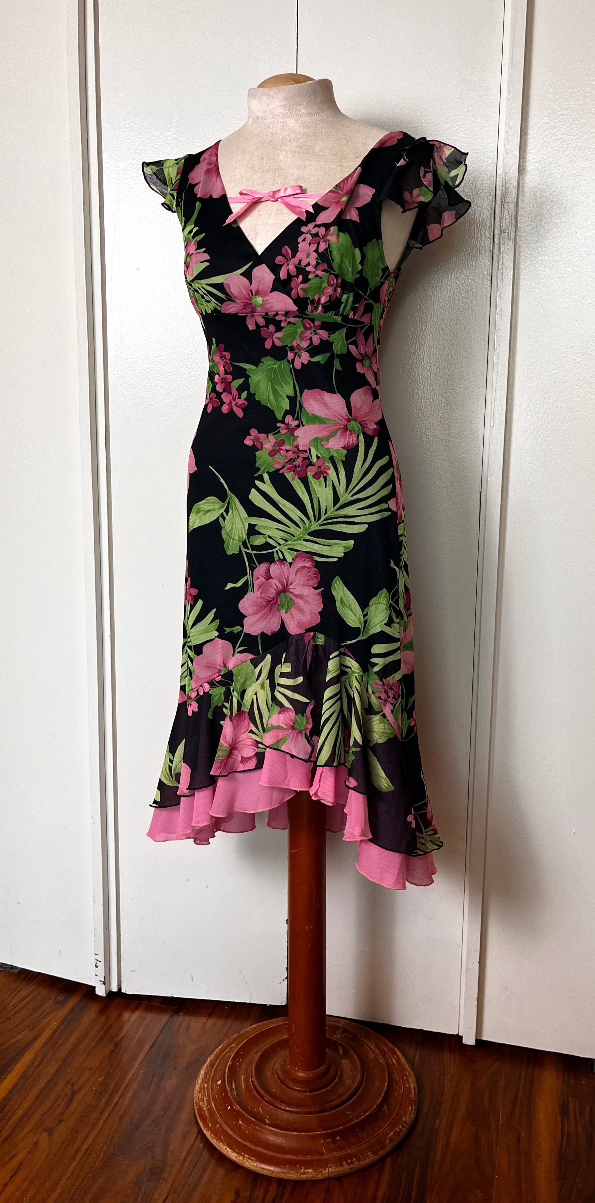 Vintage 1990's "City Triangles" Black, Pink & Green Floral Flutter Sleeve & Ribbon Dress